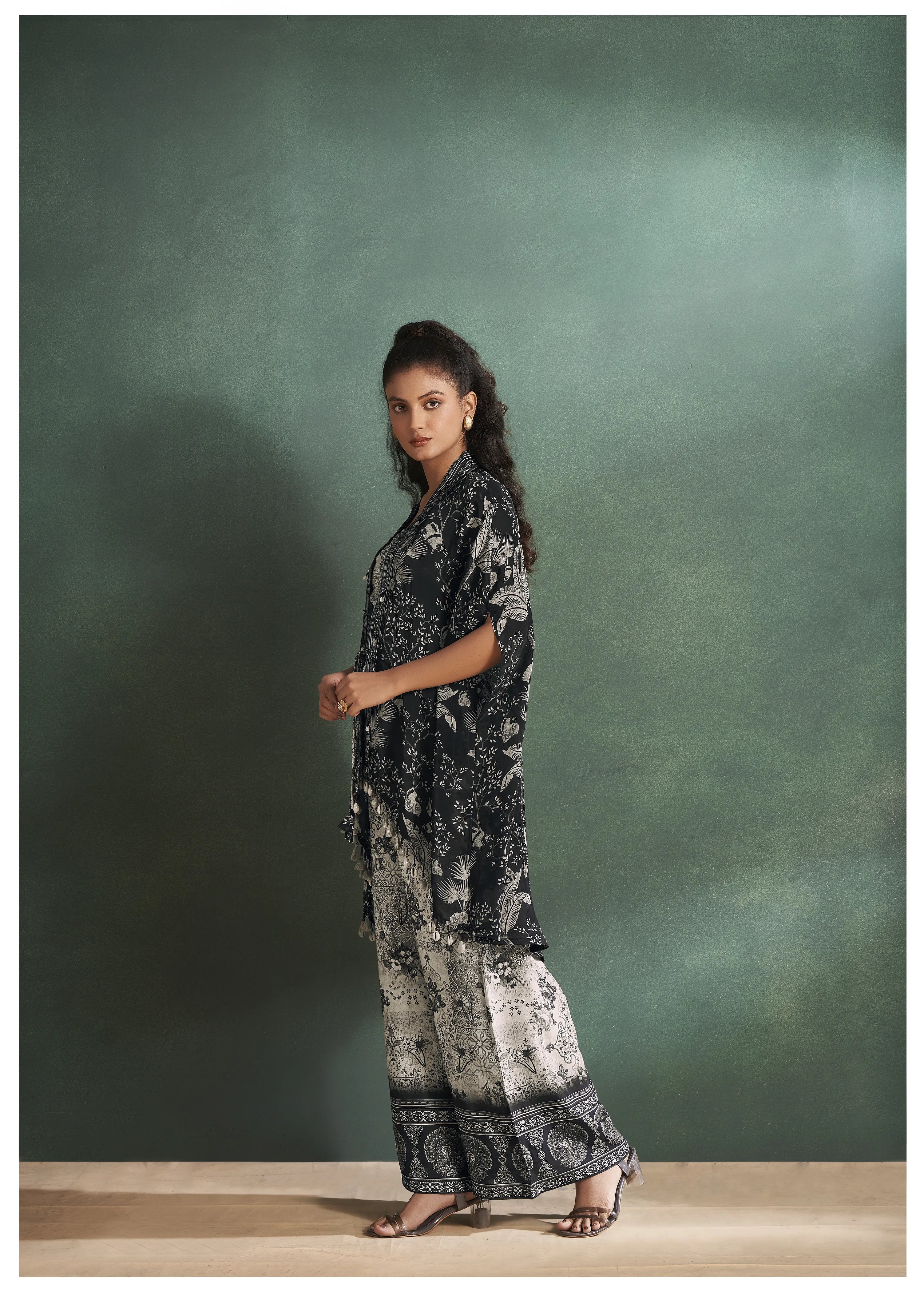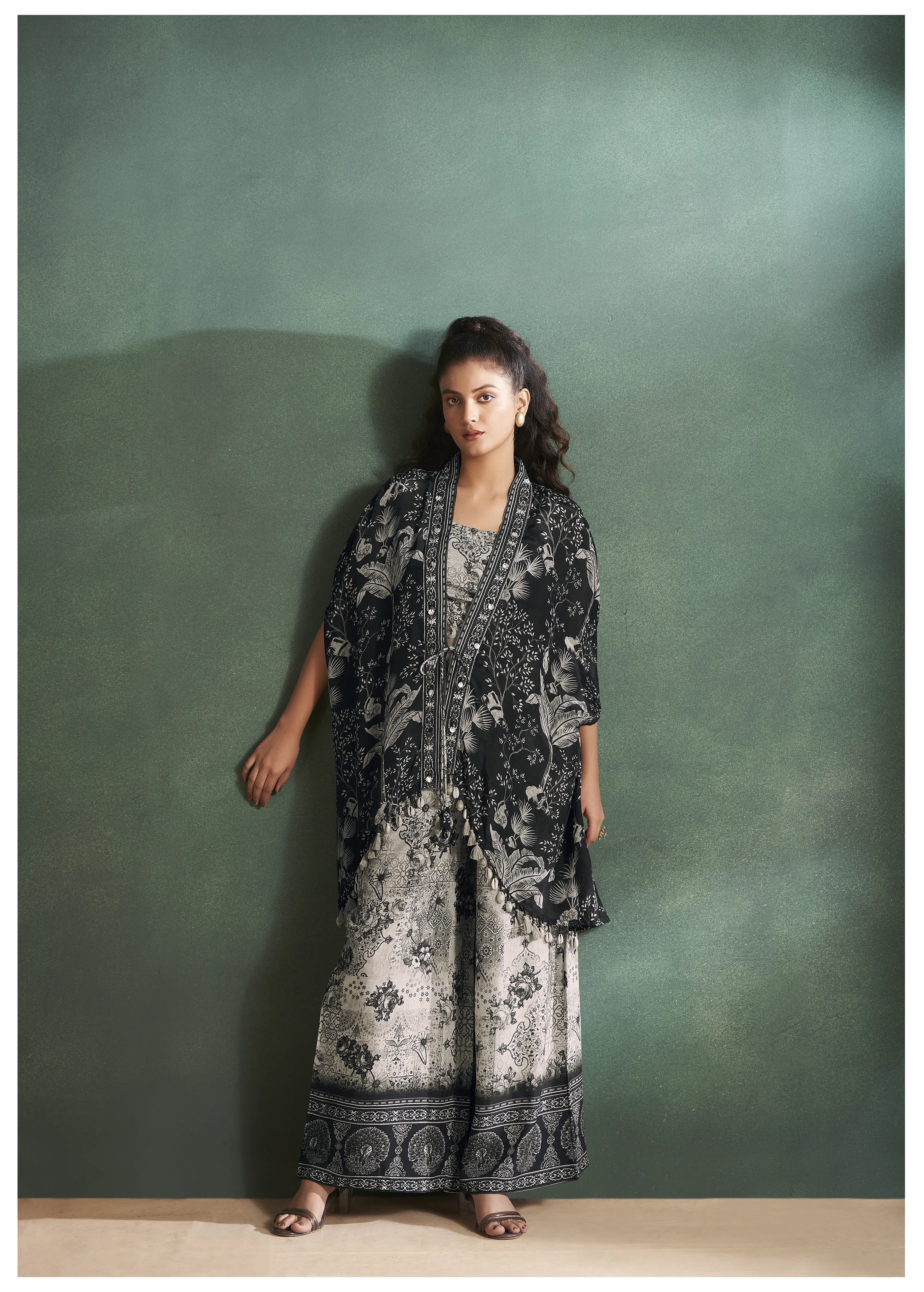 Black Floral Printed Muslin Detailed Shrug 3-Piece Set