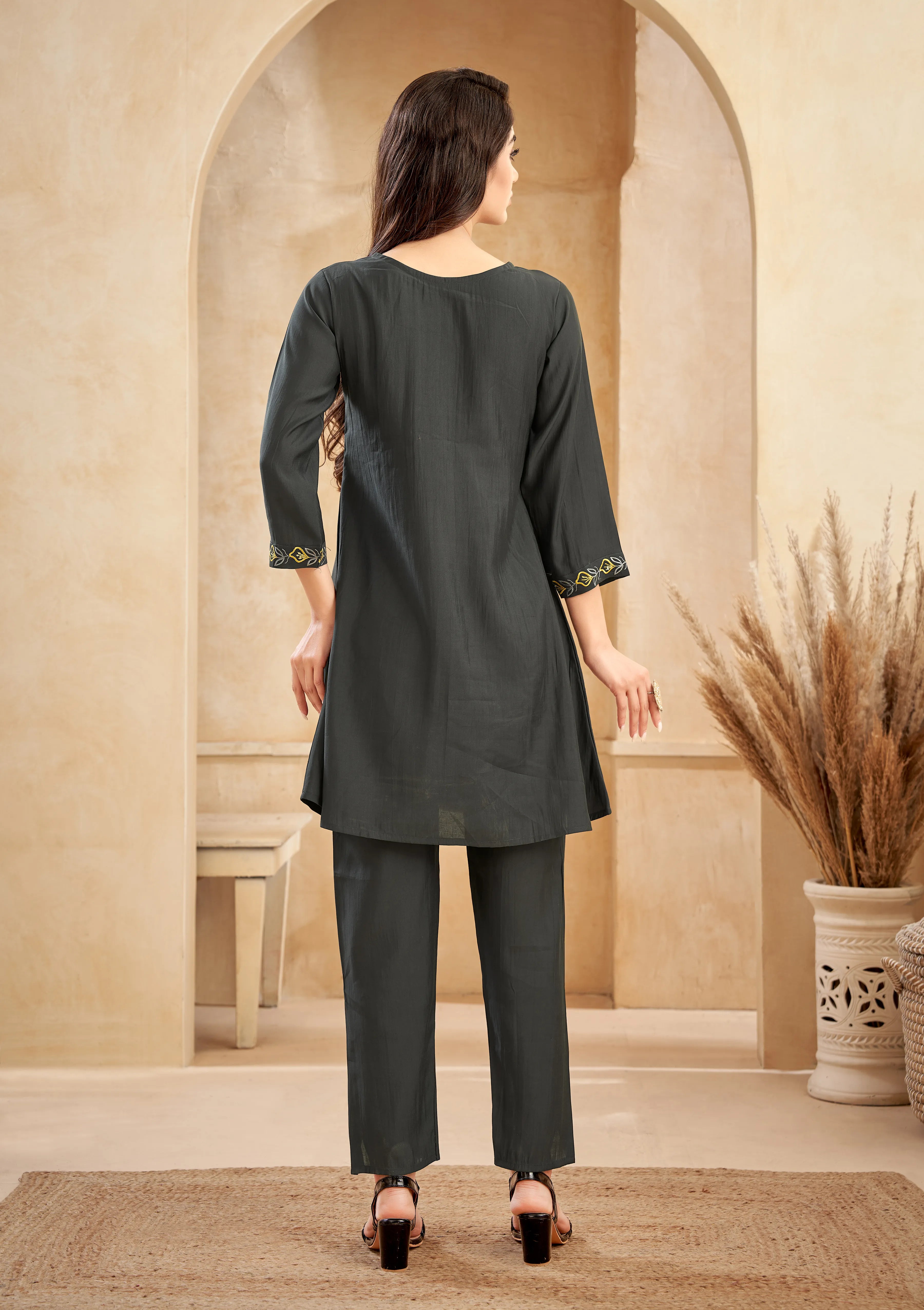 Grey Roman Silk Floral Embroidered Co-Ord Set