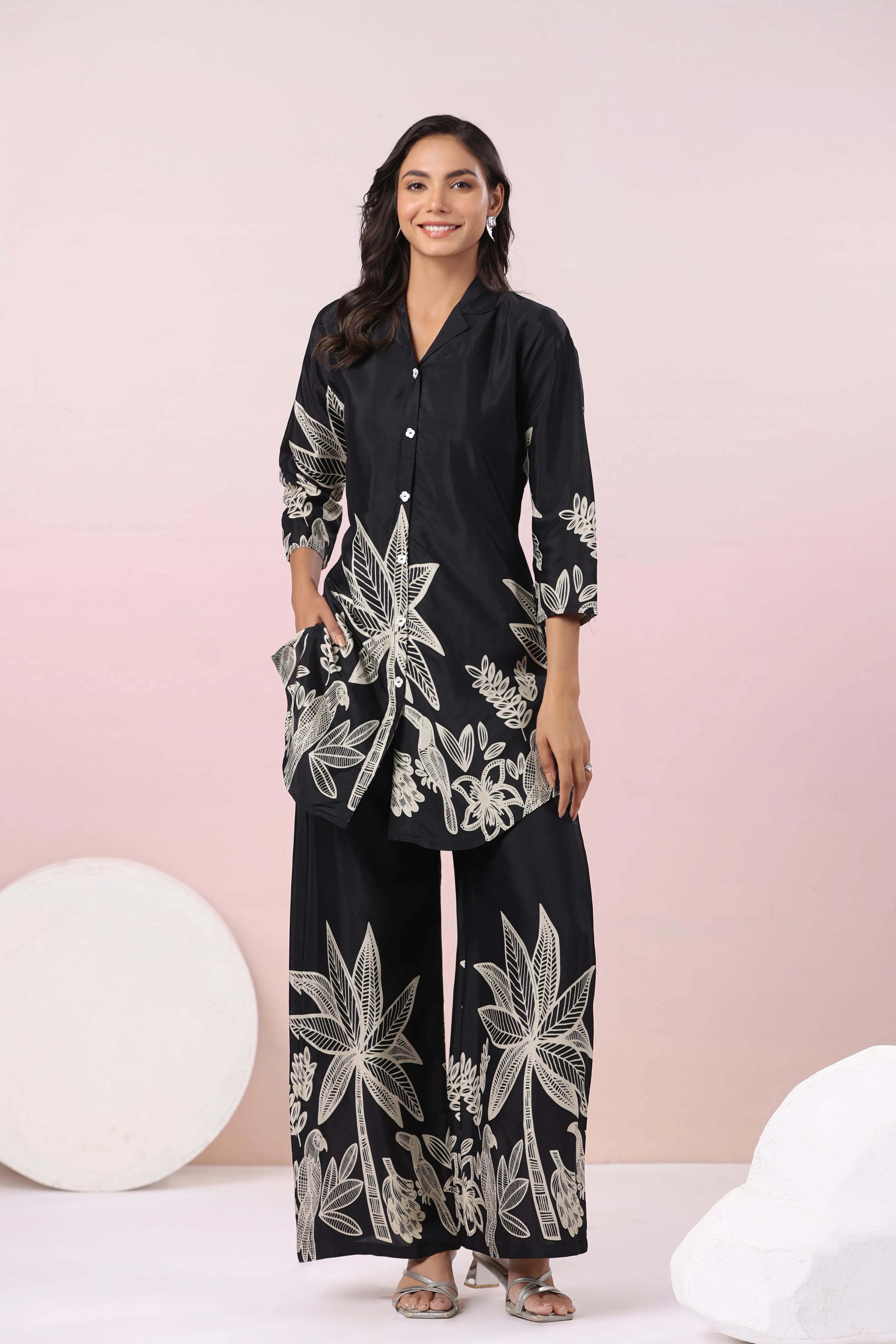 Black Bold Palm Russian Silk Print Co-Ord Set
