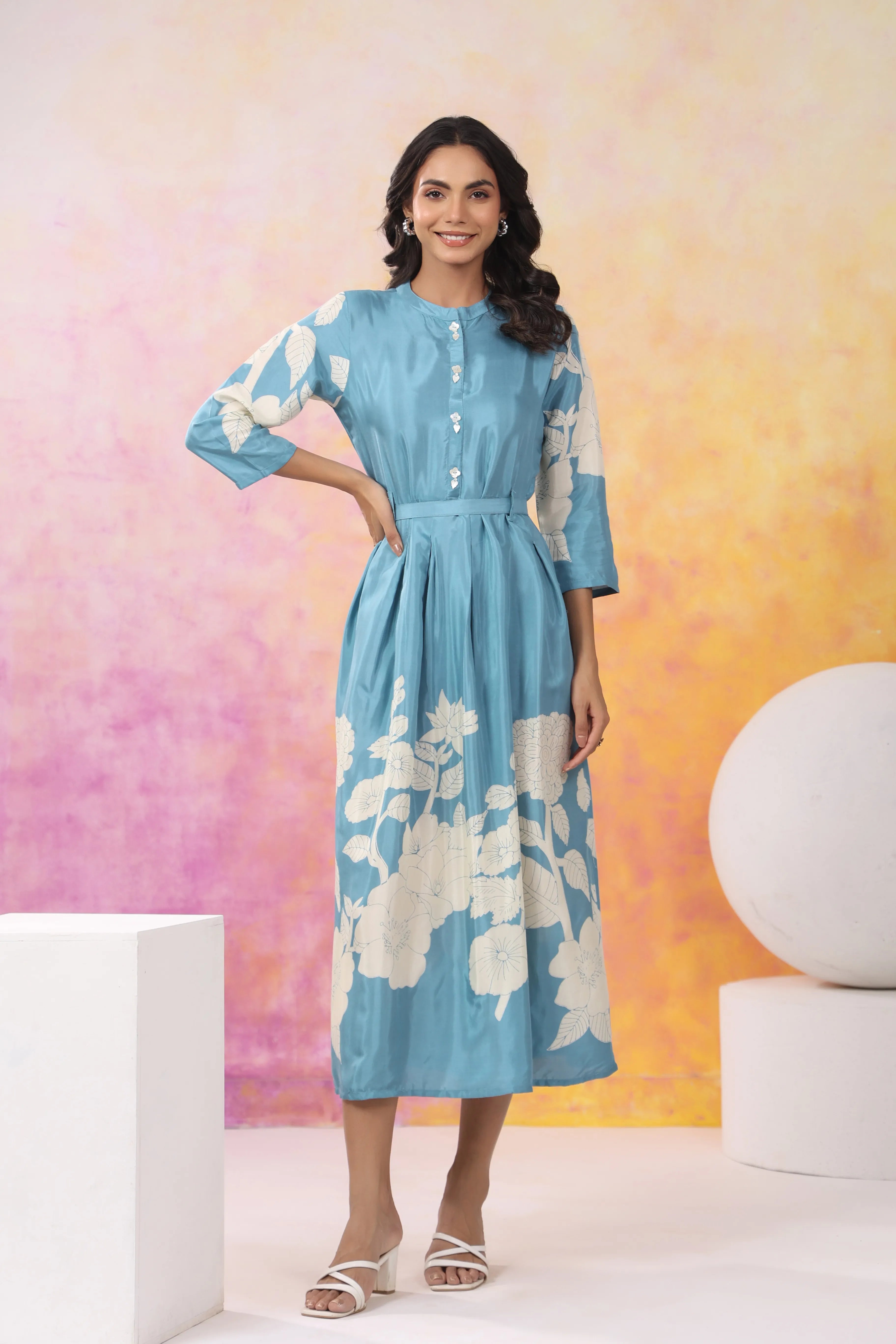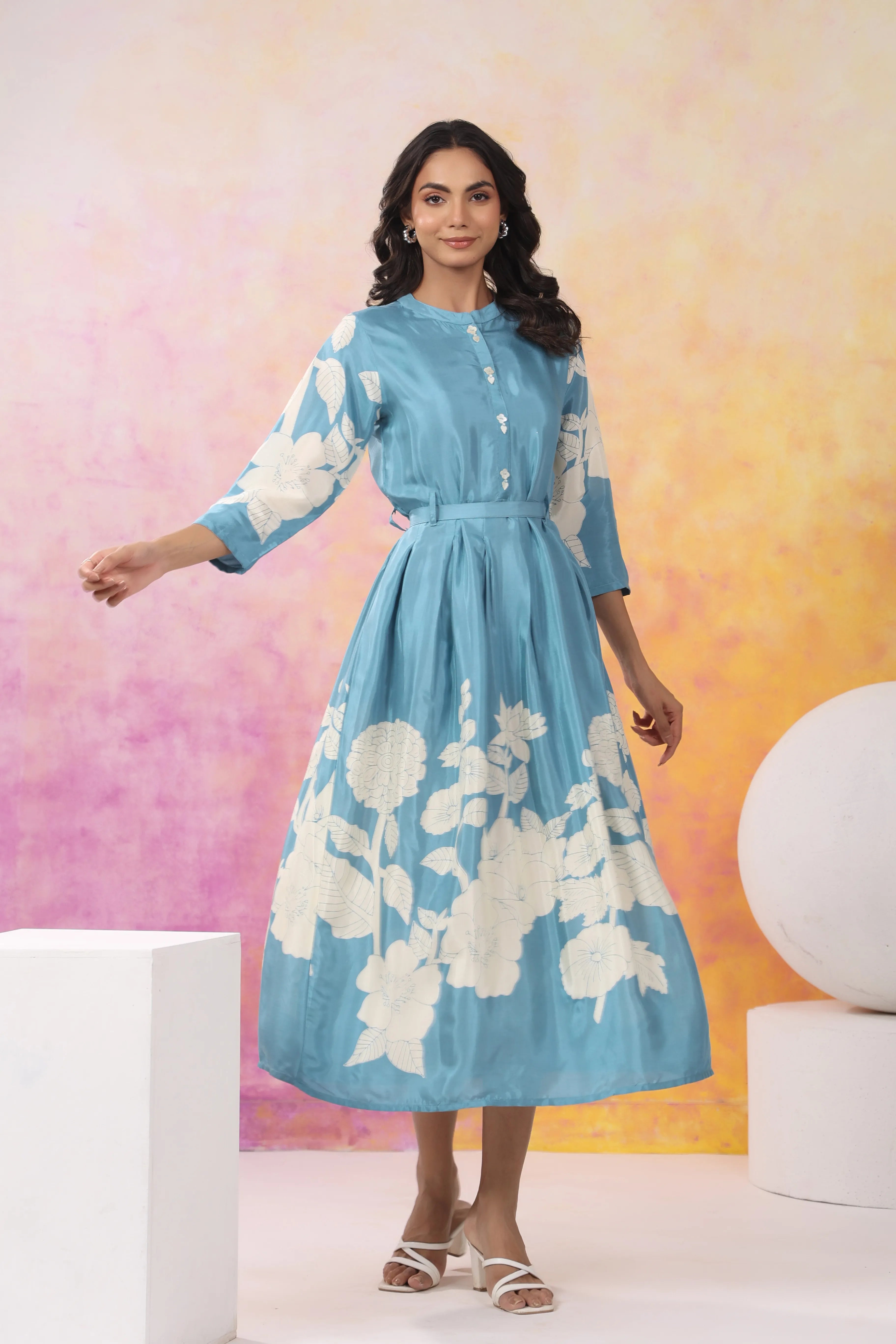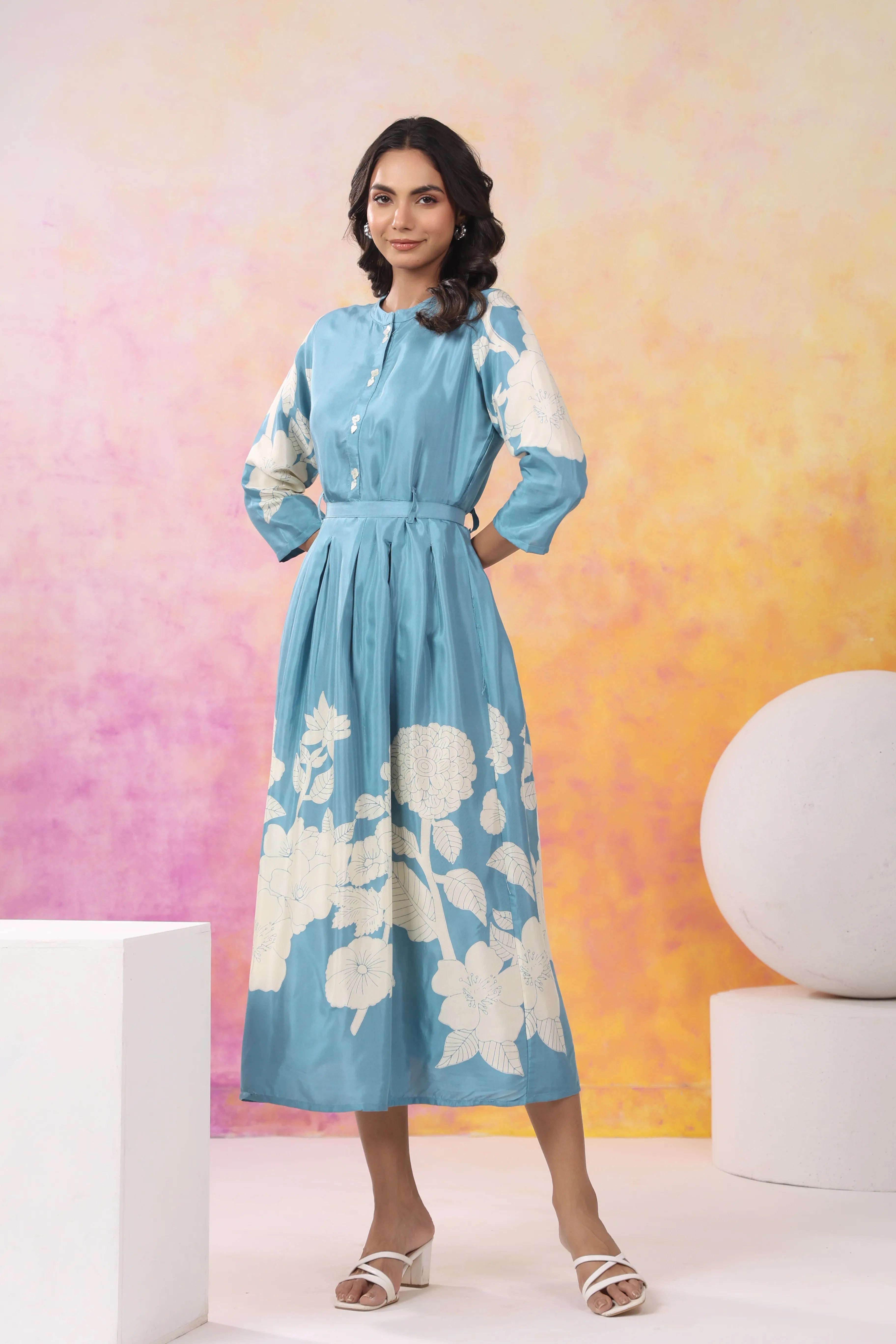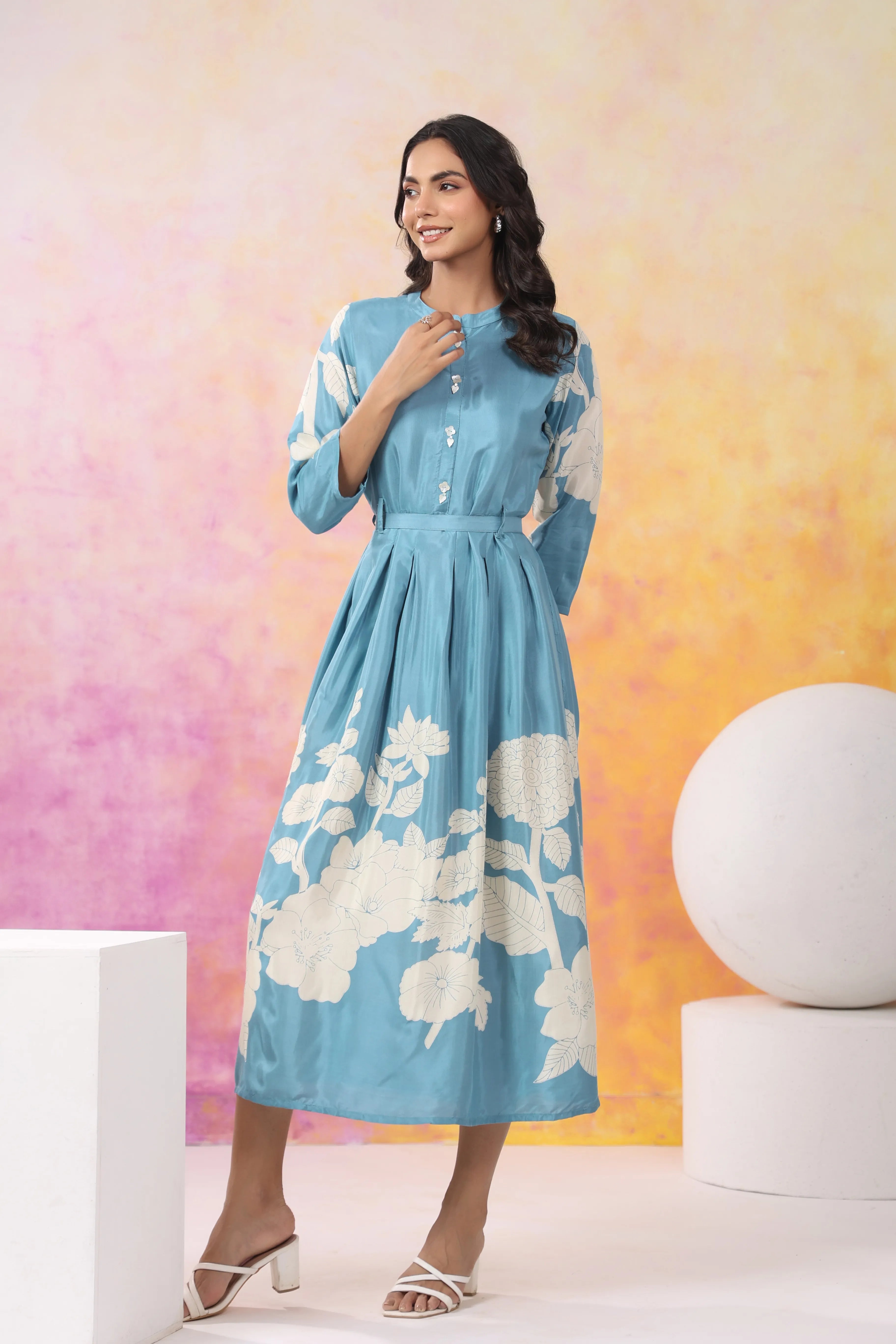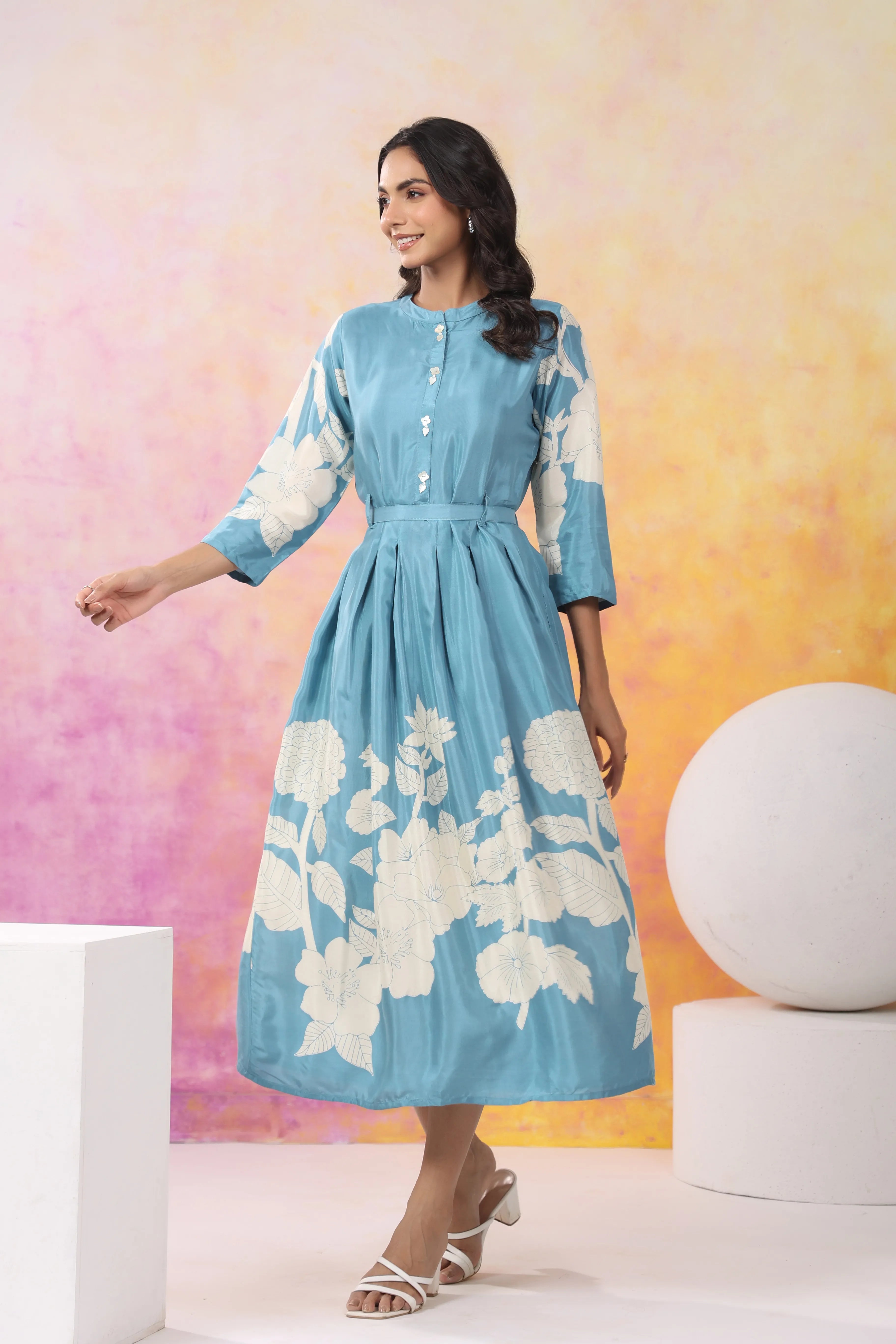 Graceful Charm with the Aqua Blue Floral Russian Silk Midi Dress