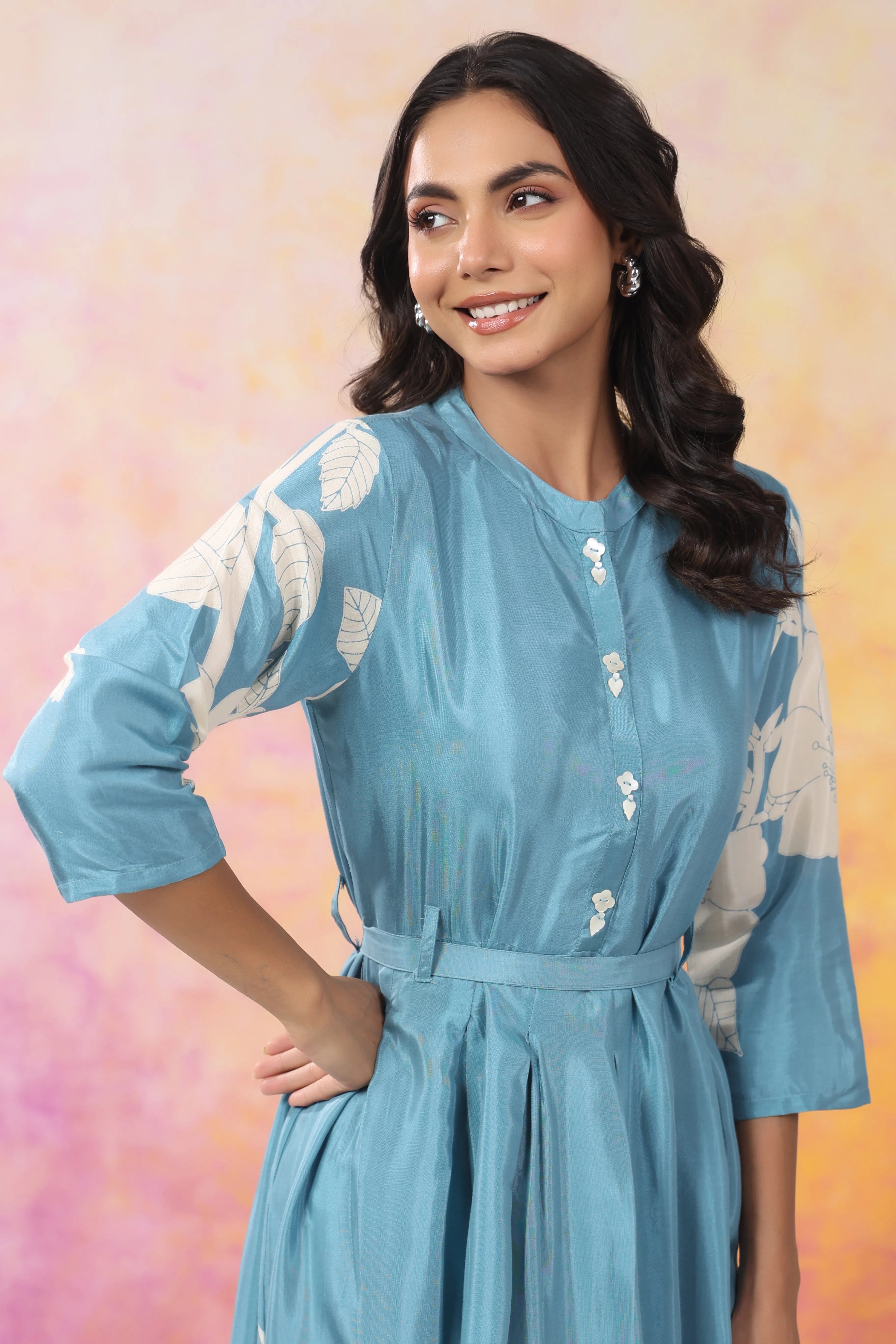 Step into elegance with this stunning aqua blue midi dress, crafted from luxurious Russian silk for a smooth and graceful drape. Featuring a cream-colored bold flower motif, this dress is designed with a classic round neckline, printed3/4th sleeves and hem for a sophisticated finish. The front is adorned with shell buttons and a tie-back detail, creating a flattering silhouette that combines comfort with style.