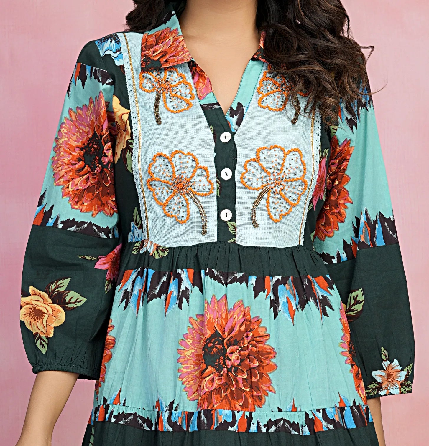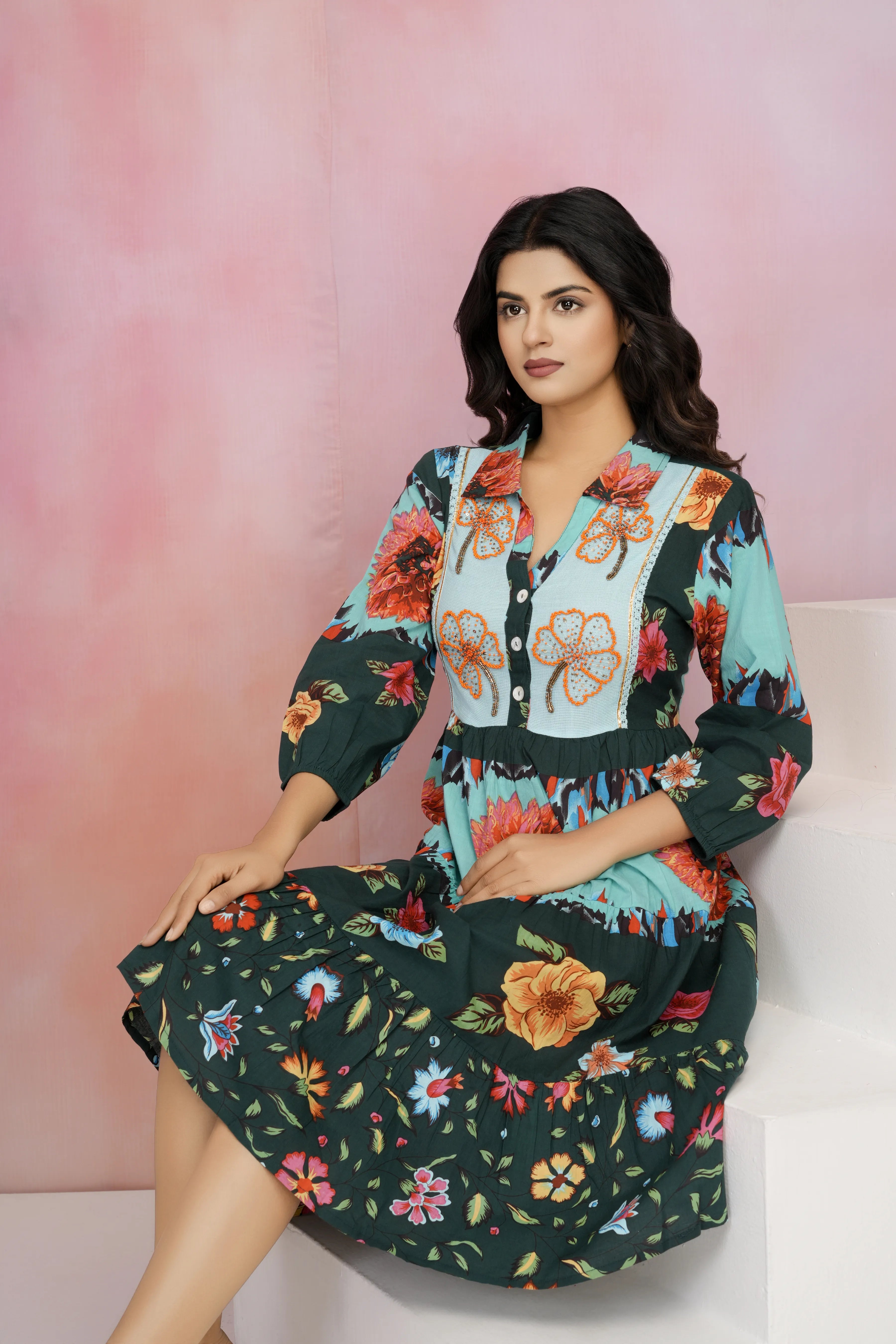 This dark green cotton dress, featuring an orange abstract floral print and delicate sequence beaded details, is a showstopper. The lace-trimmed button-front design with a shirt collar adds a sophisticated touch, making it perfect for casual outings or refined occasions.
