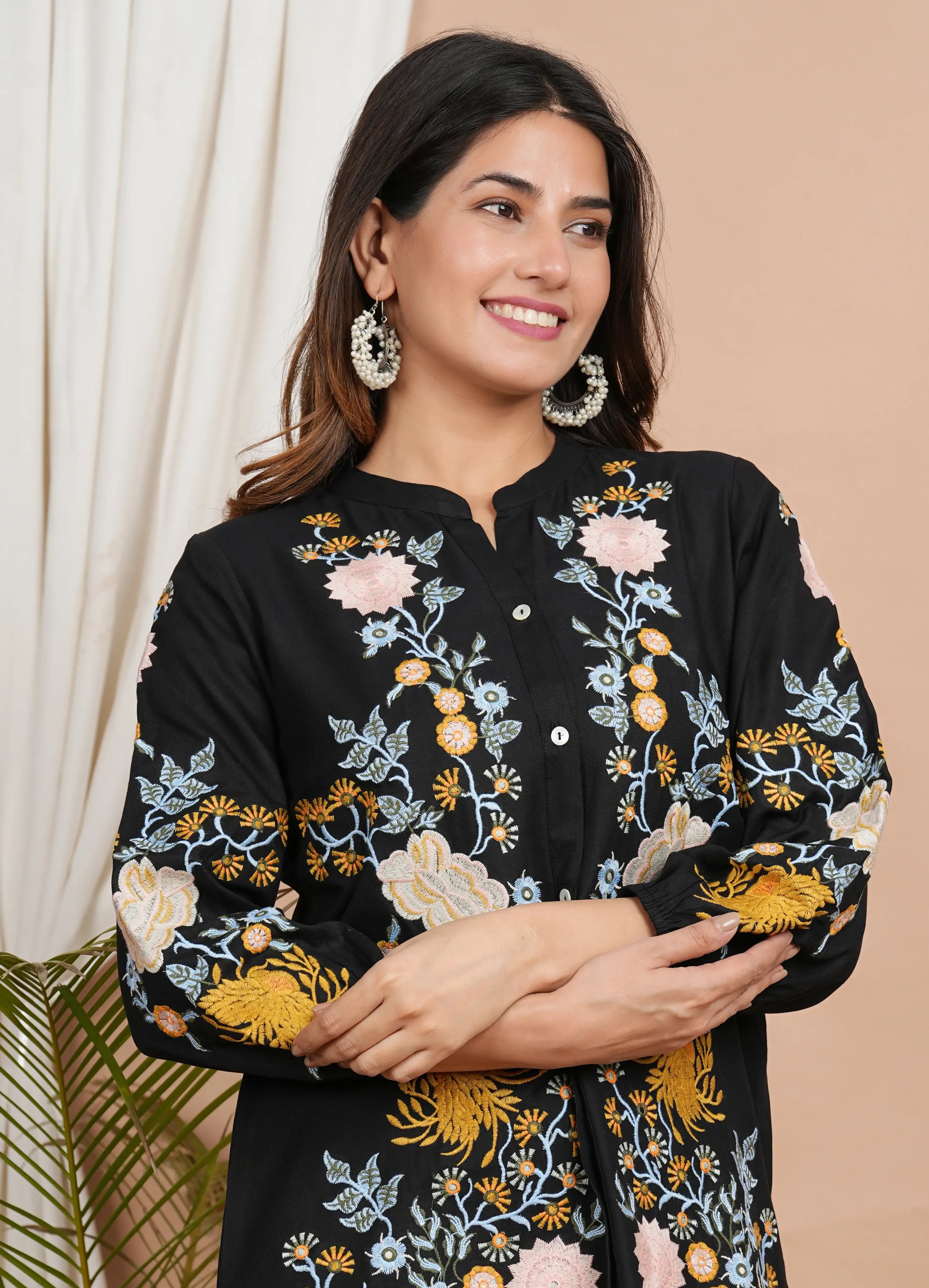 Step into effortless elegance with this black cotton shirt dress, adorned with exquisite placement floral multi-thread embroidery. The round neck and 3/4th elasticated sleeves add a refined touch, Crafted from soft cotton, this 33-inch dress ensures comfort without compromising on sophistication.