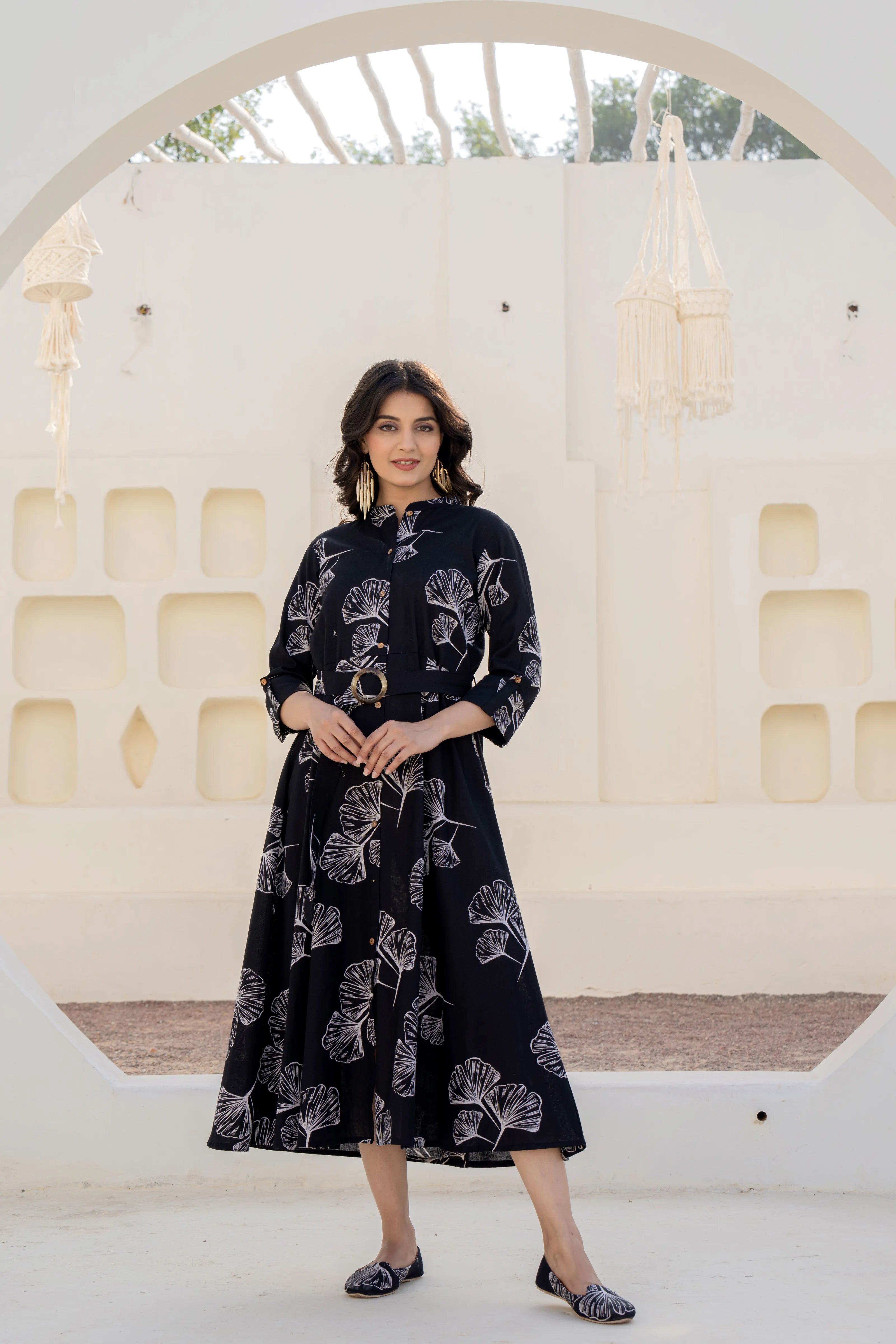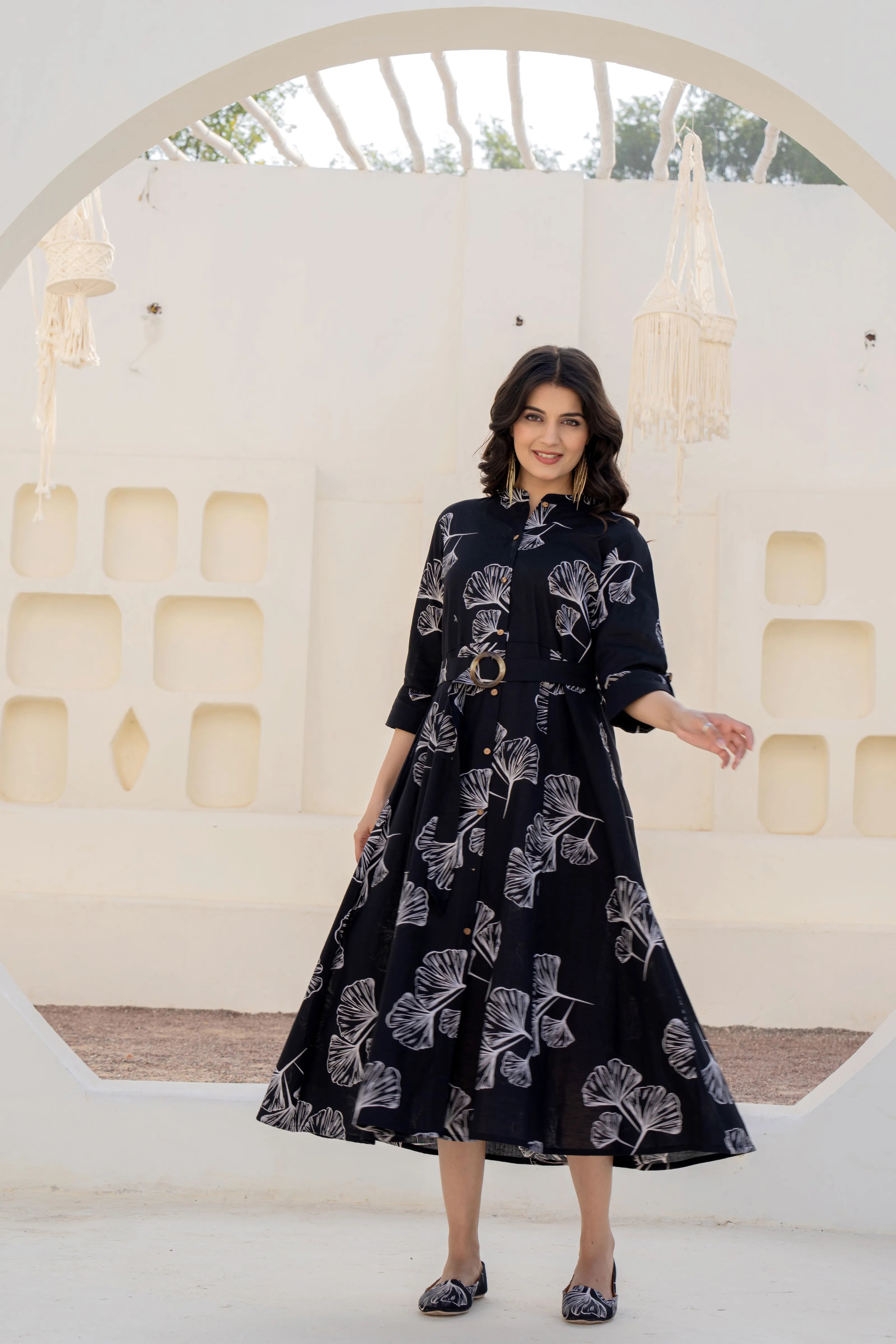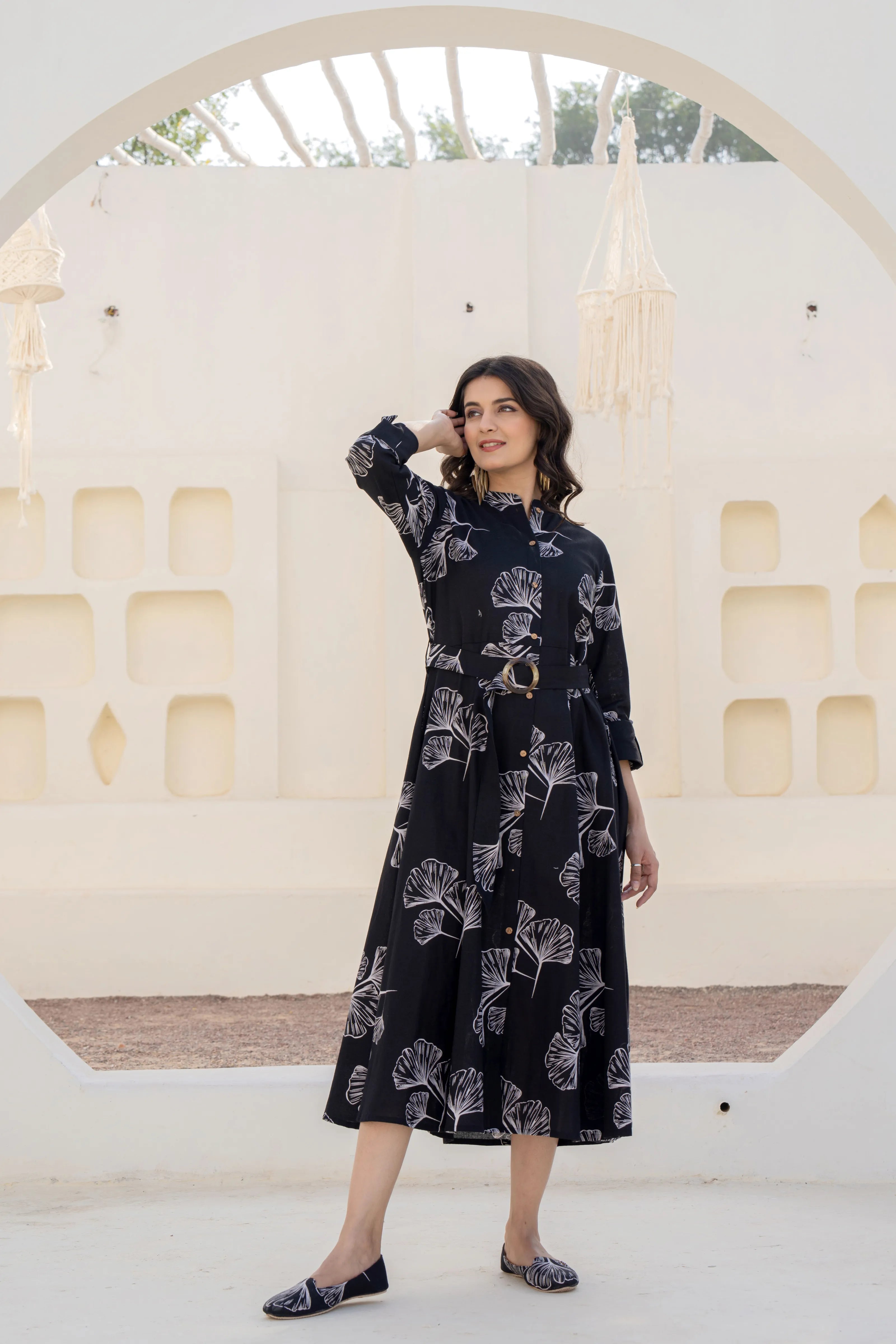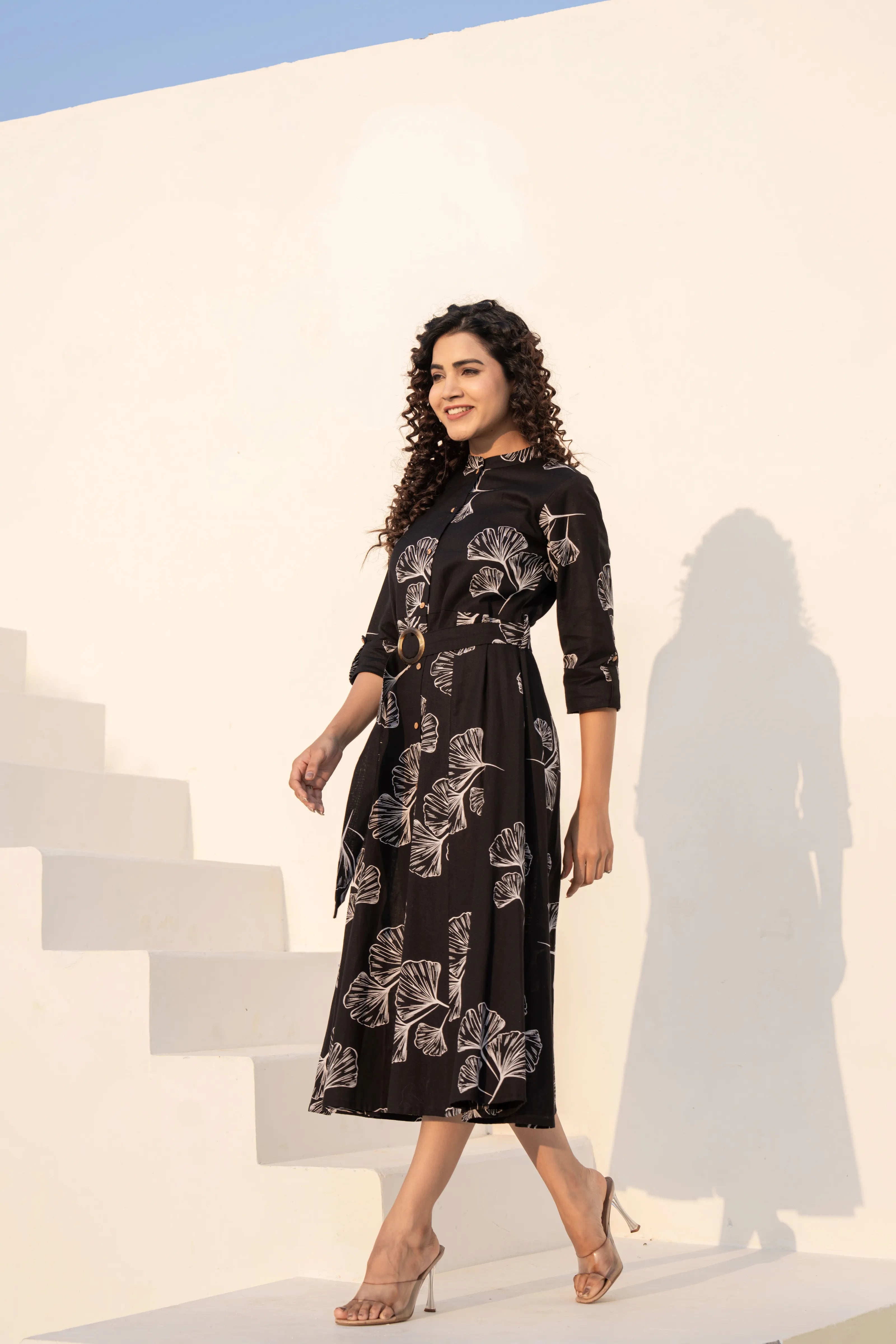 Monochrome Grace: Black Ginkgo Leaf Printed Belted Midi Dress in Viscose