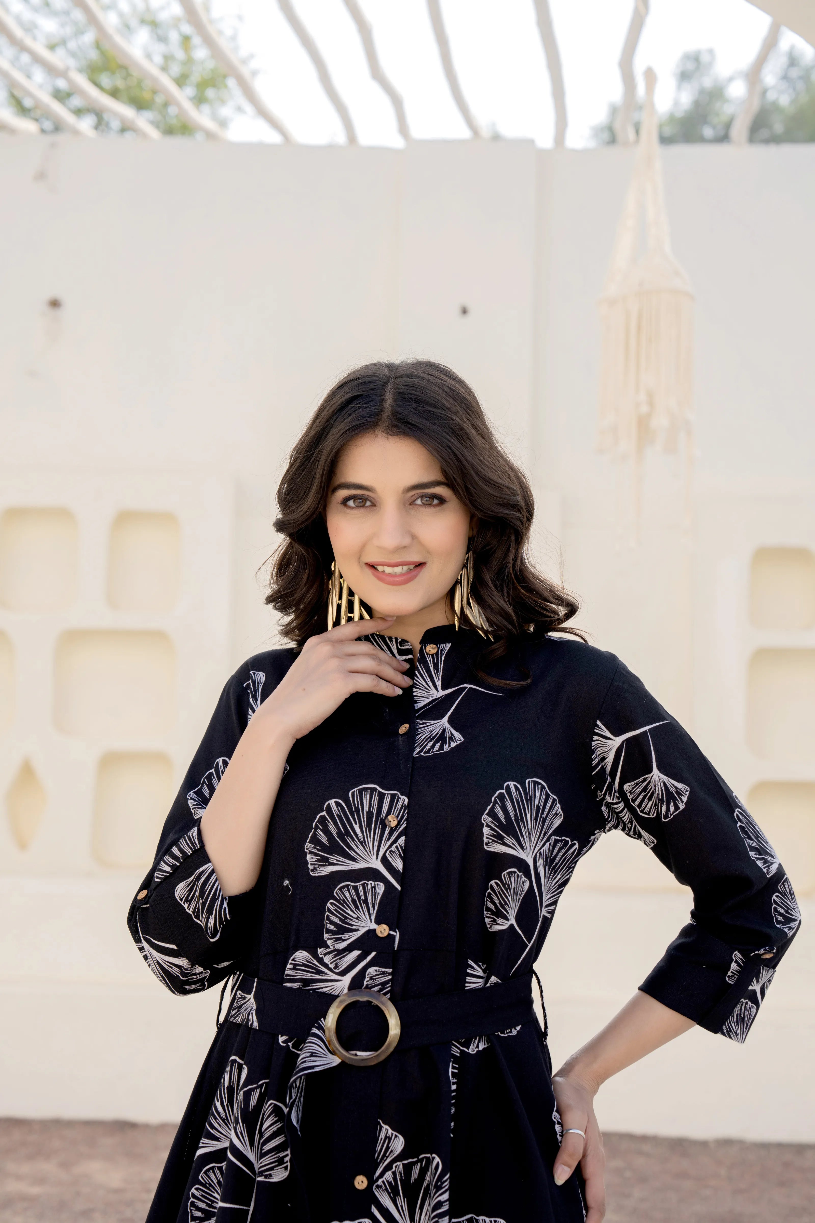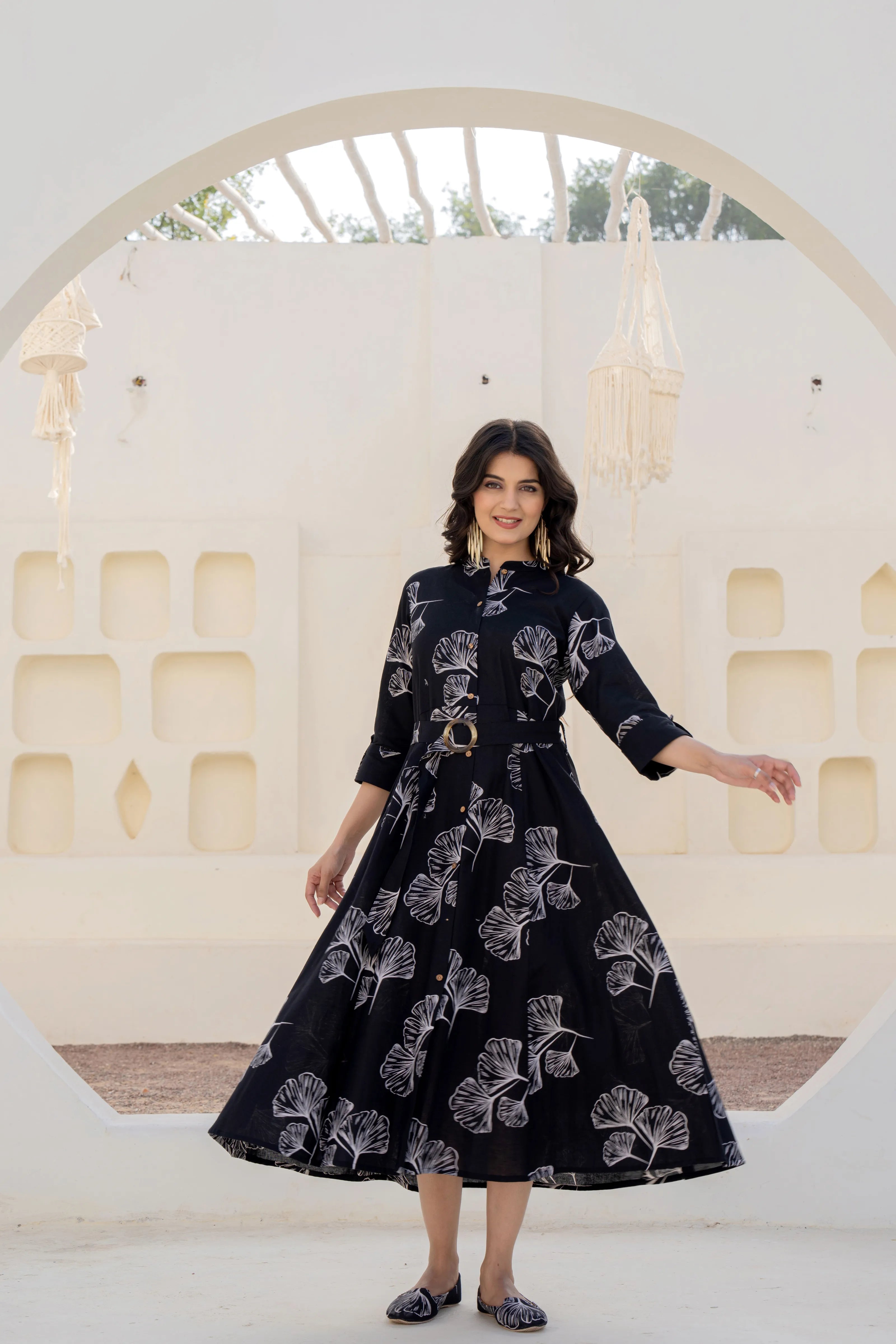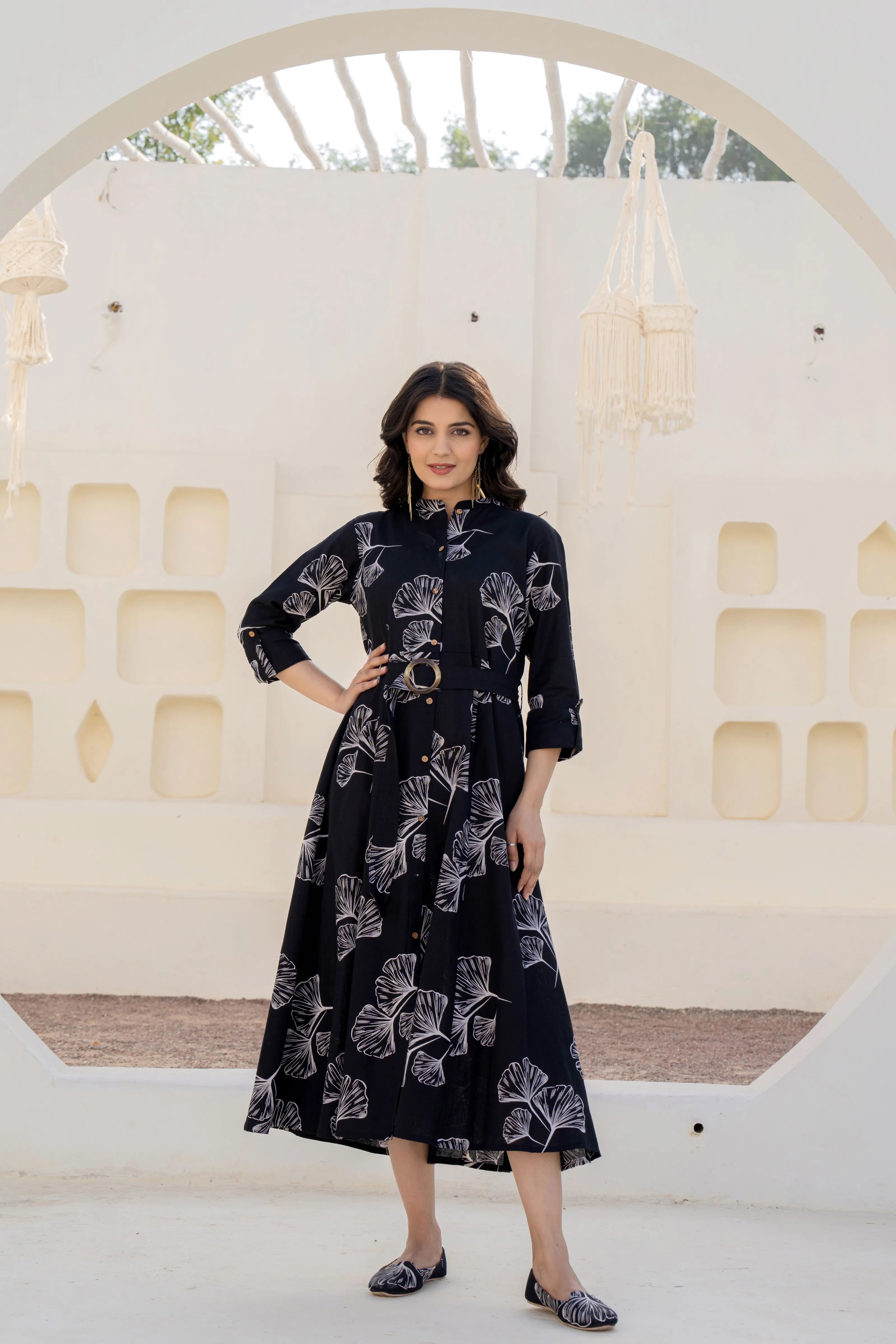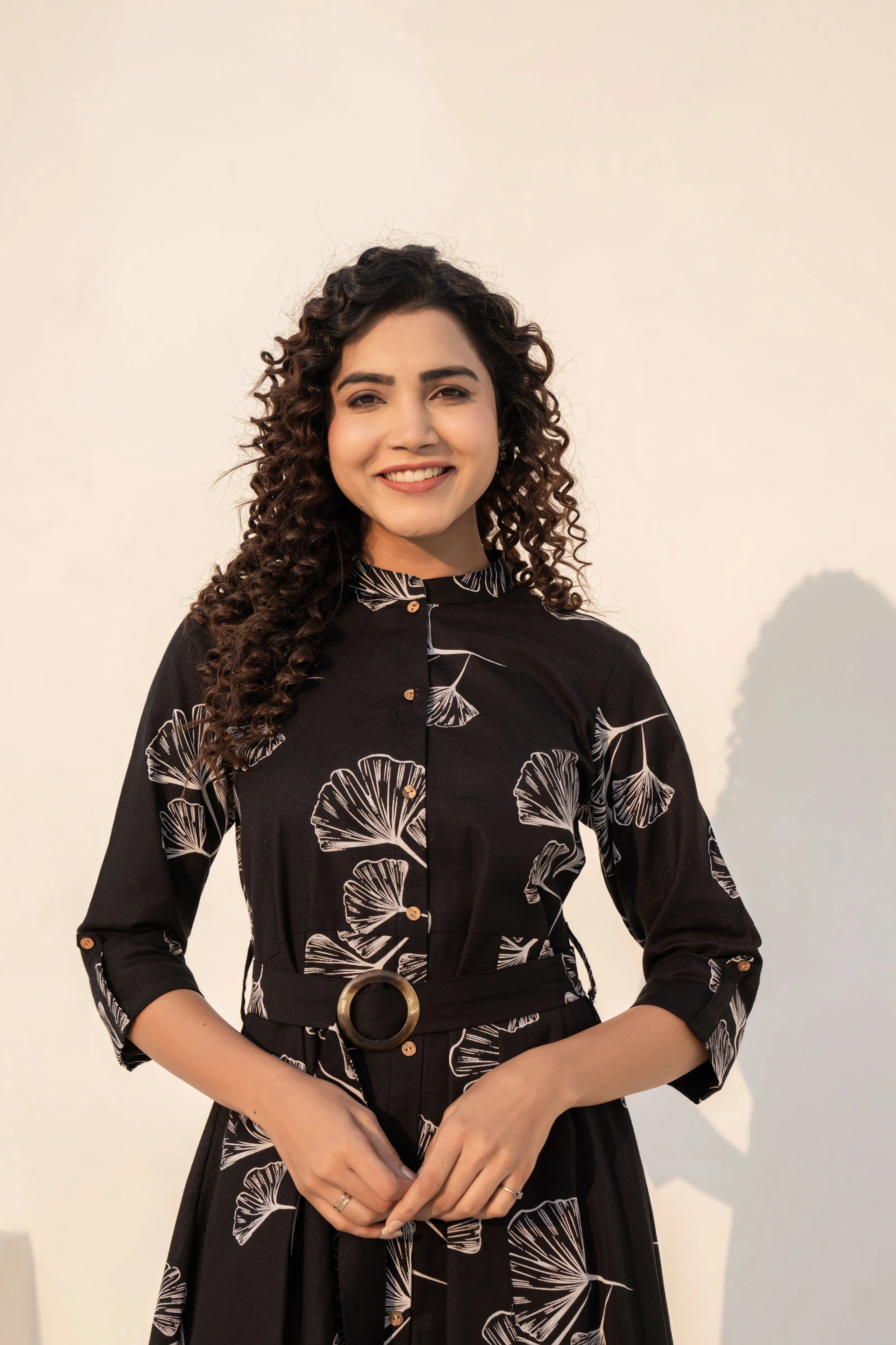 Monochrome Grace: Black Ginkgo Leaf Printed Belted Midi Dress in Viscose