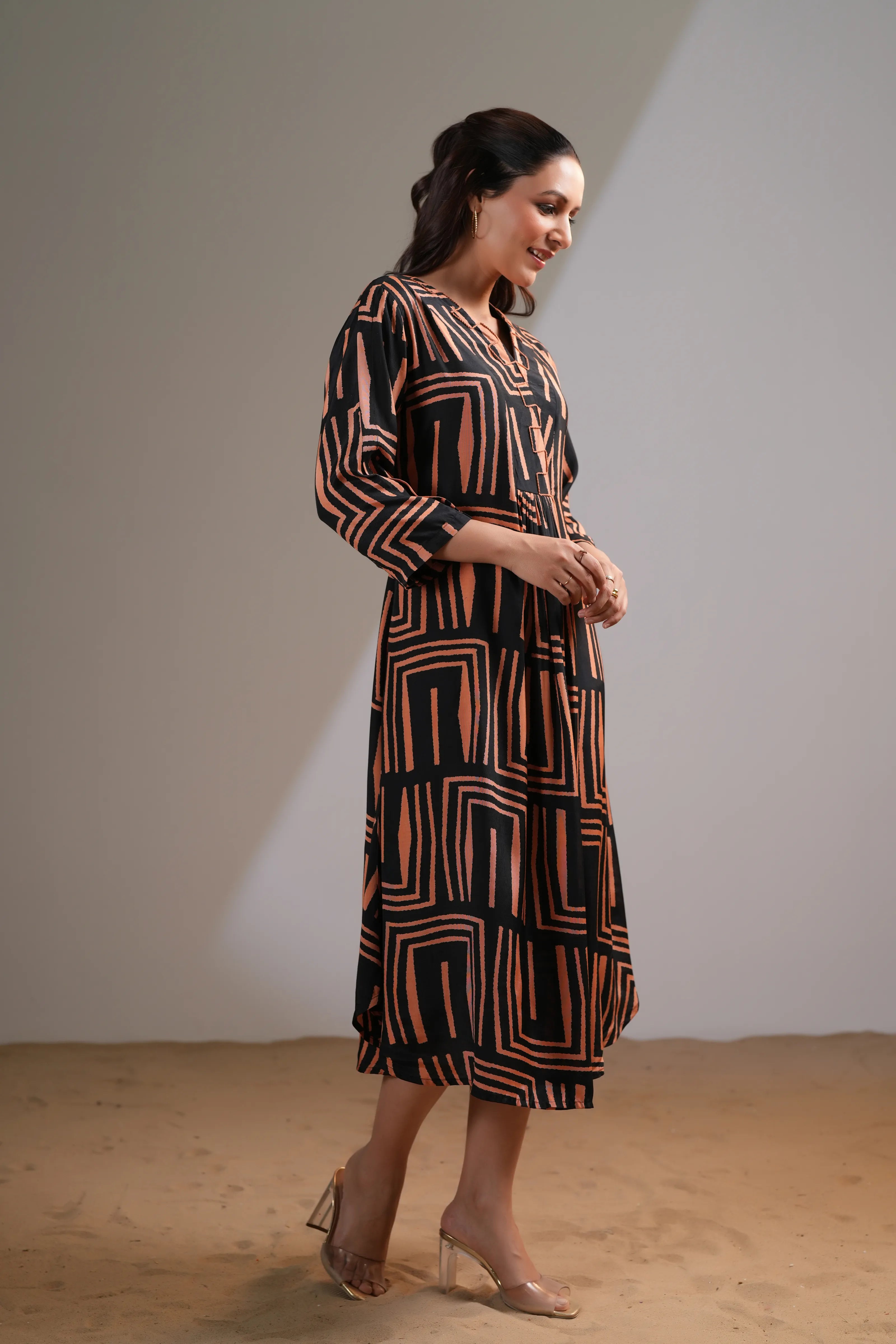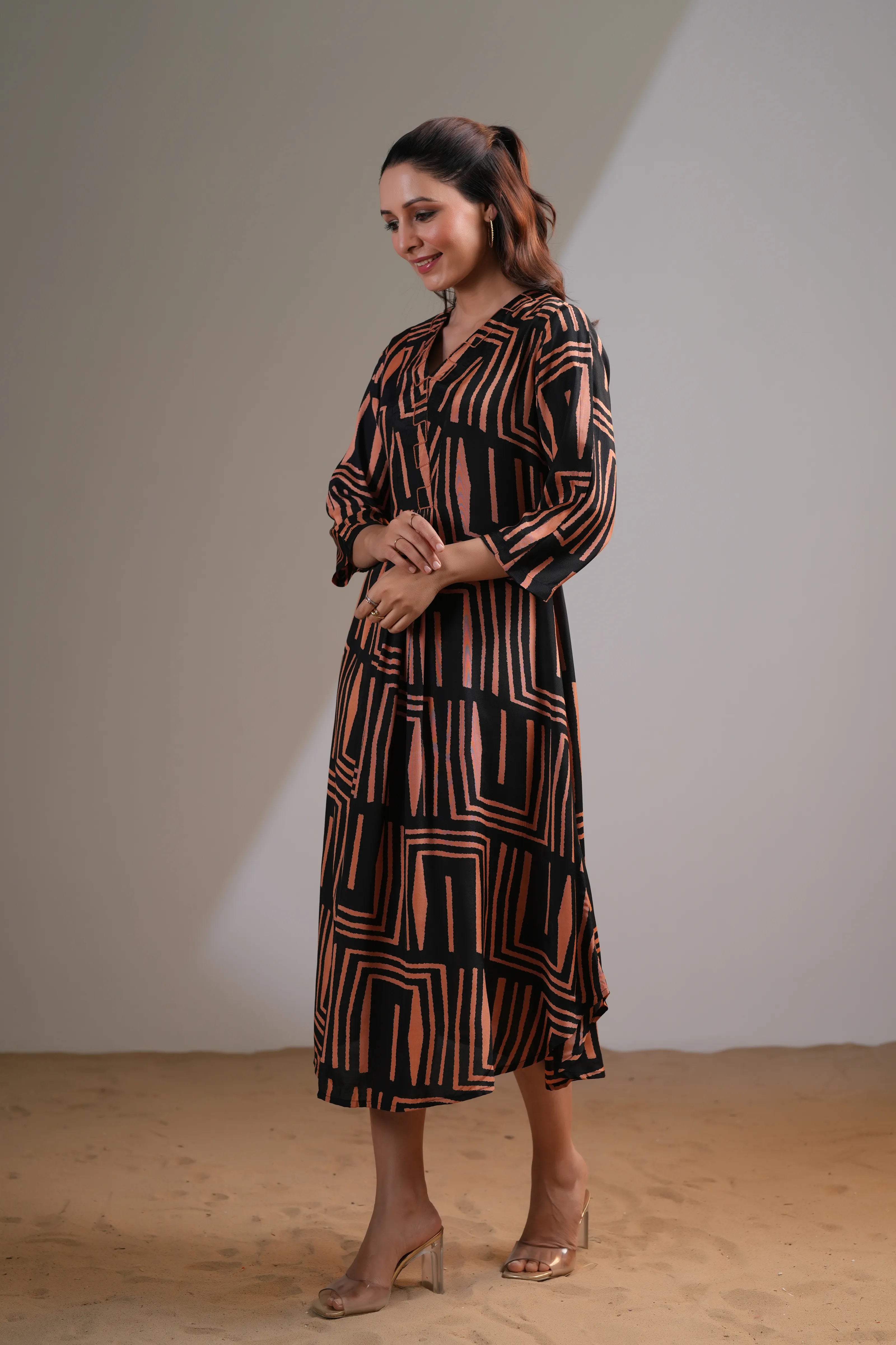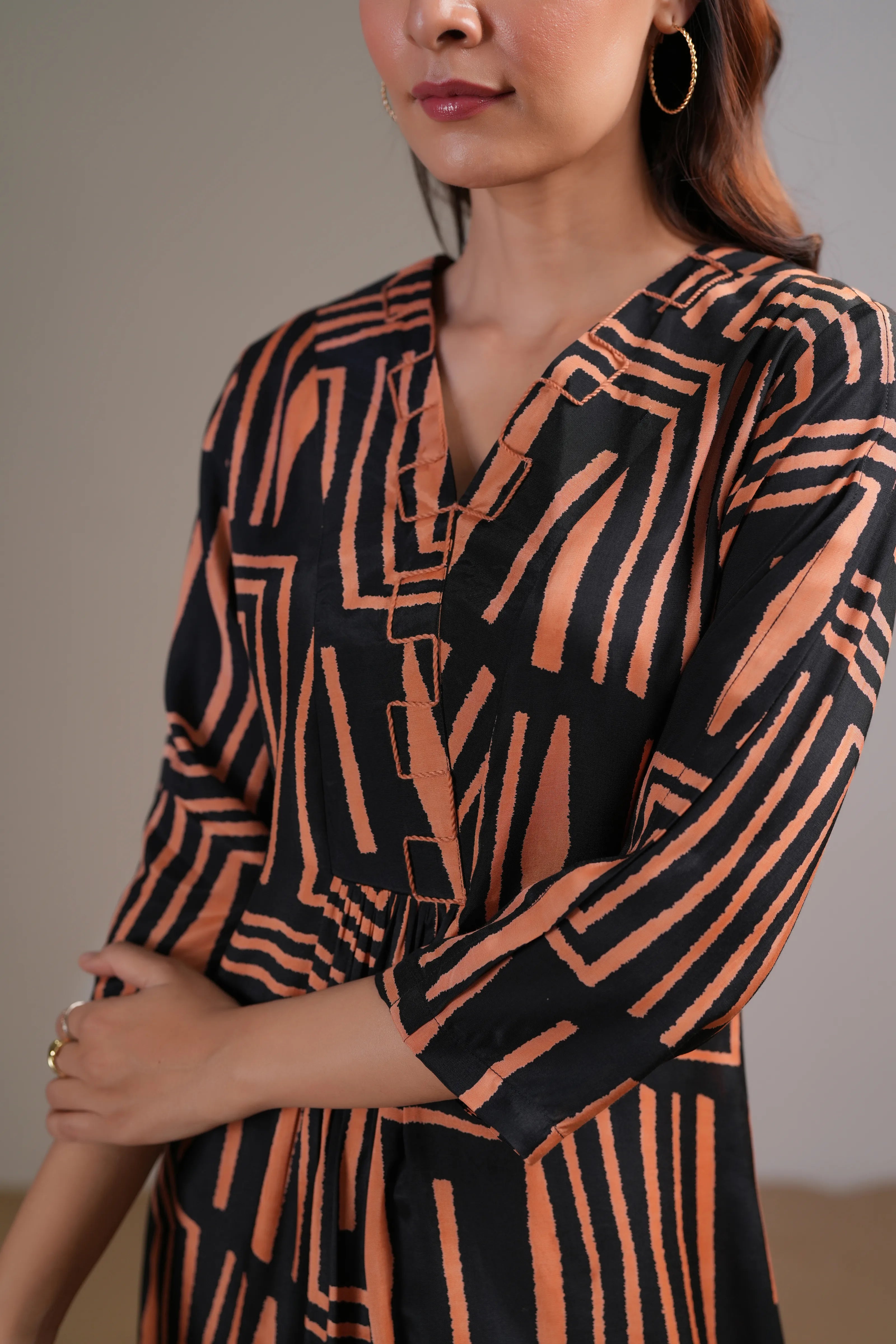 Turn heads with this striking Black & Orange abstract stripe printed maxi dress, designed in luxe Russian silk for an elegant flow. Featuring a flattering V-neckline, full sleeves, and intricate cord work detailing, this dress brings together comfort and bold style effortlessly.