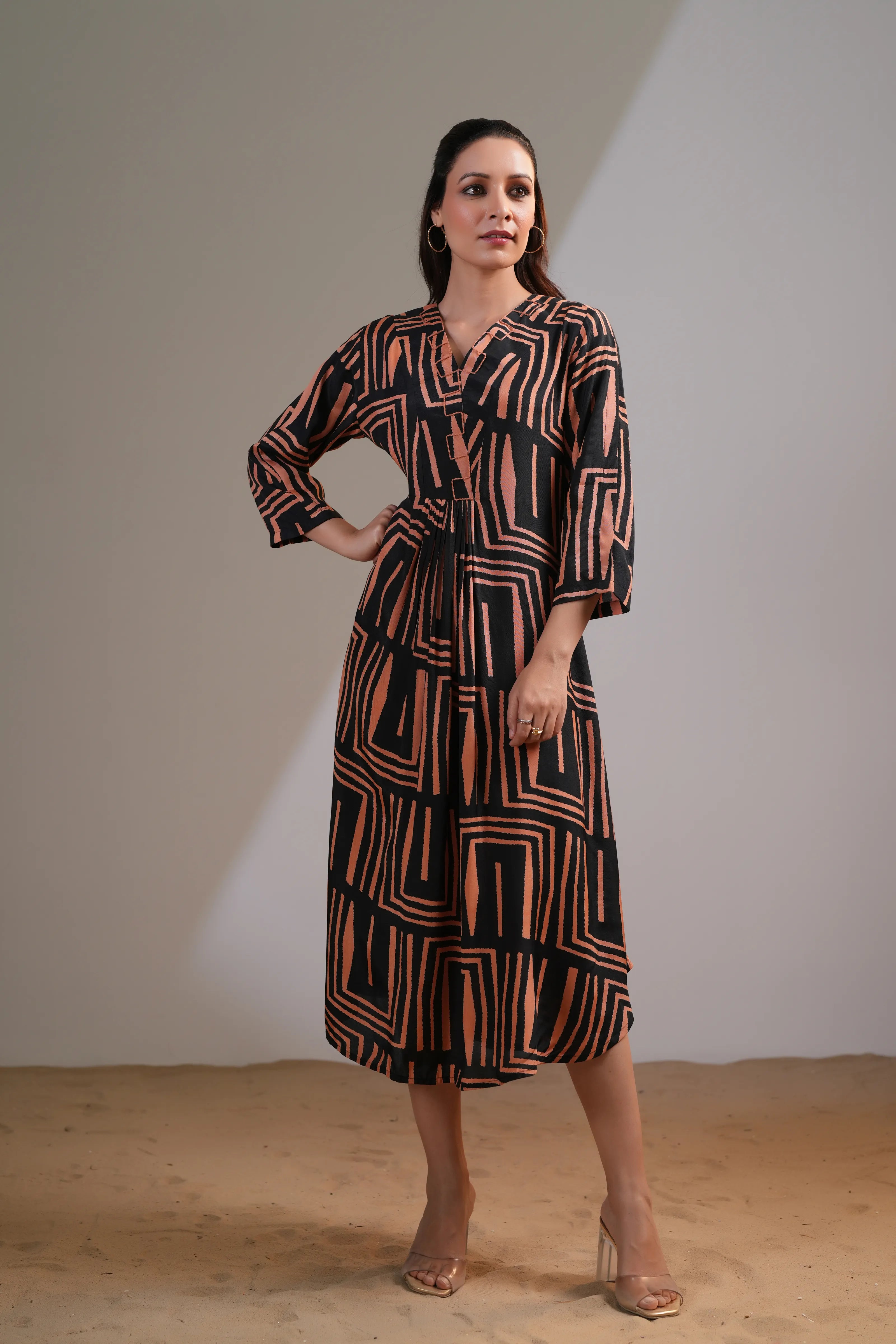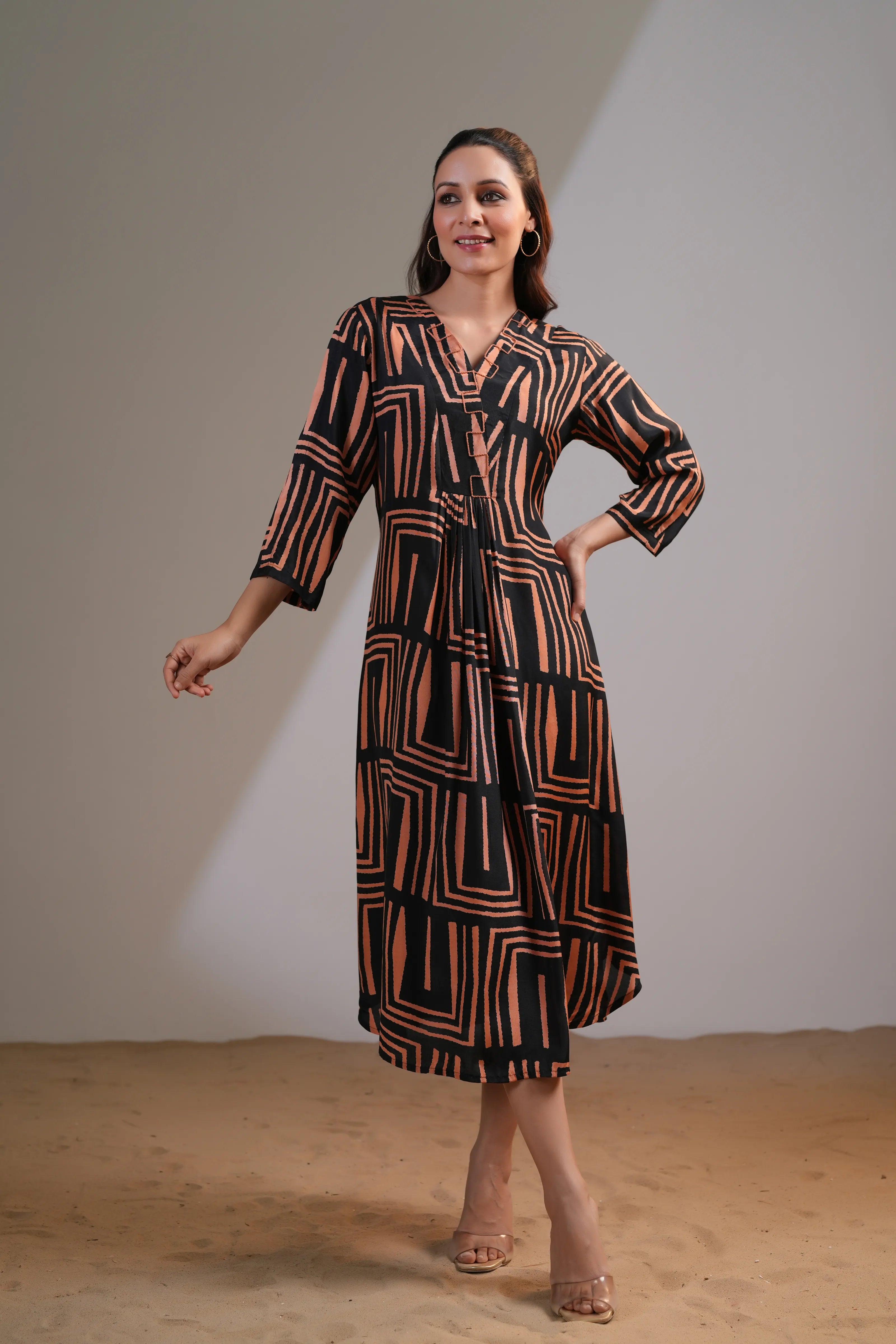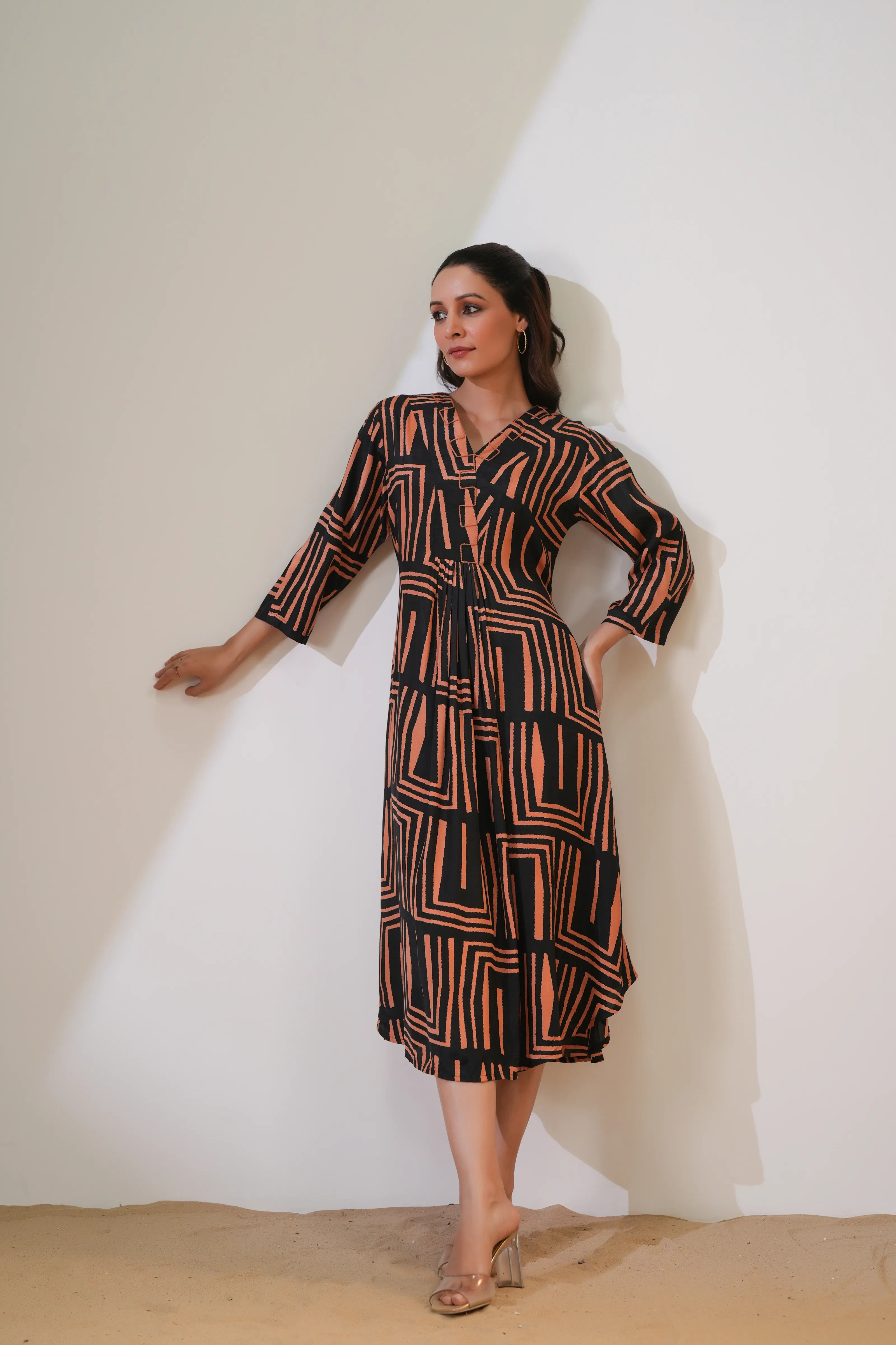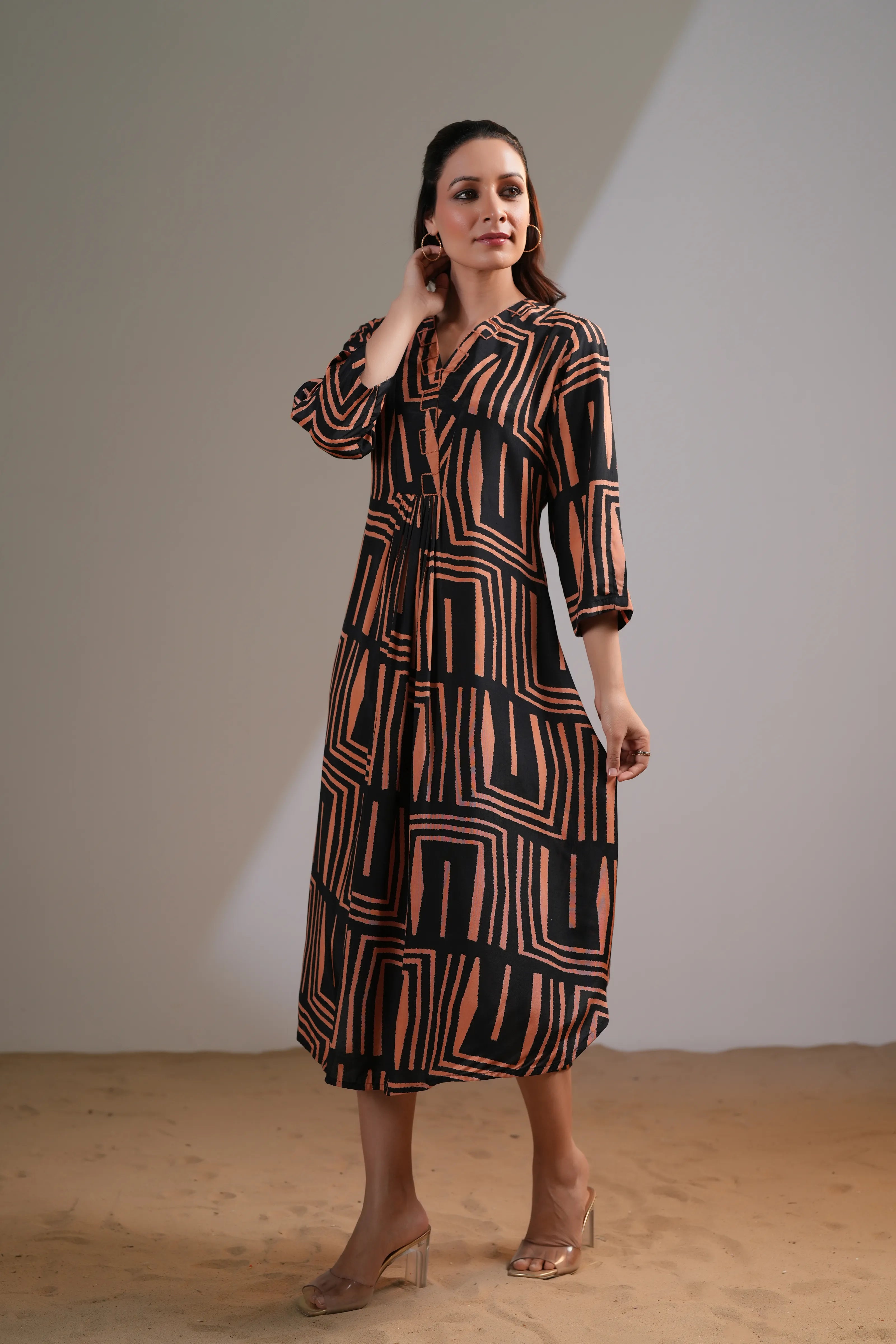 Turn heads with this striking Black & Orange abstract stripe printed maxi dress, designed in luxe Russian silk for an elegant flow. Featuring a flattering V-neckline, full sleeves, and intricate cord work detailing, this dress brings together comfort and bold style effortlessly.