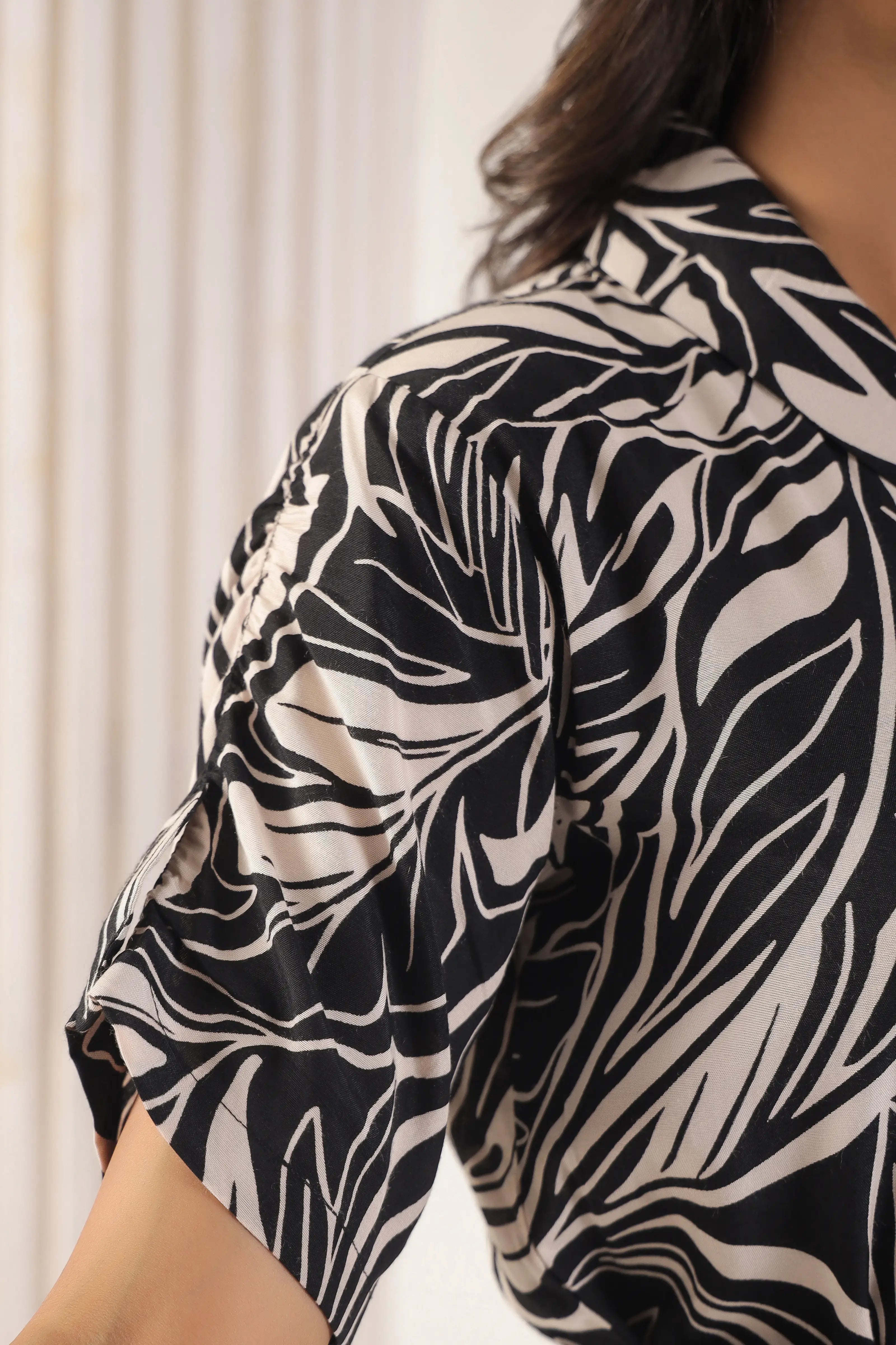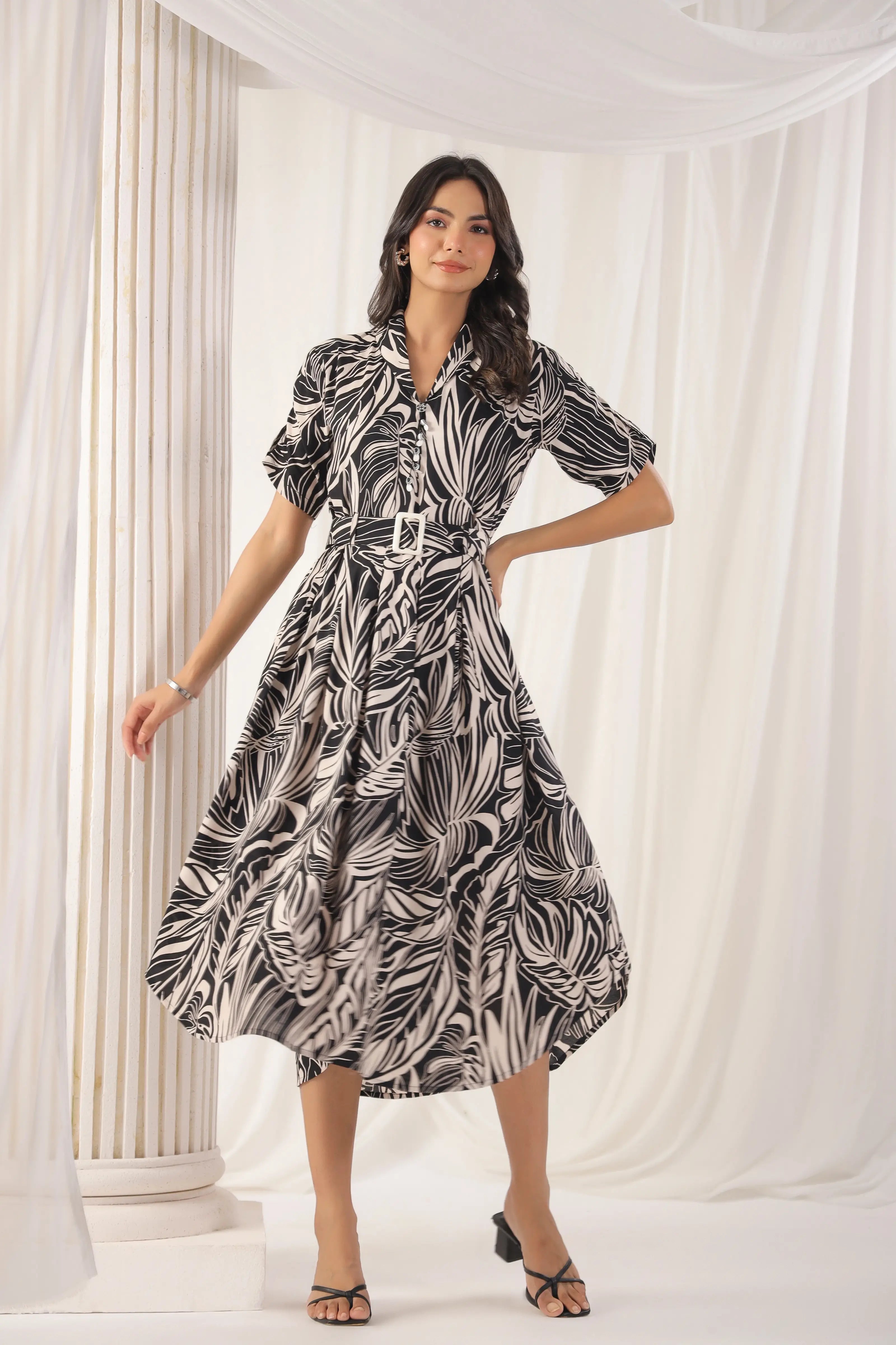 This stunning midi dress is crafted from luxurious Russian silk, offering a chic, sophisticated look with a touch of playfulness. The bold abstract prints stand out against a classic black base, while the lapel collar, shell buttons, and buckle front detailing ensure a flattering fit. Ideal for casual outings, this dress brings an elegant yet fun vibe to your wardrobe.