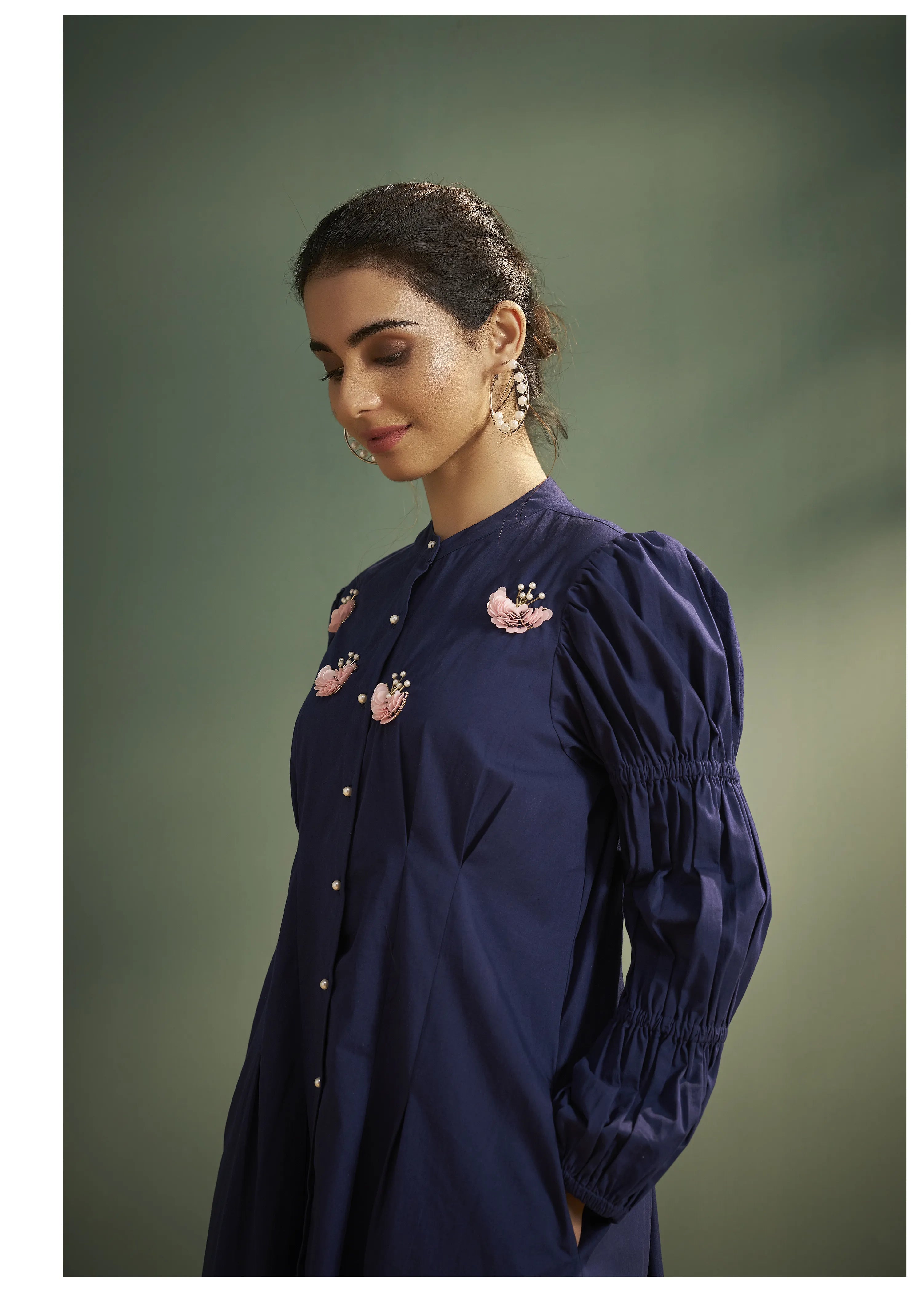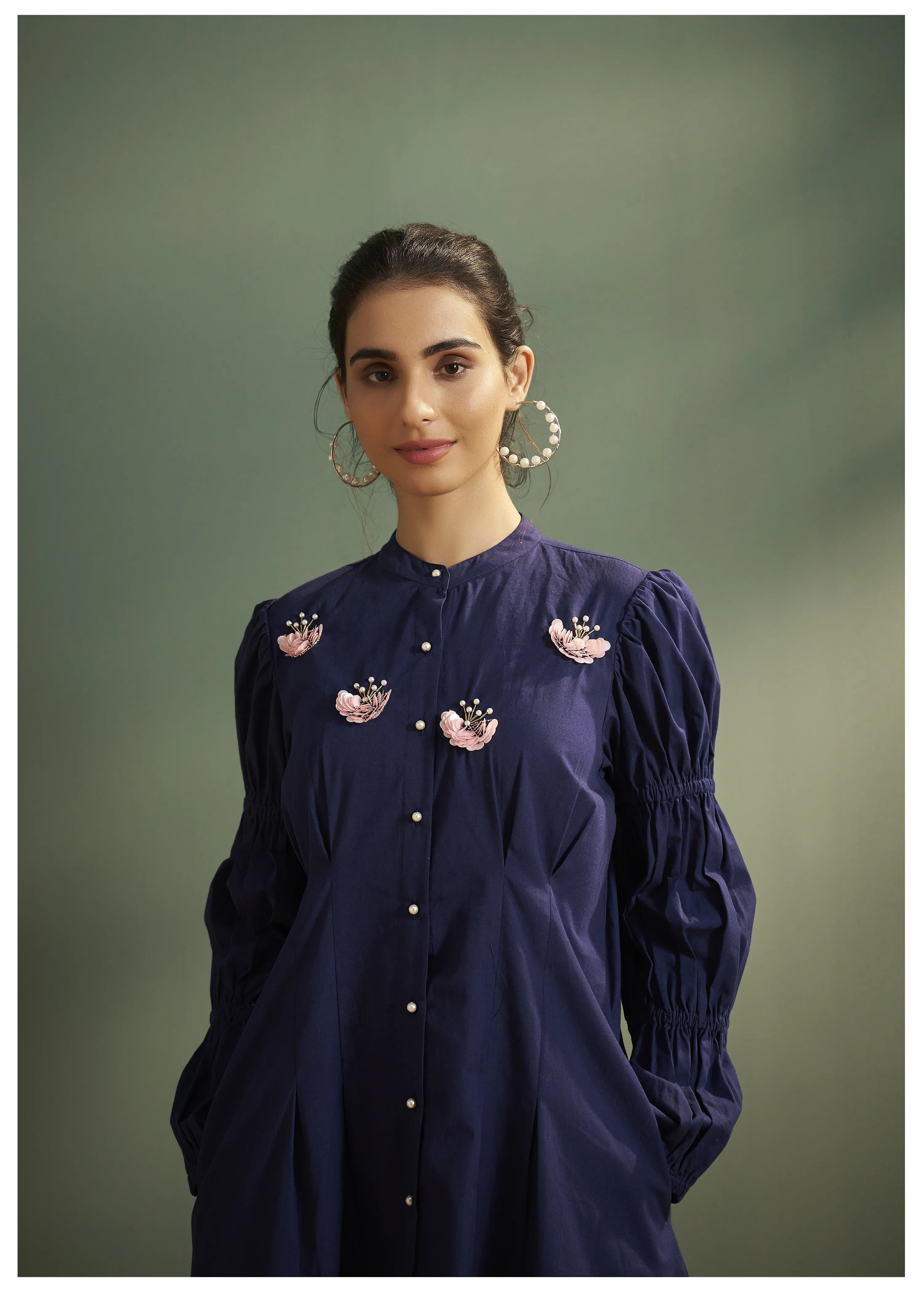 - Neckline: Round neckline with pearl button closure
