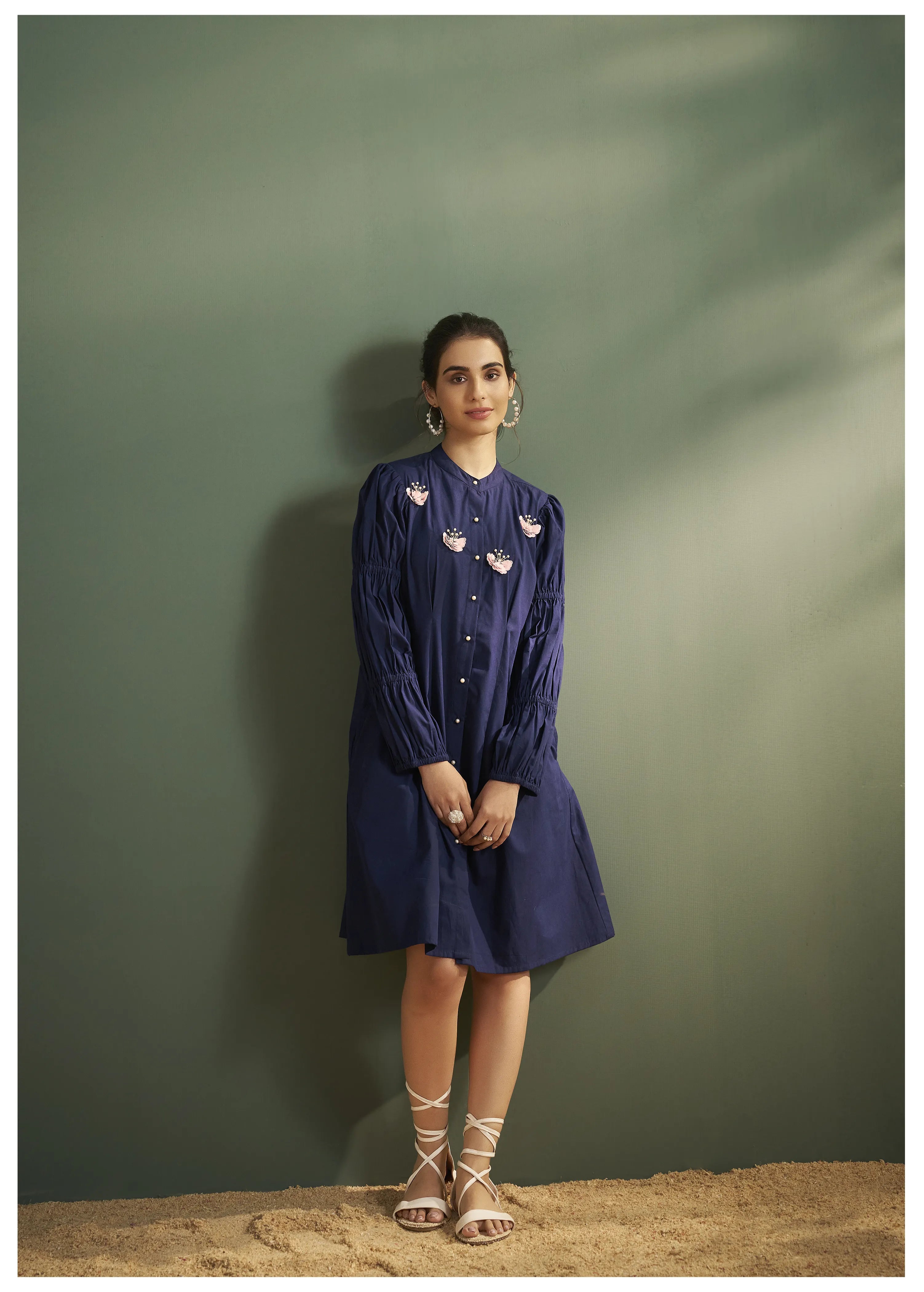 Stand out in style with the Blue Butterfly Motif Cotton Poplin Mini Dress, a perfect blend of comfort, elegance, and playful design. Featuring delicate butterfly motifs, pearl buttons, and pink sequence details, this mini dress is sure to capture attention at any event.