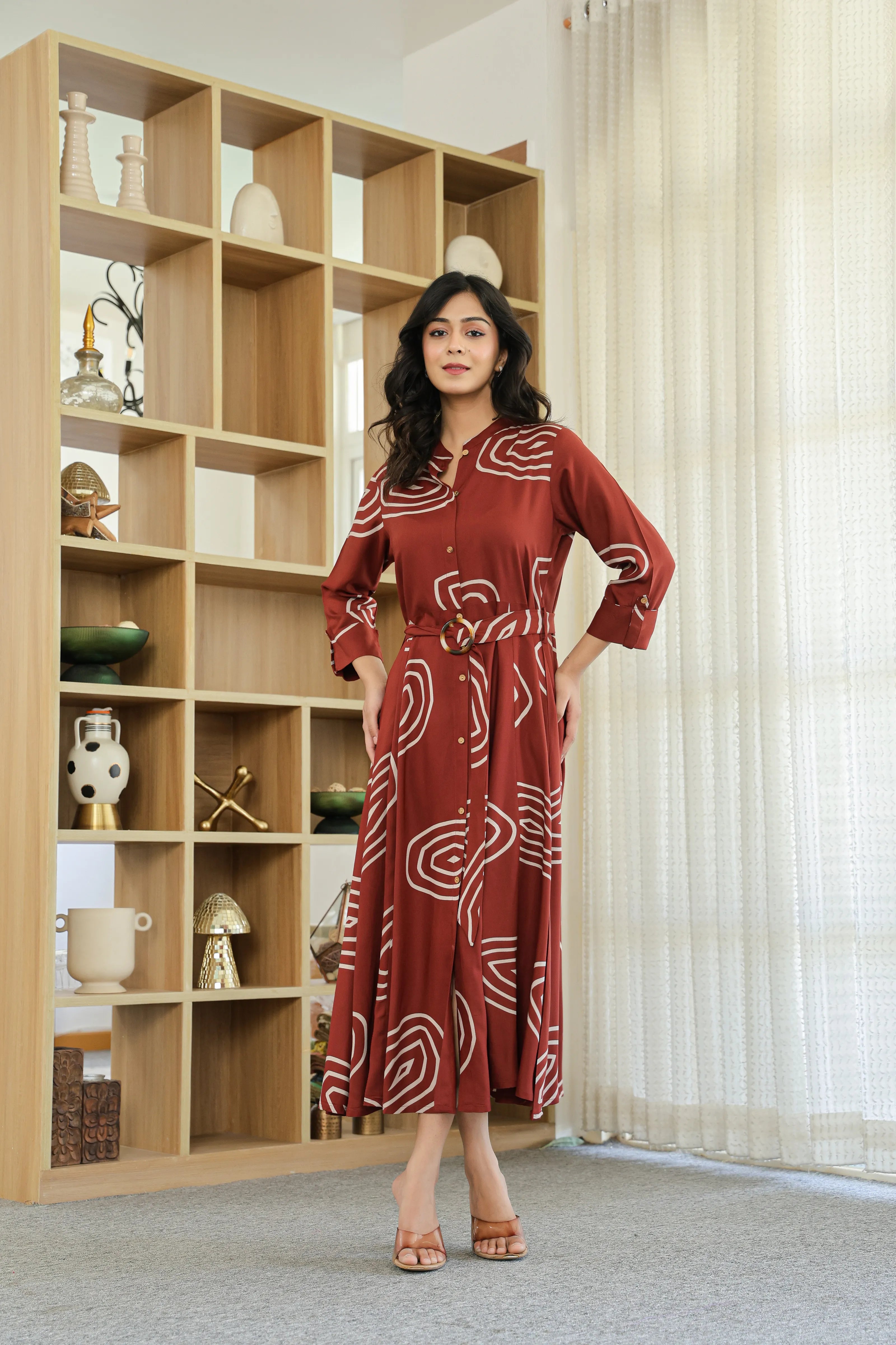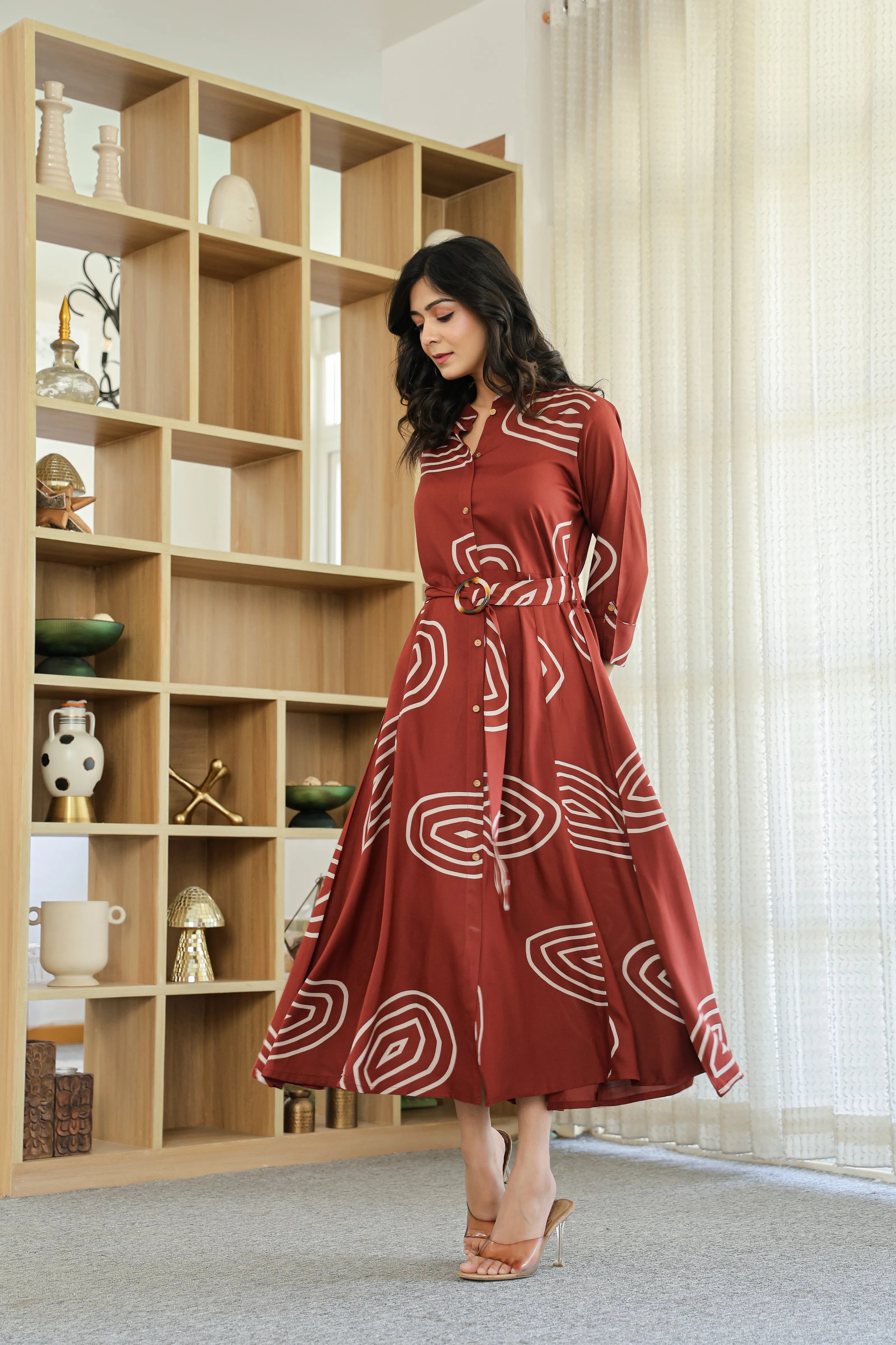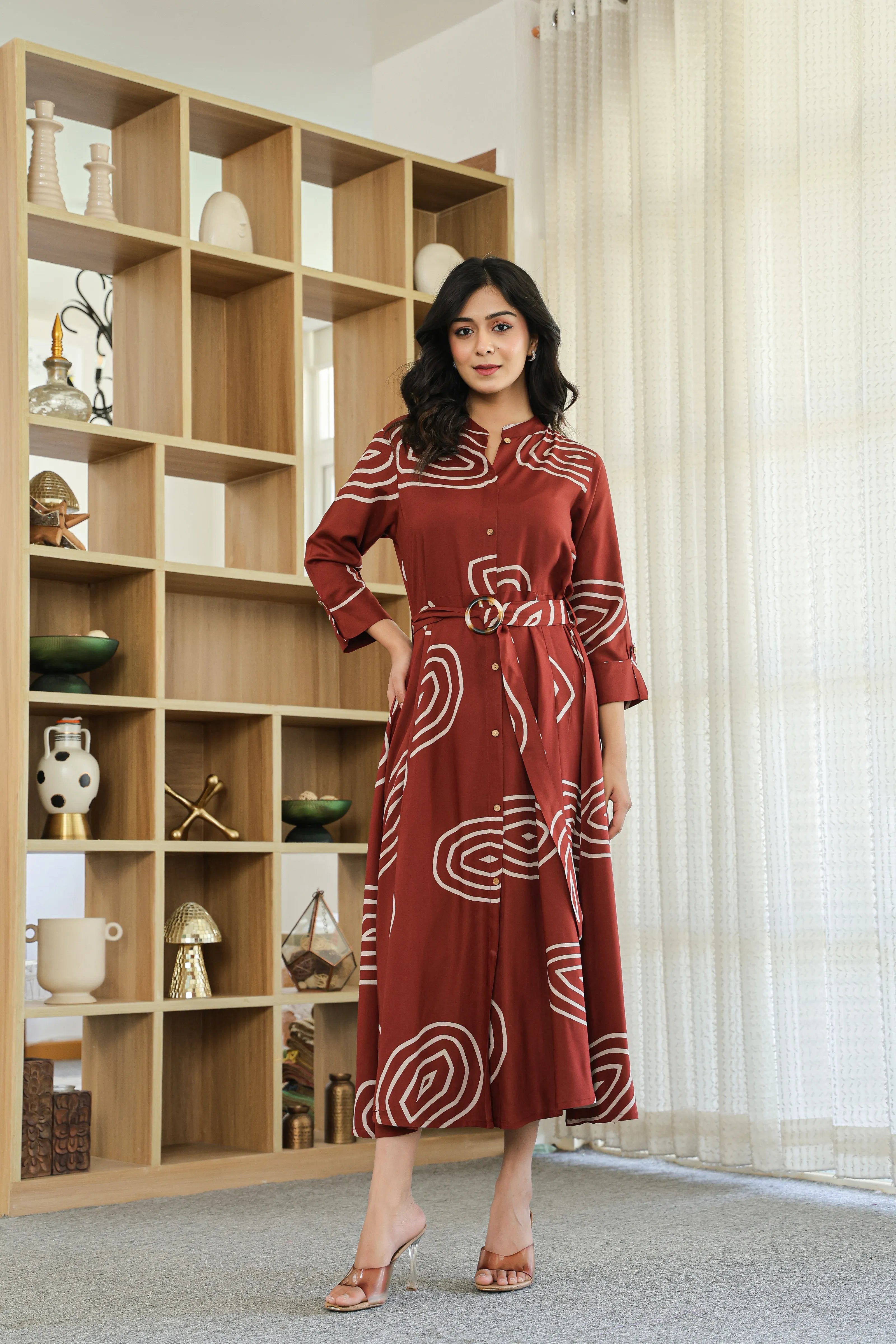 Bold yet balanced, Earth Spiral makes a modern statement with its rich dark brown base and striking abstract geometric print. Crafted in fluid viscose, this button-front shirt dress features a structured mandarin collar, 3/4th roll-up sleeves, and a flattering flared silhouette. The addition of a matching fabric belt with a wooden-style buckle brings the whole look together—perfect for elegant daywear or casual evenings.