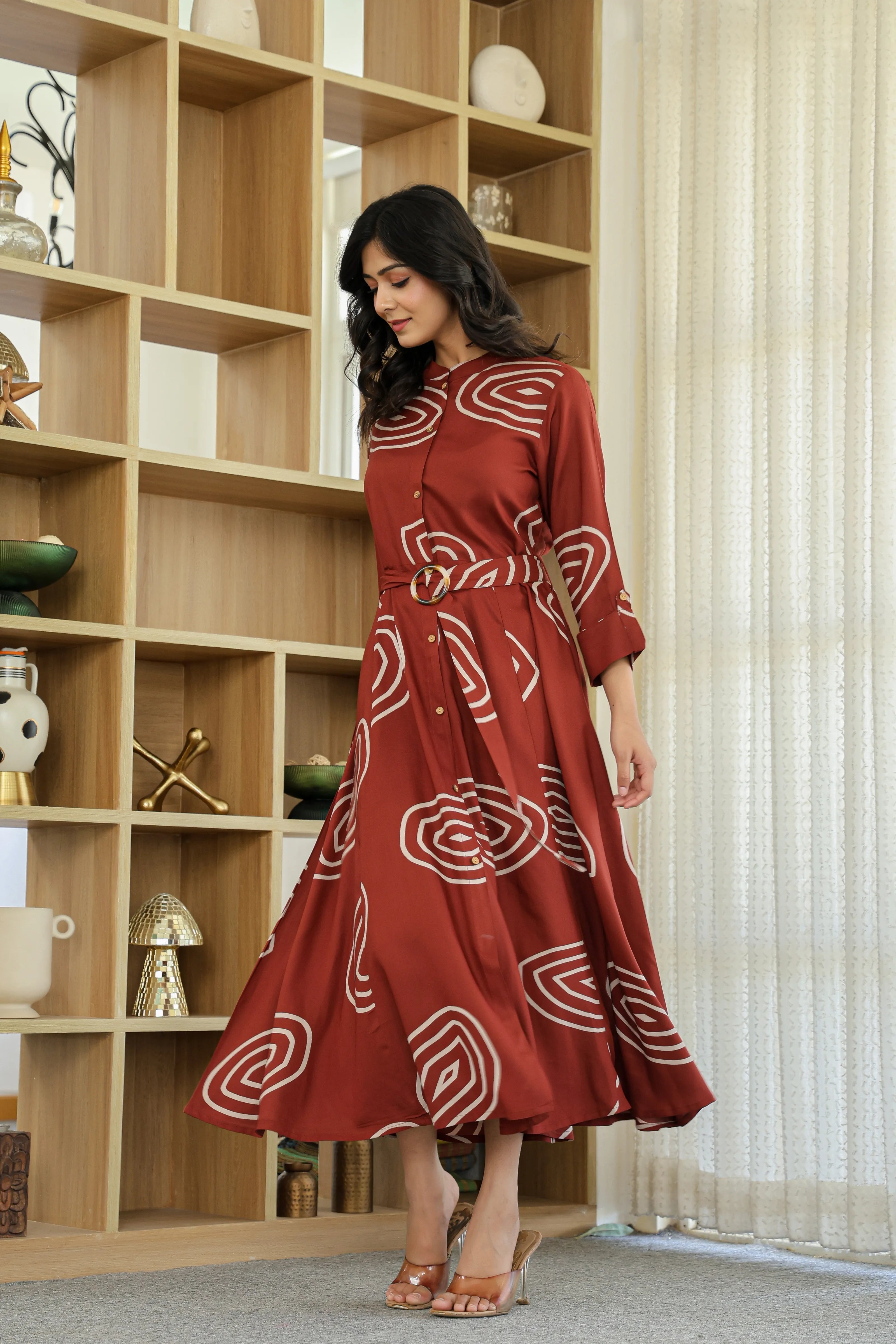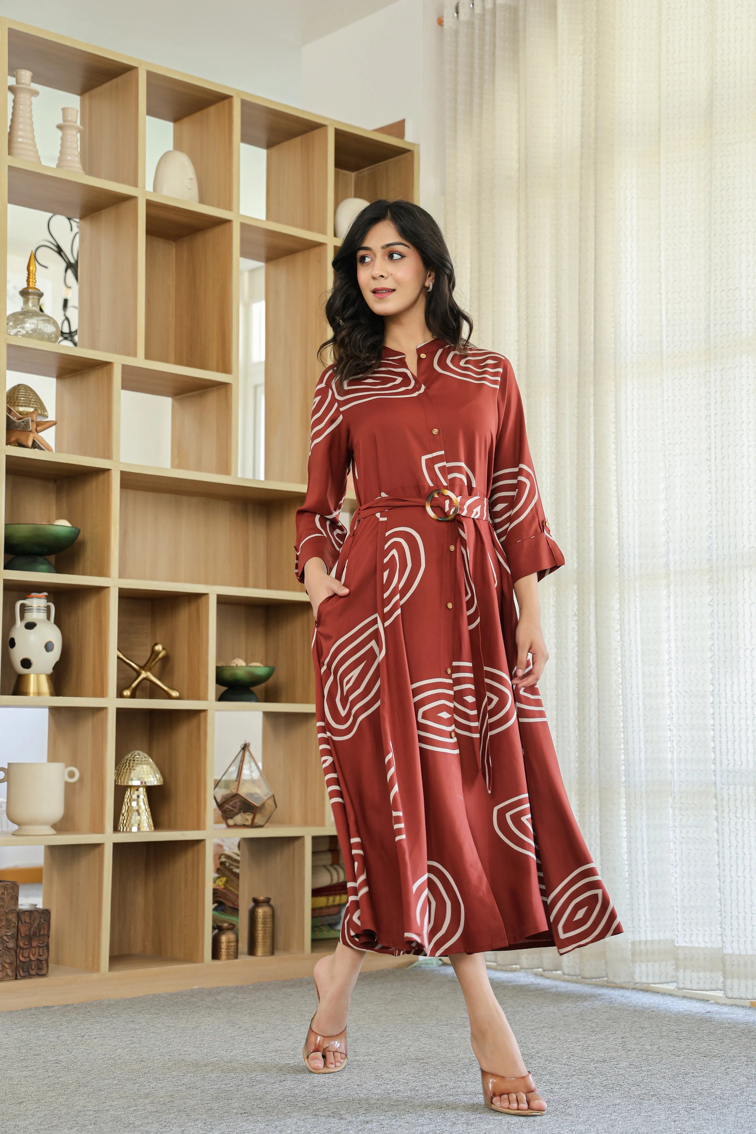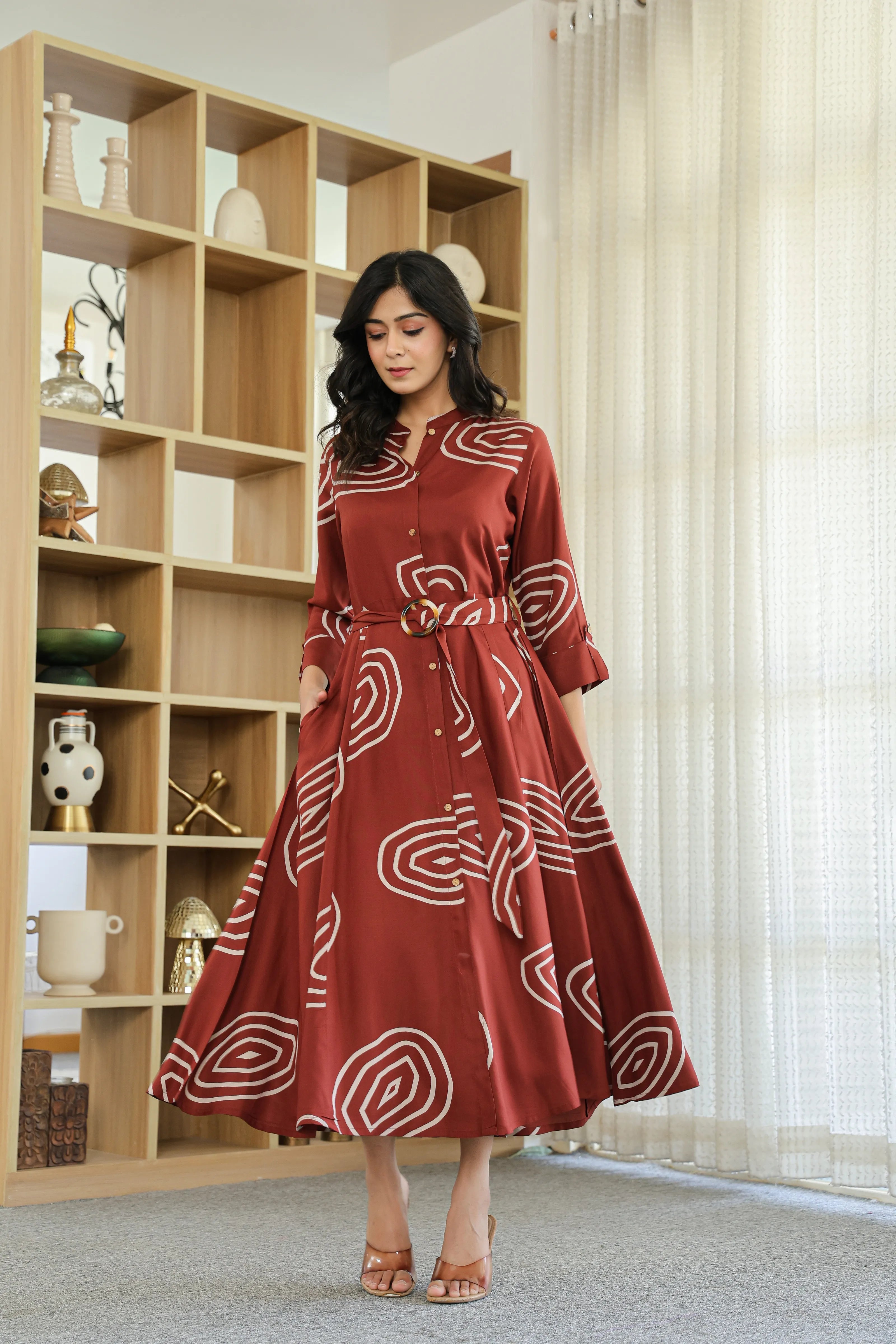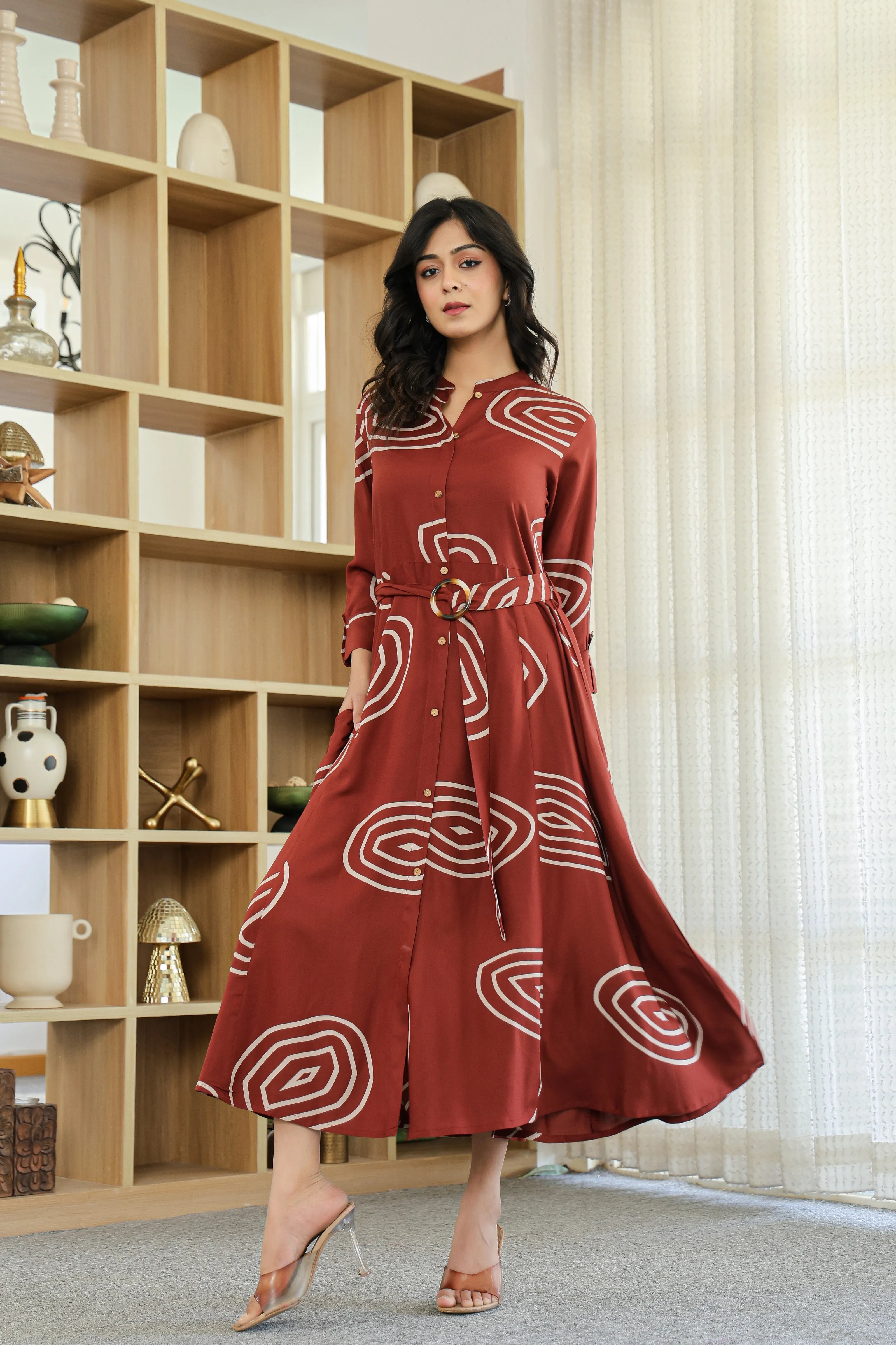 Bold yet balanced, Earth Spiral makes a modern statement with its rich dark brown base and striking abstract geometric print. Crafted in fluid viscose, this button-front shirt dress features a structured mandarin collar, 3/4th roll-up sleeves, and a flattering flared silhouette. The addition of a matching fabric belt with a wooden-style buckle brings the whole look together—perfect for elegant daywear or casual evenings.