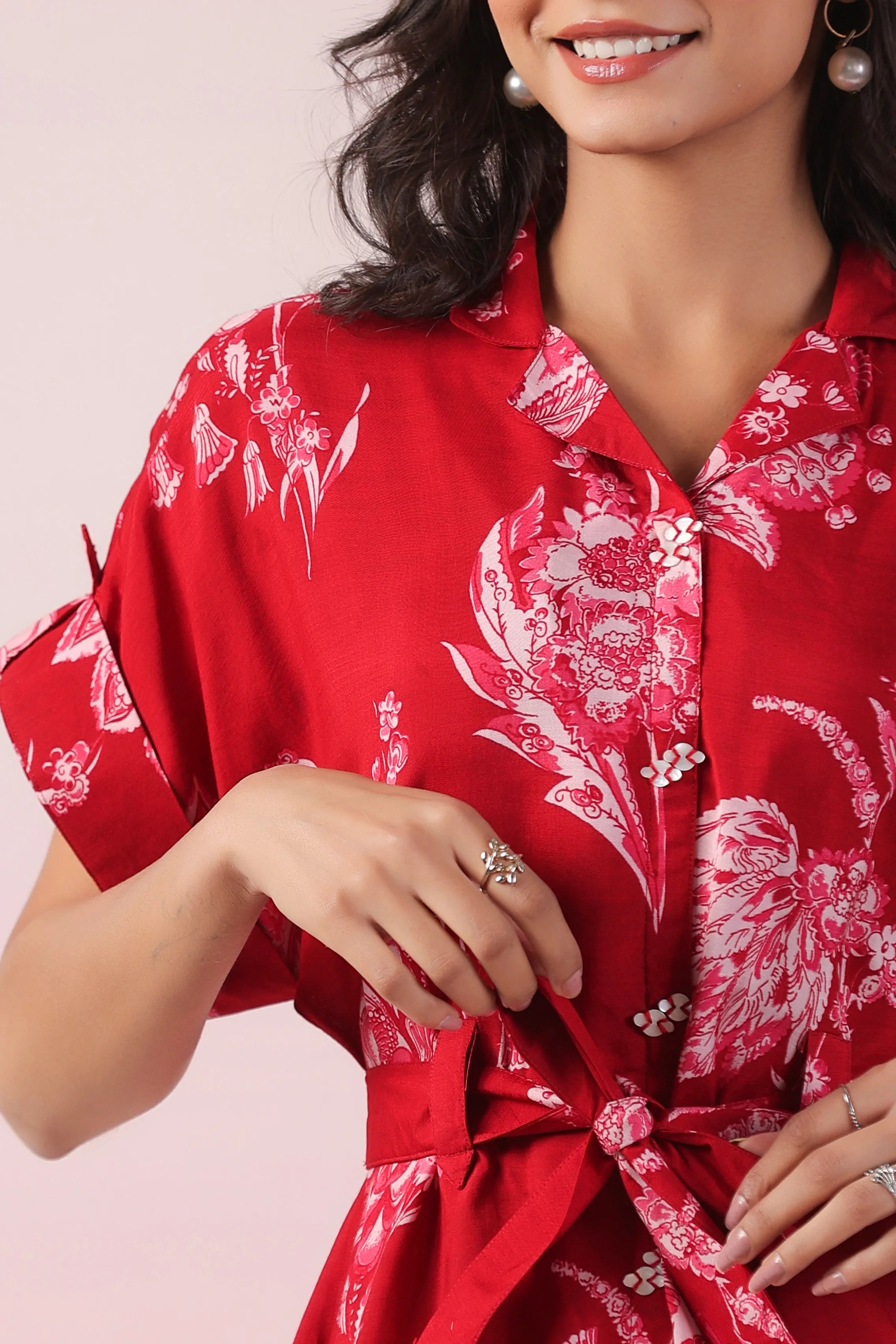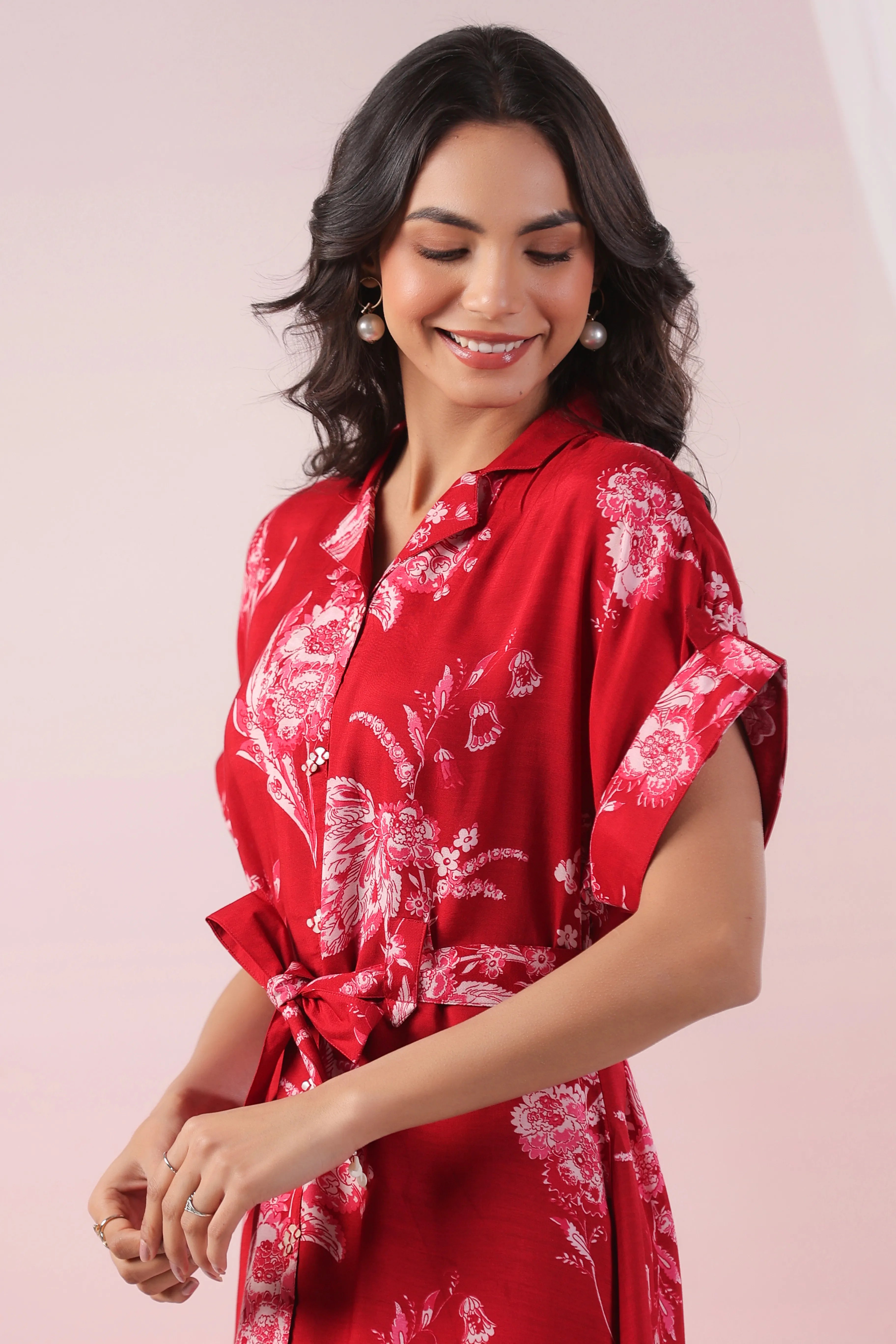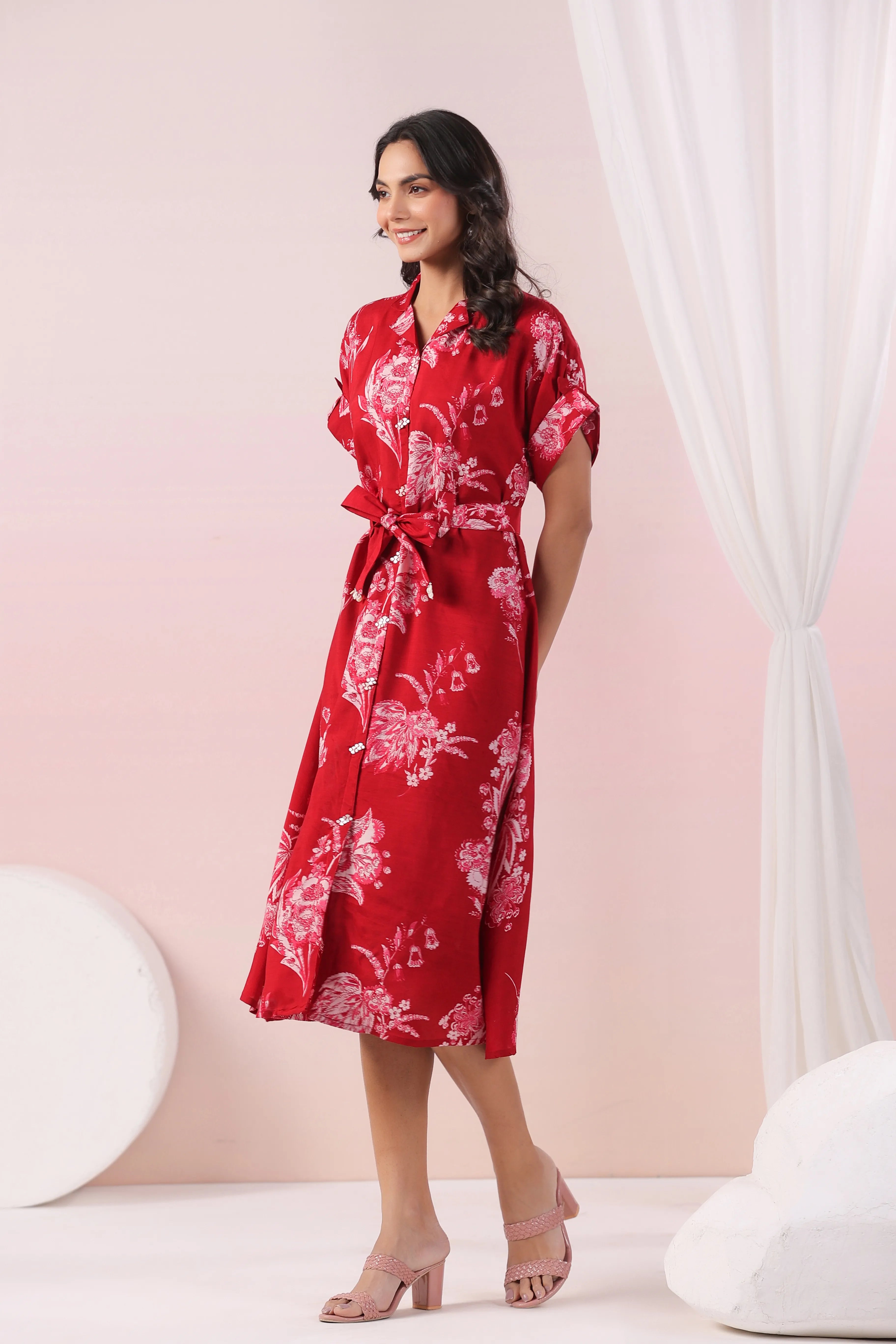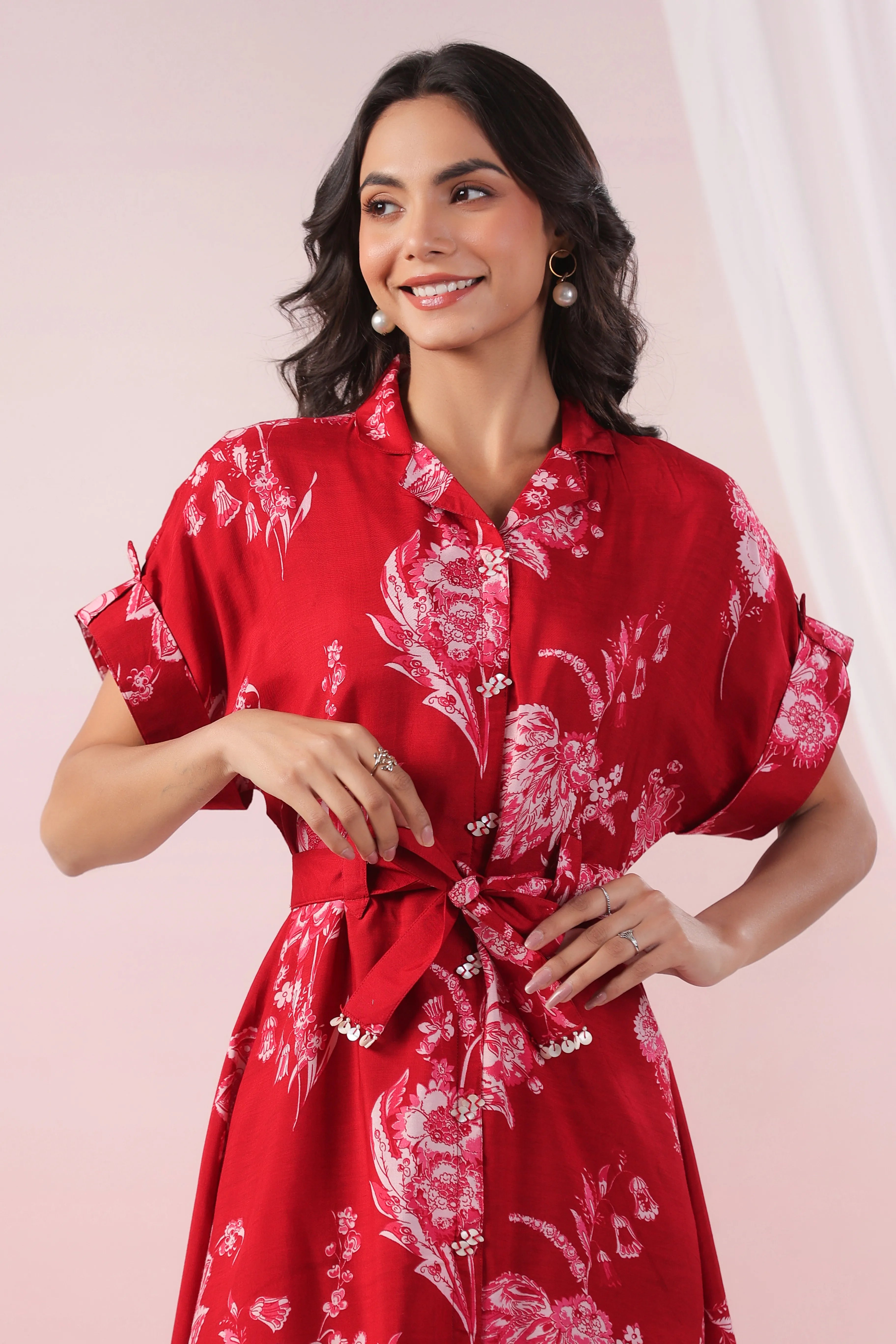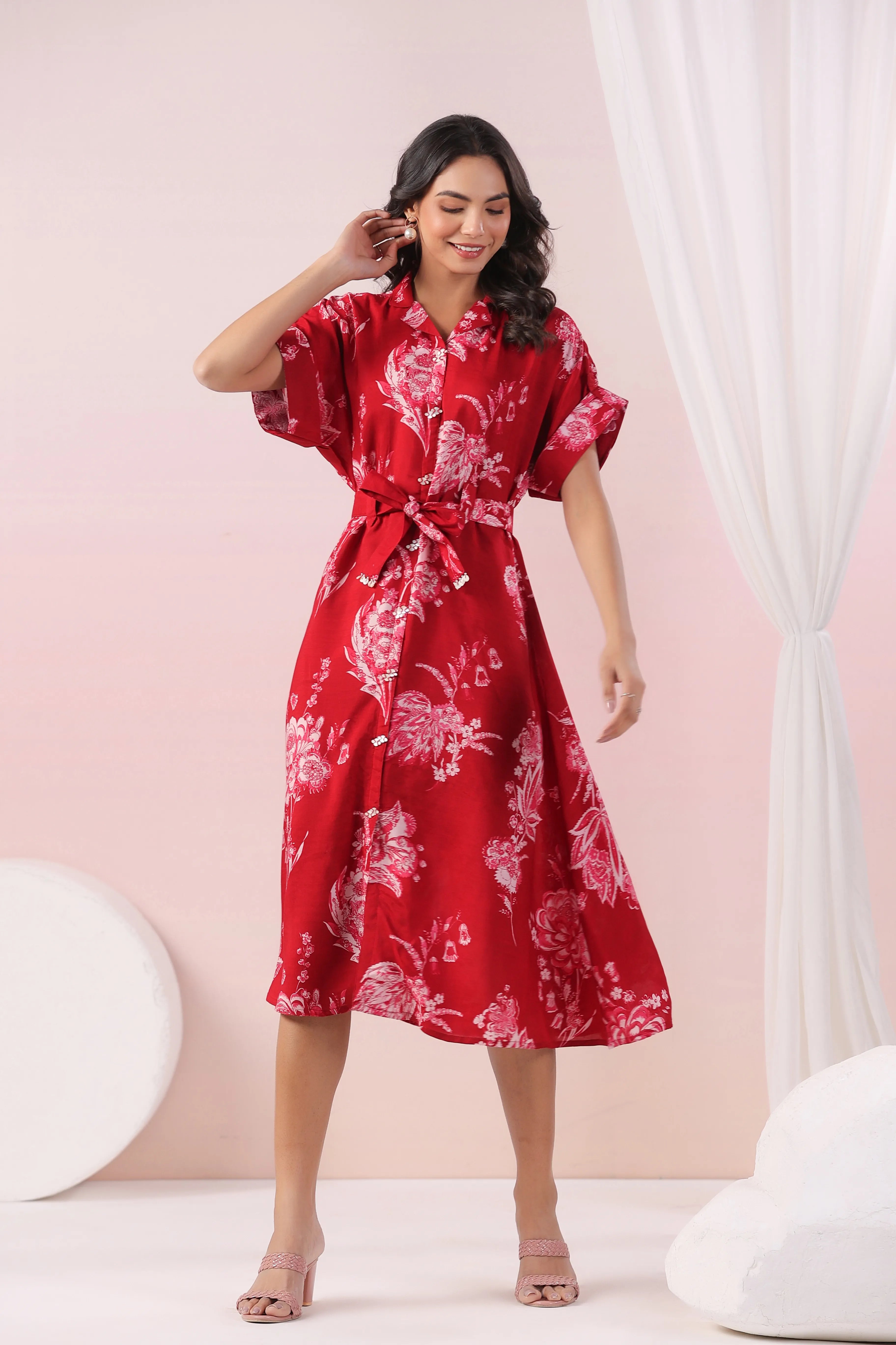 Effortless Elegance: Cherry Red & Pink Floral Belted Midi Dress in Russian Silk
