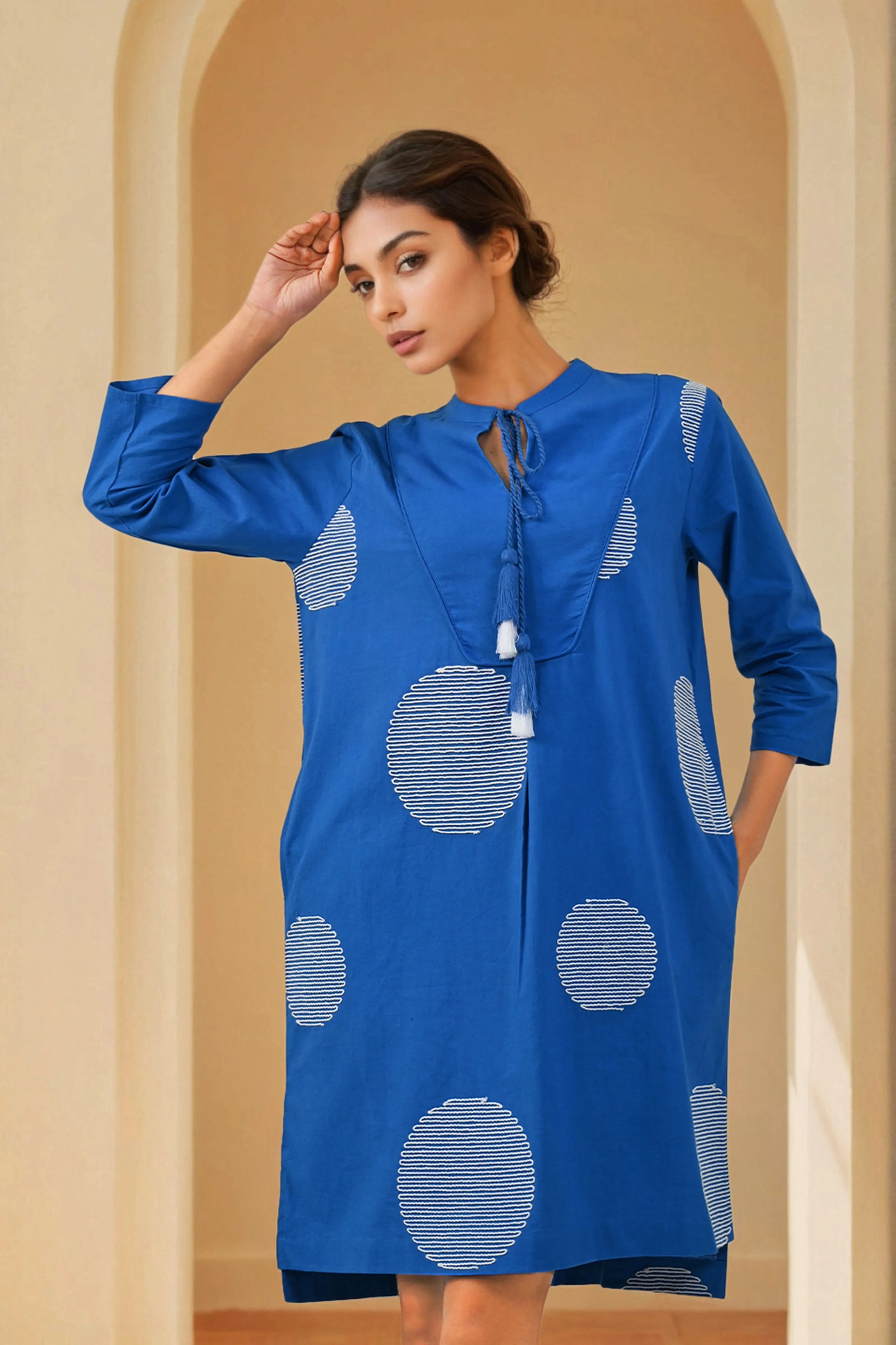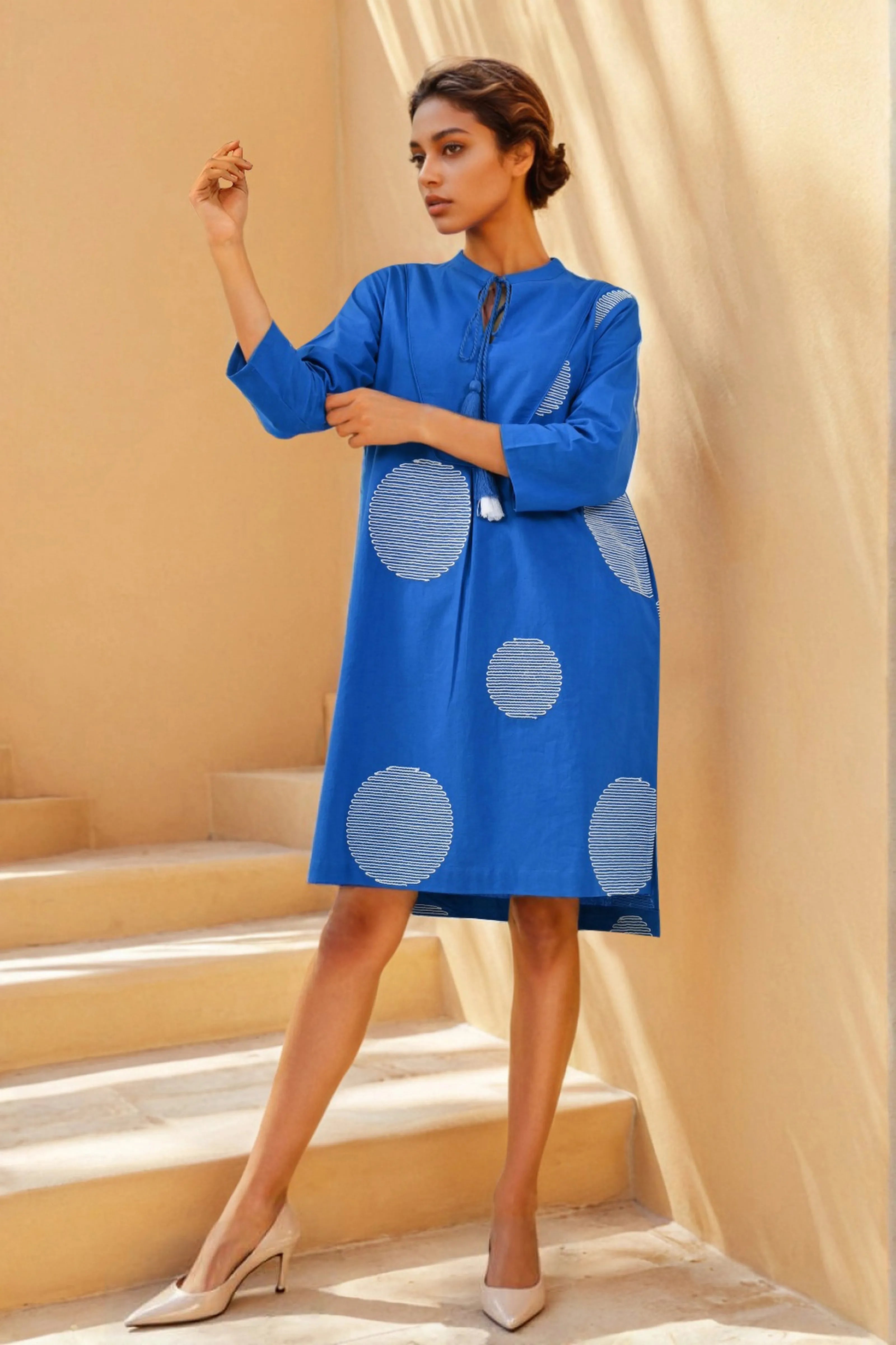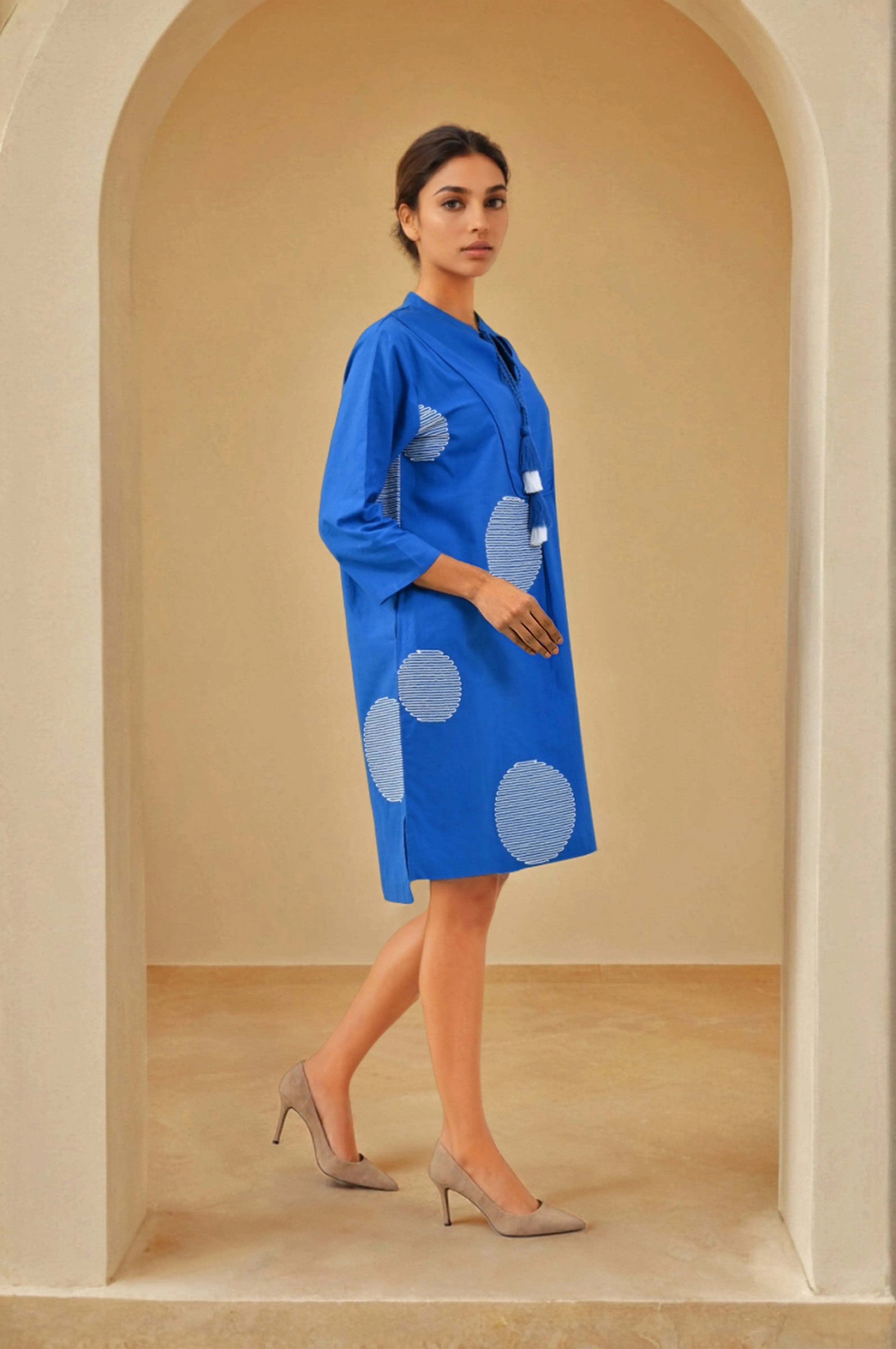 Bold, breathable, and beautifully balanced—this cobalt blue dress brings together geometric charm and everyday ease. Crafted in soft, skin-friendly cotton cambric, it features all-over white cord-stitched circular motifs that create a playful yet poised visual rhythm.