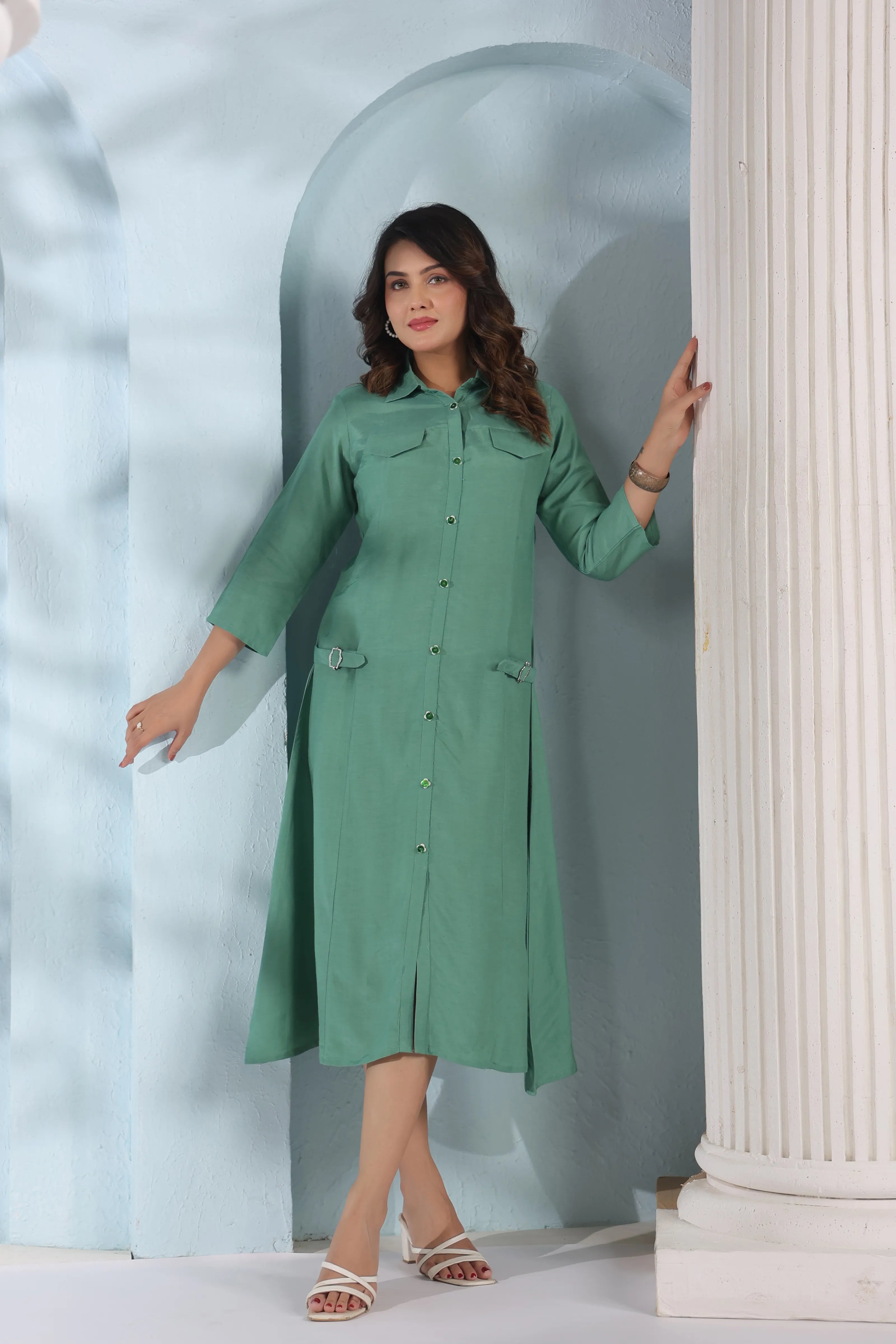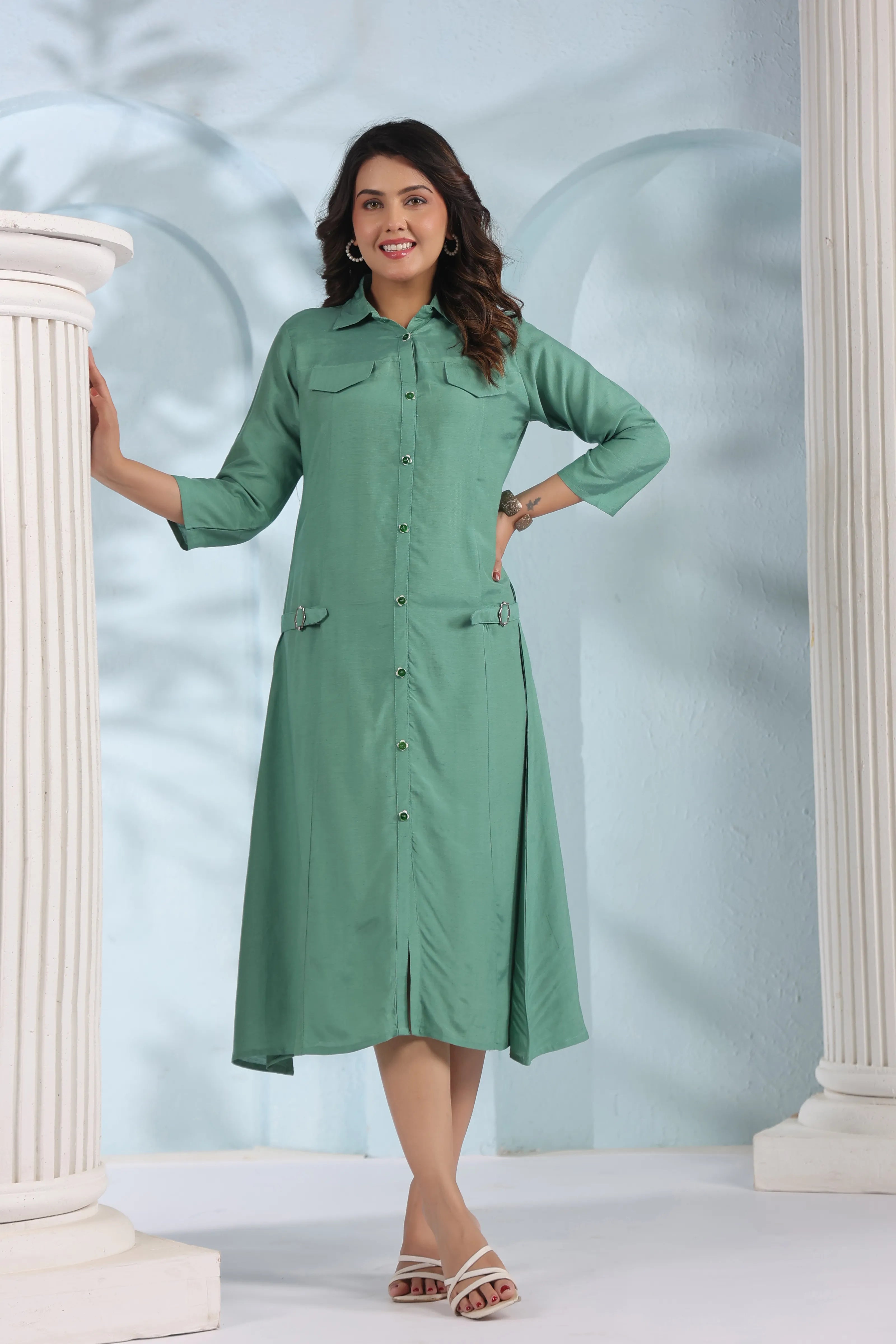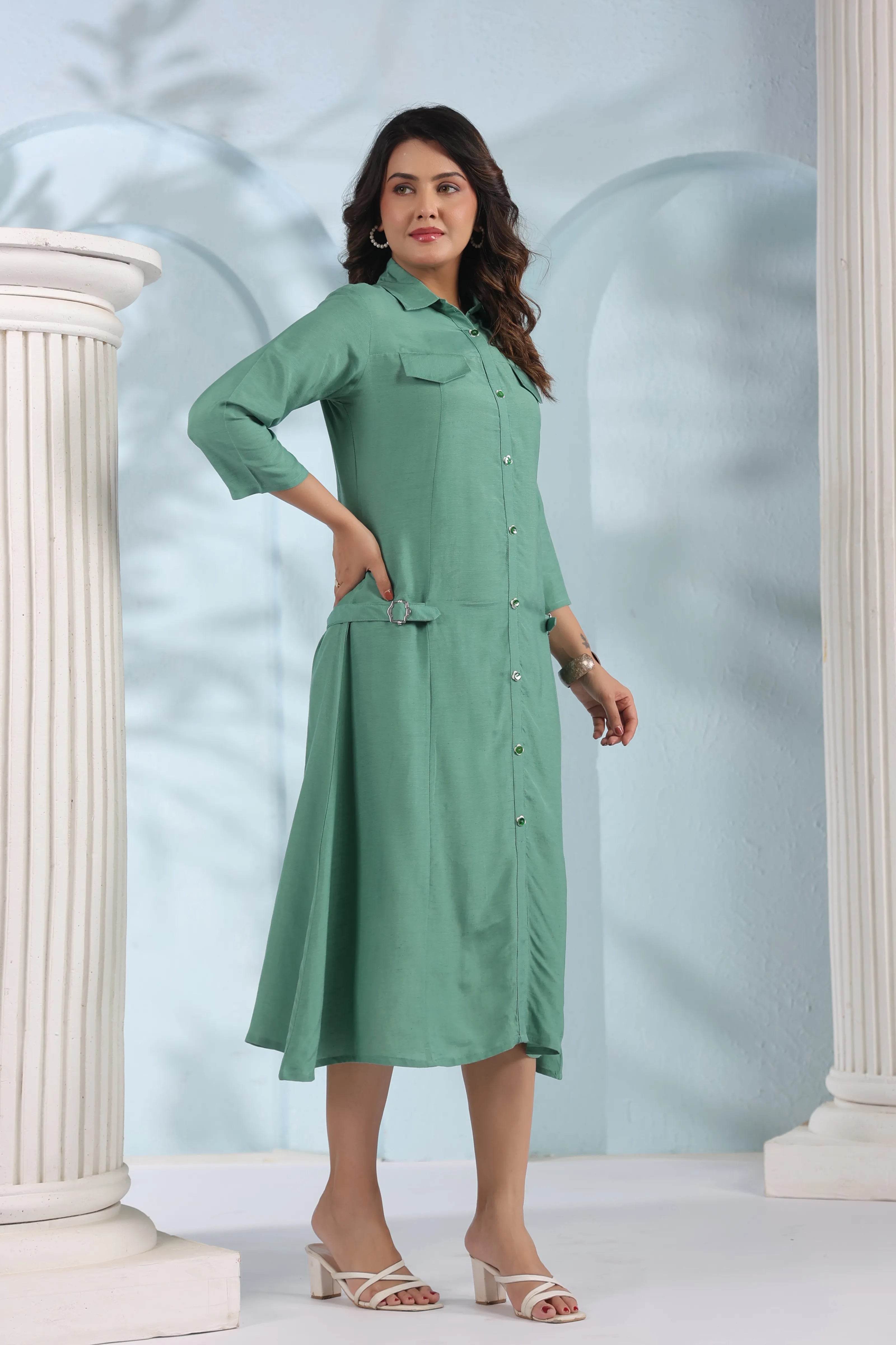 Chic, breezy, and undeniably modern—Verdant Ease brings together the structure of a shirt dress with the softness of fluid crepe. In a refreshing sage green tone, this midi dress blends everyday sophistication with elevated detailing.
