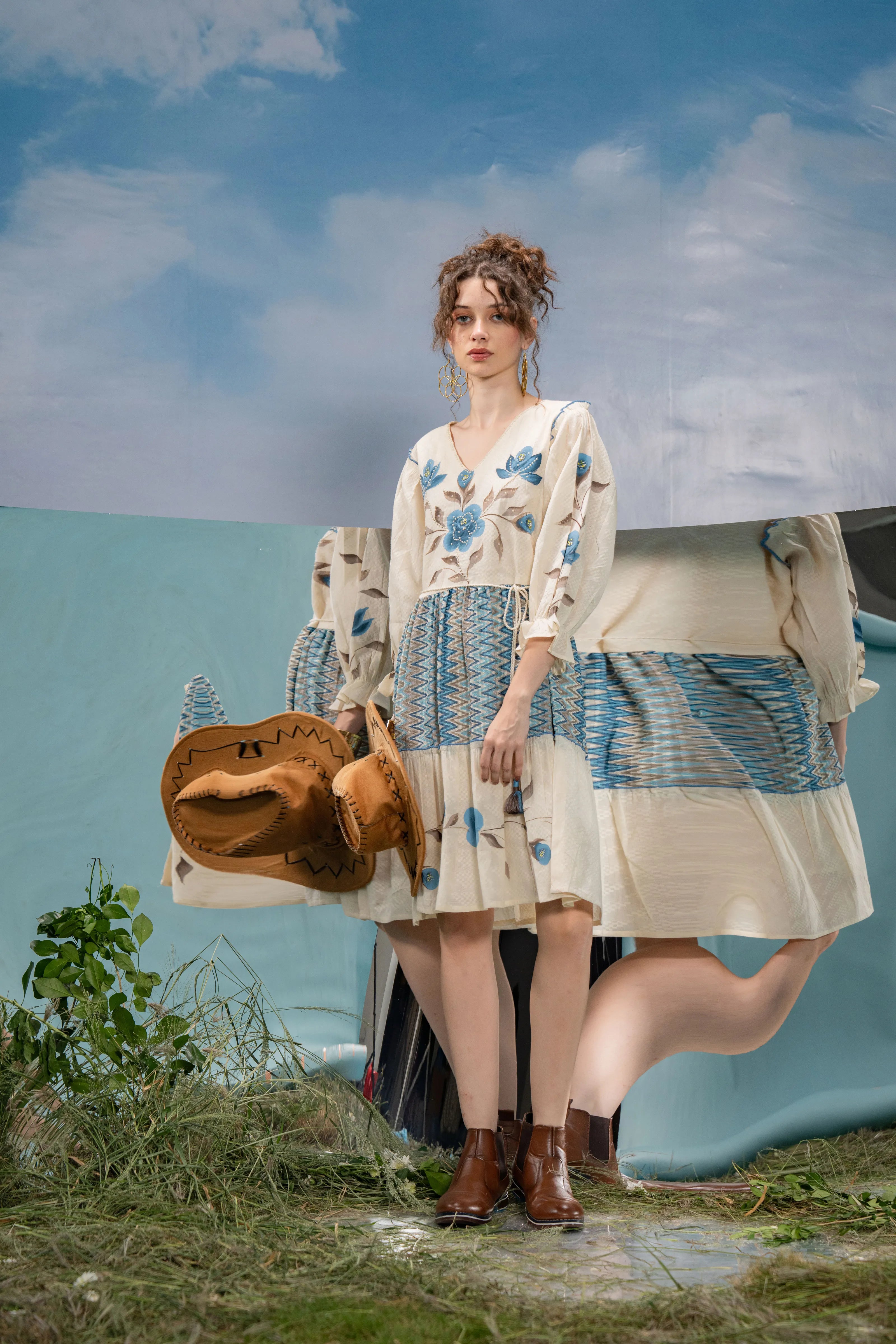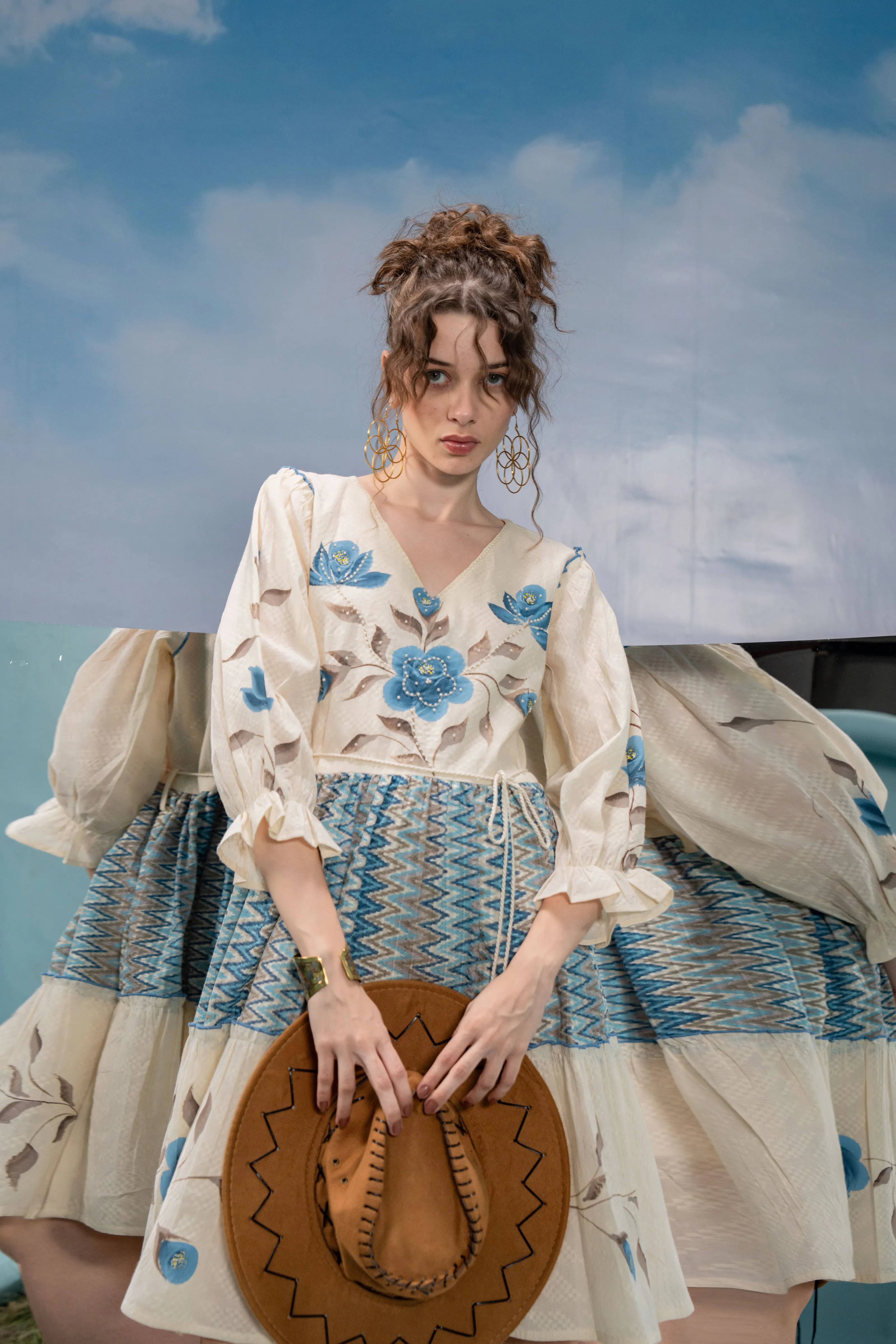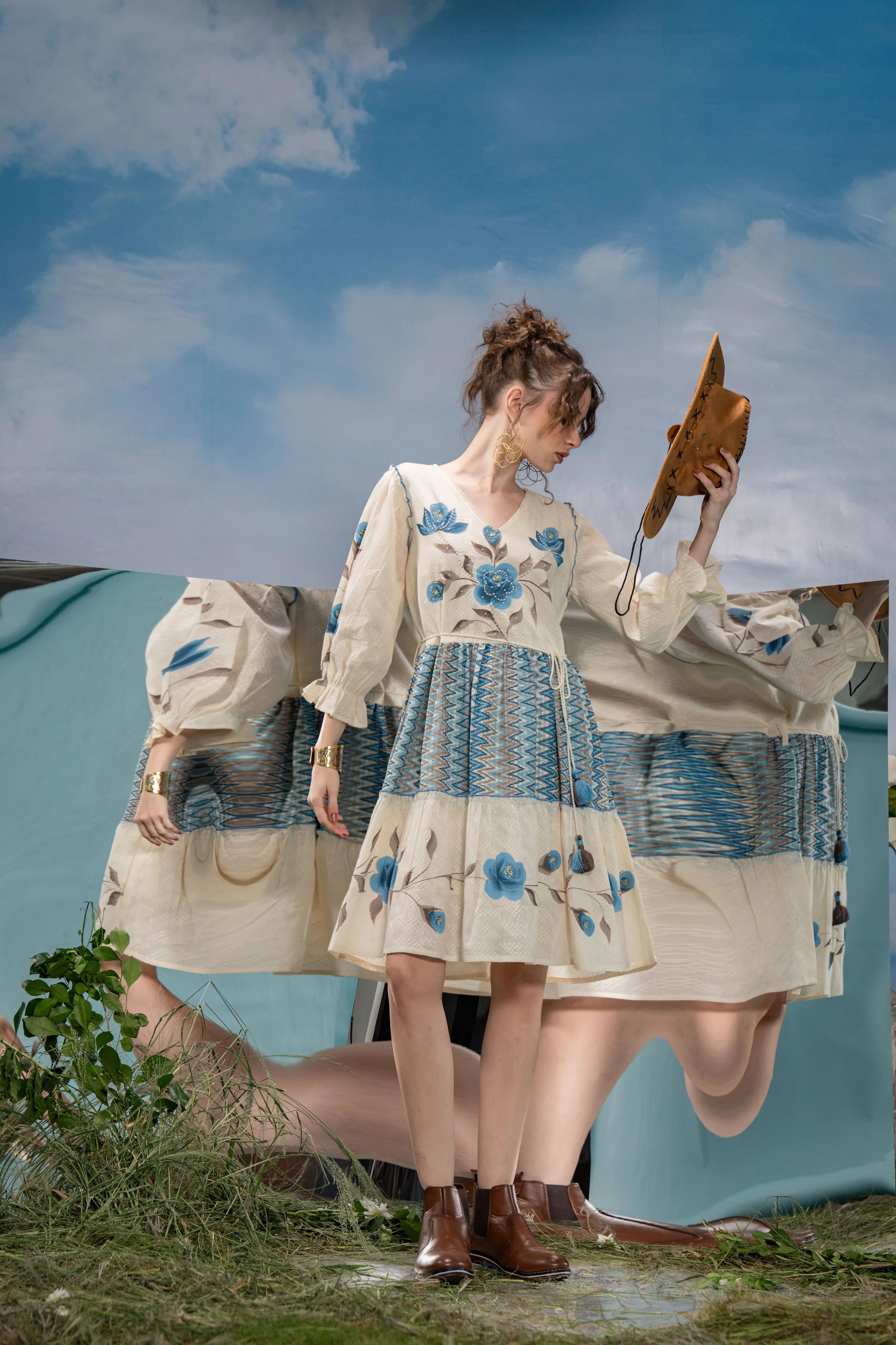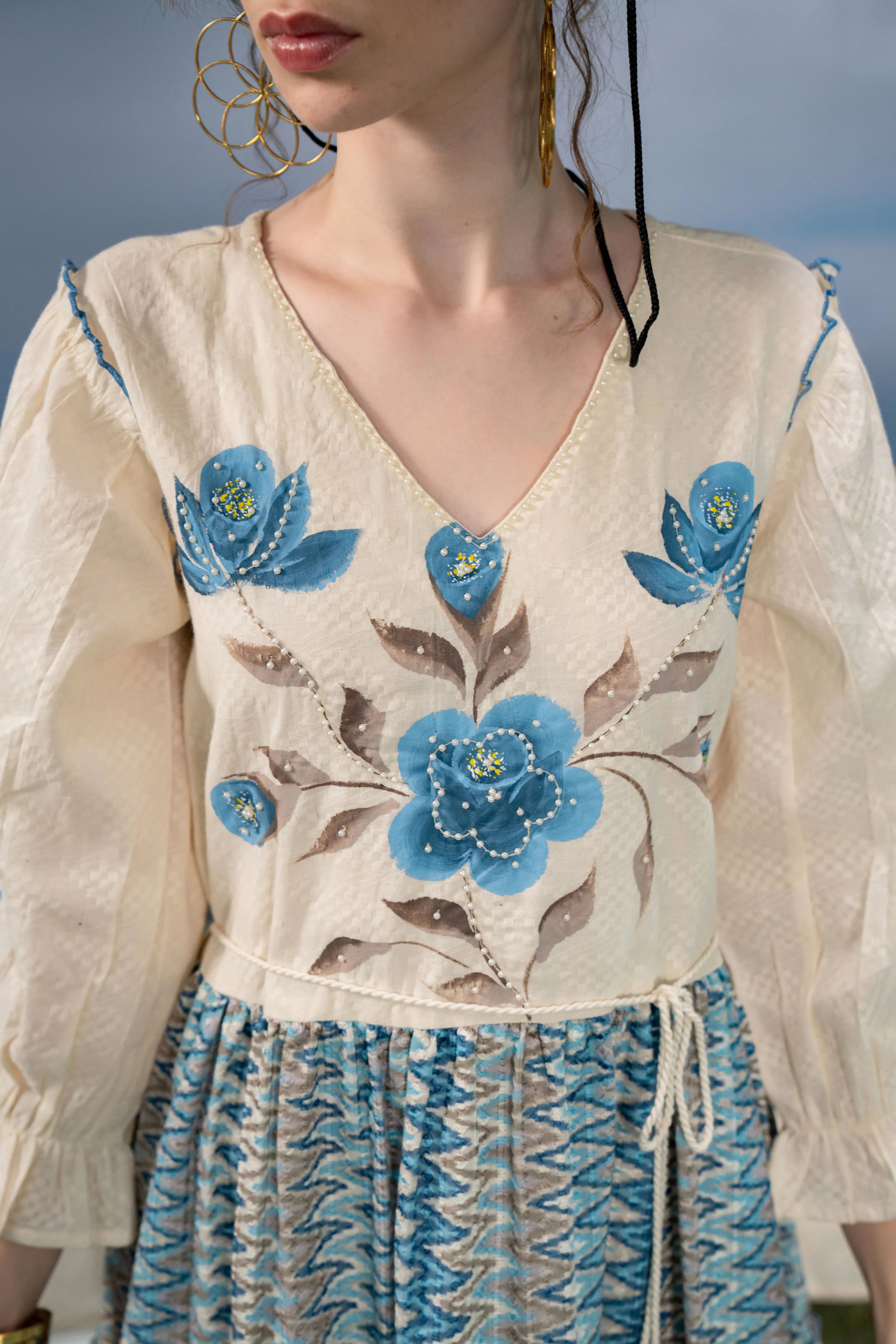 Infuse a dose of artistic flair into your wardrobe with Azure Bloom, a breezy mini dress that blends boho charm with refined detailing. Set in soft cream textured cotton, this dress is adorned with bold blue-grey floral hand-painted motifs that lend a graceful, painterly touch.