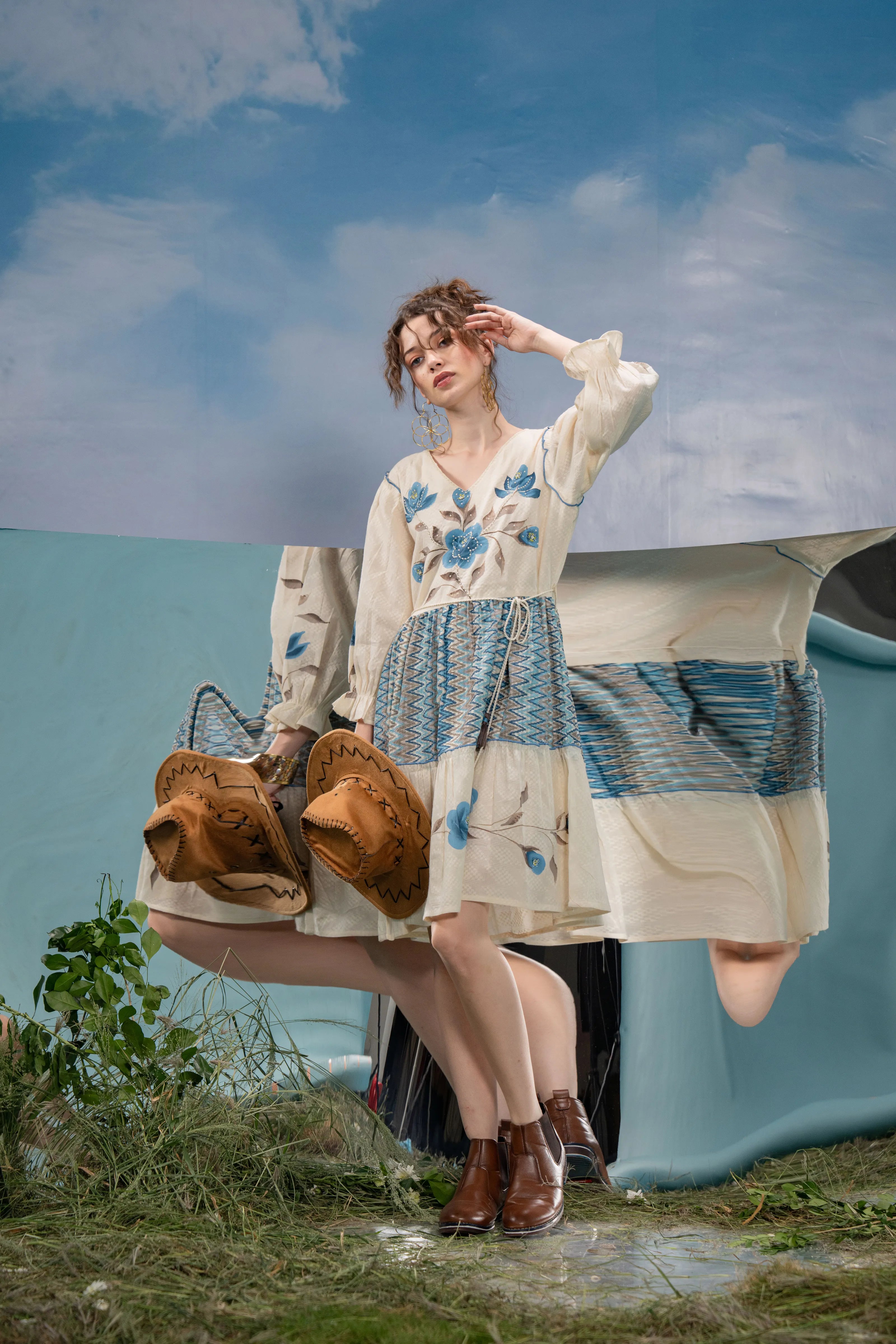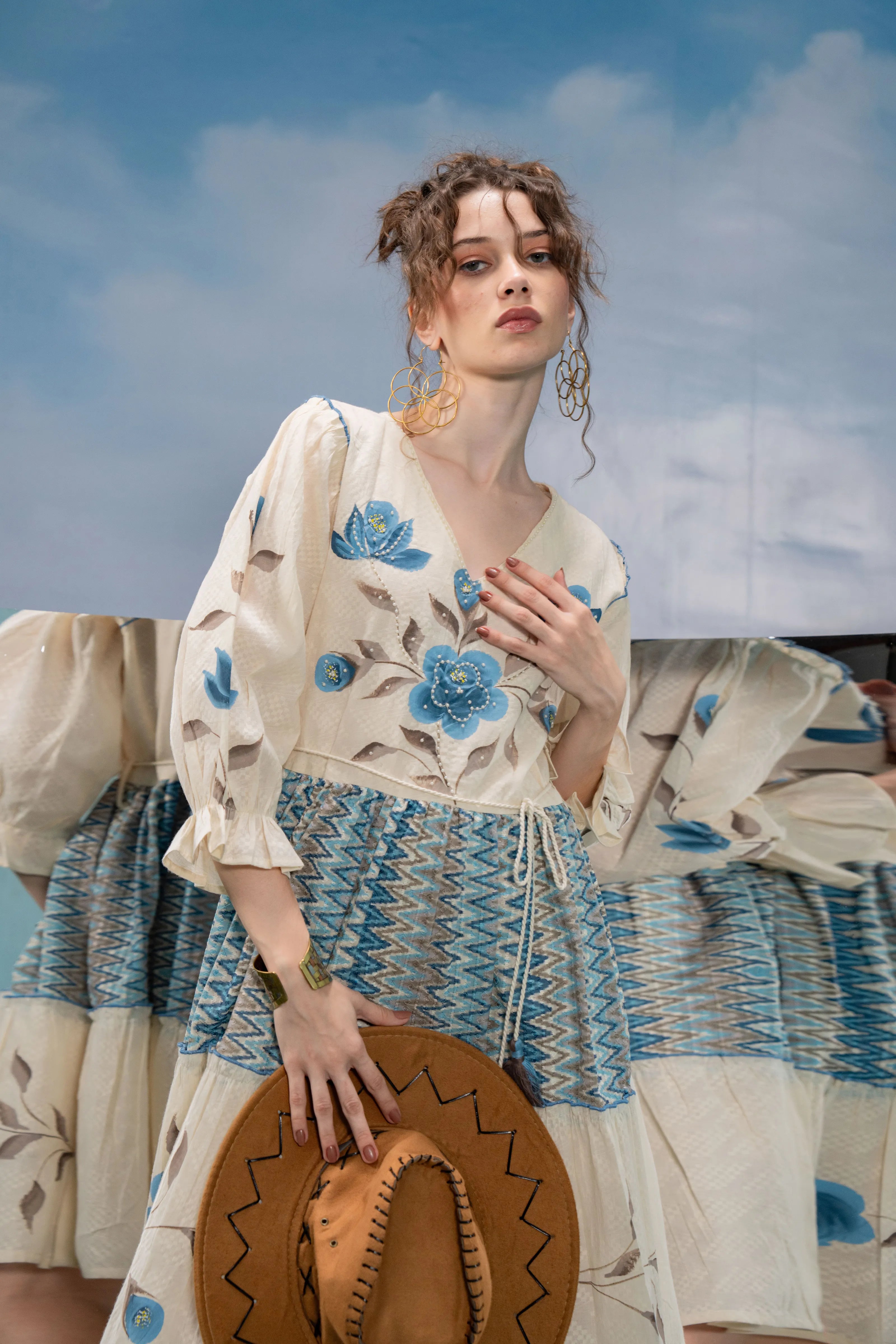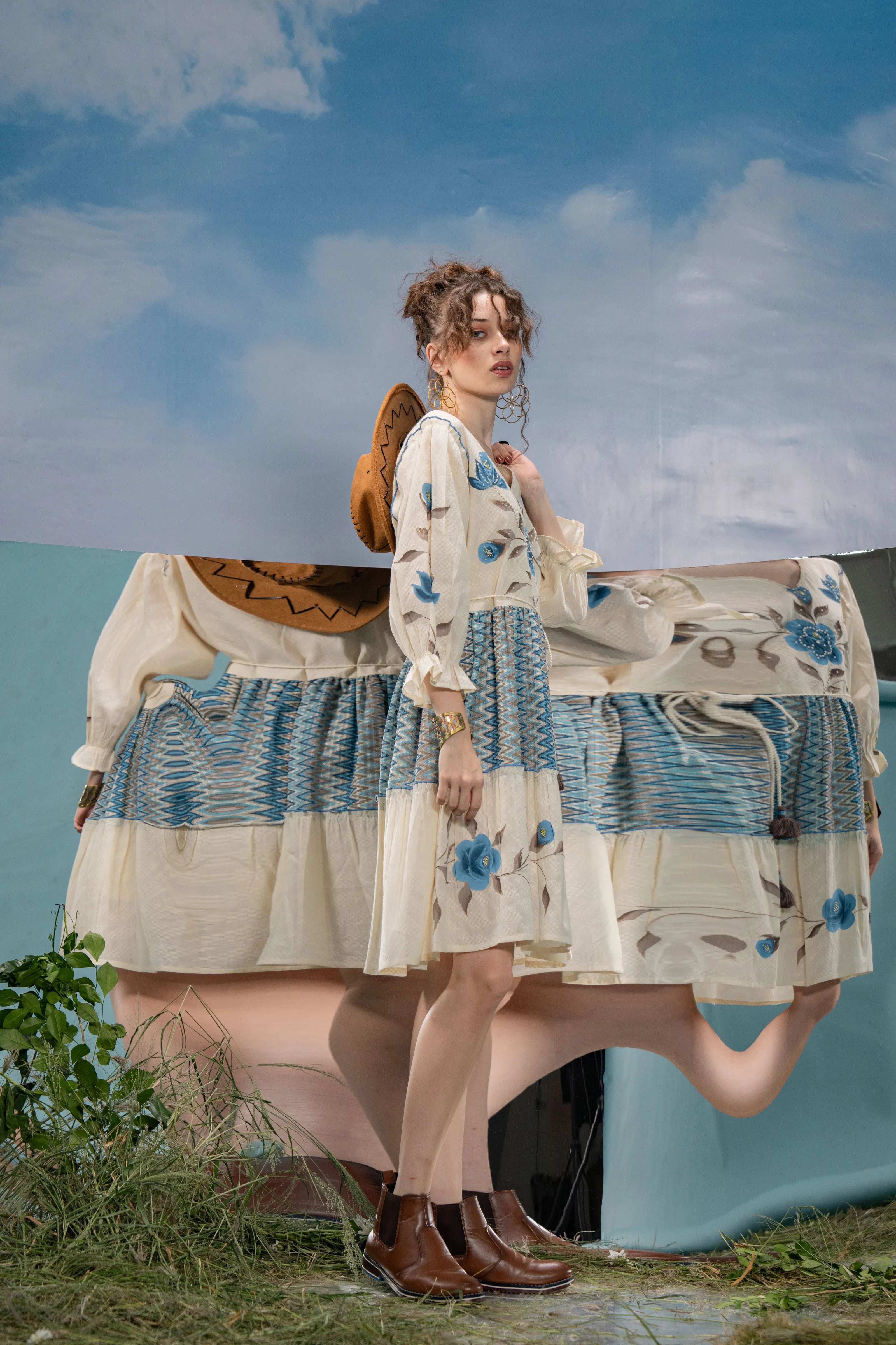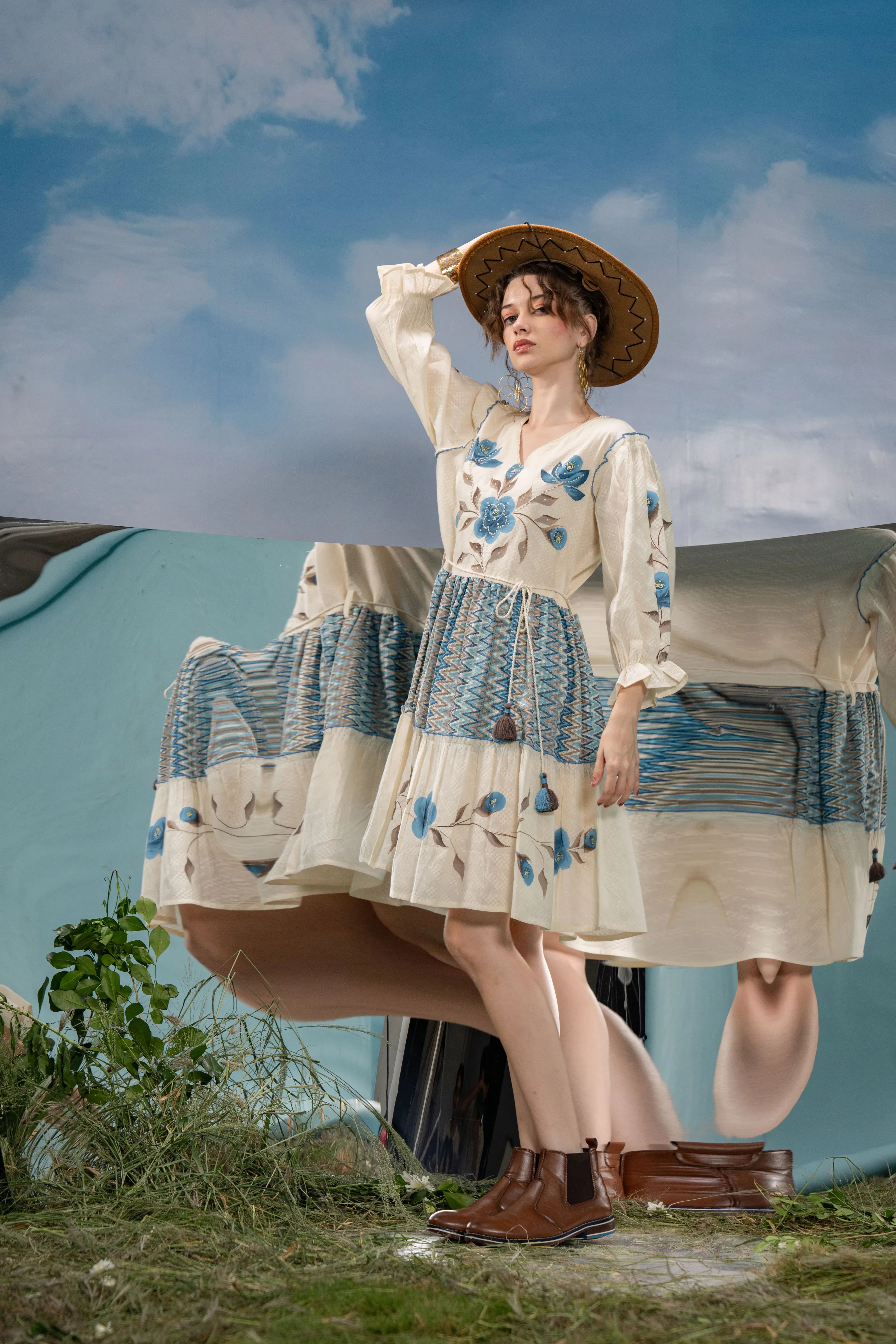Infuse a dose of artistic flair into your wardrobe with Azure Bloom, a breezy mini dress that blends boho charm with refined detailing. Set in soft cream textured cotton, this dress is adorned with bold blue-grey floral hand-painted motifs that lend a graceful, painterly touch.