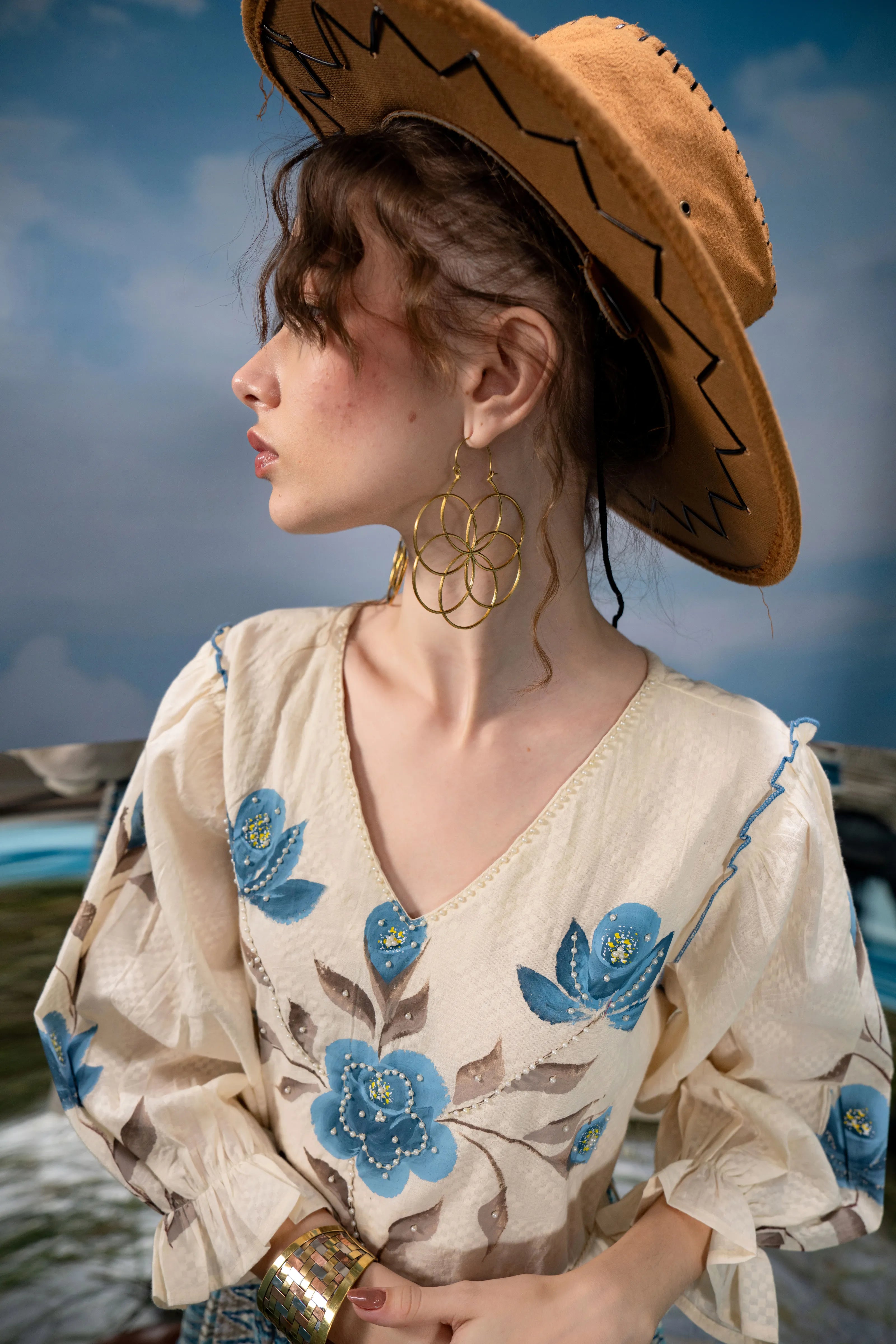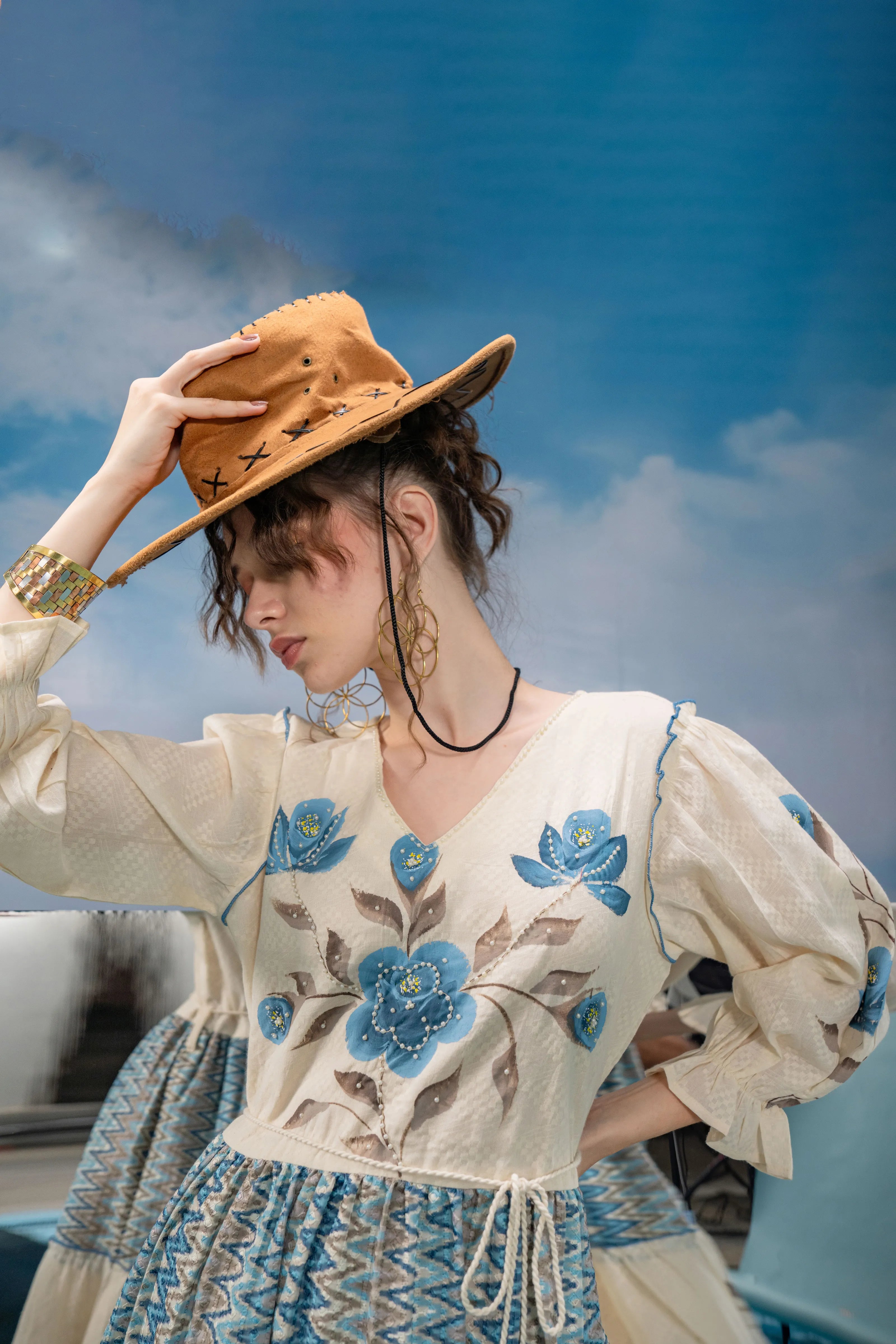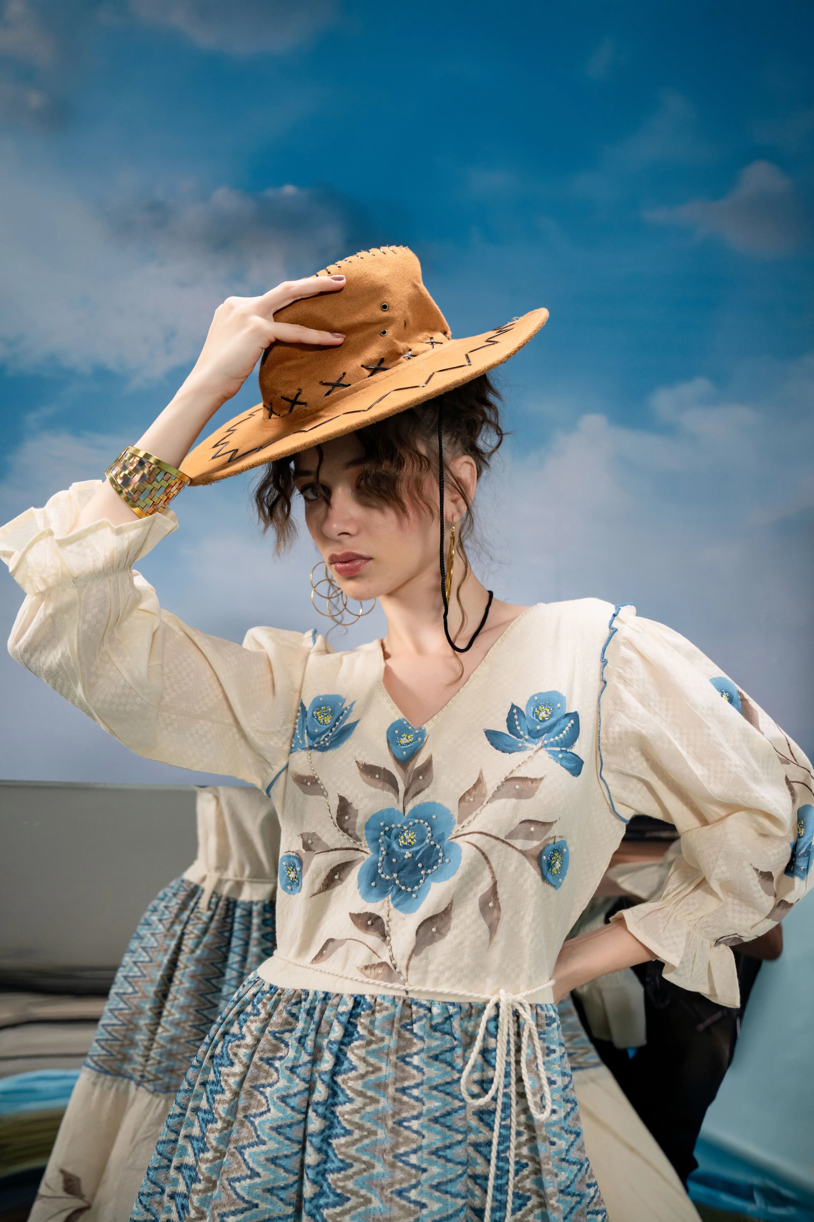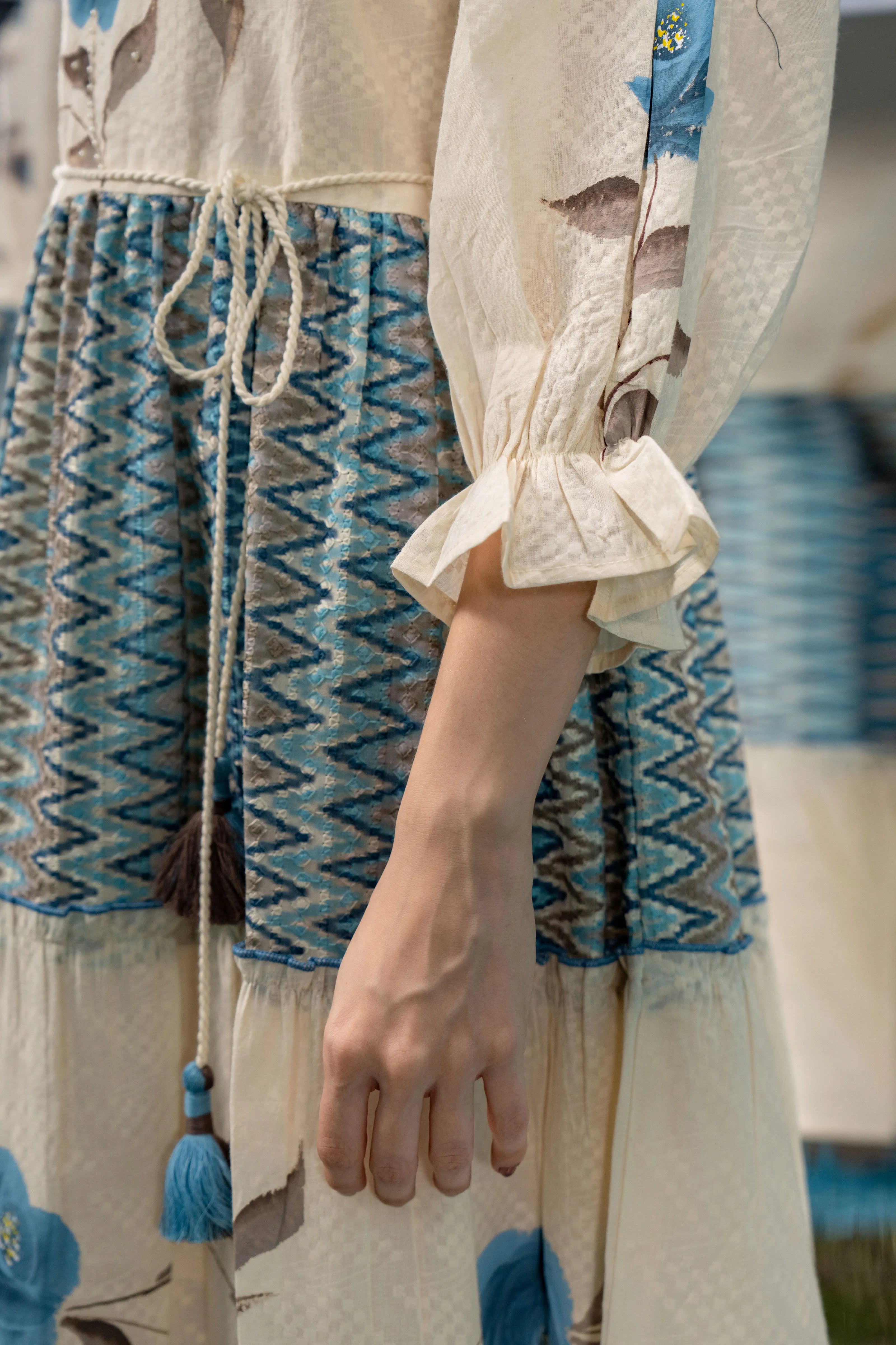 Infuse a dose of artistic flair into your wardrobe with Azure Bloom, a breezy mini dress that blends boho charm with refined detailing. Set in soft cream textured cotton, this dress is adorned with bold blue-grey floral hand-painted motifs that lend a graceful, painterly touch.