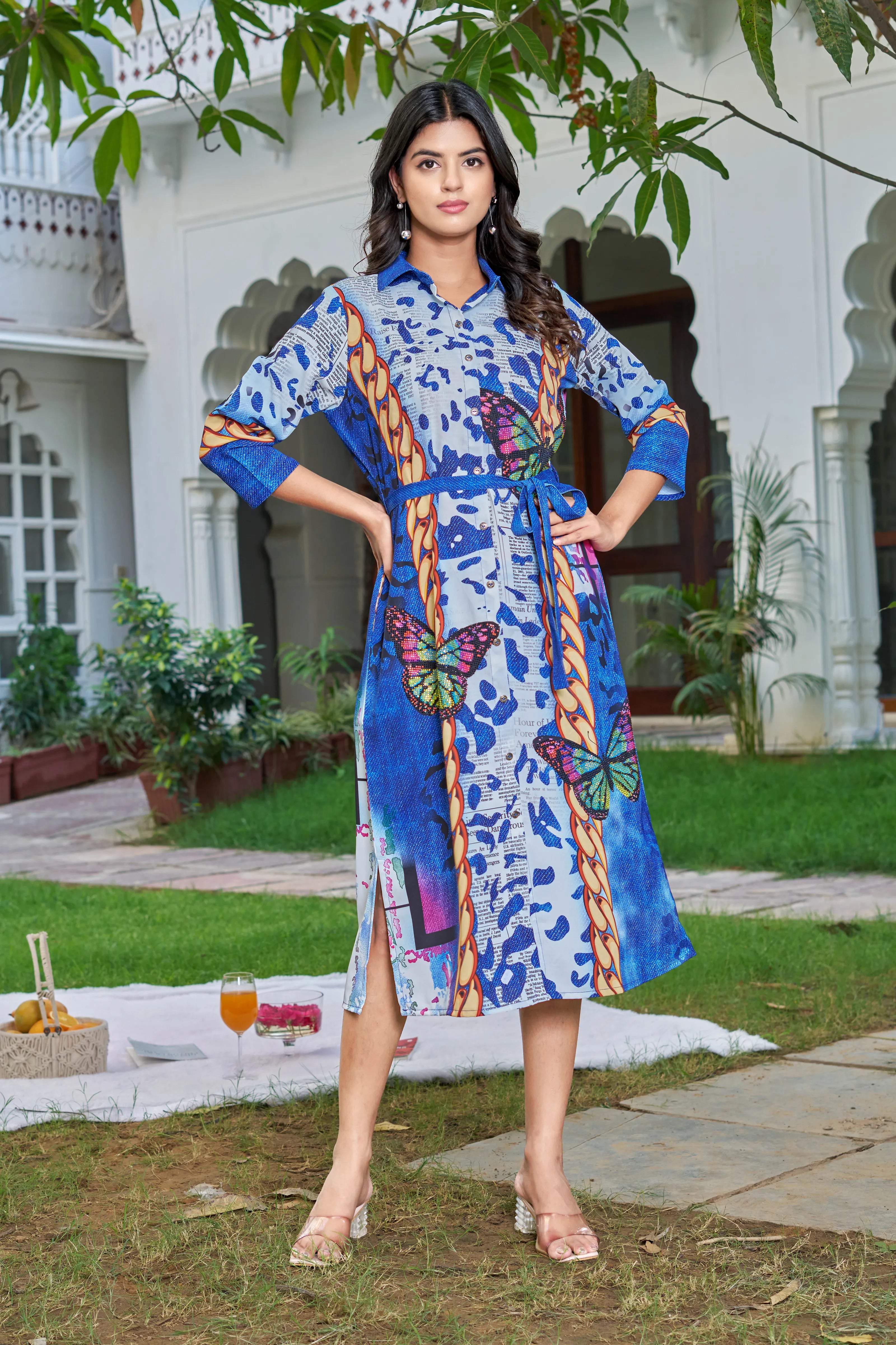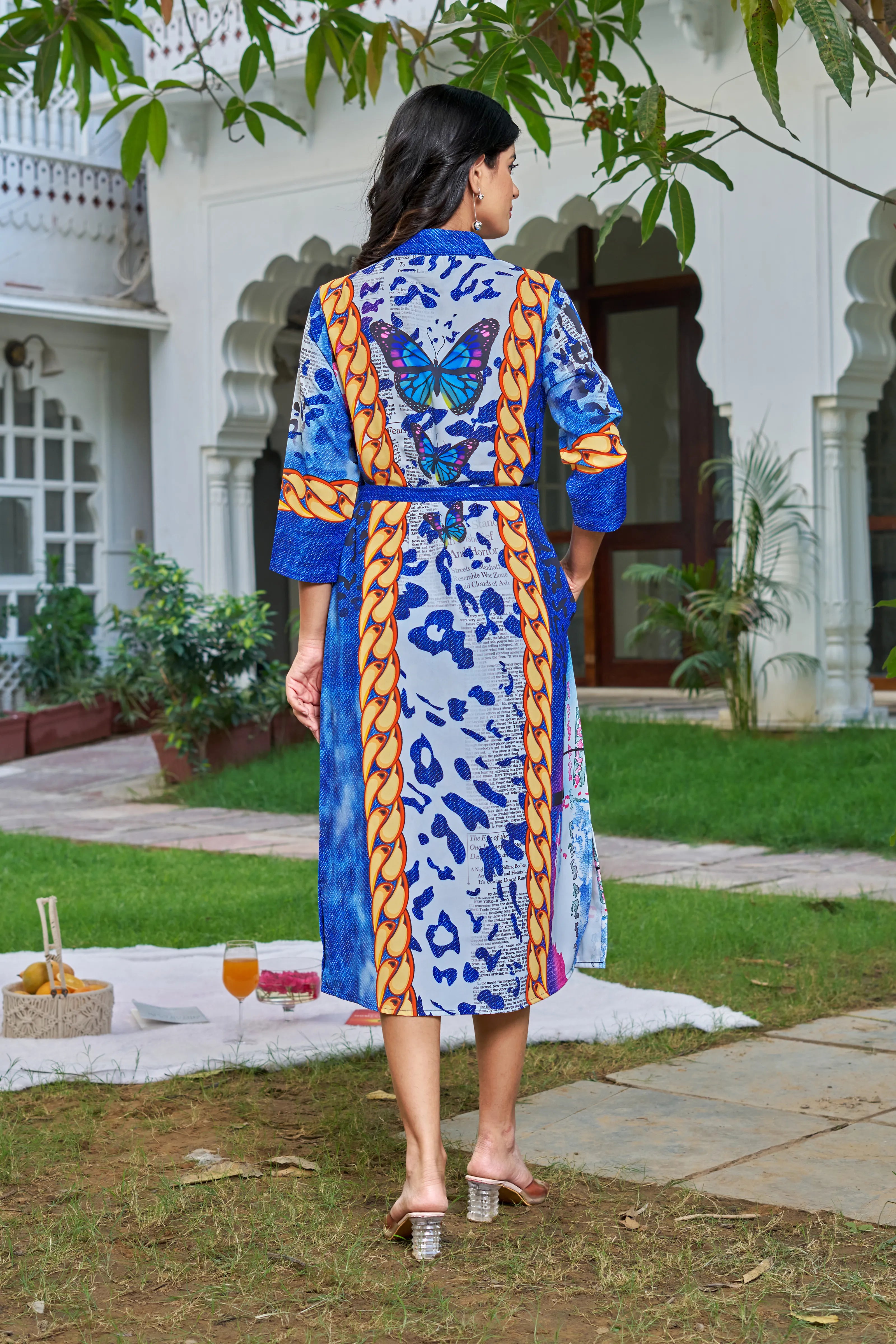 Urban Flutter: Denim Blue Butterfly Shirt Dress in Poly Muslin