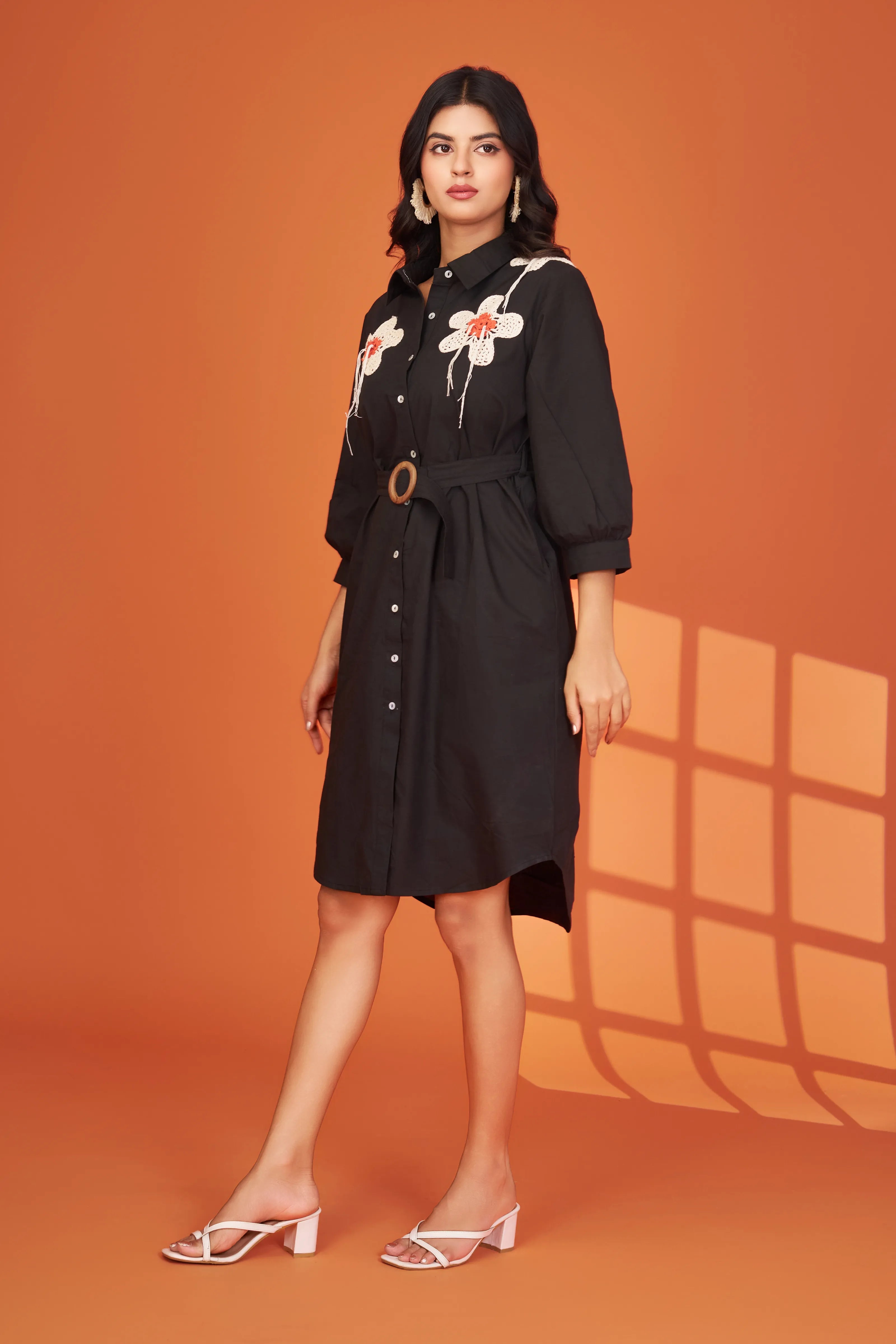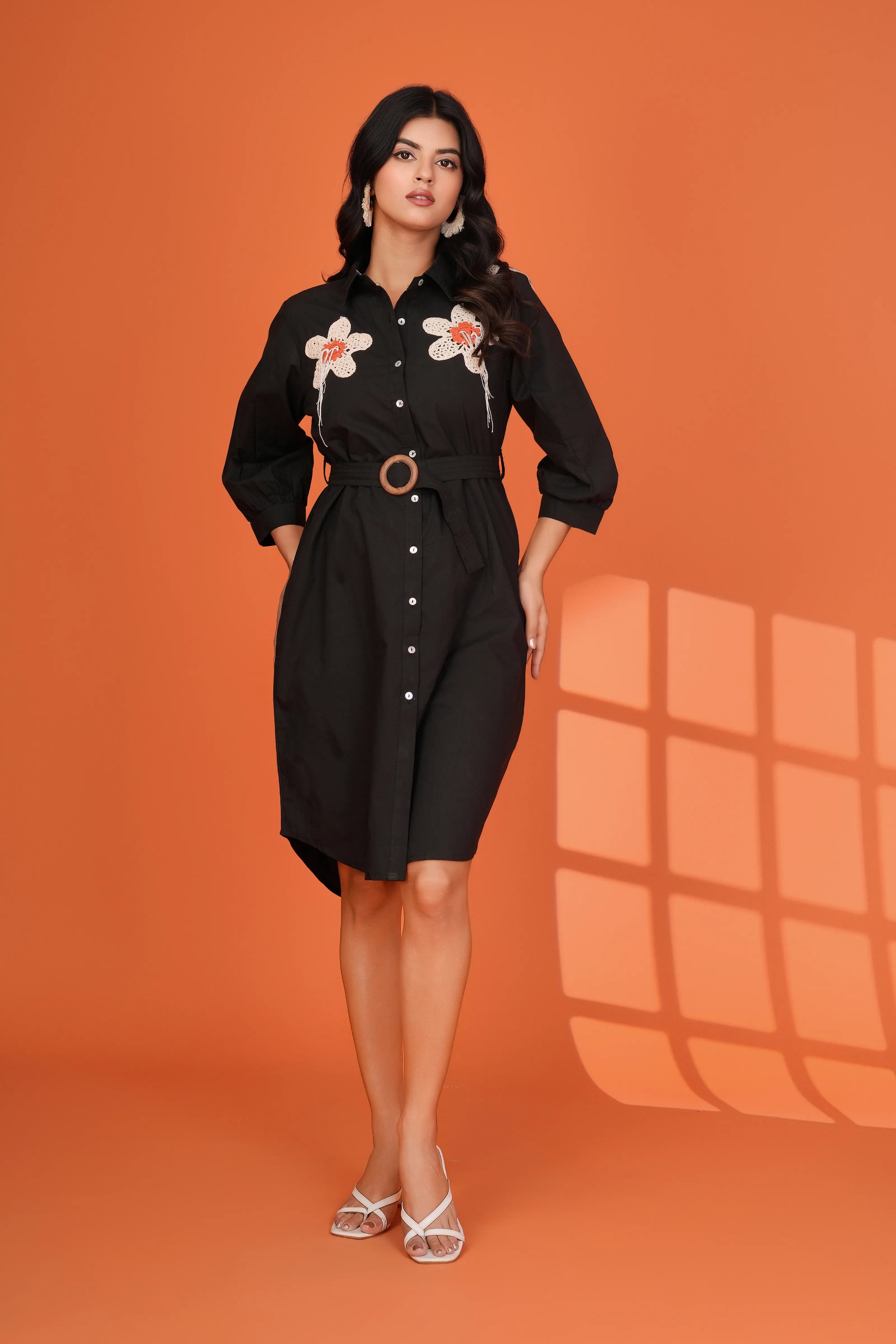 Make a bold statement with Midnight Bloom—a striking black mini dress that fuses vintage charm with contemporary tailoring. Featuring handcrafted crochet floral patches in ivory with hints of orange on the bodice, this shirt-style dress is perfect for standing out effortlessly.