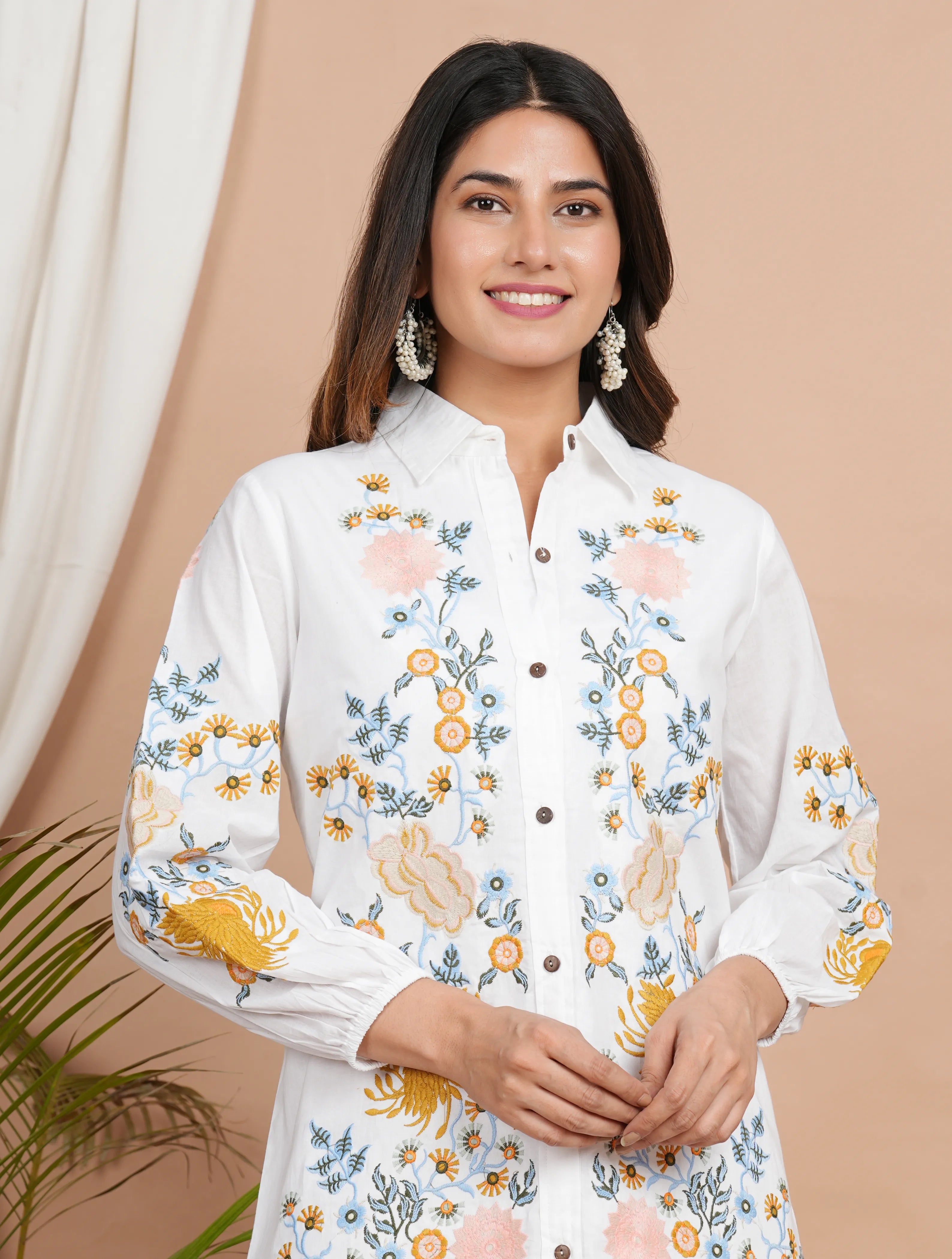 This Floral Multi-Thread Embroidered Cotton Shirt Dress is an effortlessly stylish choice, perfect for casual outings with a touch of refined elegance.