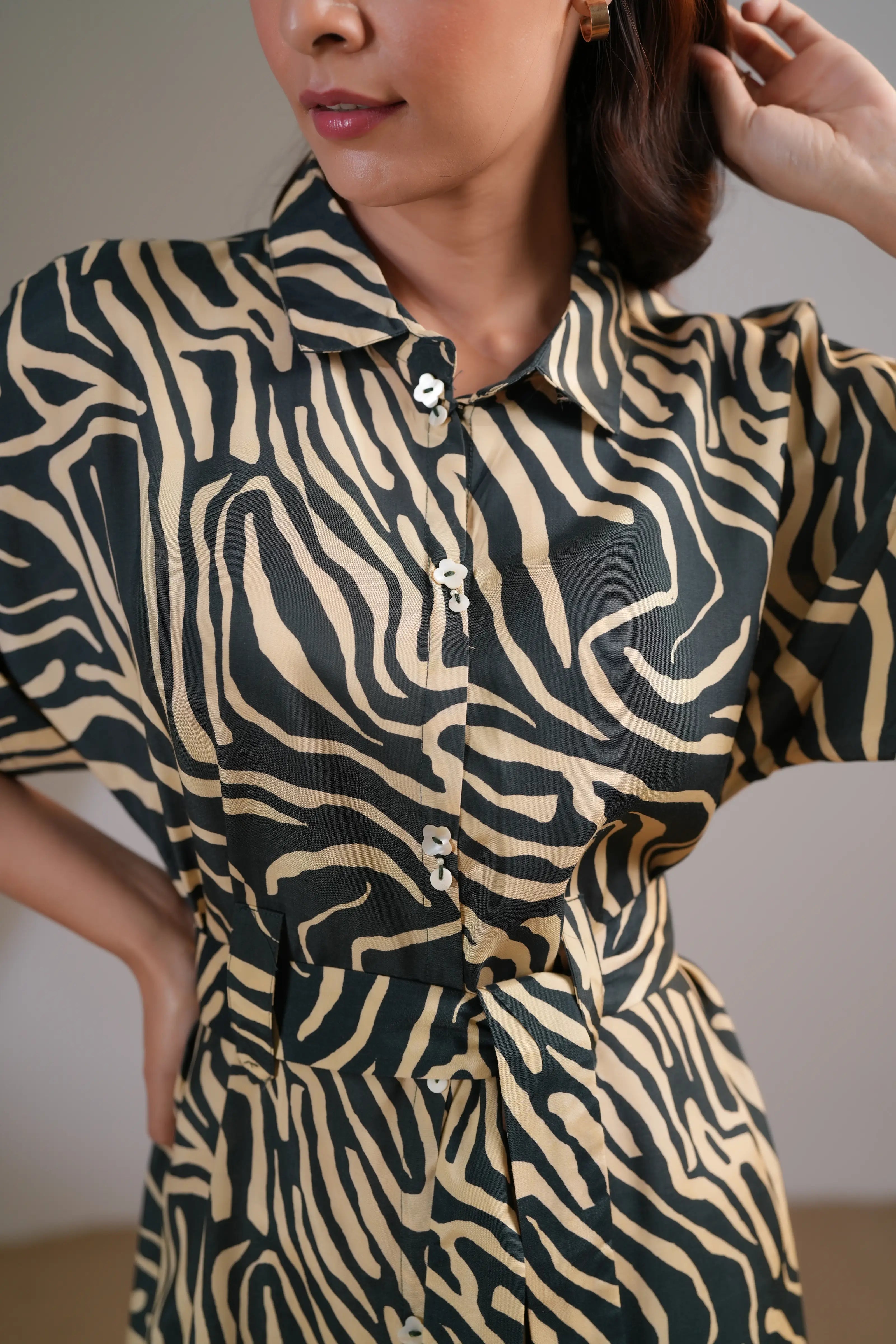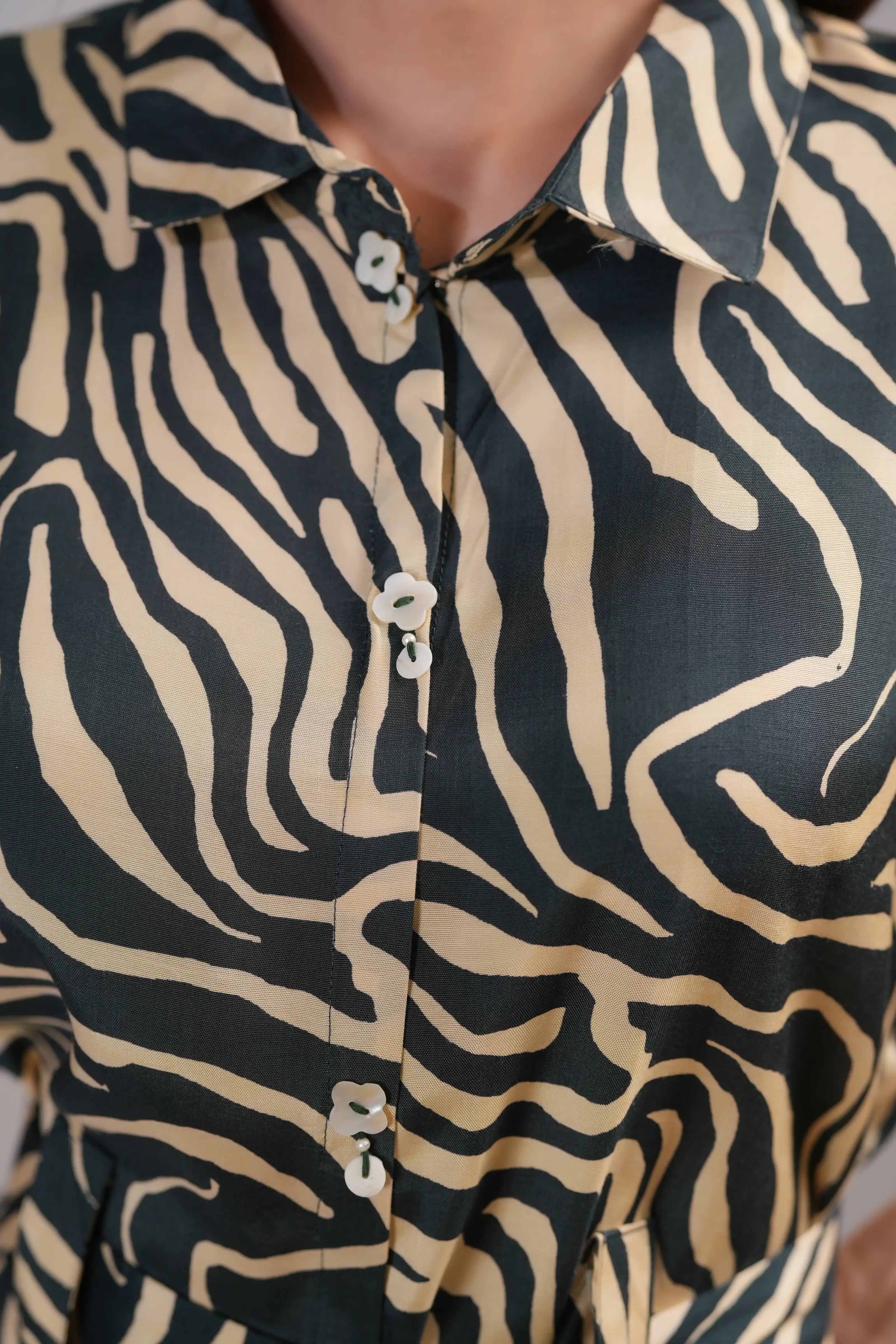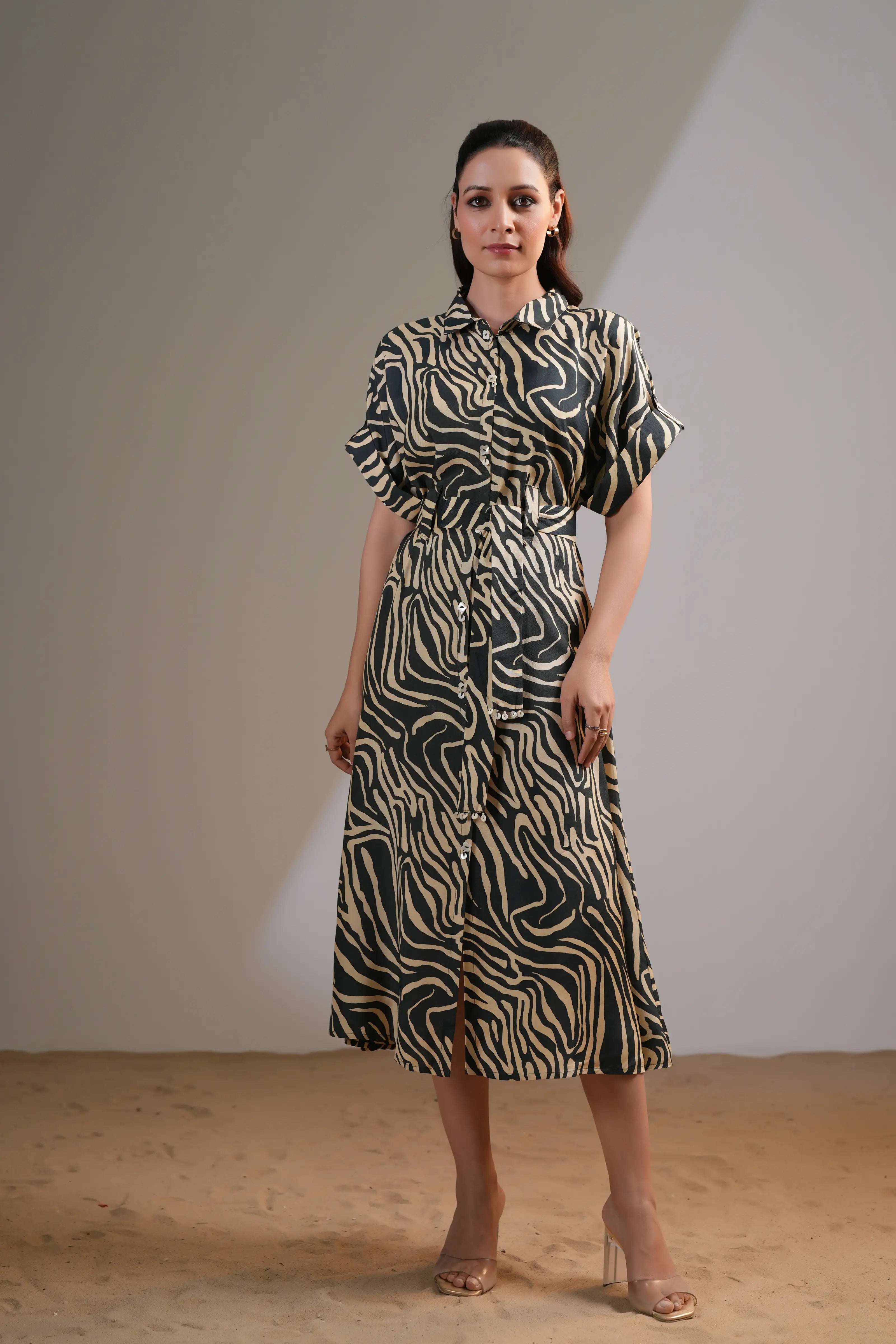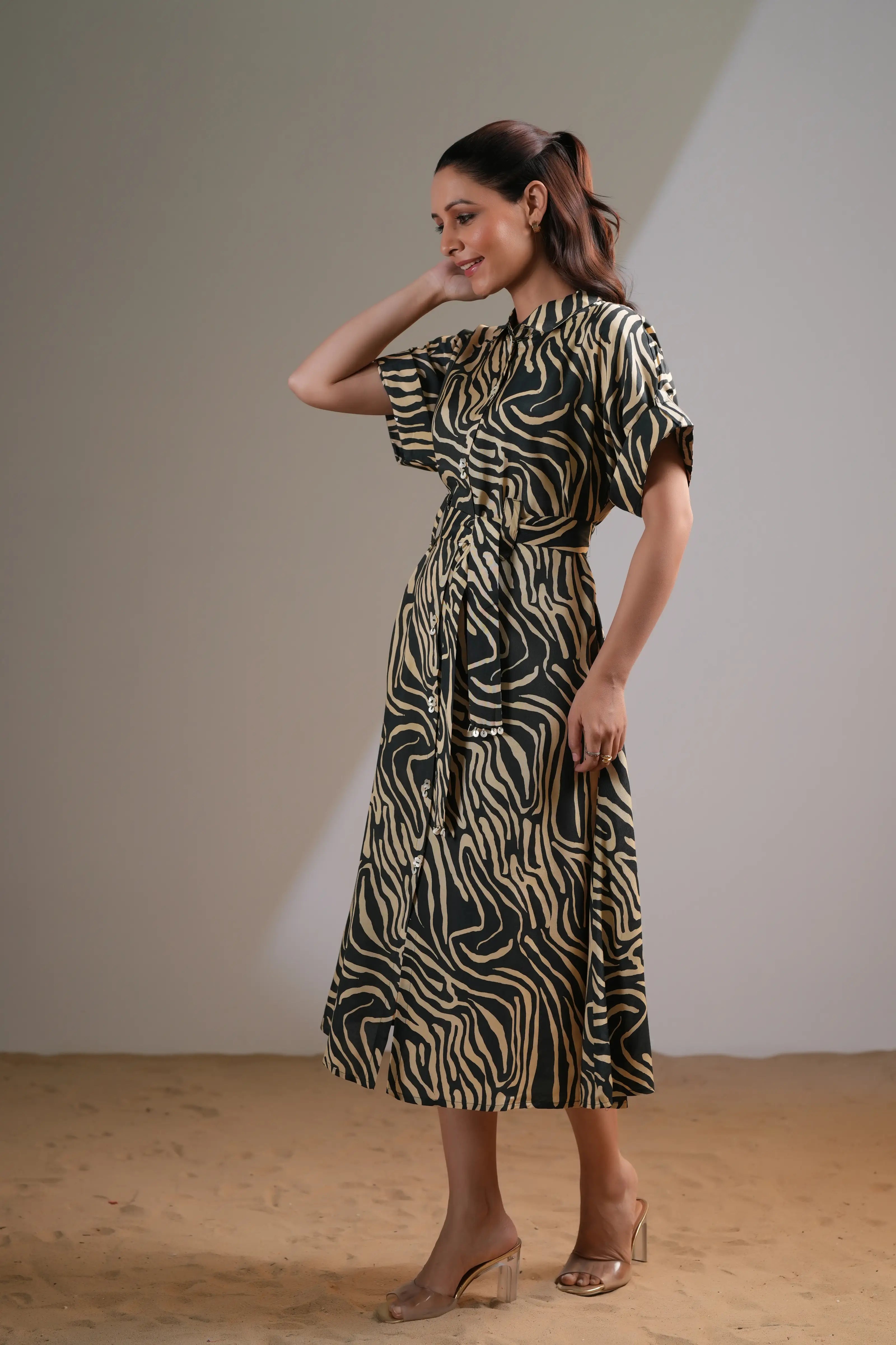 Elevate your wardrobe with this Forest Green & Beige Abstract Stripe Printed Midi Dress, a perfect blend of sophistication and ease. Crafted in luxurious Russian silk, this dress offers a smooth, flowy silhouette with a refined sheen, making it ideal for day-to-evening wear.