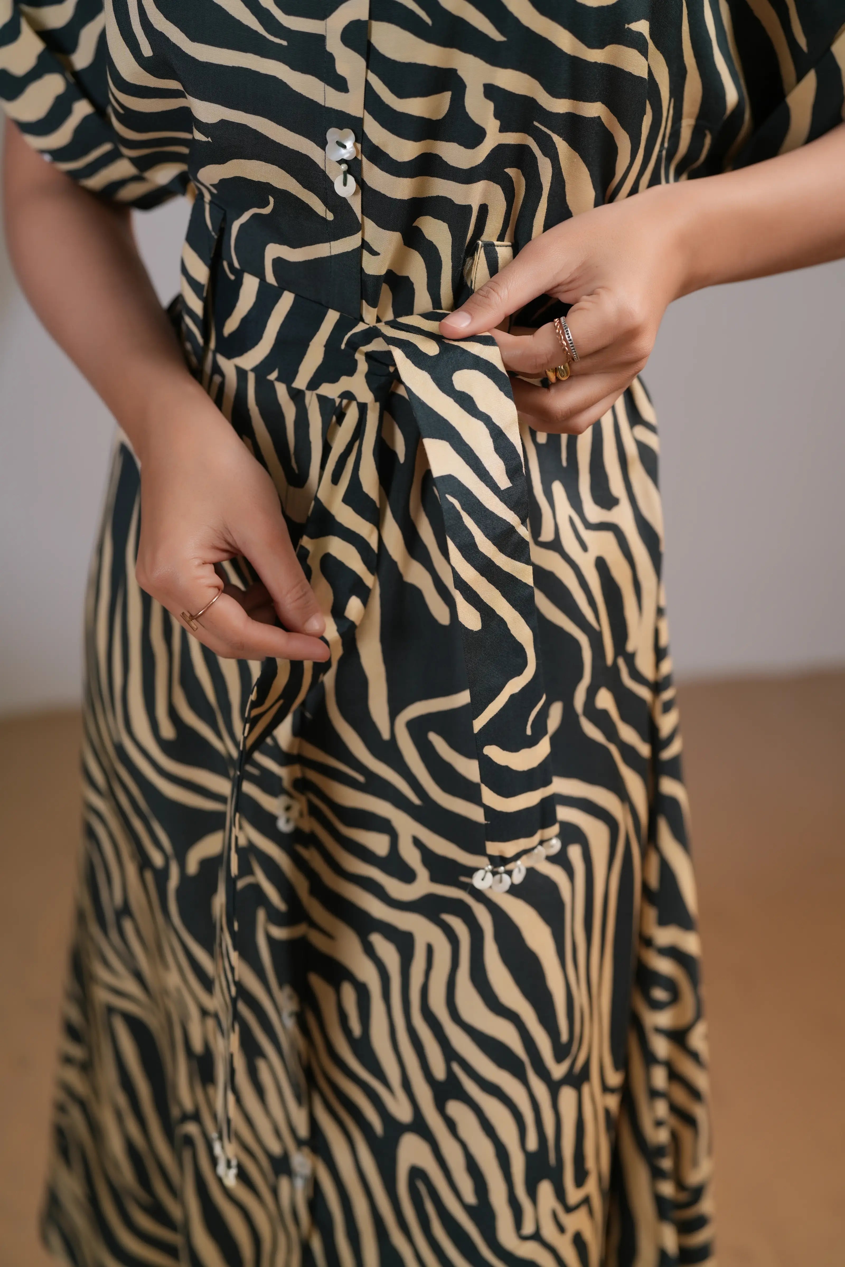 Effortless Elegance: Forest Green & Beige Abstract Stripe Russian Silk Midi Dress