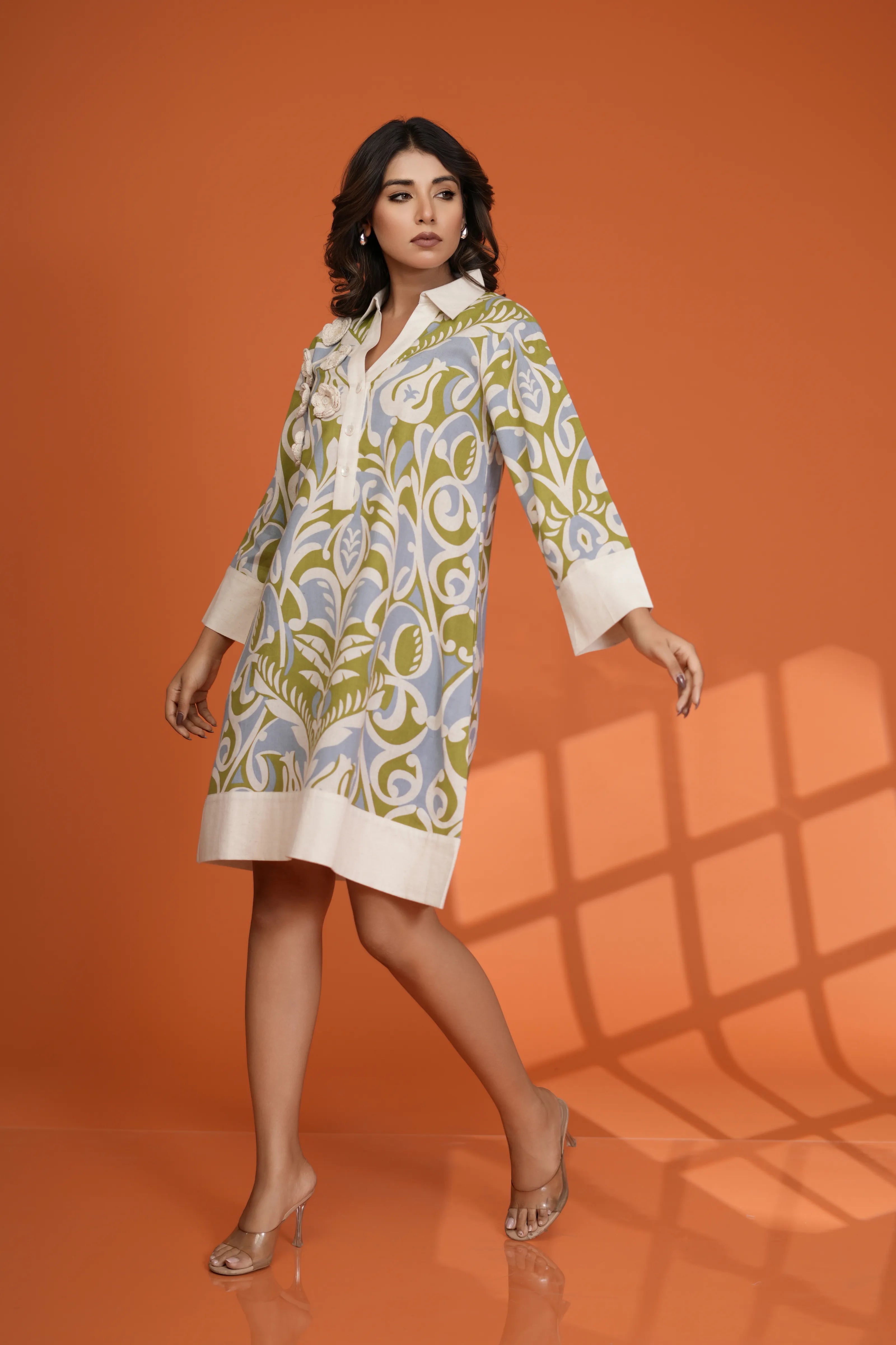 Designed in a relaxed shirt silhouette, it features a sharp collared neckline and partial shell button placket that brings elegance to its bold print. The abstract motif—rendered in soft green, beige, and powder blue—adds dimension and personality, while the wide contrast cuffs and hem elevate the finish.