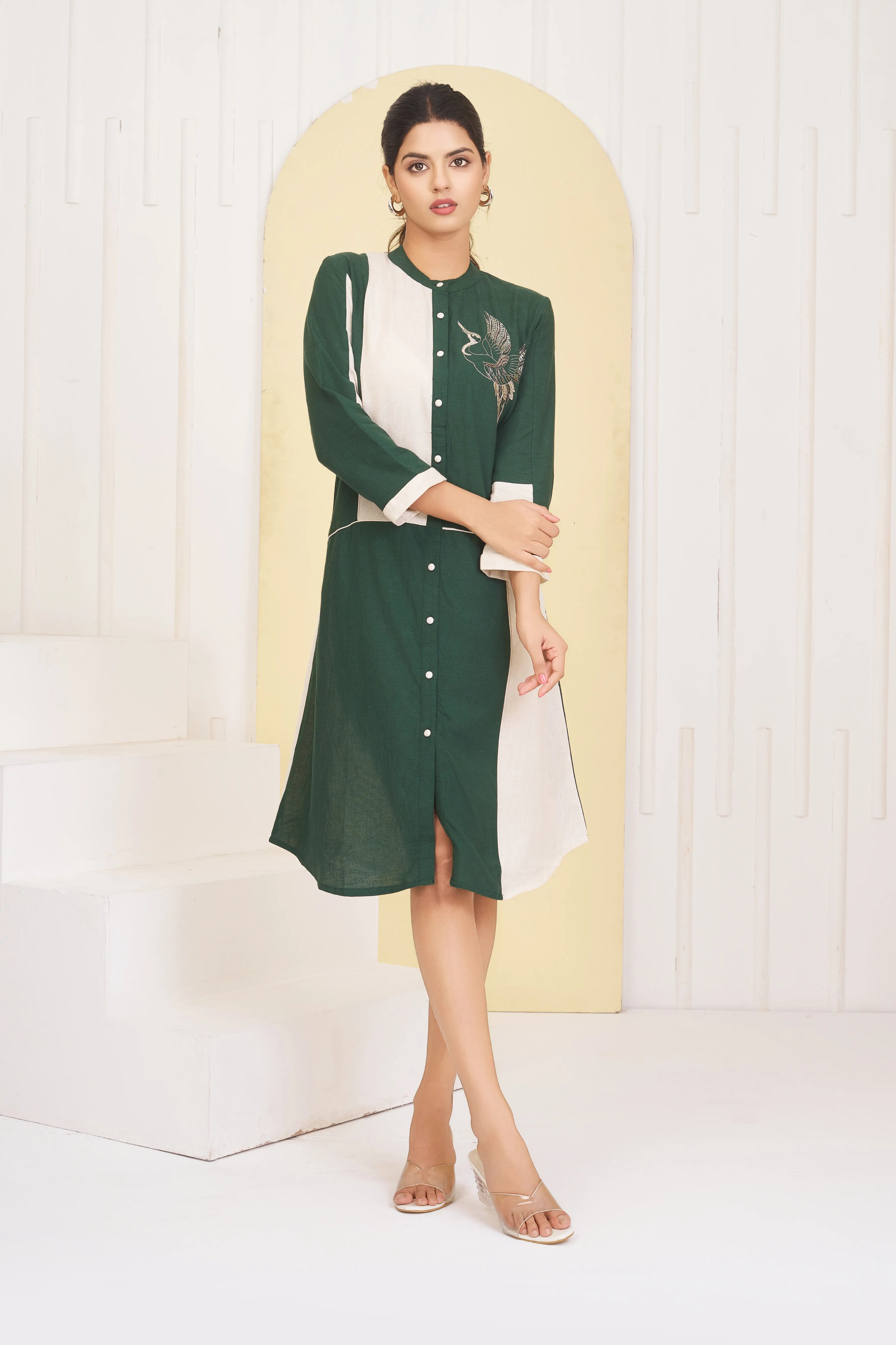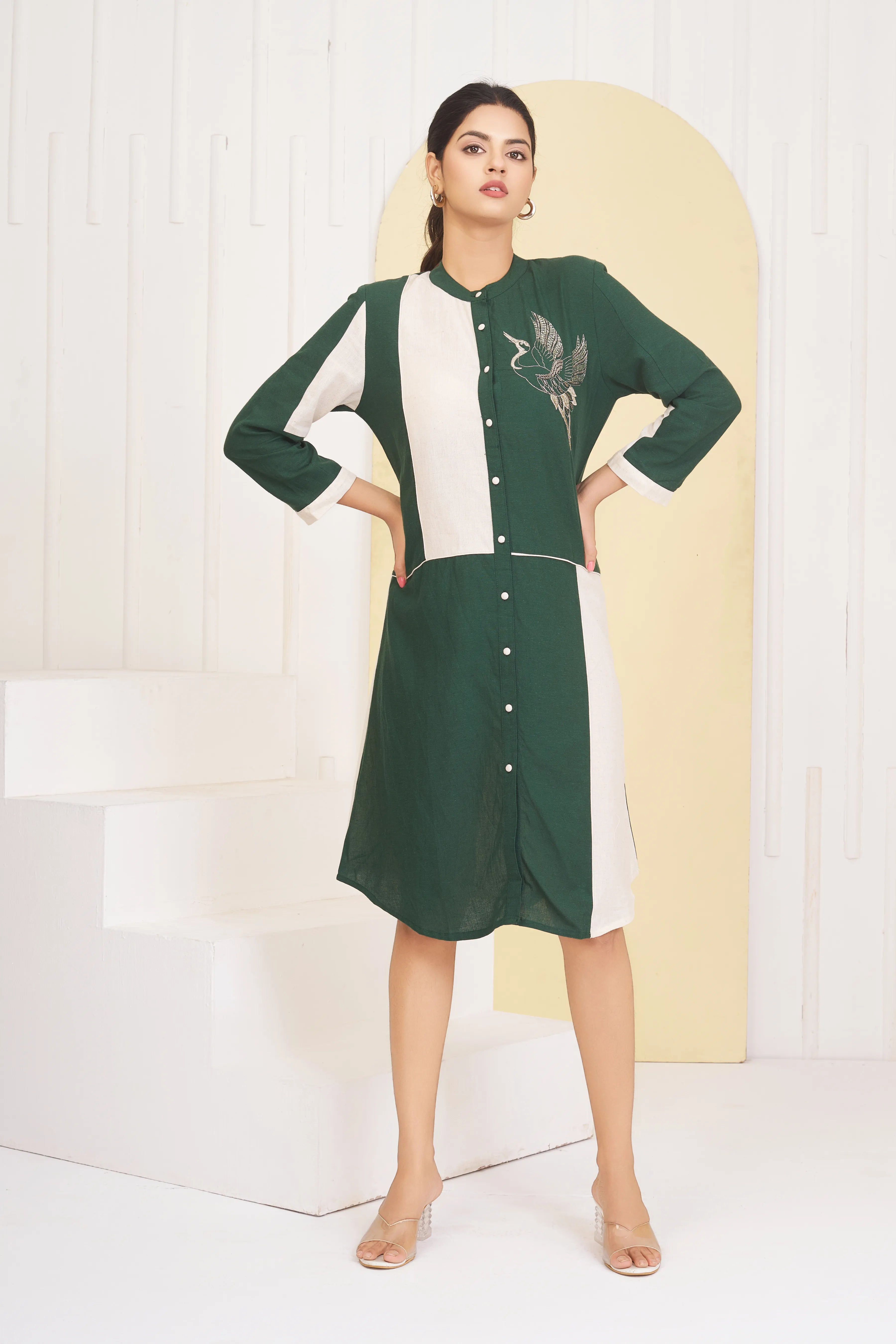 Elevate your wardrobe with this elegant Green and white dress, crafted from a soft cotton-rayon blend for ultimate comfort. Featuring a detailed Lurex thread embroidered bird motif, 3/4th sleeves, and a classic round neckline, this dress effortlessly combines sophistication with everyday wearability.