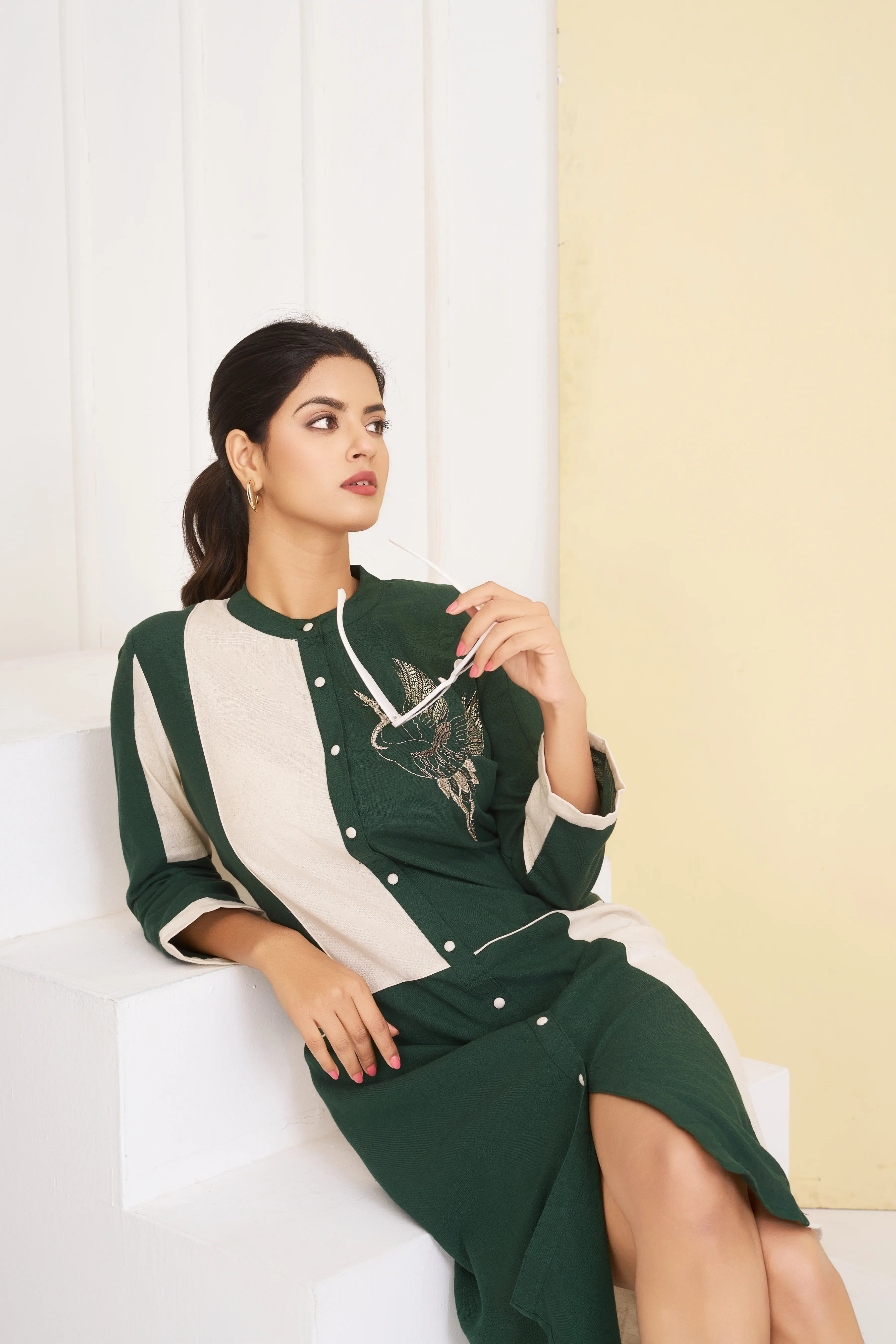 - Design: Bird motif embroidery in green and white