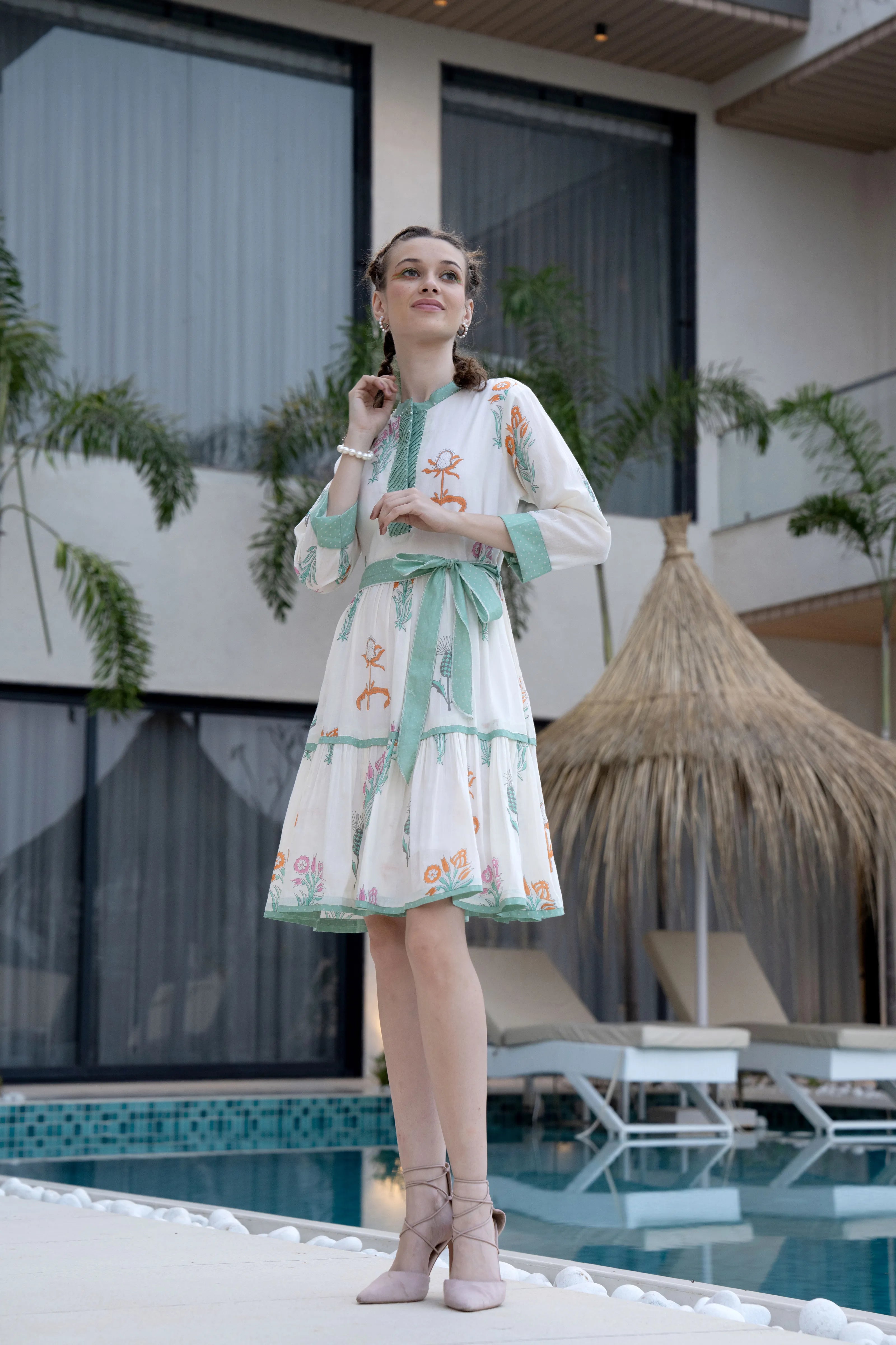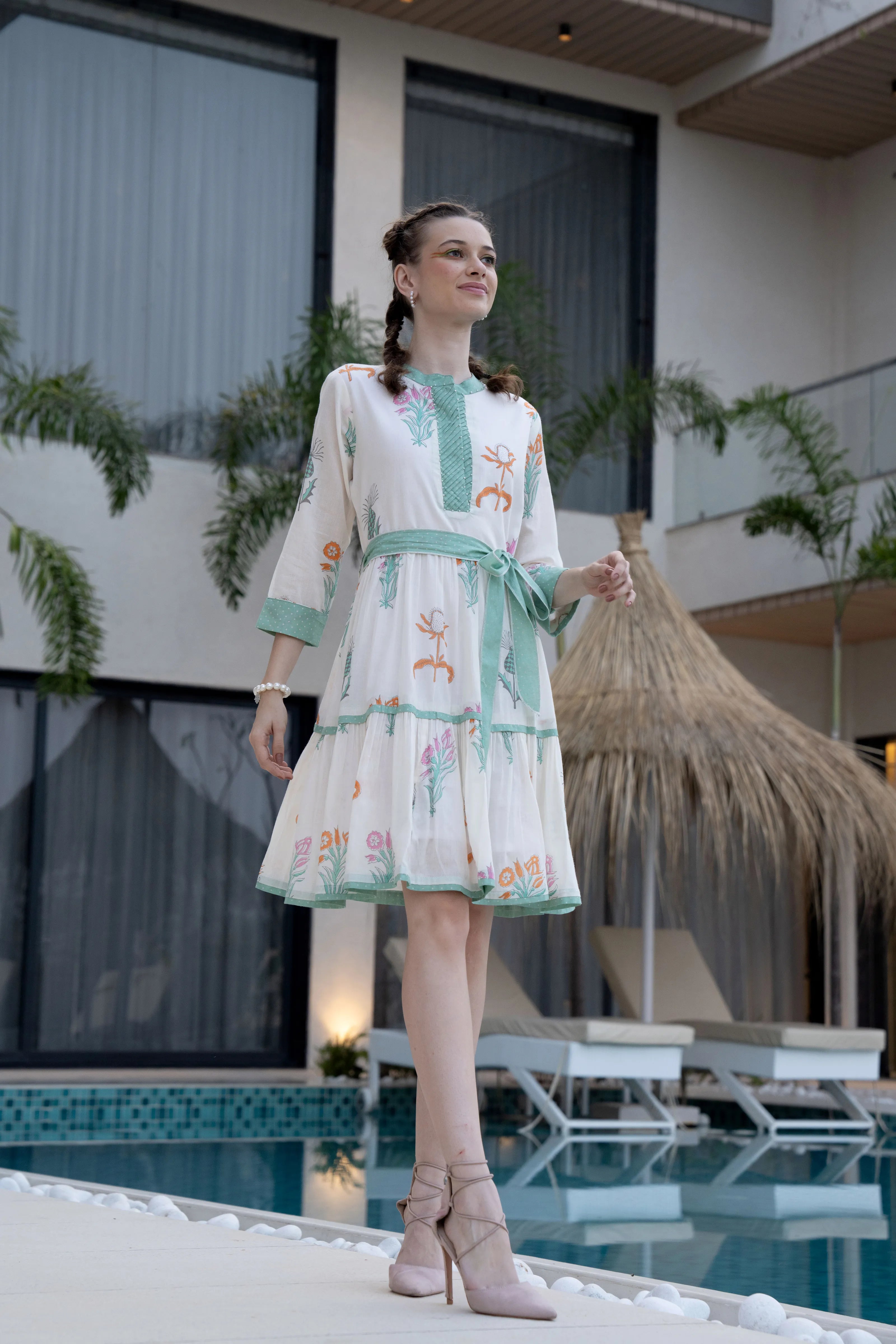 Channel garden-fresh charm with Botanical Breeze, a delicate yet statement-worthy mini dress in soft cotton voile. Set on a dreamy ivory base, this dress features bold multicolour floral prints that evoke summer meadows in full bloom.