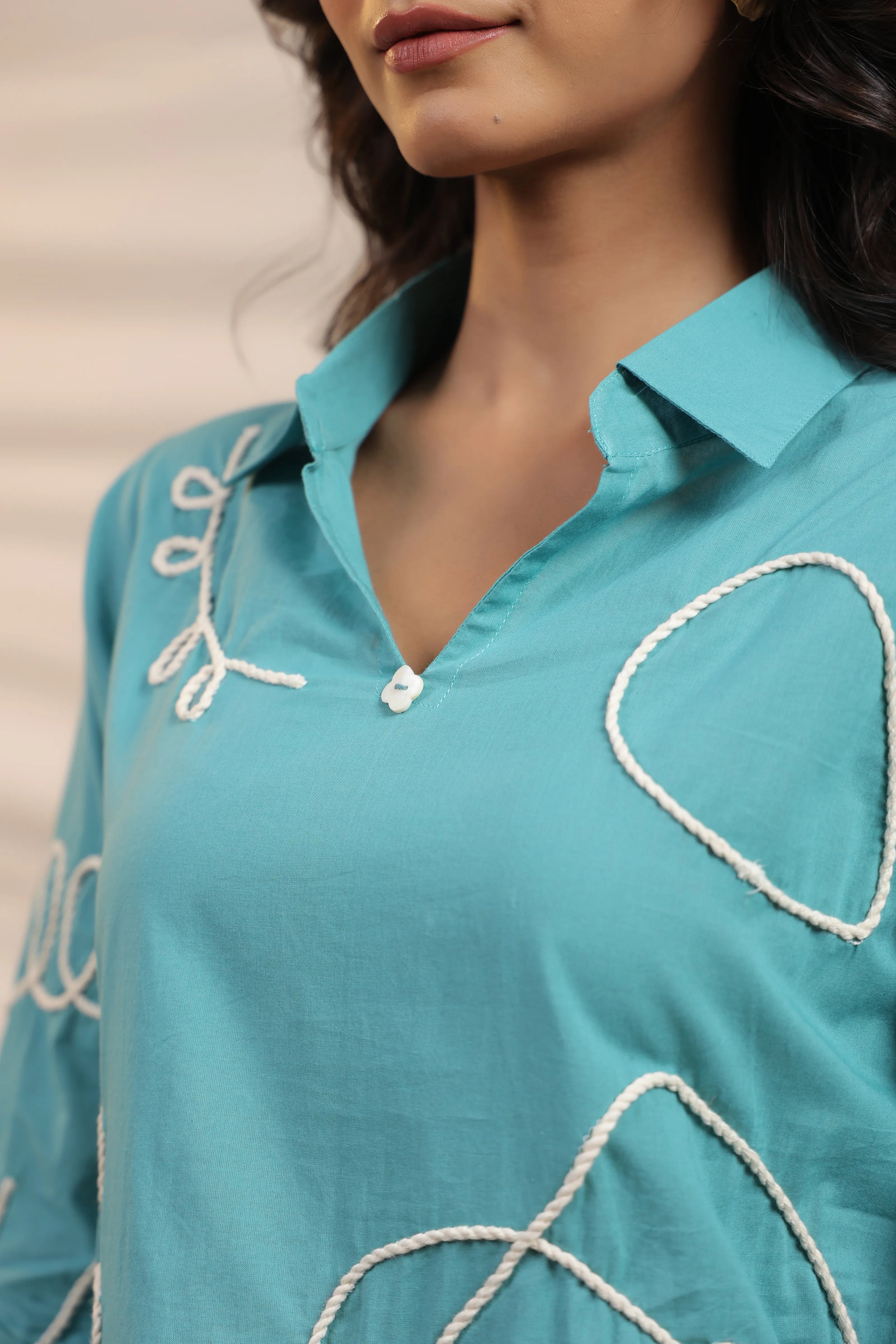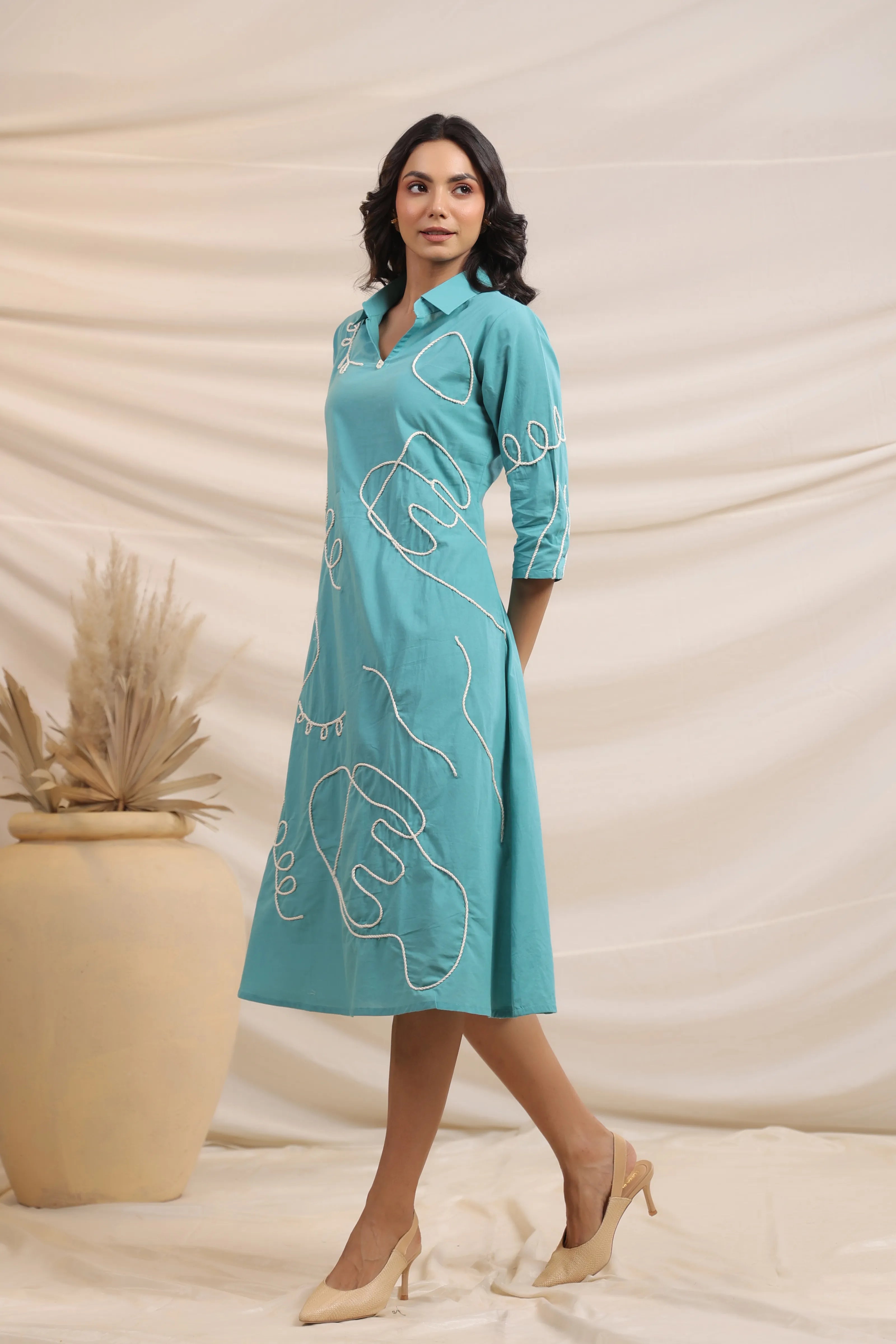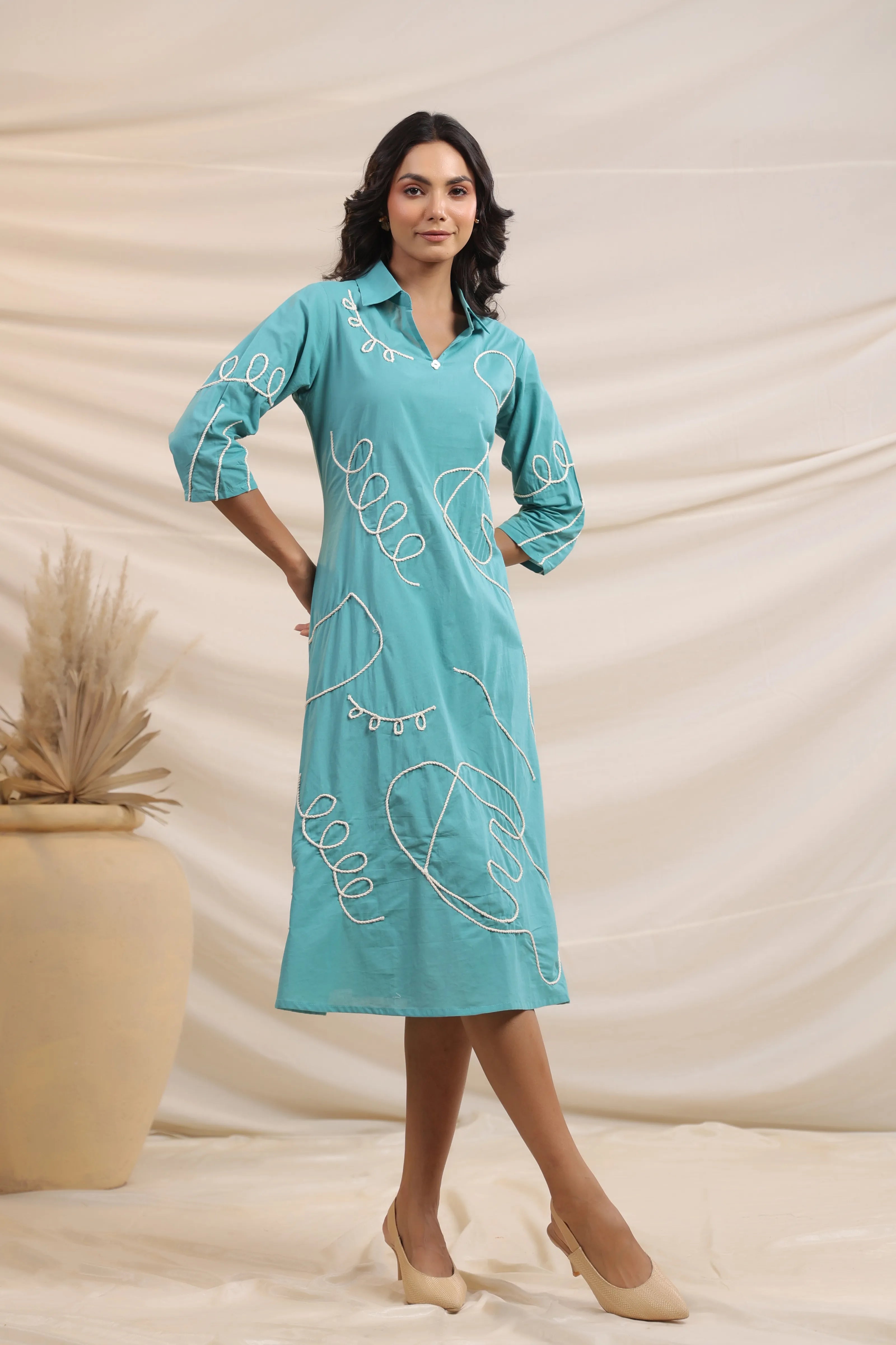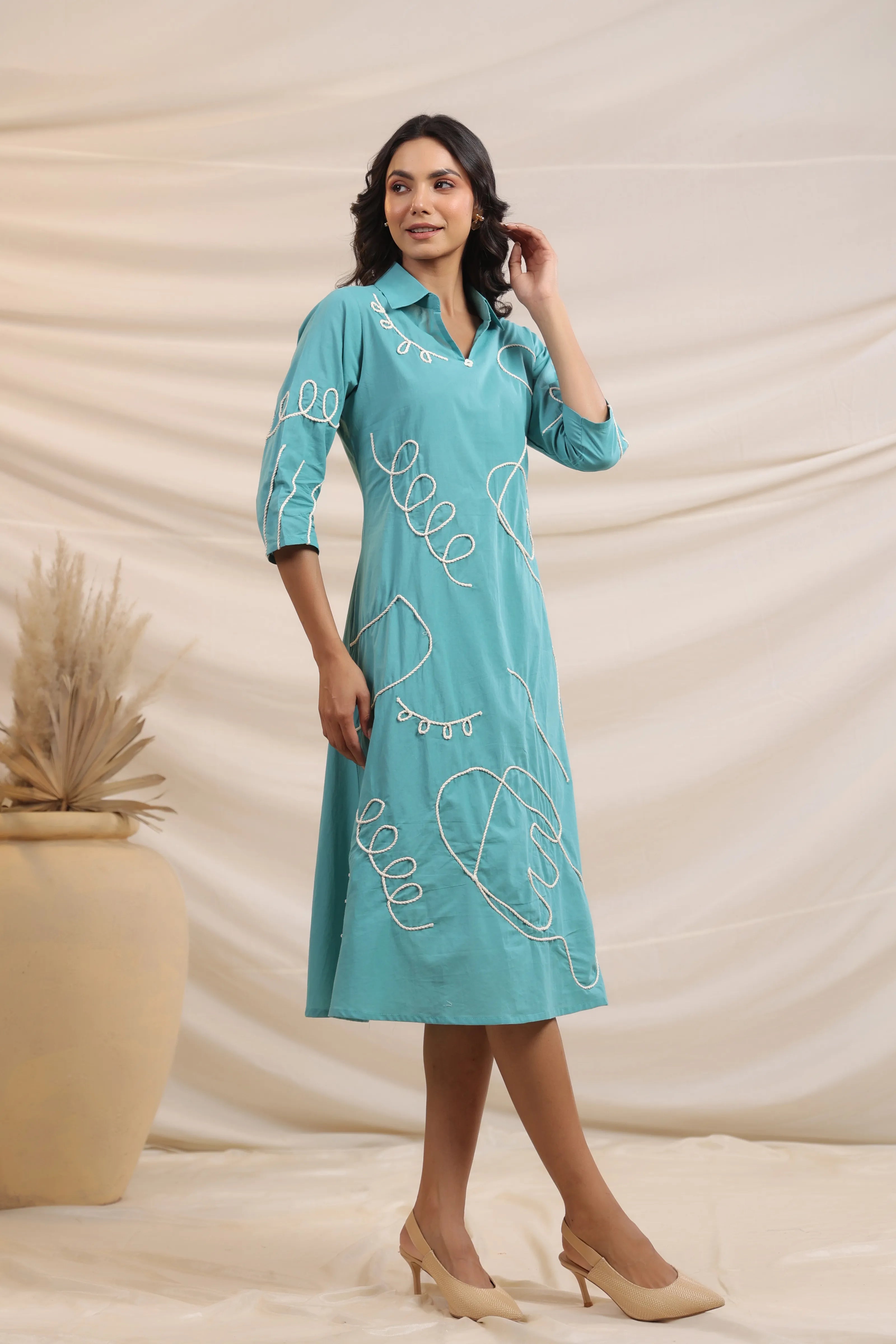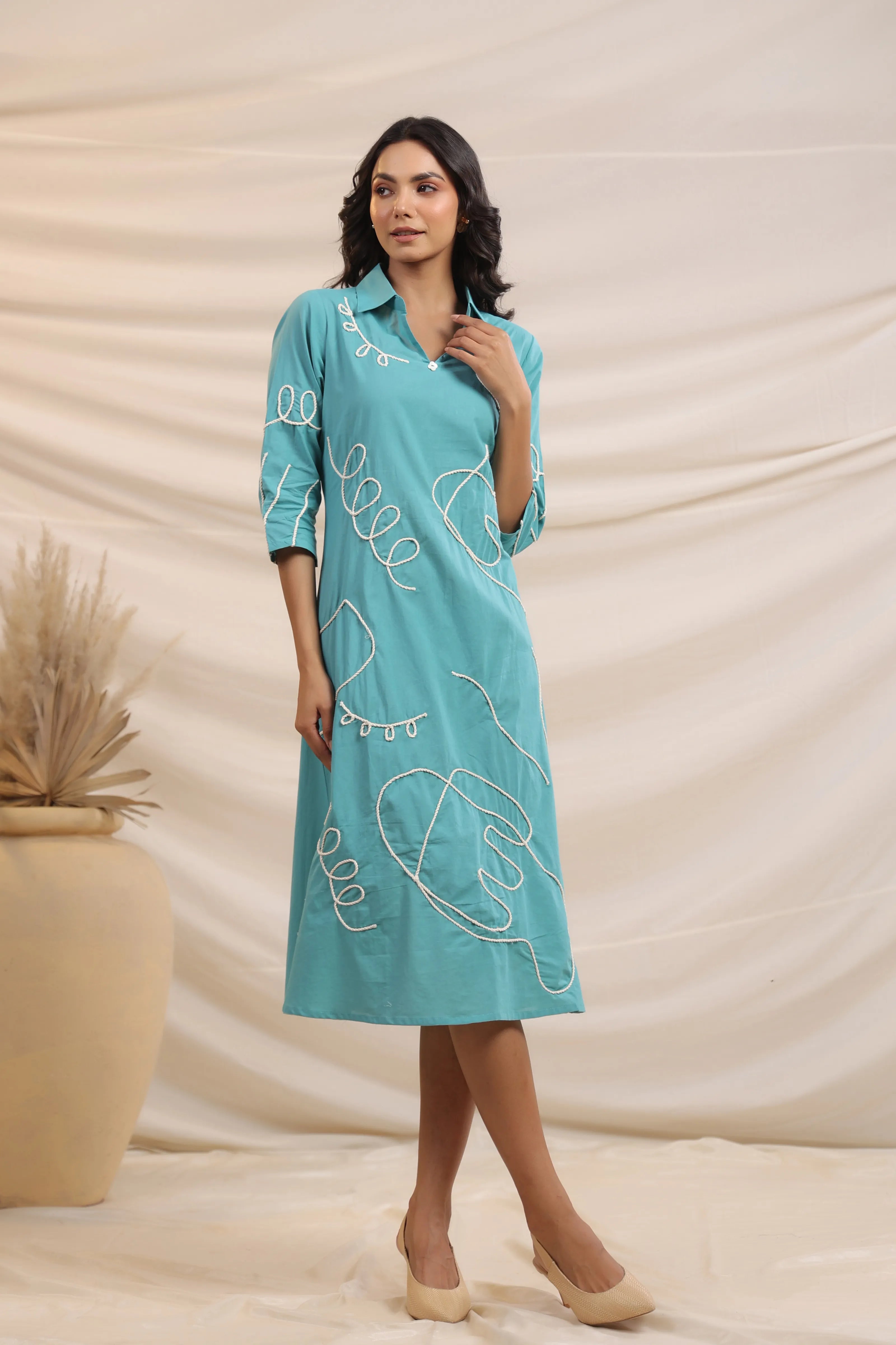 Step into sophistication with this Middle Blue Midi Dress, designed with an elegant shirt collar and intricate abstract cord work detailing. Crafted from breathable cotton cambric, this dress offers a perfect balance of comfort and style. The 3/4th sleeves and midi length create a polished yet relaxed silhouette, making it ideal for casual outings, workwear, or semi-formal occasions.