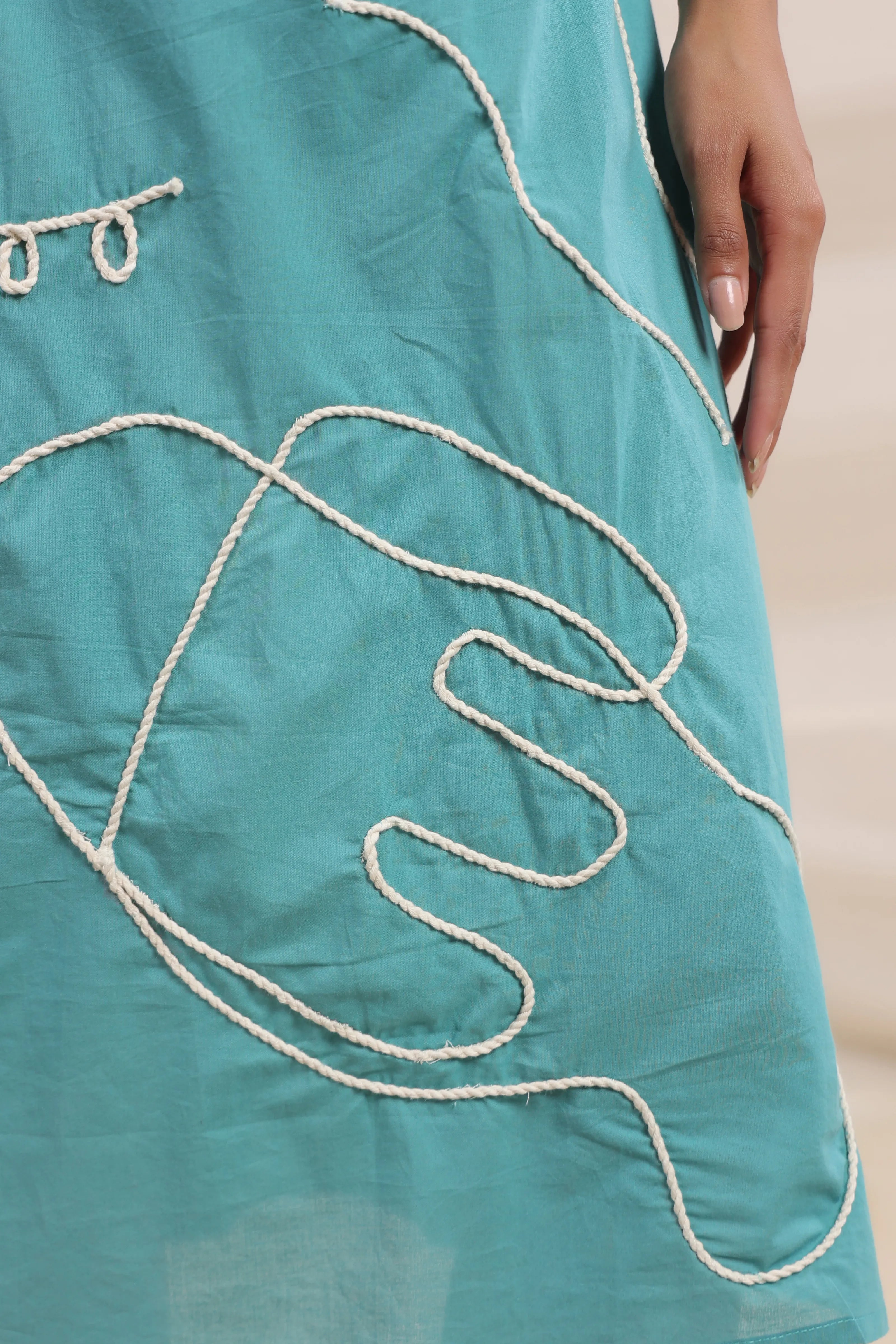 Effortless Elegance: Middle Blue Abstract Cord Work Midi Dress in Cotton Cambric
