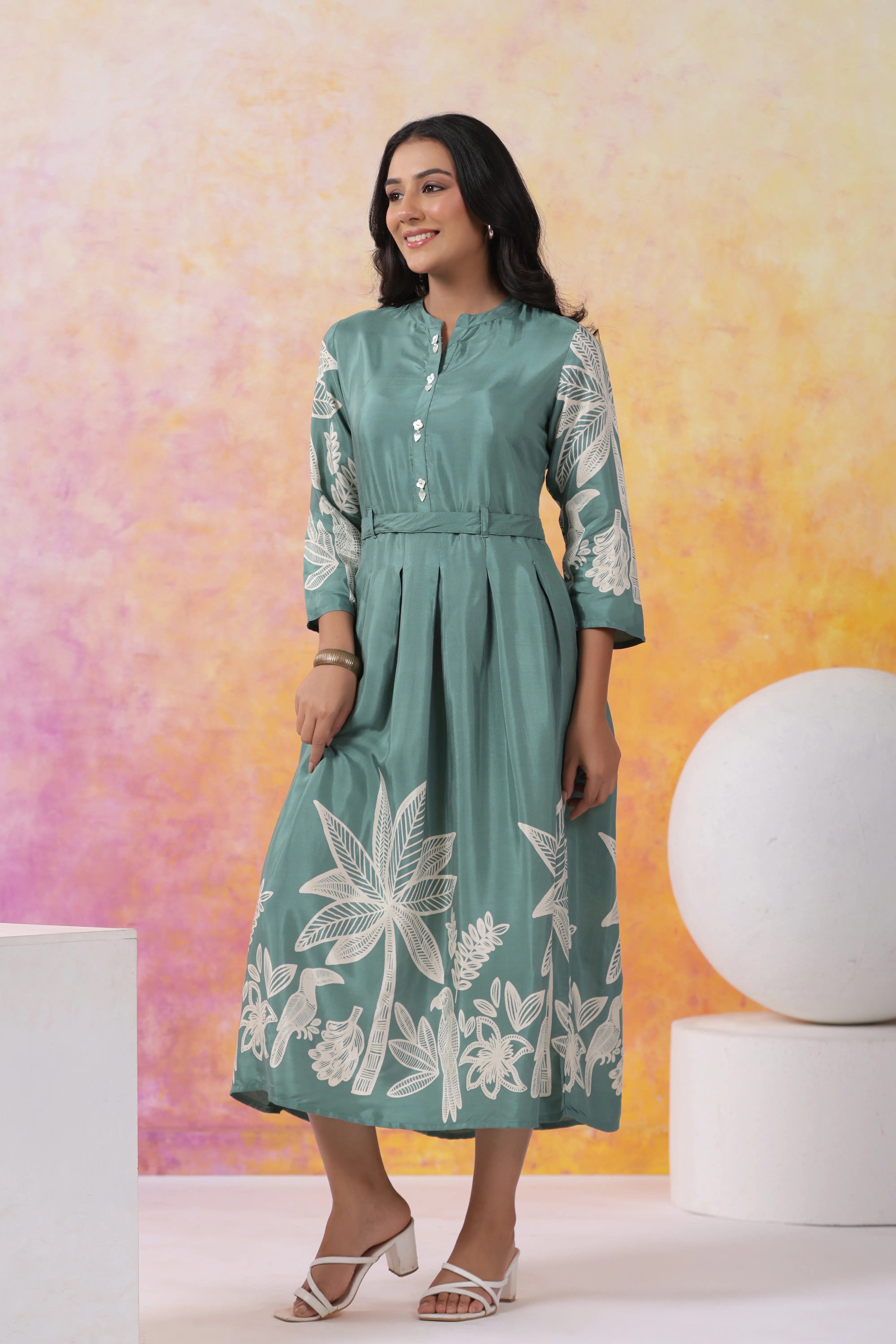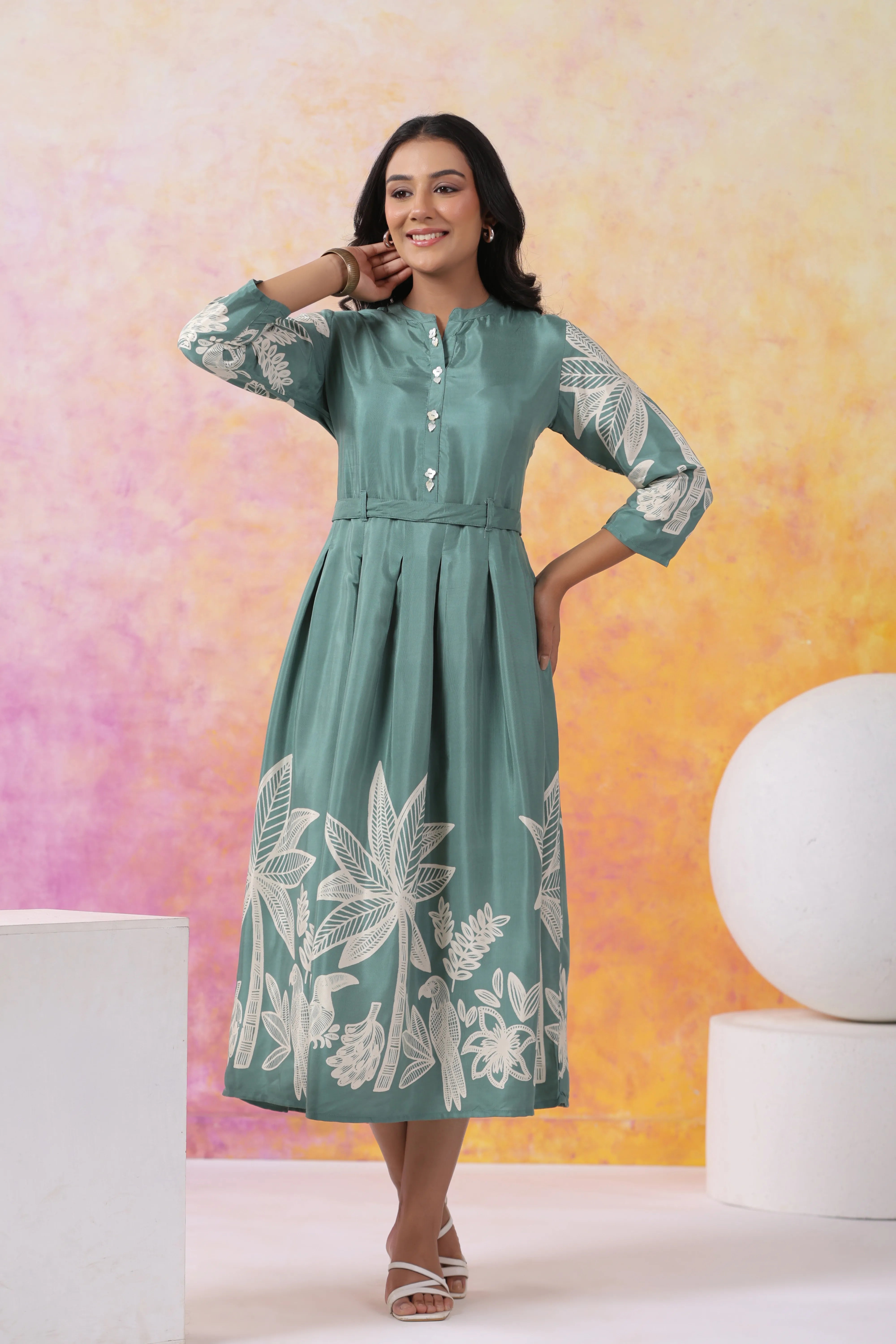 Step into effortless elegance with this mint green midi dress, adorned with bold cream floral motifs for a striking contrast. Crafted from luxurious Russian silk, it features a delicate round neckline and chic 3/4th sleeves for a polished look. The faux shell button detail and tie-back design ensure a flattering and adjustable fit, while the rounded hemline adds a touch of grace.