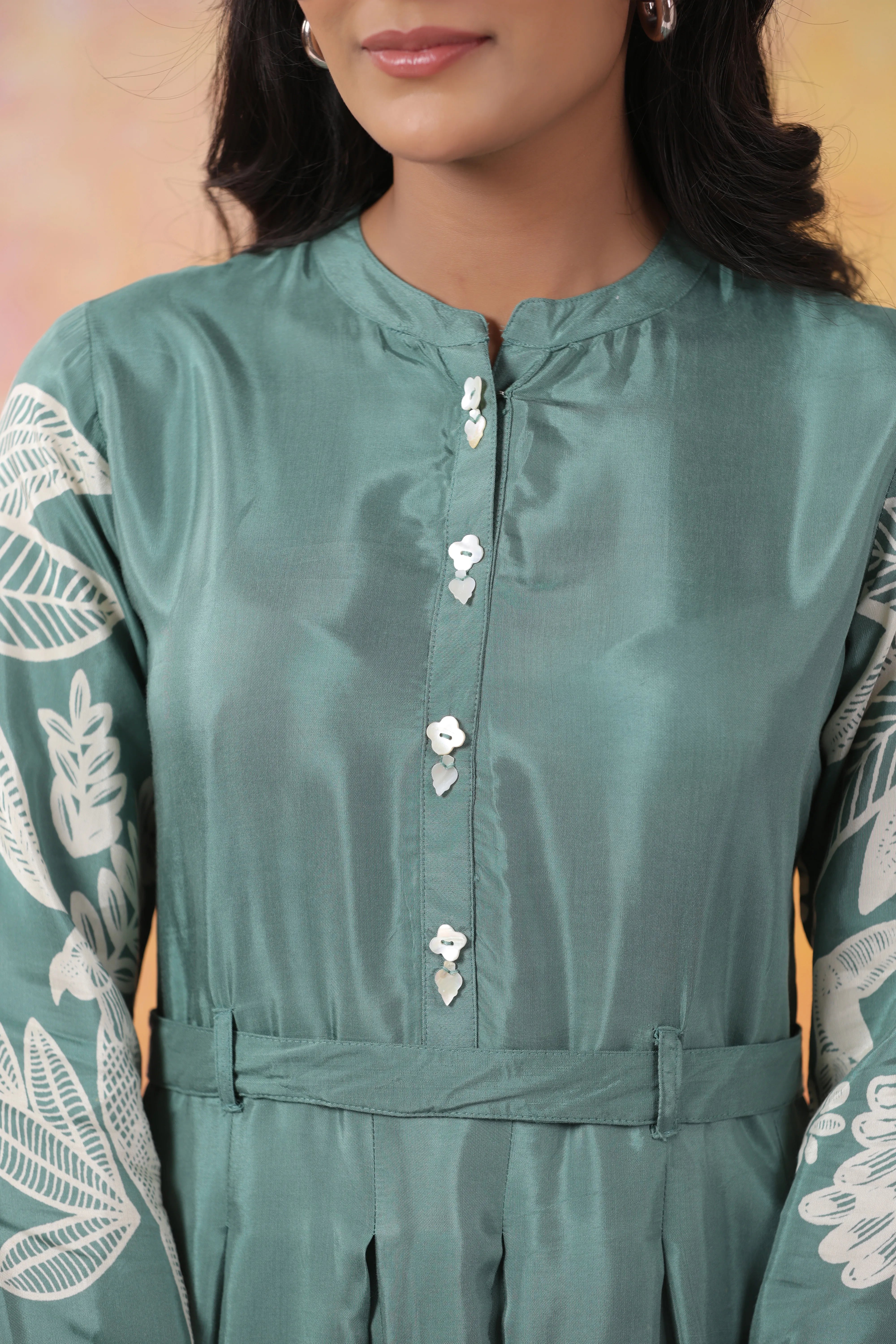 - Design Details: Bold Cream Floral Print on Mint Green Base, Round Neckline, Faux Shell Buttons, Tie-Back Detail