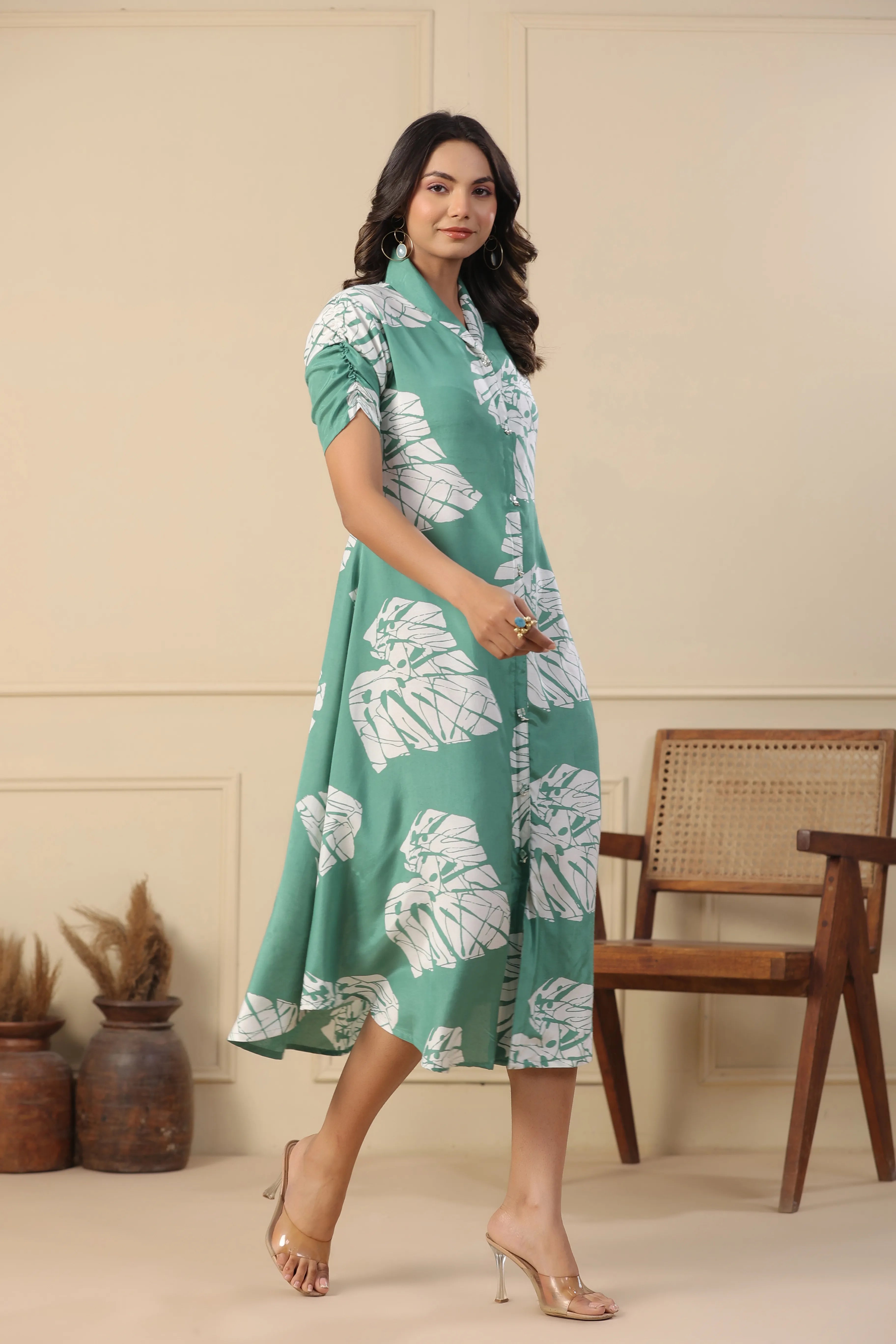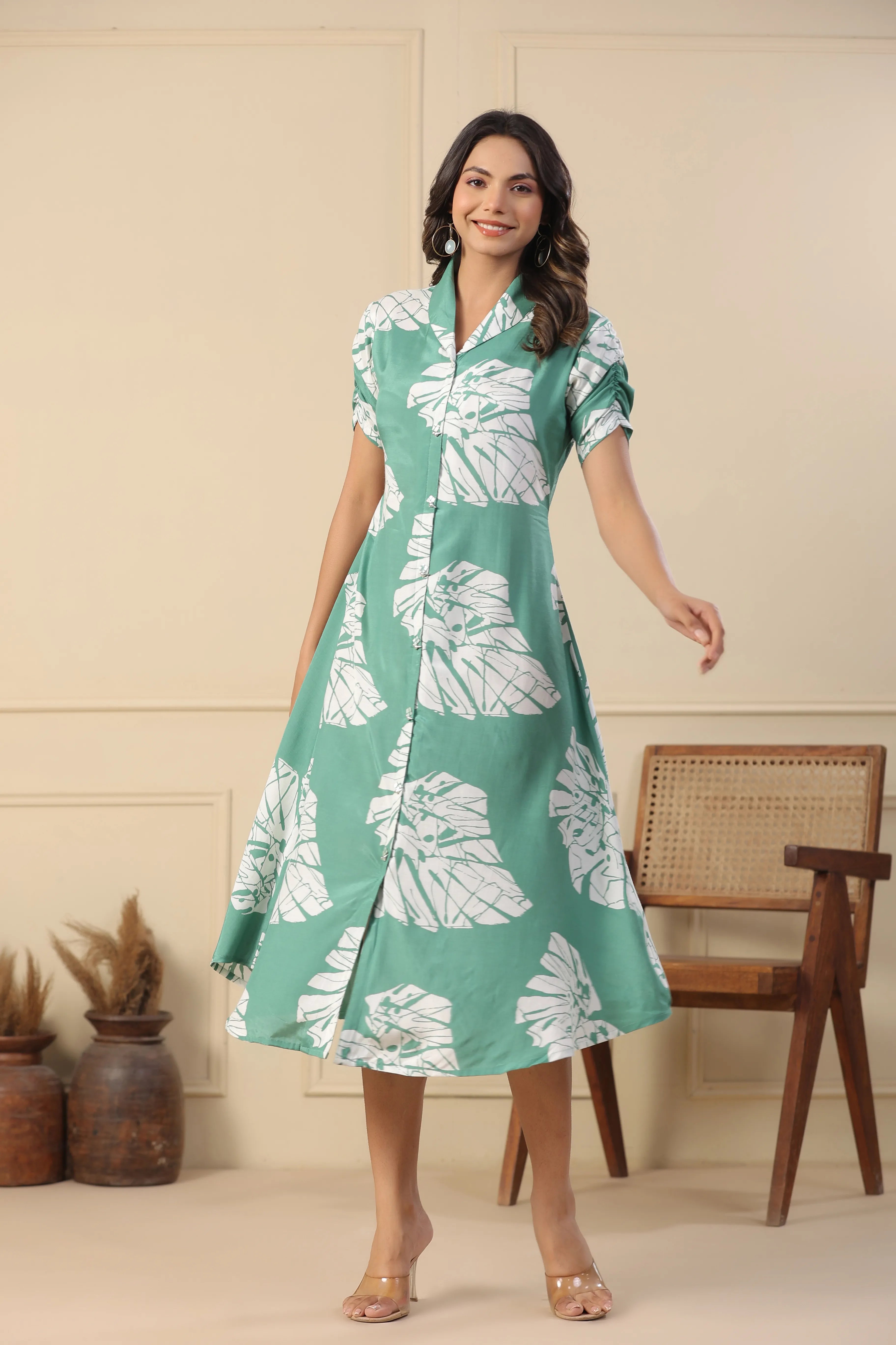 Add a touch of elegance to your wardrobe with this Mint Green Floral Midi Dress, crafted from luxurious Russian silk. Featuring a bold white leaf motif print, this dress is designed with a chic lapel collar, elasticated half sleeves, and shell buttons along the front for a sophisticated finish.