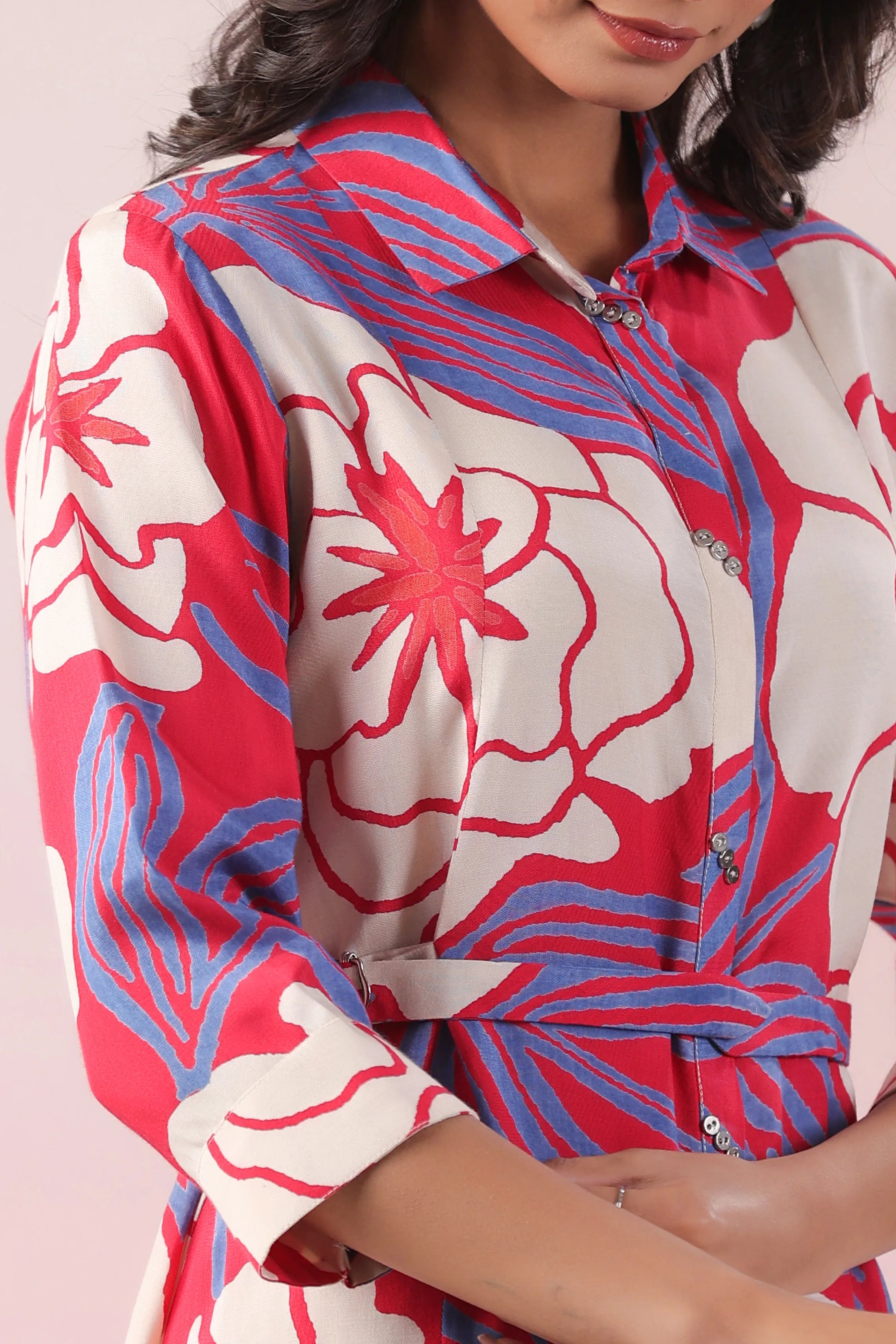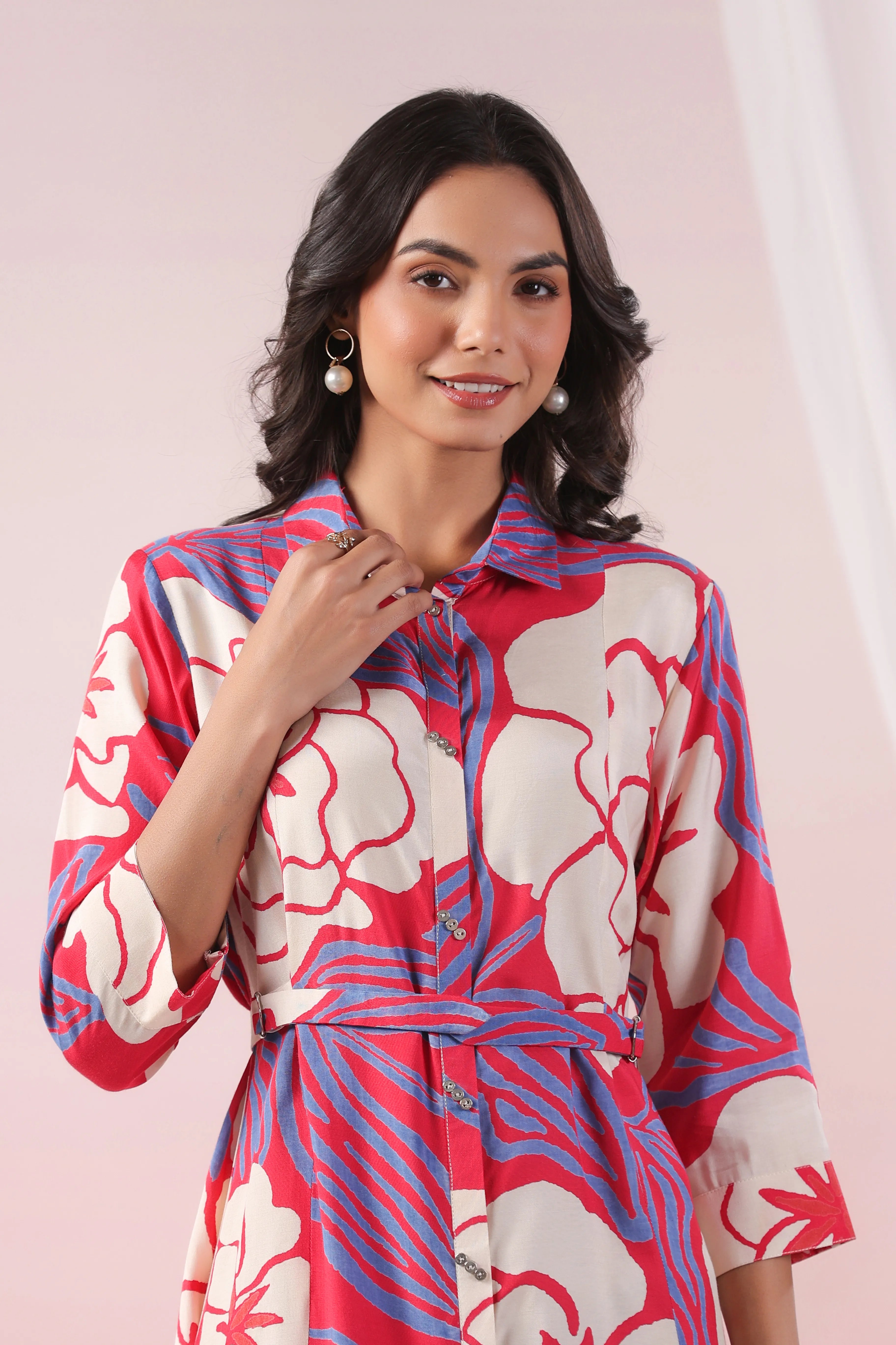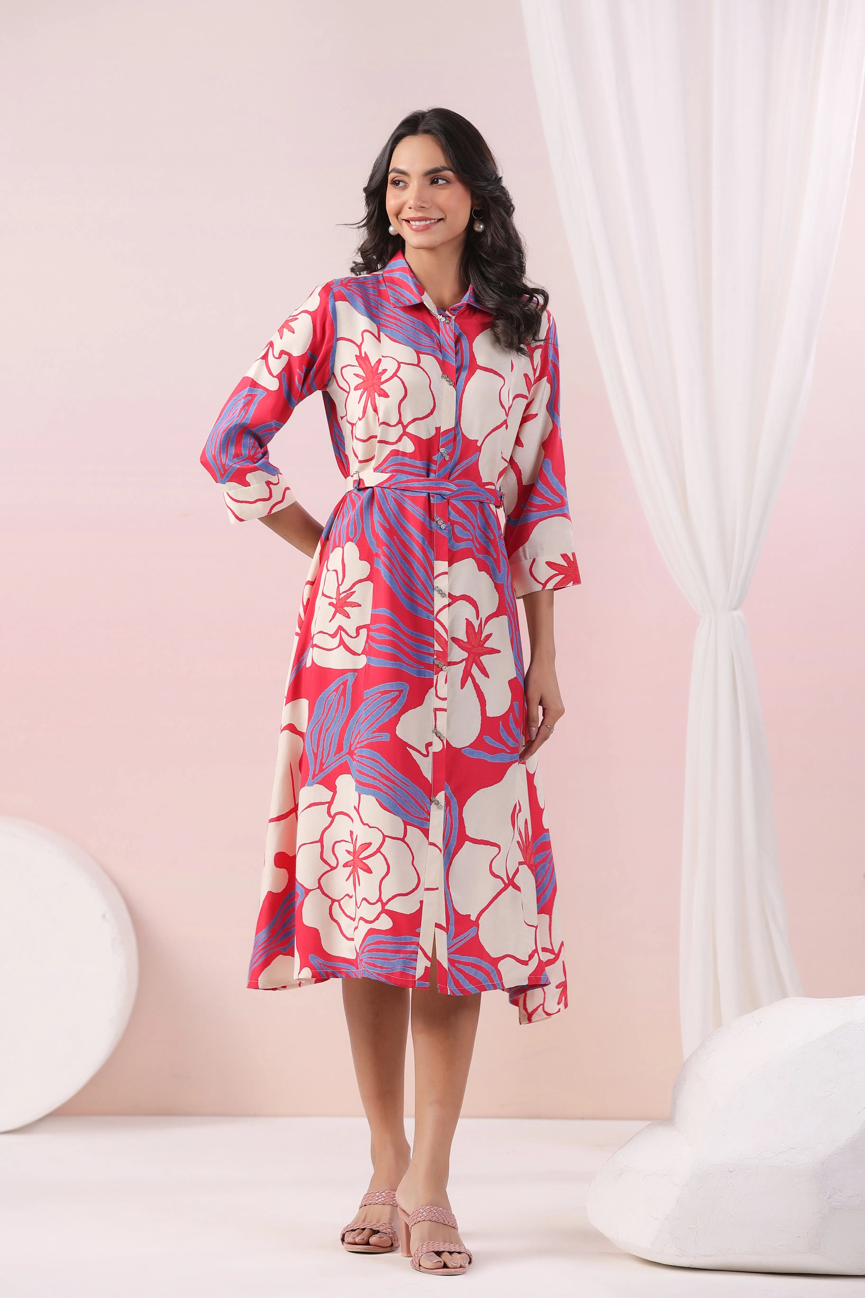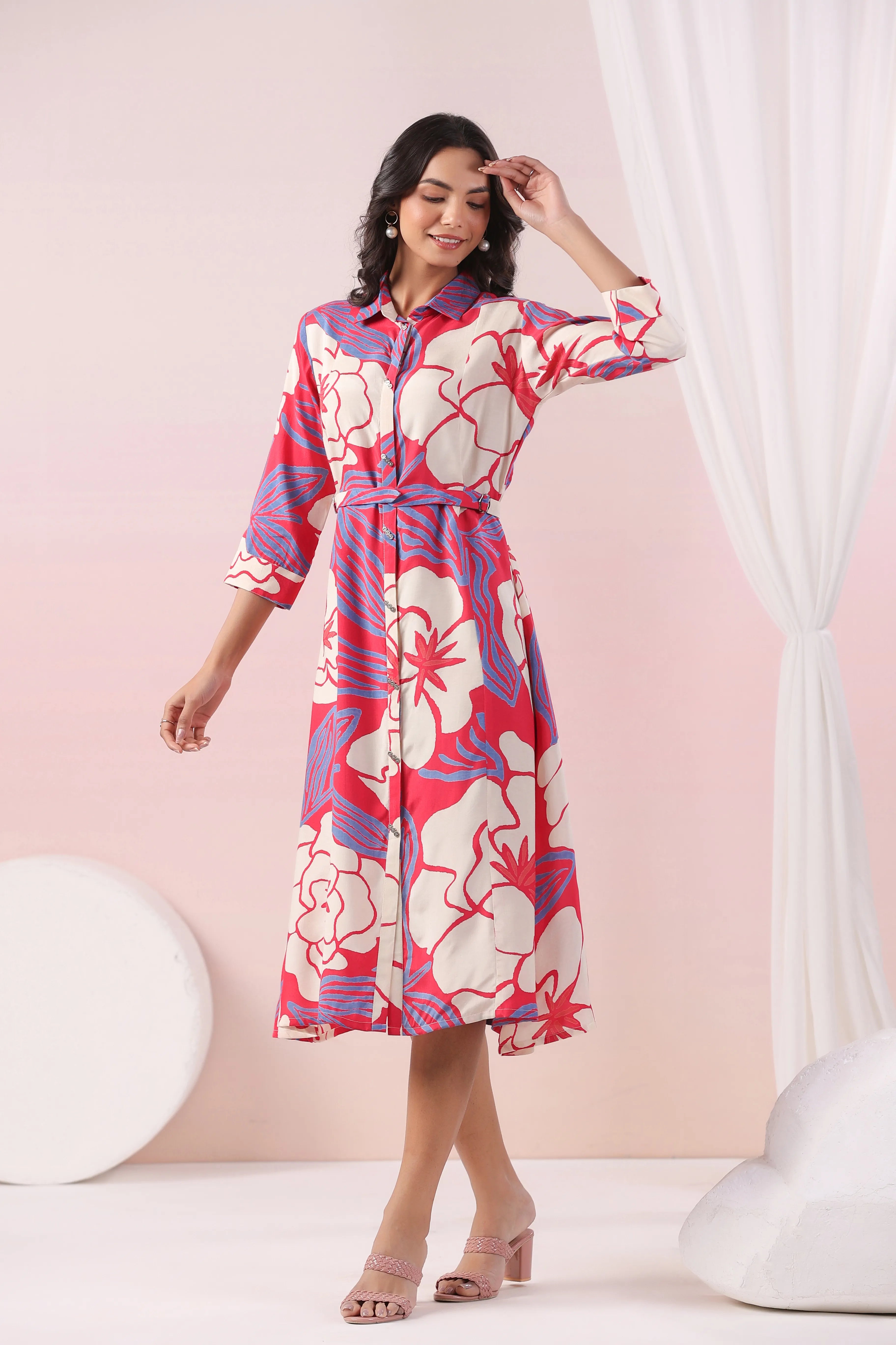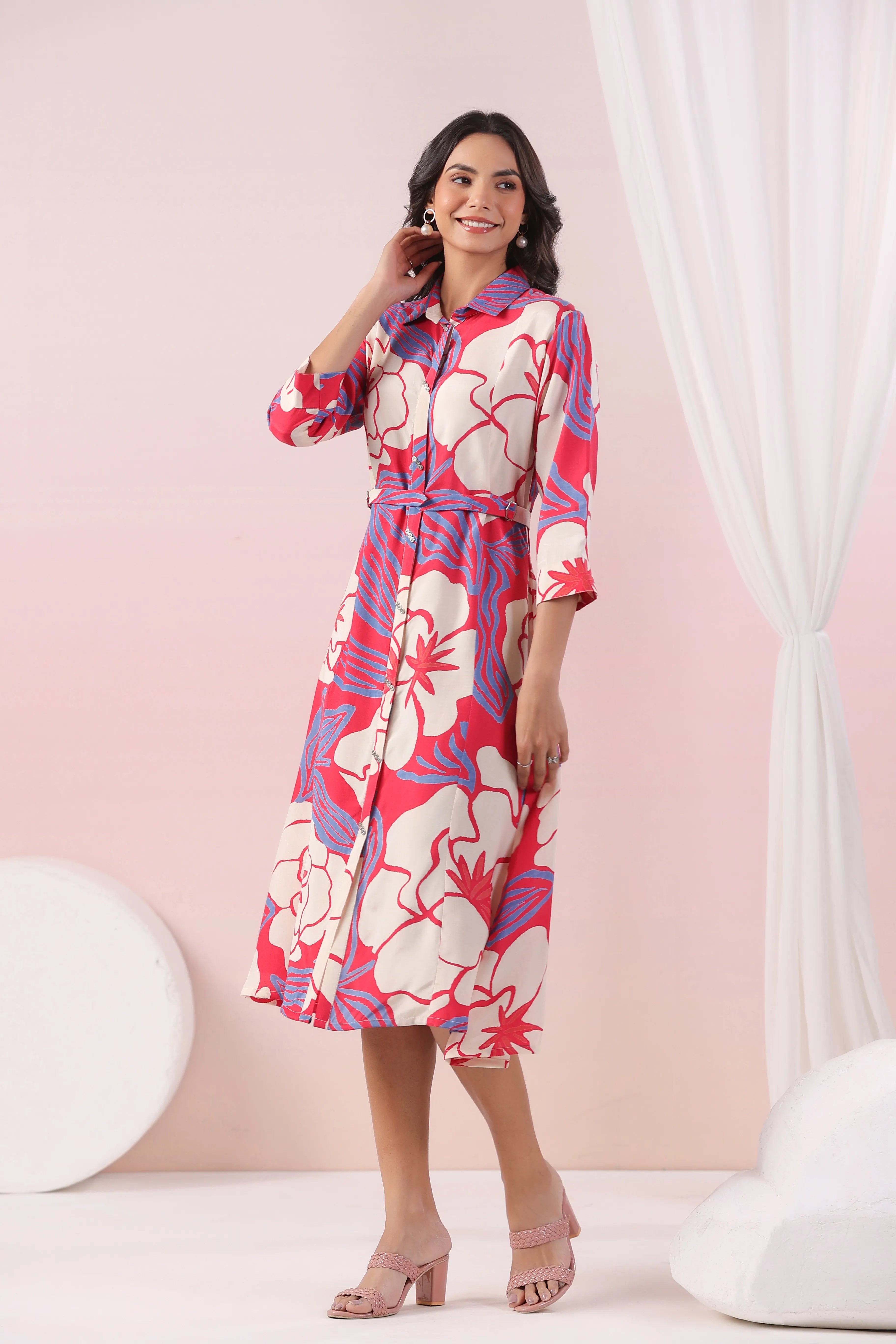 Turn heads with this stunning multi-colored midi dress, adorned with bold abstract floral motifs. Crafted from luxurious Russian silk, it offers a soft and sophisticated drape. Designed with a classic round neckline, 3/4th sleeves, and a stylish tie-back detail, this dress ensures a flattering and adjustable fit. The shell button front adds a touch of modern elegance, making it perfect for casual outings or semi-formal events.