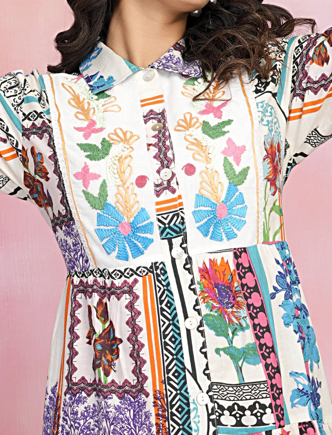 This Multicolor Embroidered Printed Cotton Midi Dress is a delightful blend of vibrant colors and intricate detailing. Featuring a stunning multi-color floral print, complemented by delicate embroidery and lace accents, this dress exudes charm and elegance. Crafted from soft cotton cambric, it ensures comfort while maintaining a stylish silhouette. The playful fake shell buttons and 3/4th sleeves complete the look, making it ideal for casual outings or semi-formal occasions.