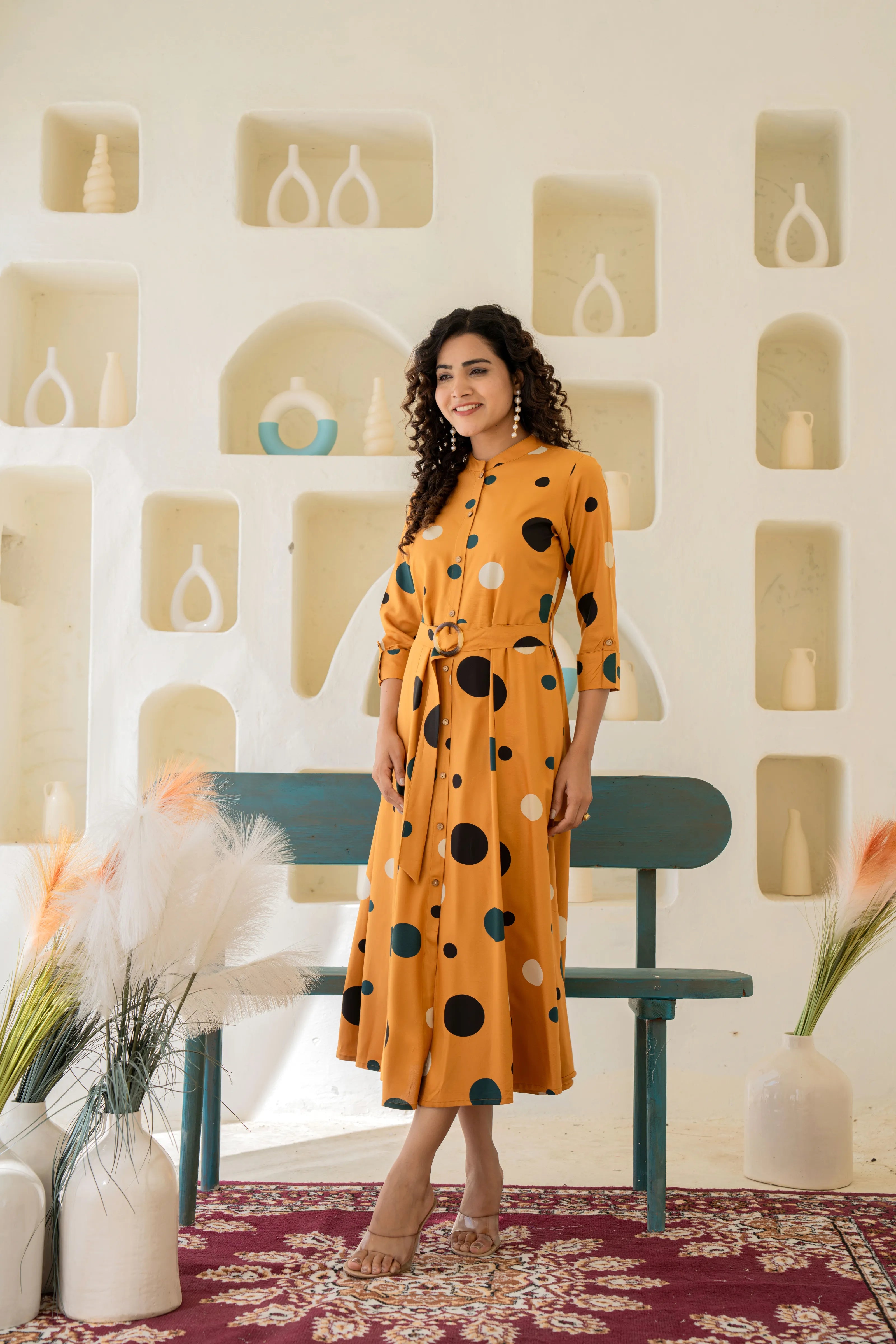 Retro Bloom: Mustard Polka Dot Belted Midi Dress in Viscose