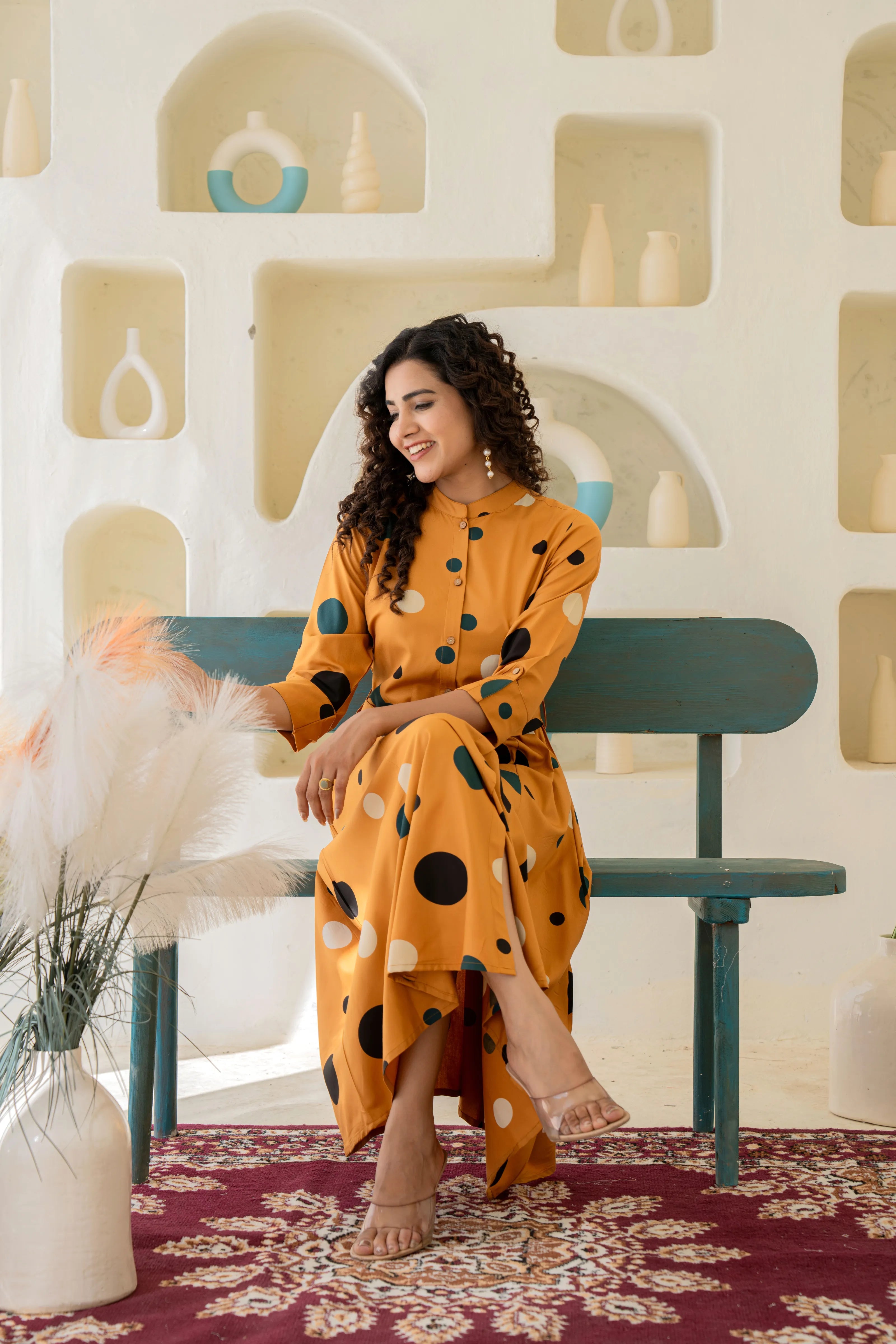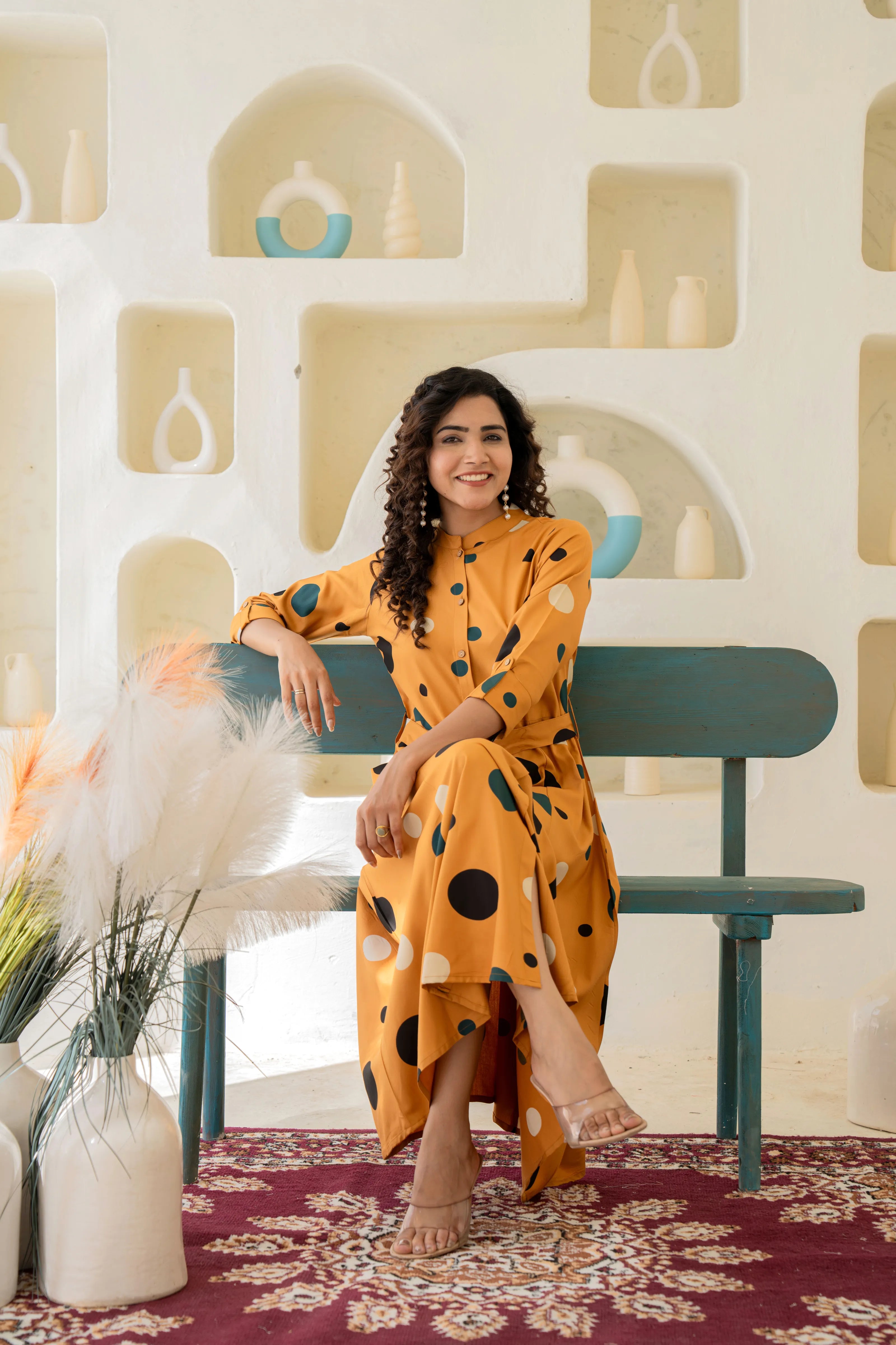 Bring retro flair into modern day with our Retro Bloom midi dress in vibrant mustard yellow. With its playful polka dots in contrasting white and dark green, this statement piece delivers cheerful charm and a flattering silhouette.