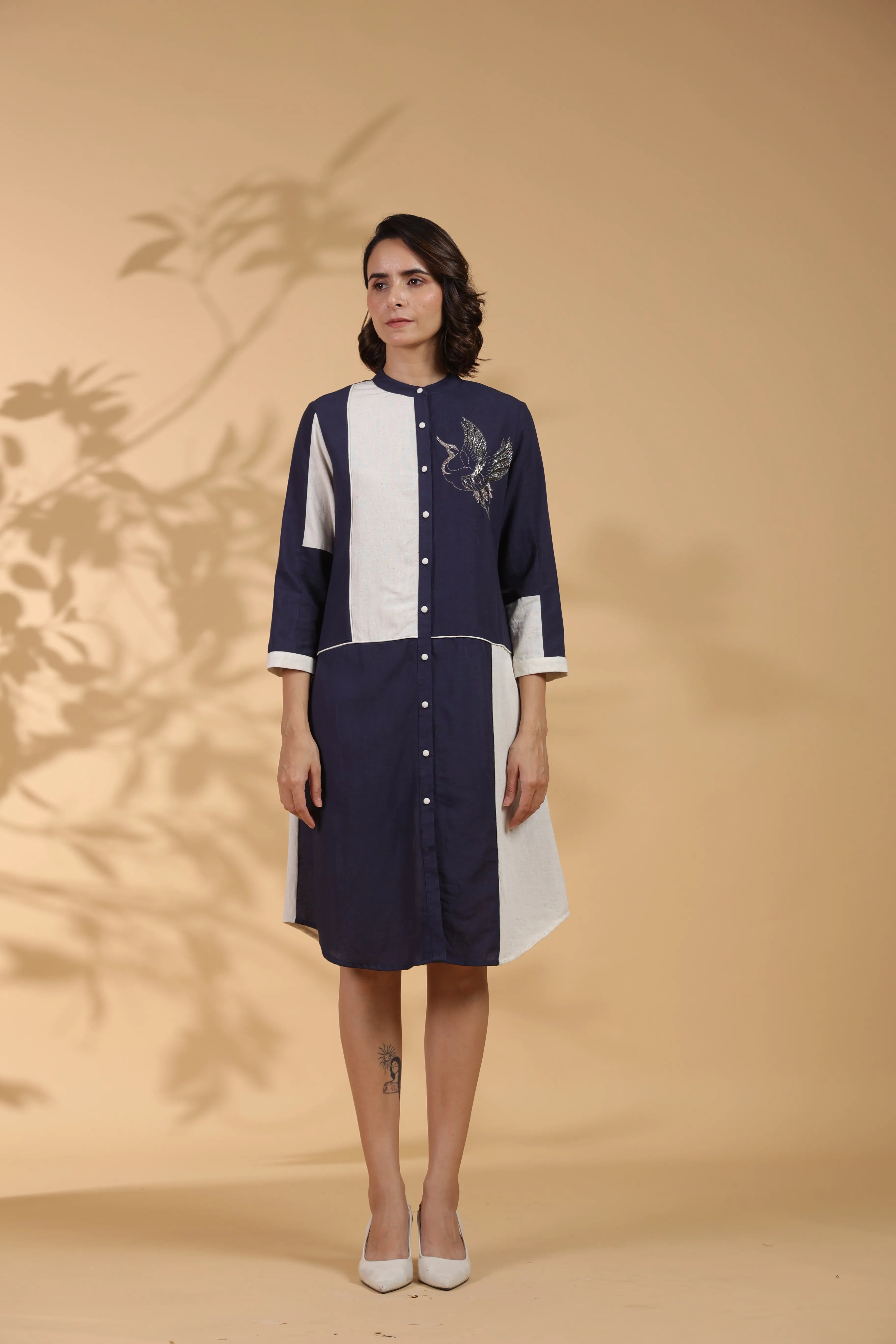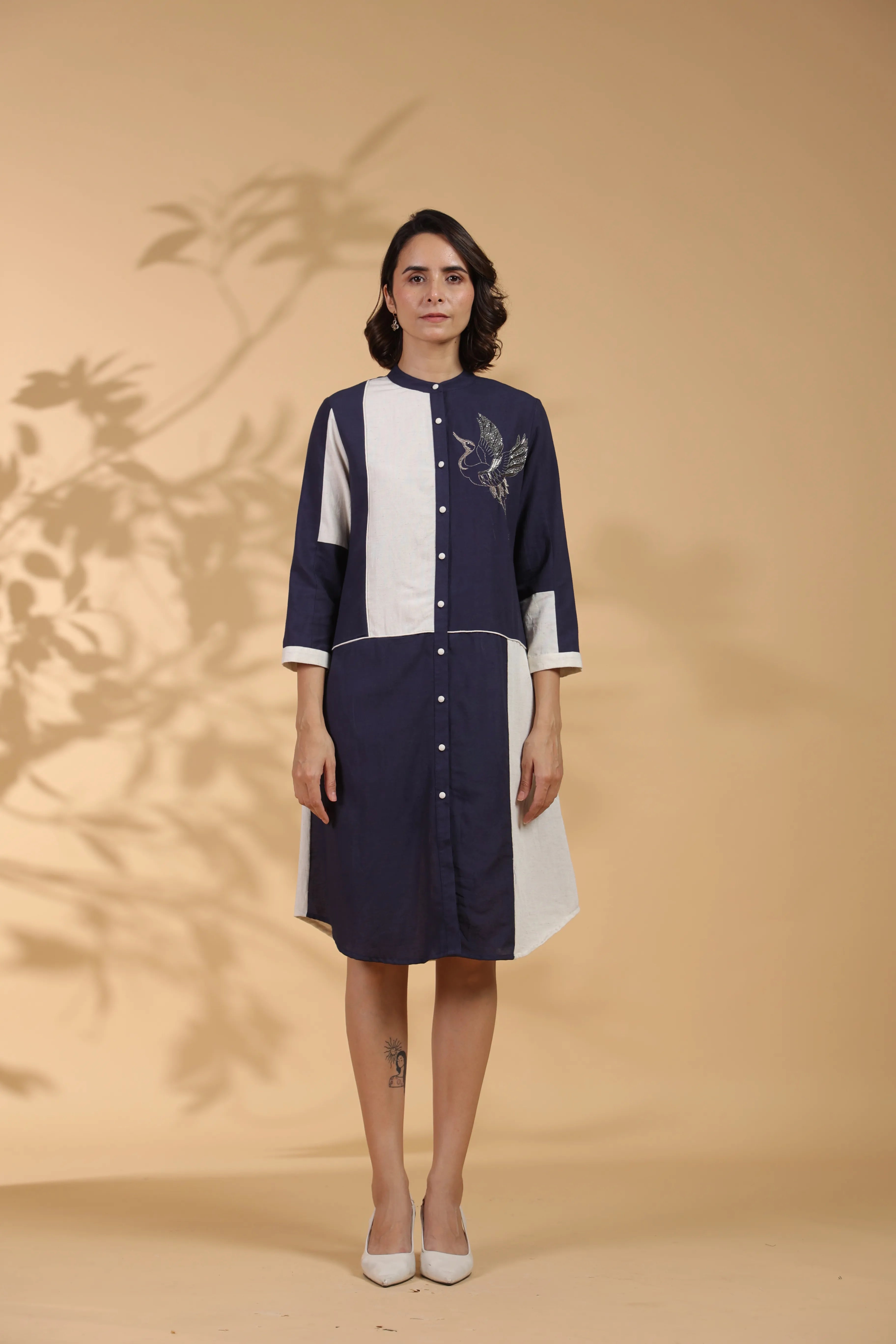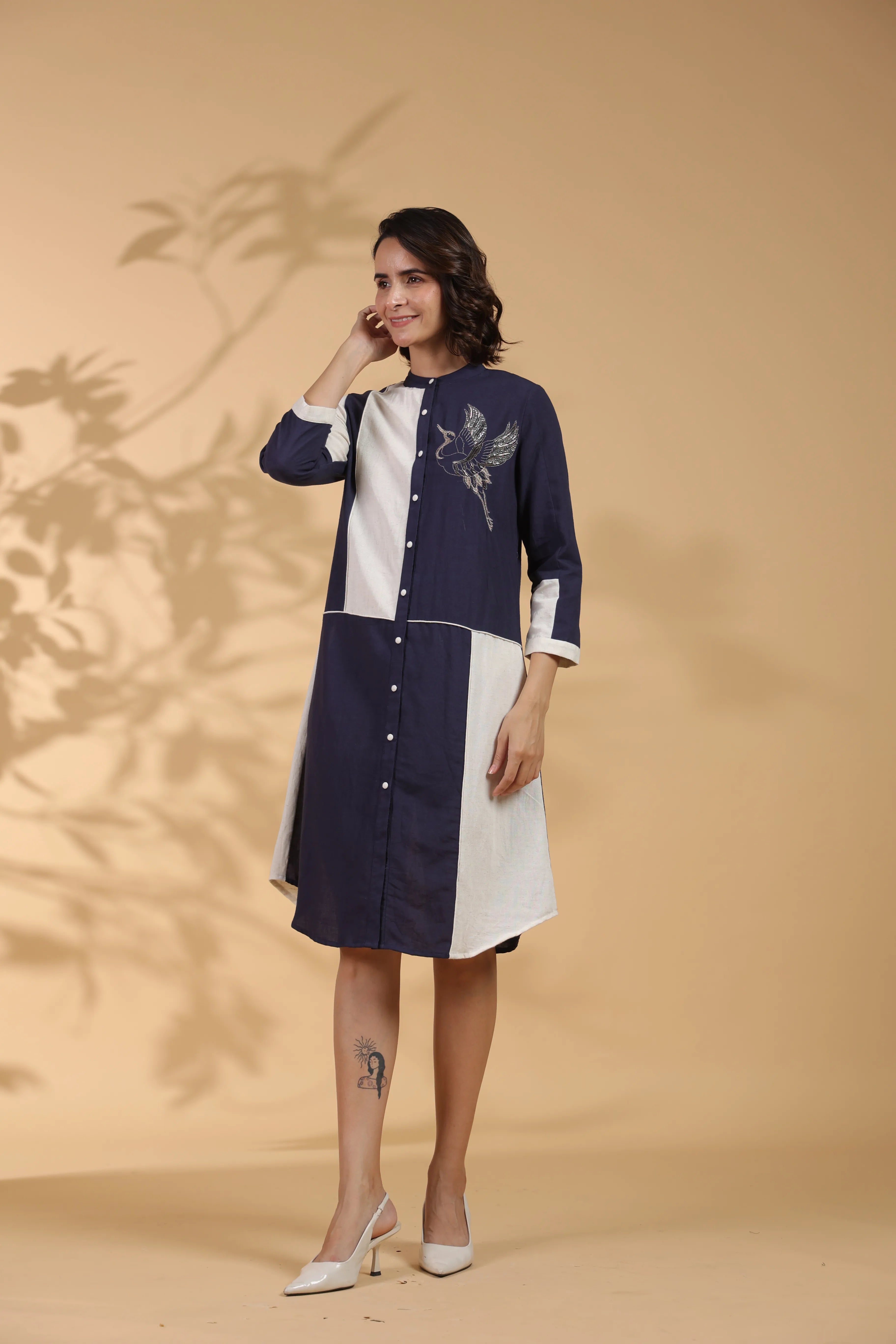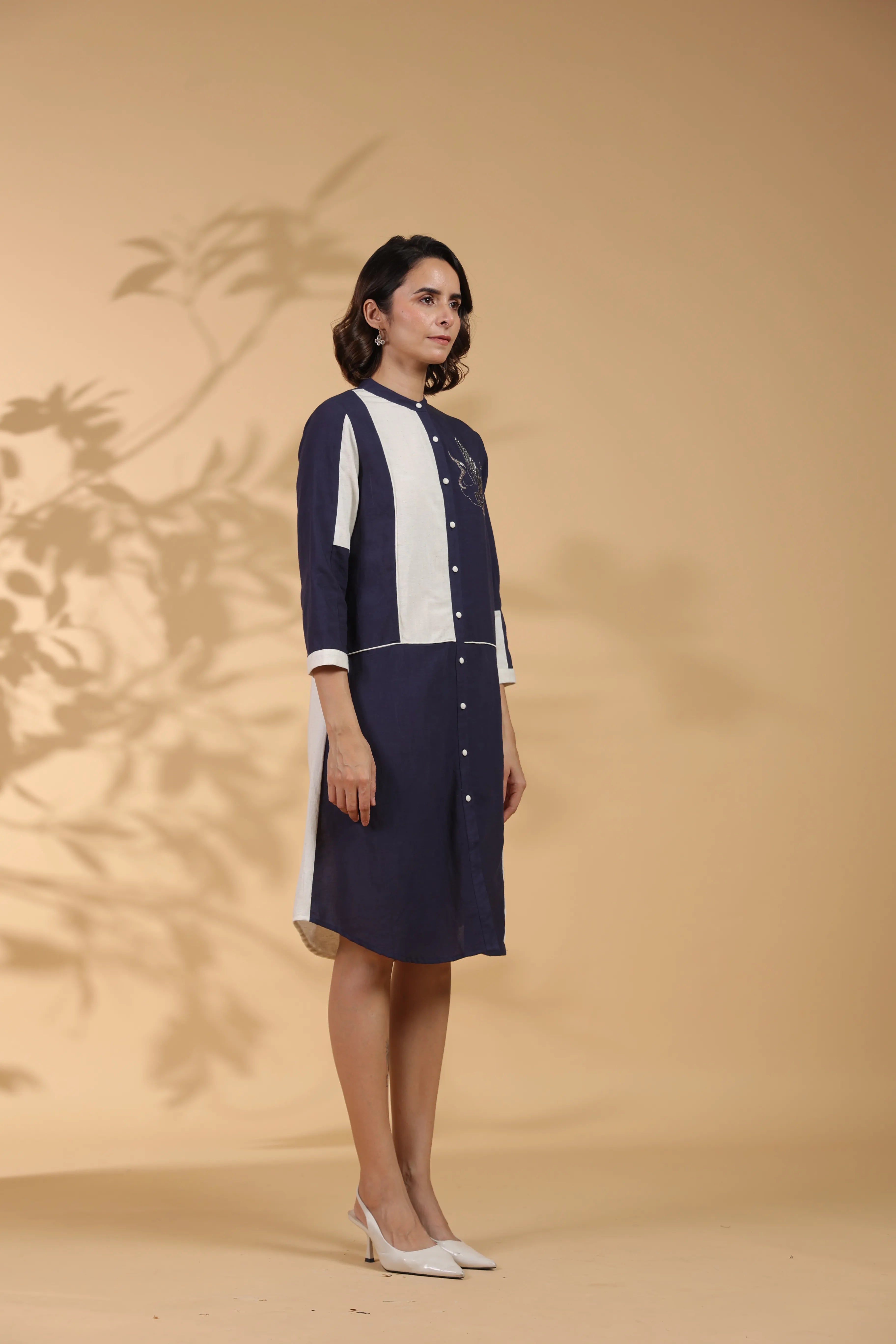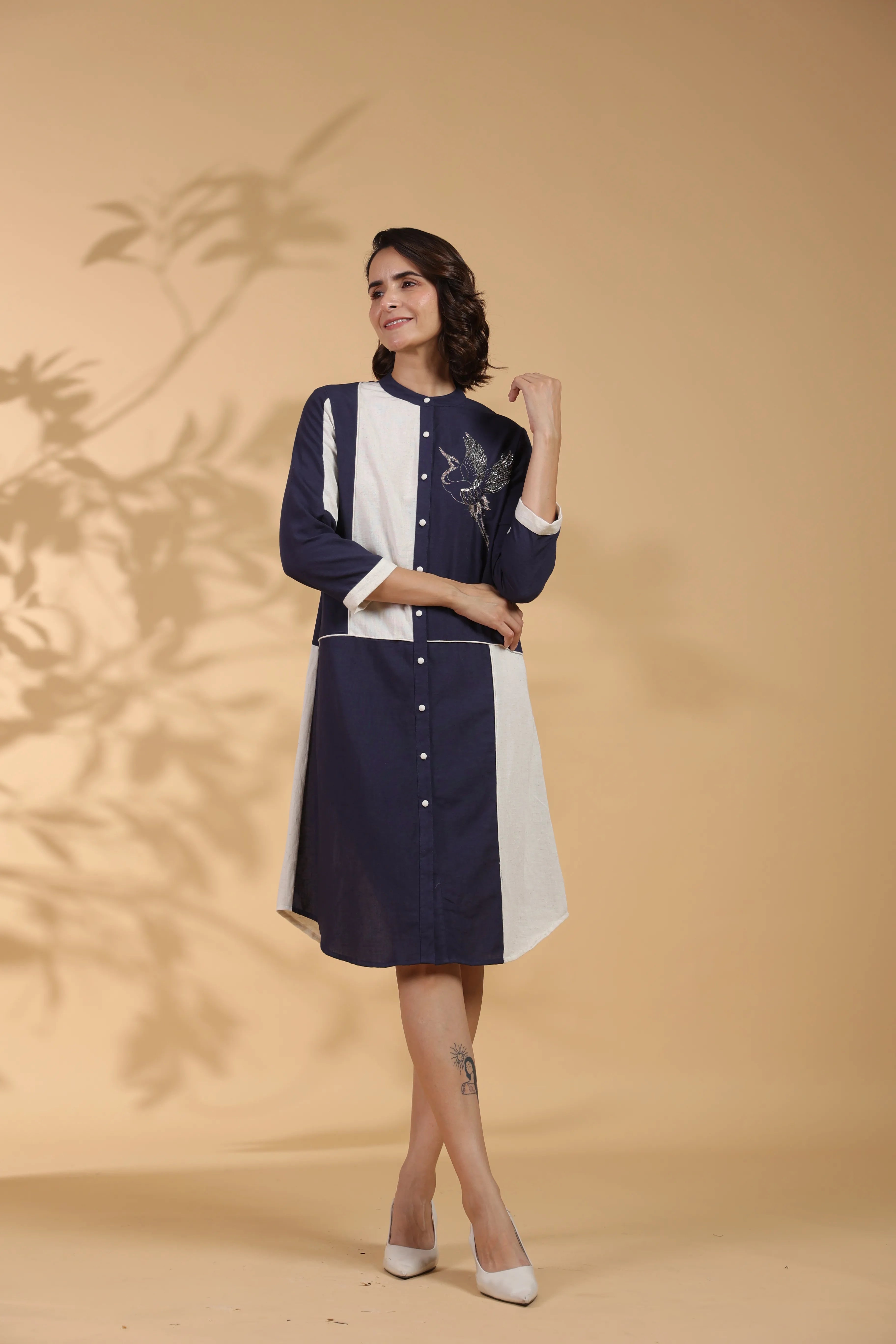 This Navy Blue & White Cotton Bird Motif Embroidered Rayon Dress is perfect for adding a refined touch to your wardrobe, offering timeless style with an artistic embroidery detail.