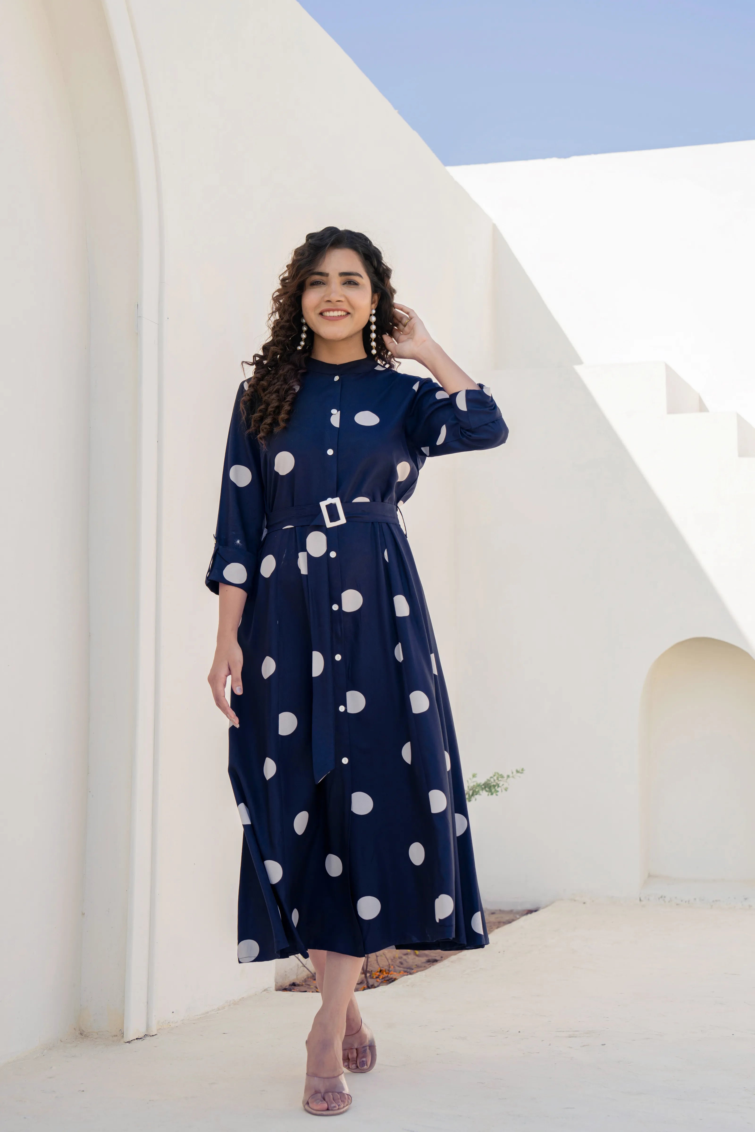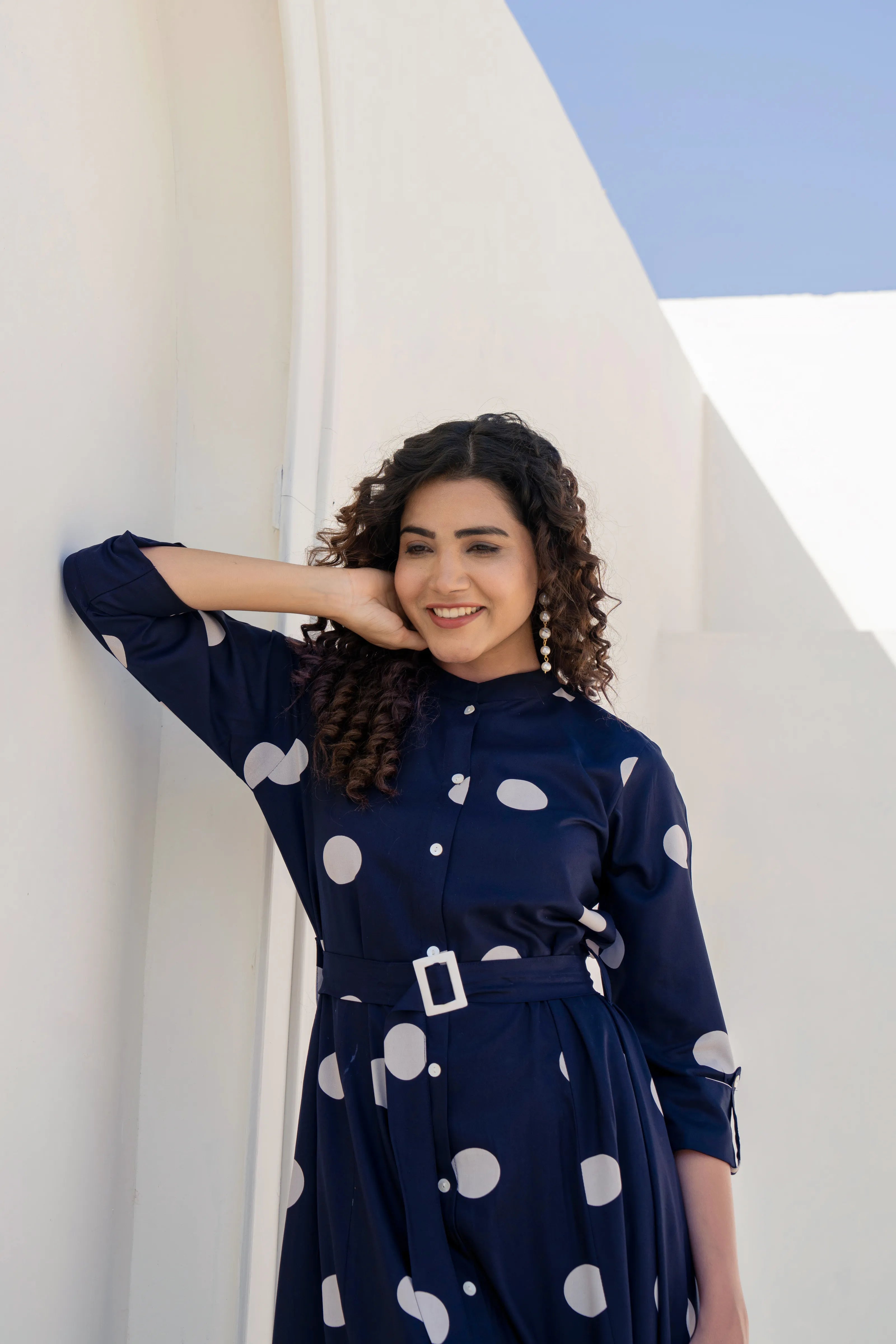 Playful Chic: Navy Polka Dot Belted Midi Dress in Viscose