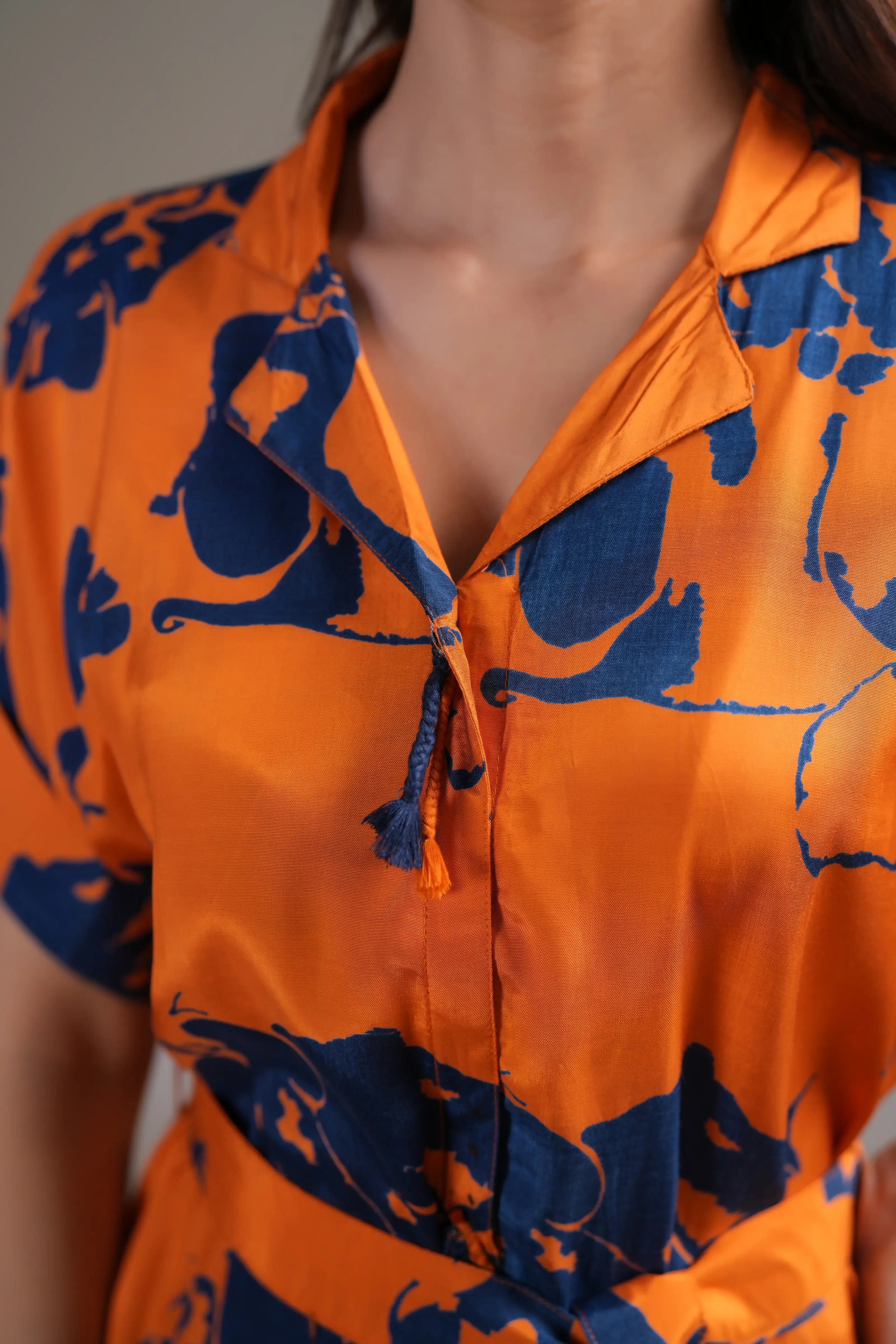 - Neckline: Notch Collar with Tie-Front Tassel Detailing