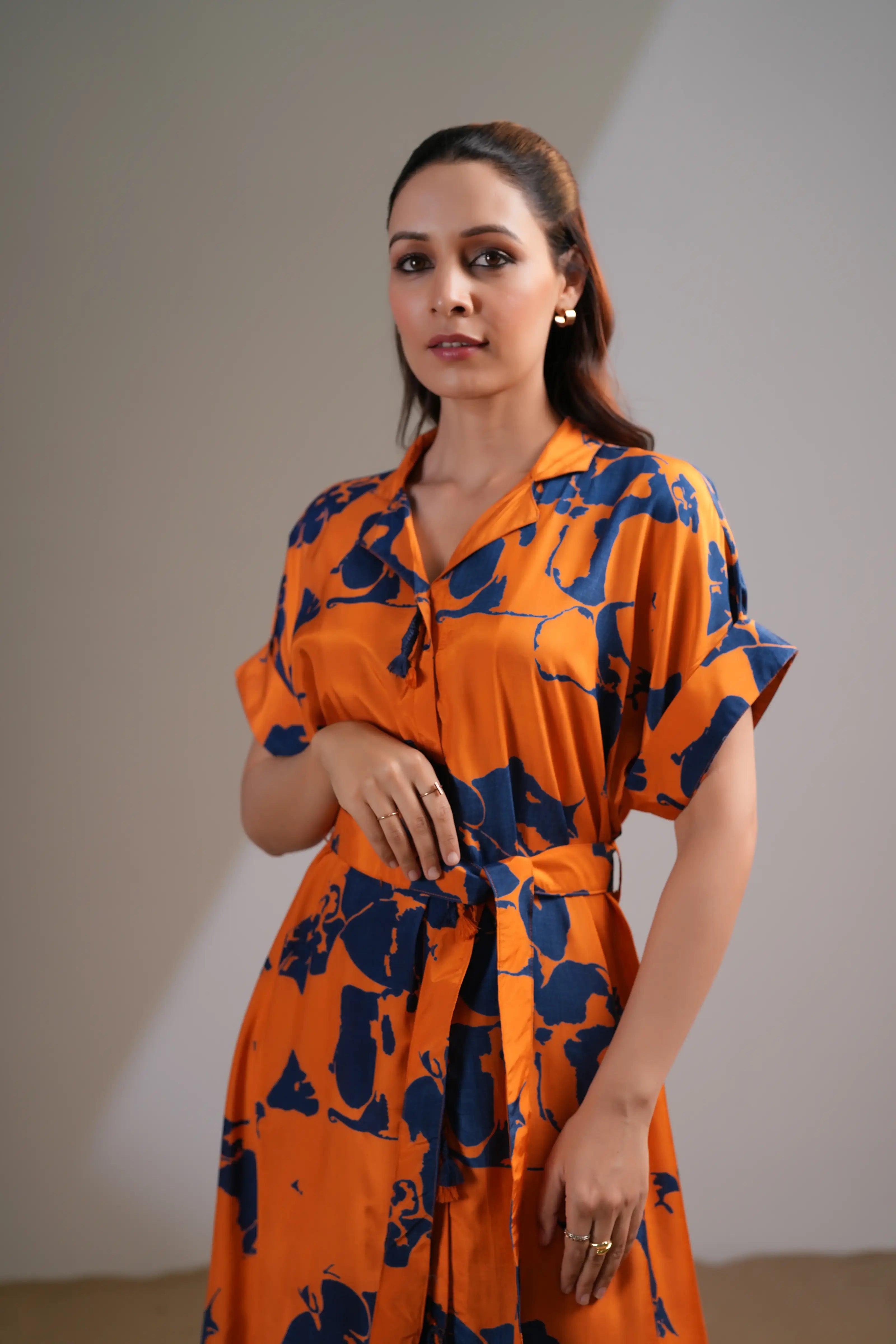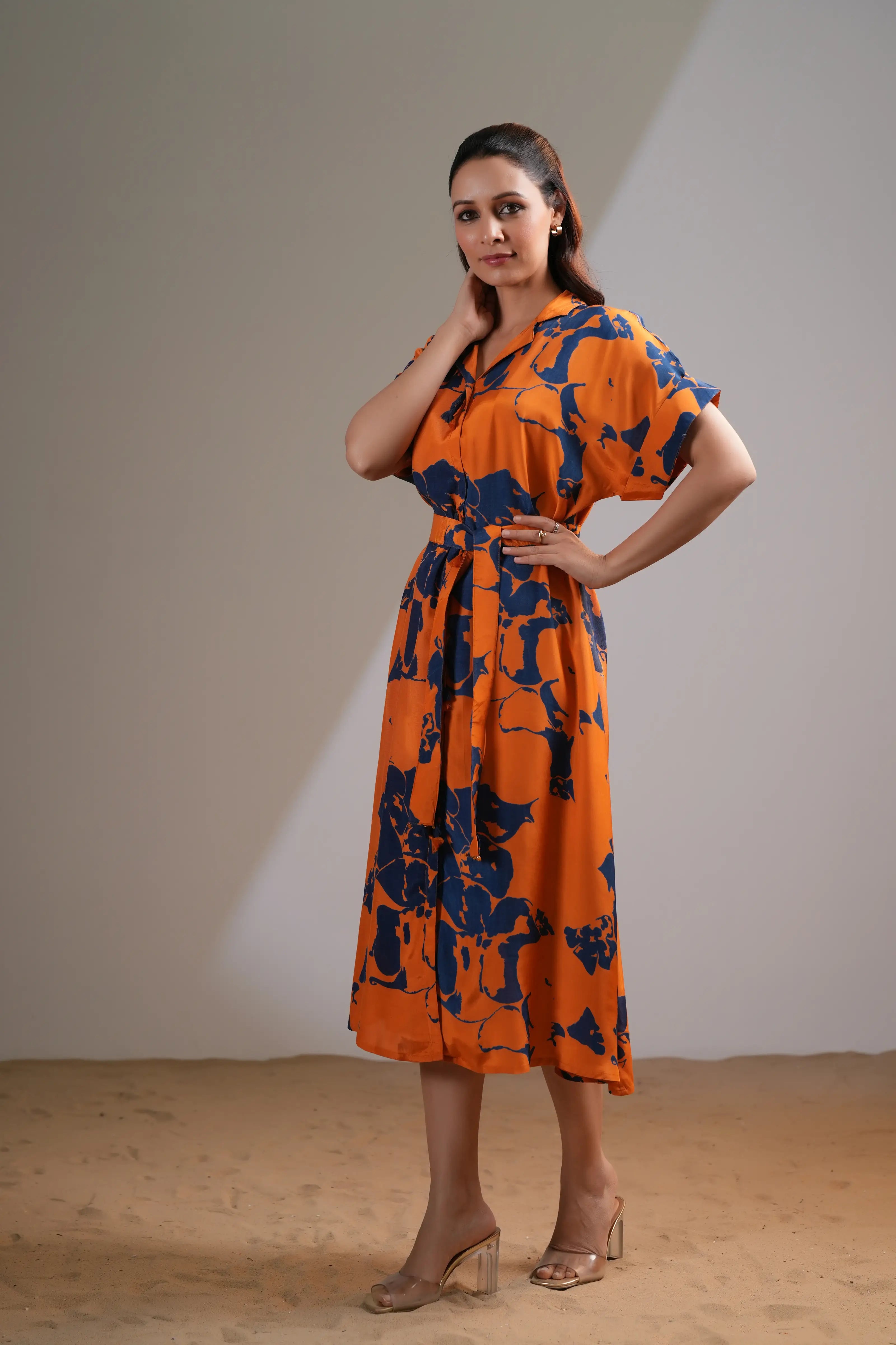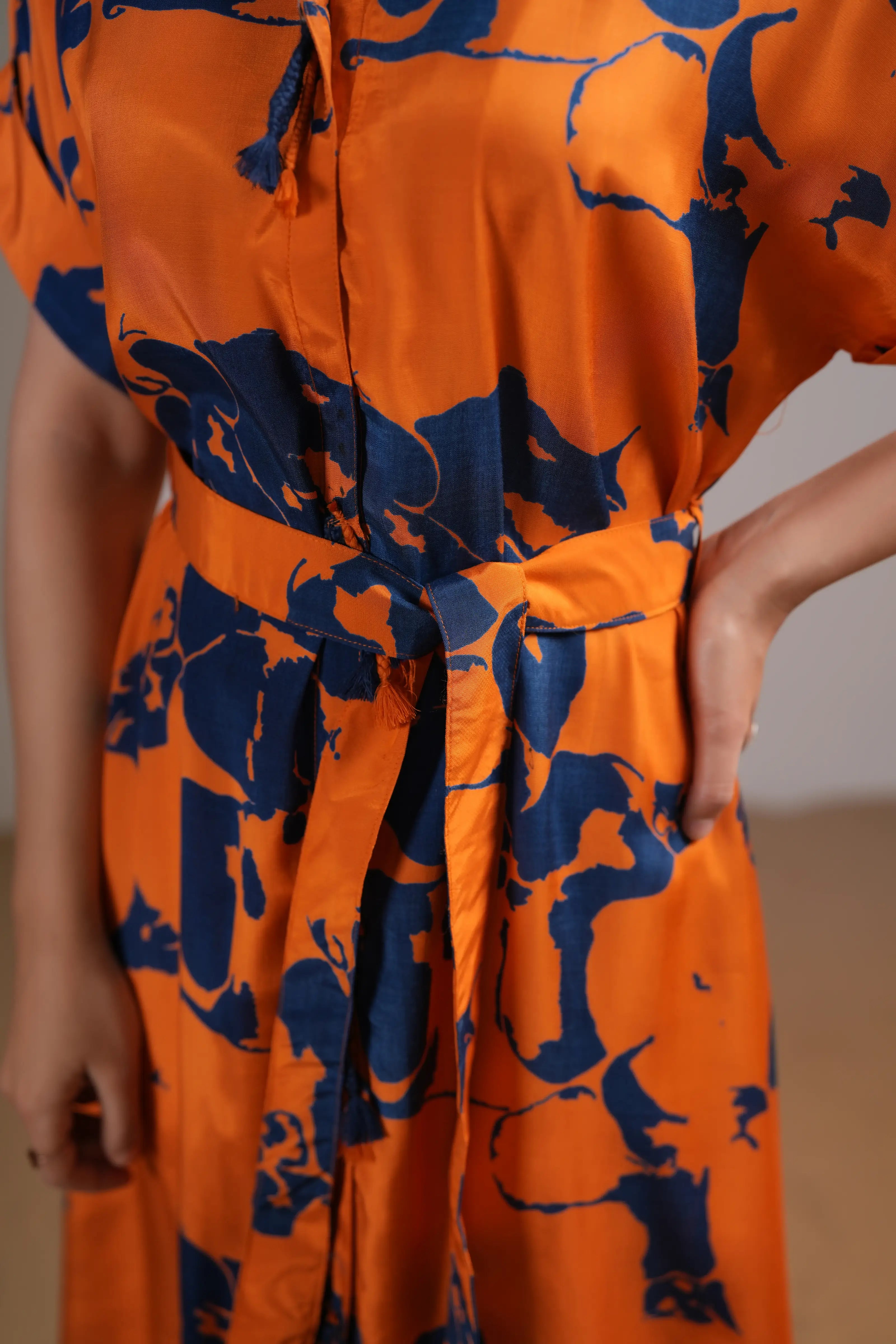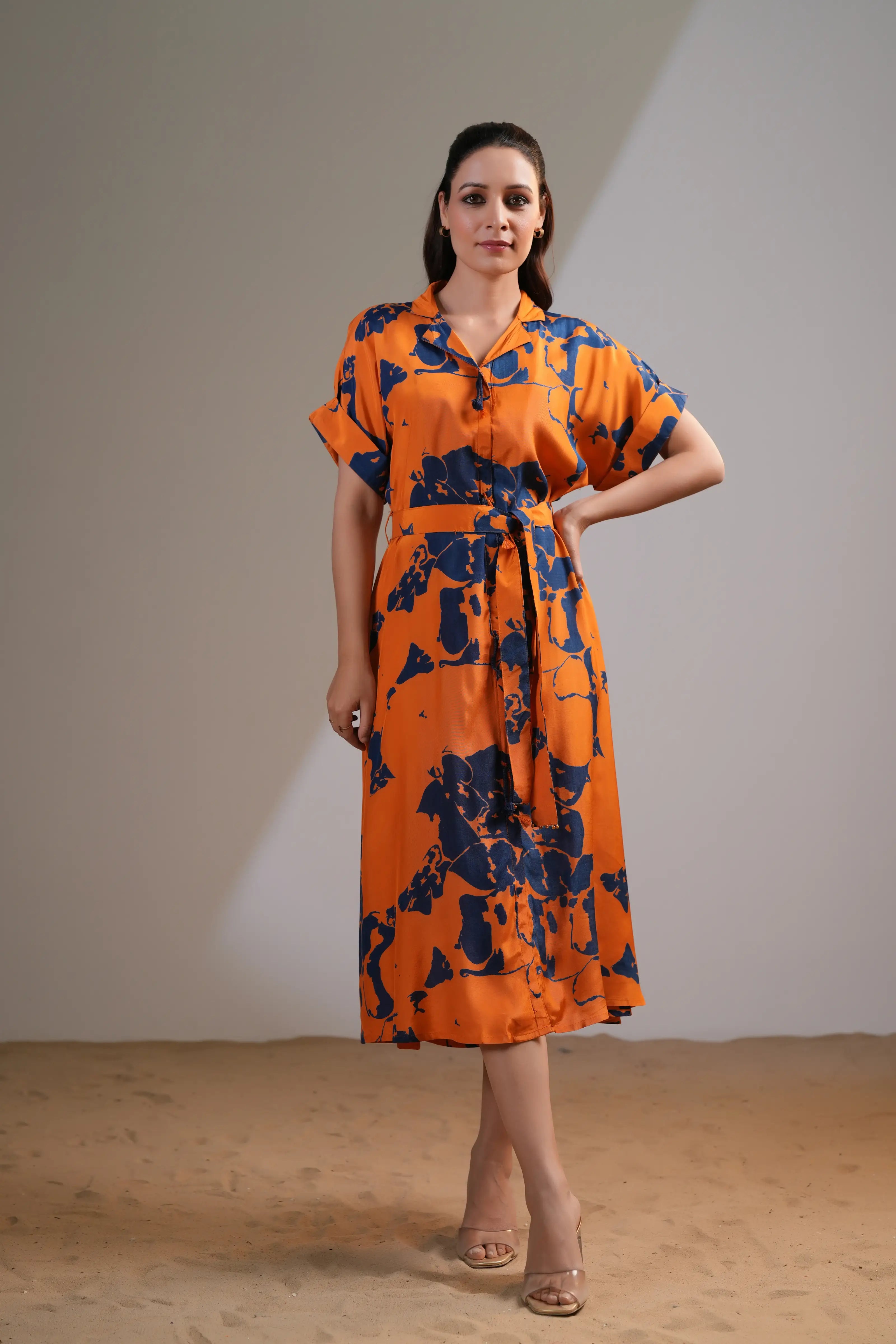 Add a touch of bold elegance to your wardrobe with this Orange & Navy Blue Abstract Floral Midi Dress. Designed in luxurious Russian silk, this dress features a vibrant floral print that makes a striking statement.