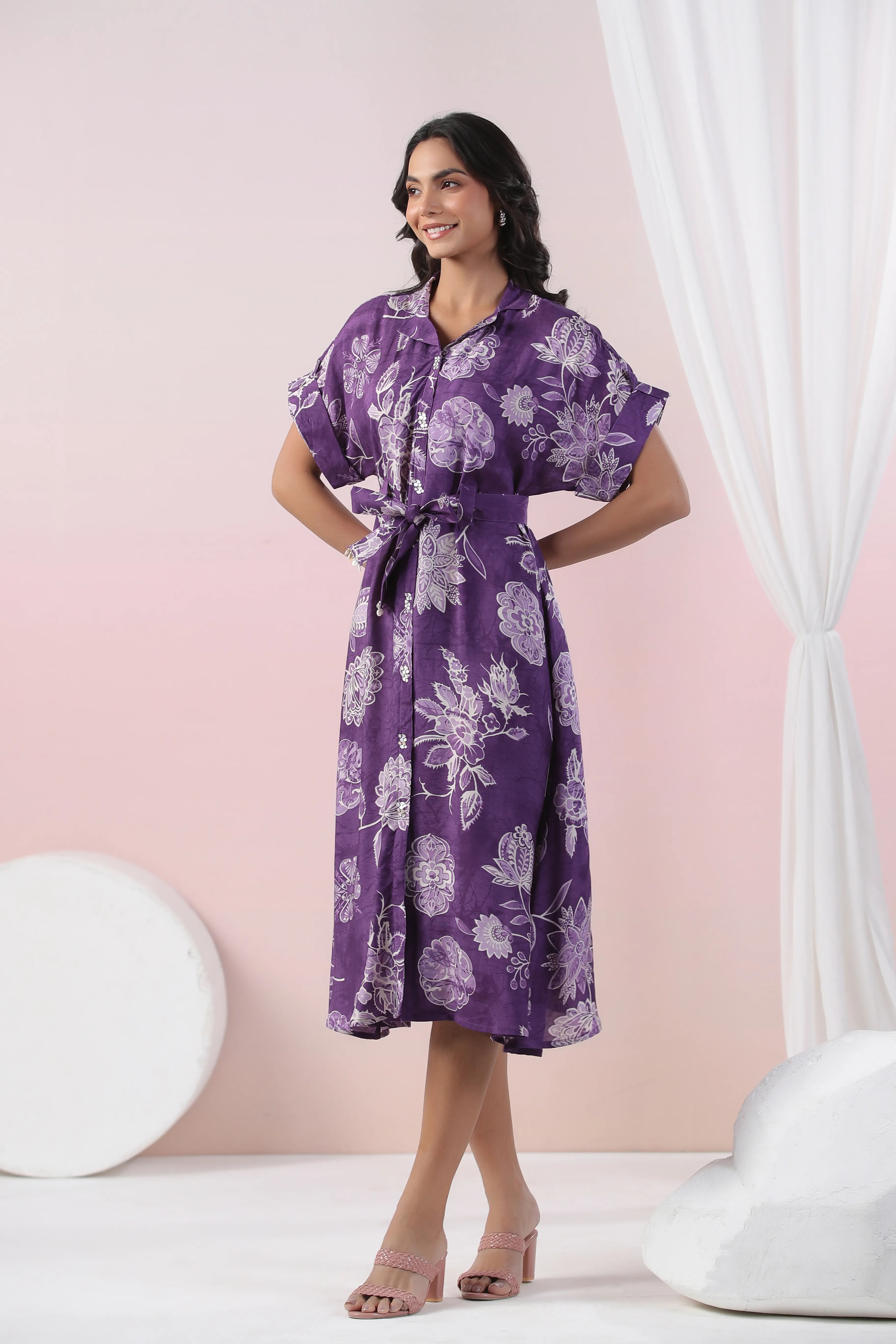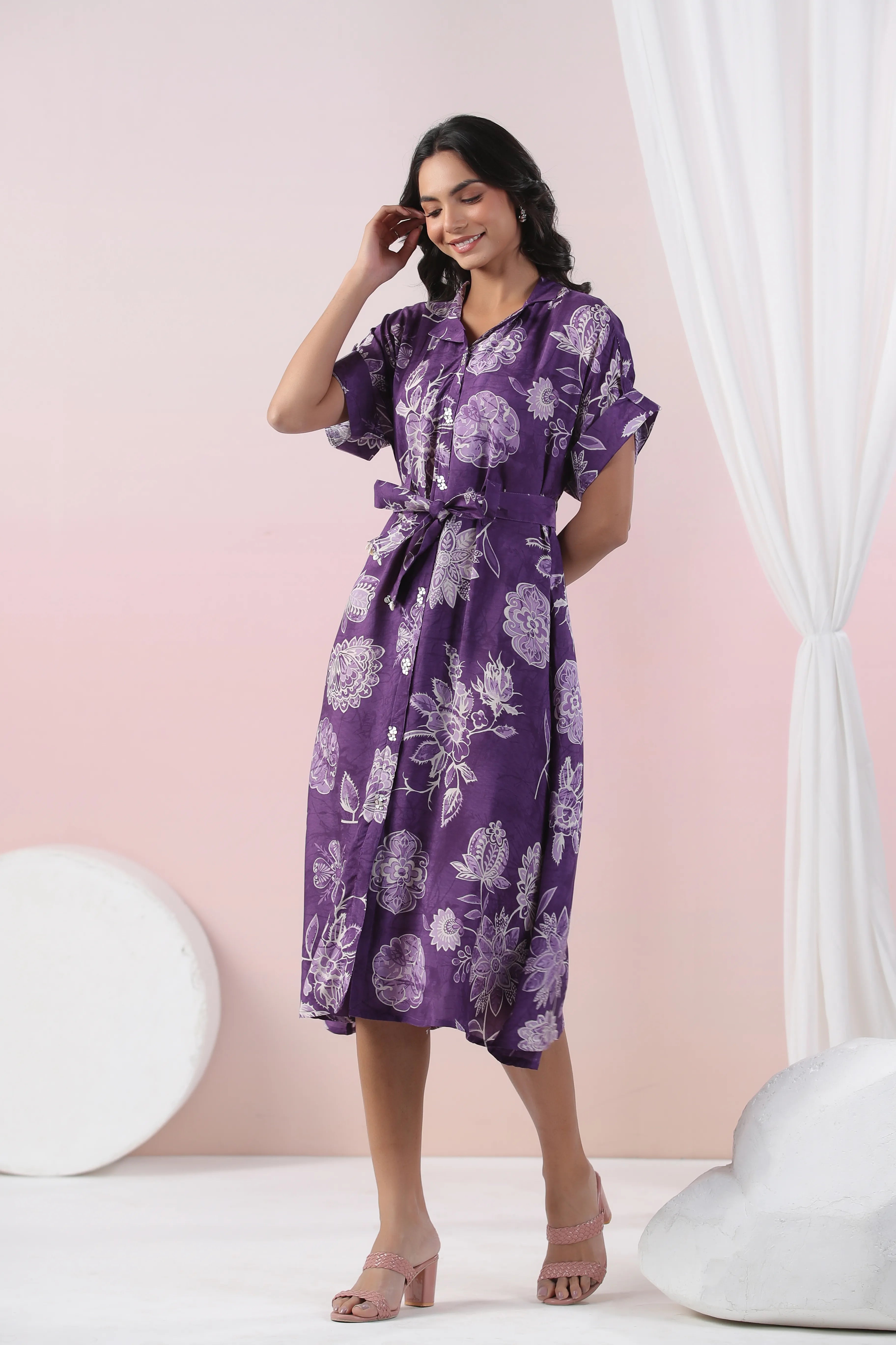 Turn heads with this stunning purple midi dress, adorned with bold abstract floral motifs. Crafted from luxurious Russian silk, it features a sophisticated notch collar, 3/4th sleeves, and a stylish tie-front for a flattering, adjustable fit. The shell button front detail adds a refined touch to its contemporary silhouette, making it perfect for casual outings or semi-formal occasions.