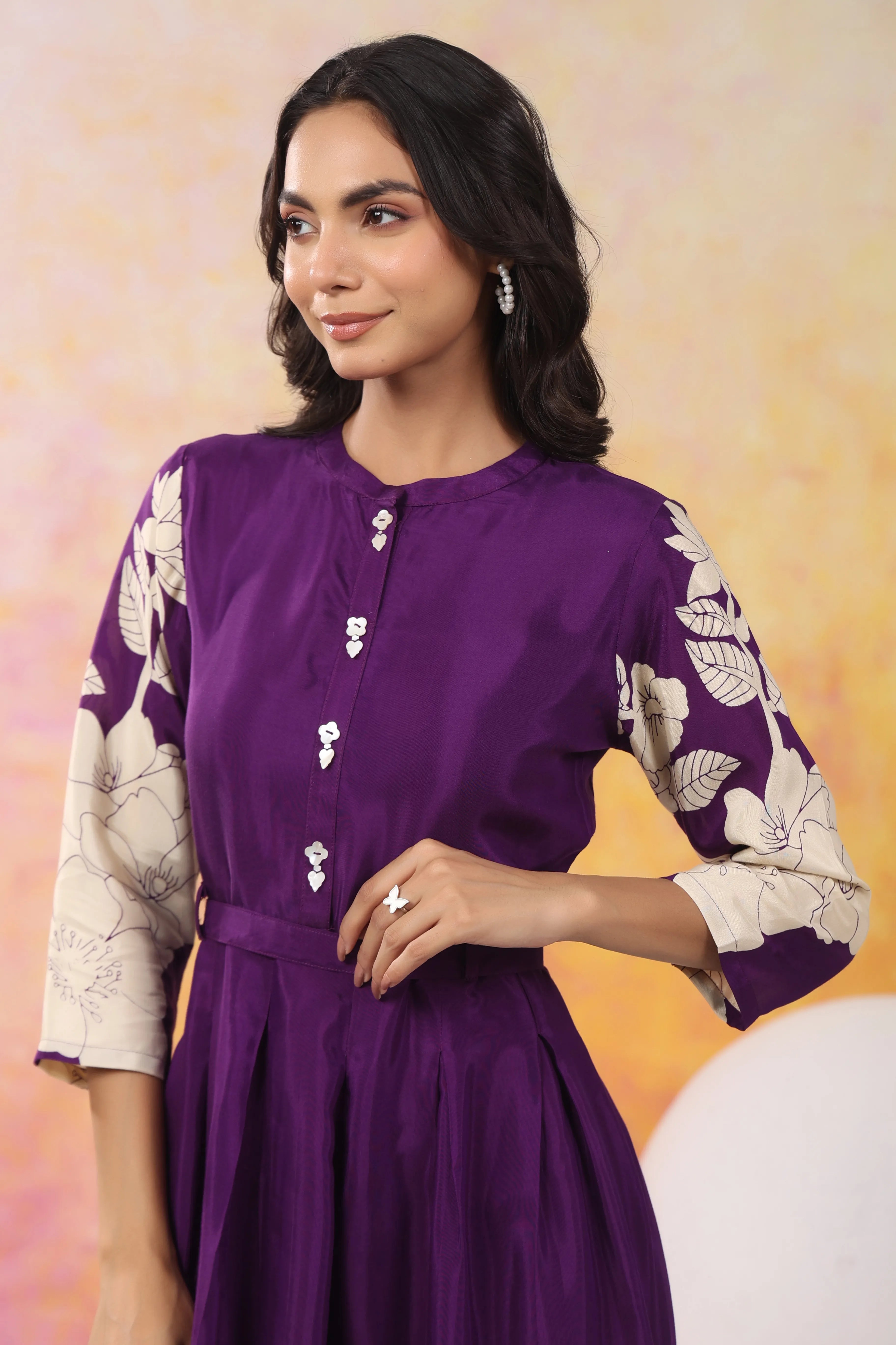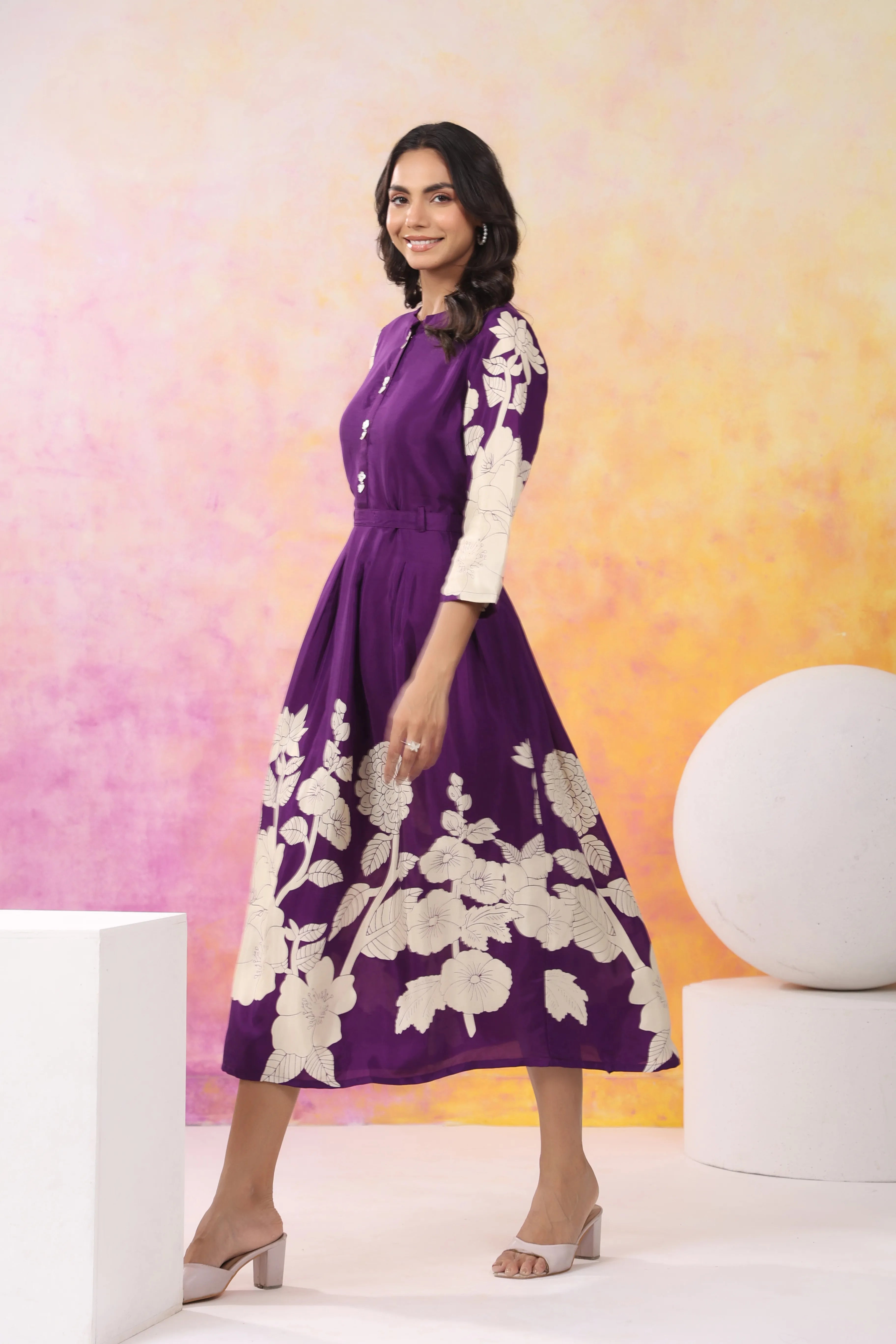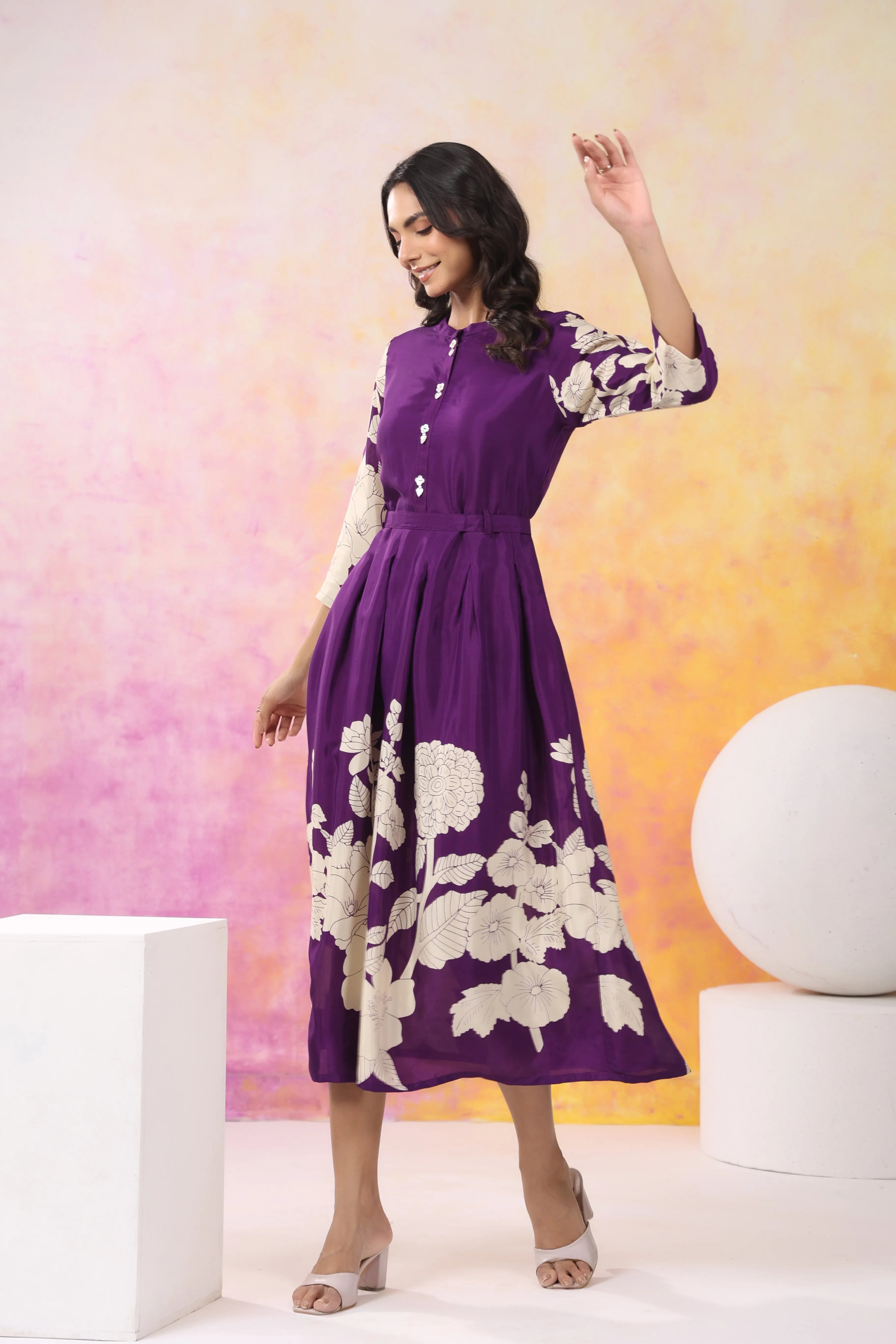 Elevate your style with this exquisite Purple Midi Dress, crafted from luxurious Russian silk for a refined and polished look. Featuring a round neckline and a printed 3/4th sleeves / hem, this dress offers a timeless design with contemporary details. The shell button front and tie-back detail provide a flattering silhouette, making it perfect for any occasion.