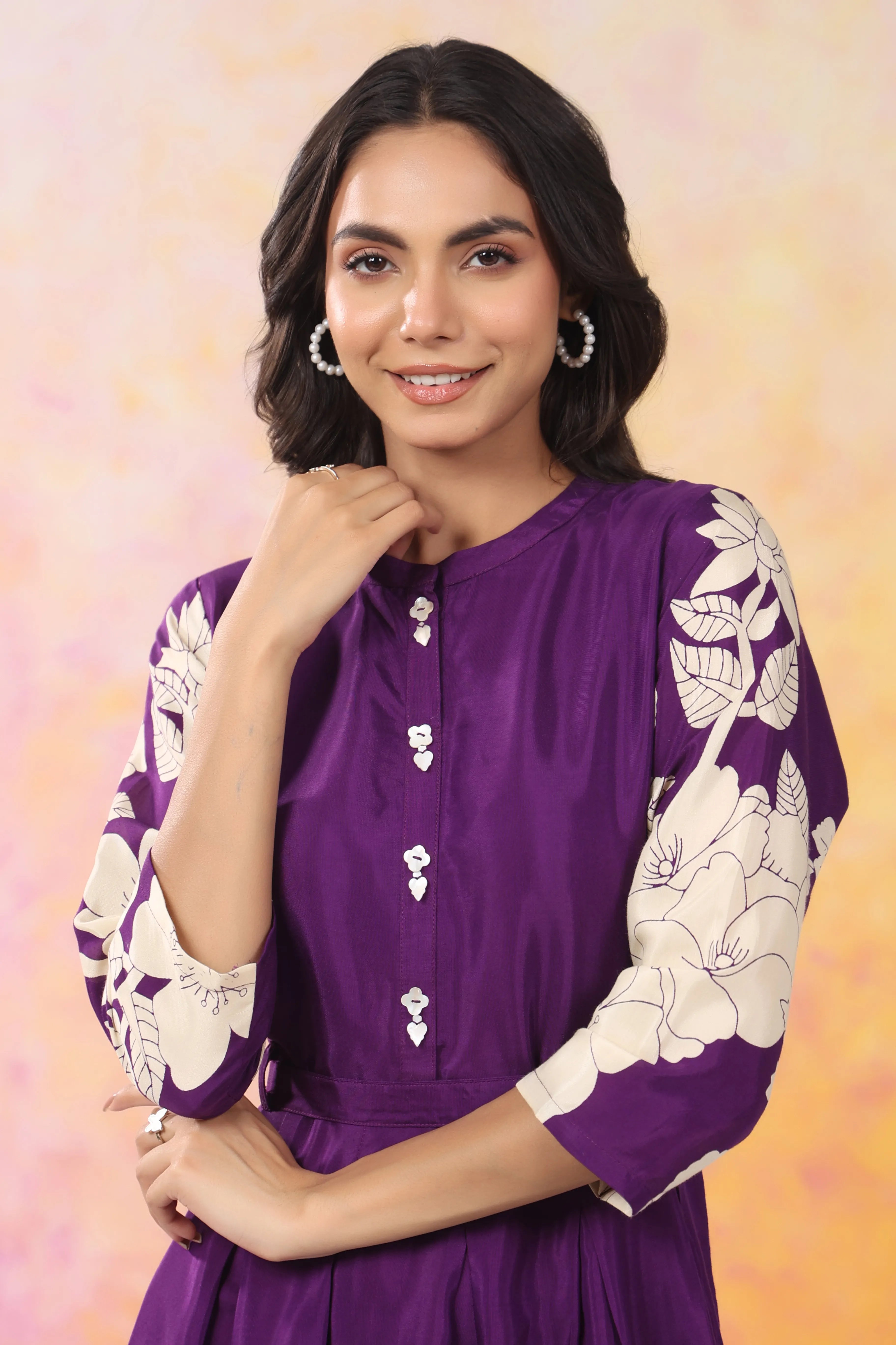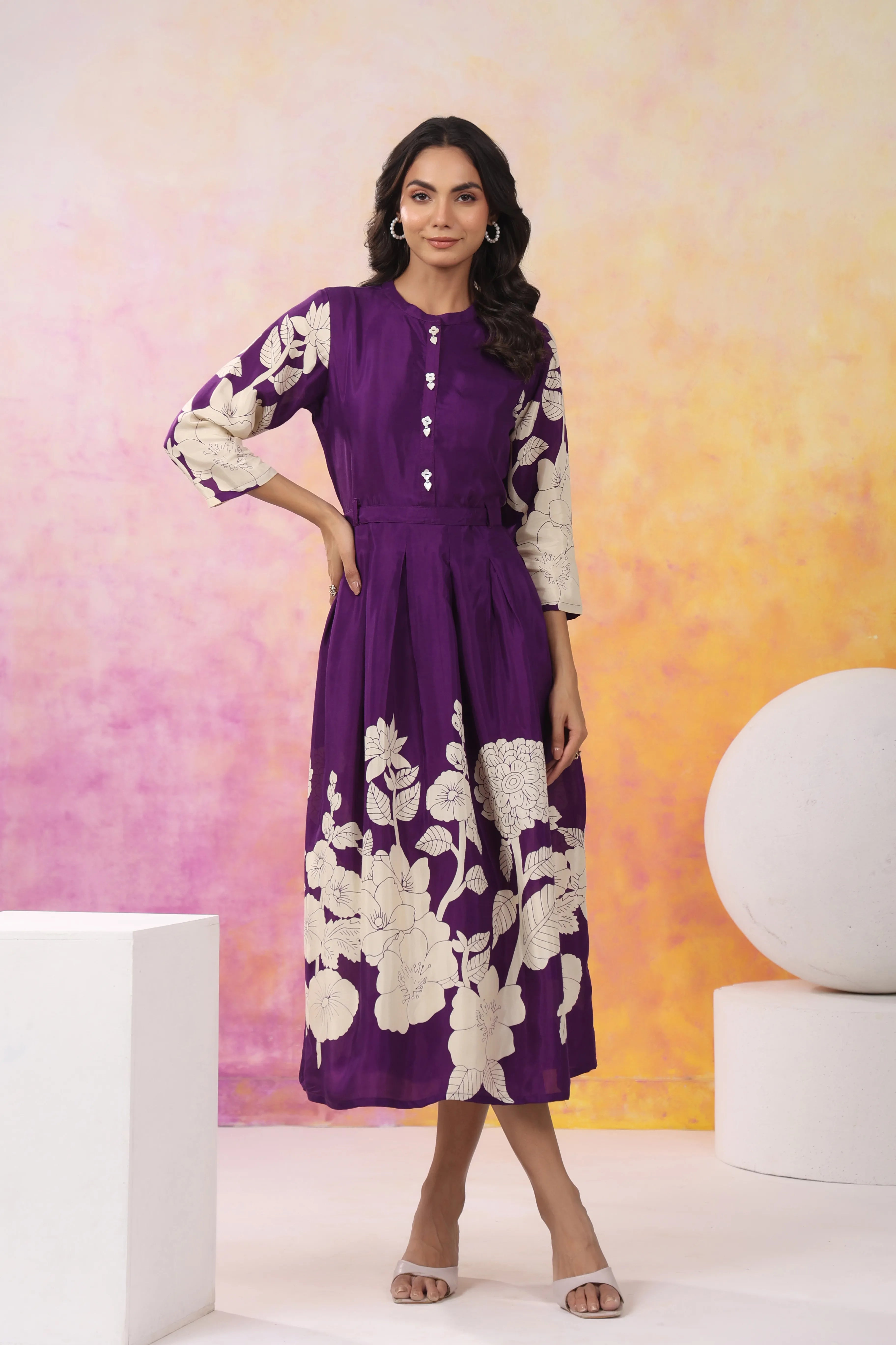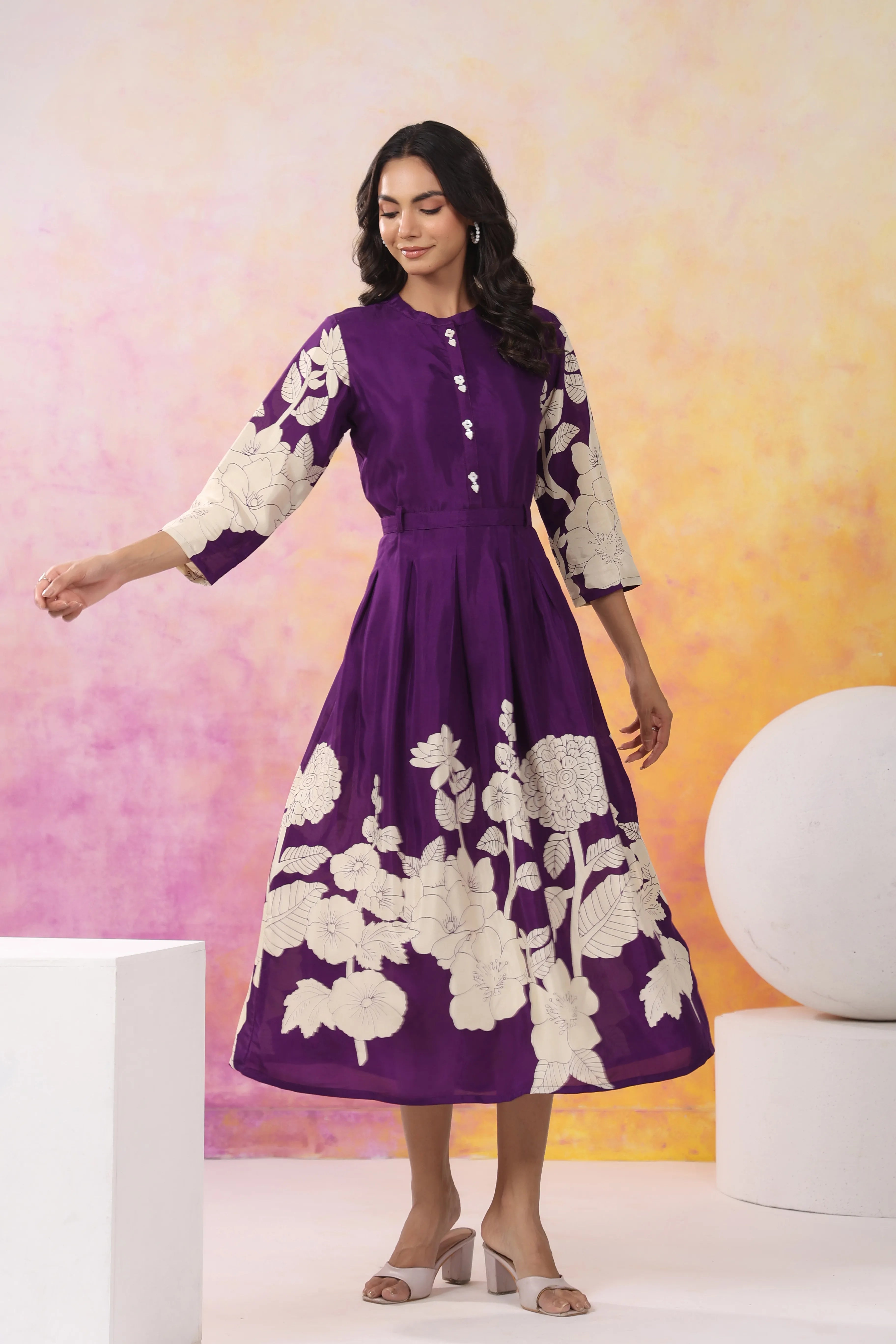 Elevate your style with this exquisite Purple Midi Dress, crafted from luxurious Russian silk for a refined and polished look. Featuring a round neckline and a printed 3/4th sleeves / hem, this dress offers a timeless design with contemporary details. The shell button front and tie-back detail provide a flattering silhouette, making it perfect for any occasion.