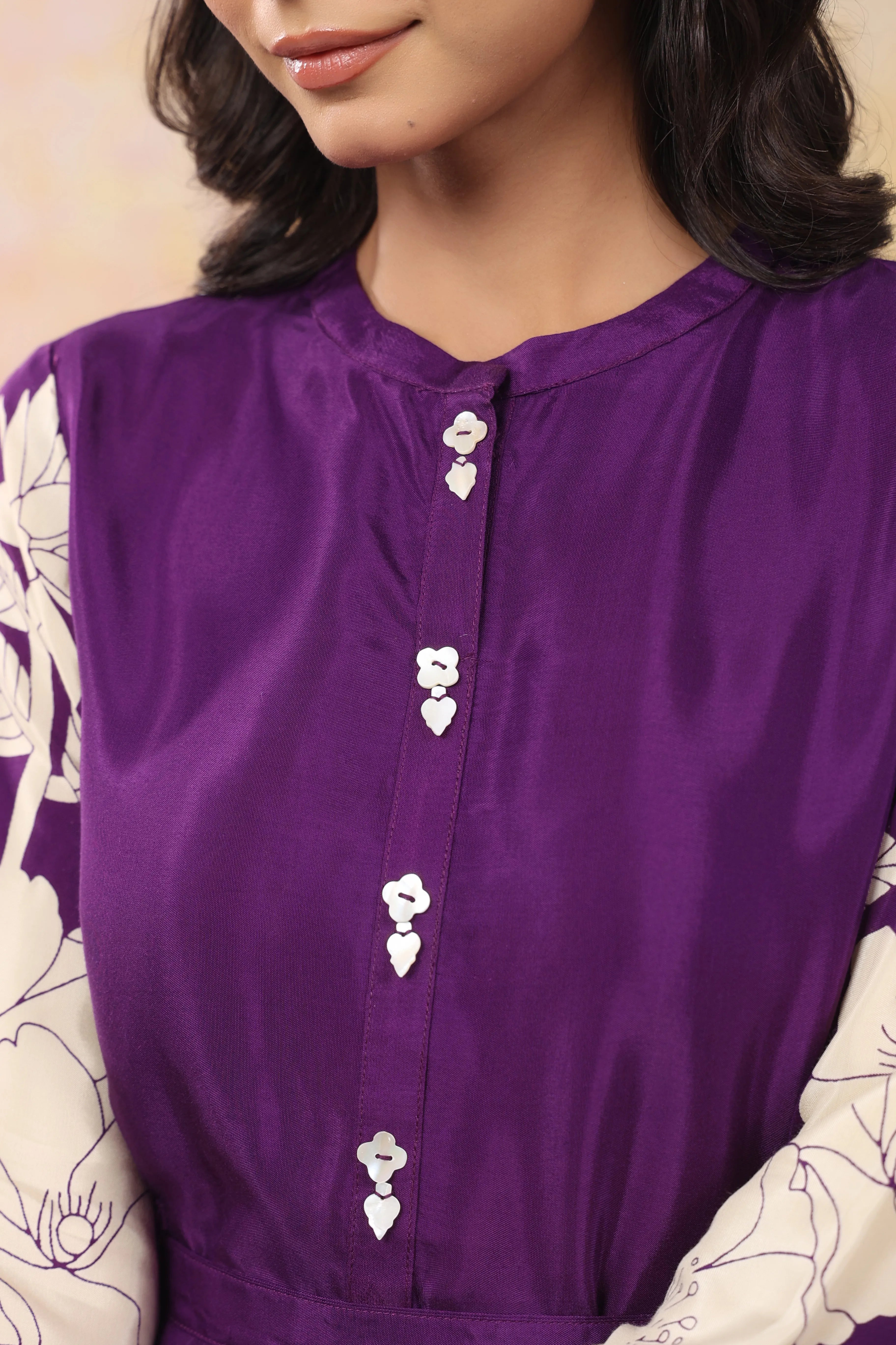 - Design Details: Rich Purple Hue with a Printed Sleeve / Hem and Shell Button Front