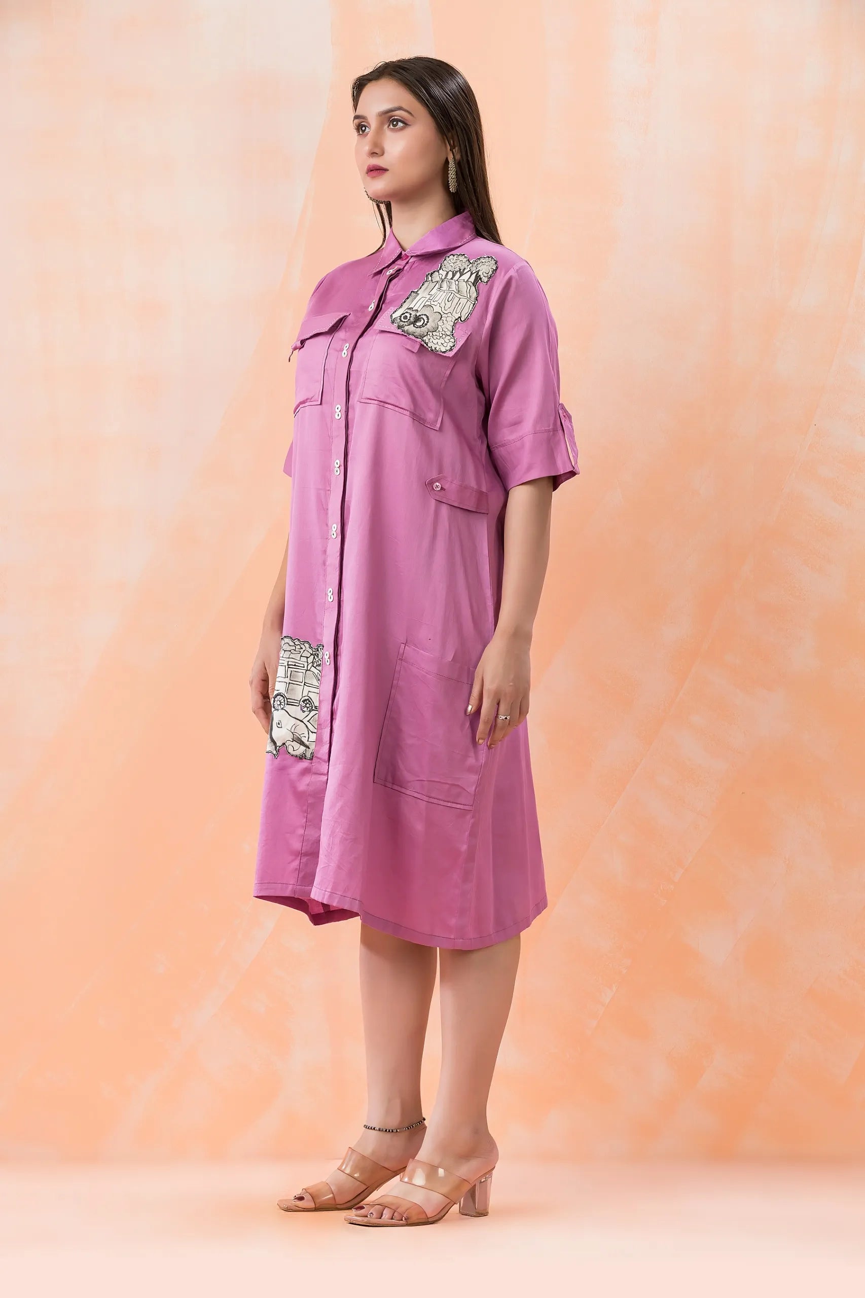 Ideal for casual occasions, the Purple Cotton Satin Patch Detailed Print Mini Dress is a statement piece that combines comfort and style with a touch of sophistication.