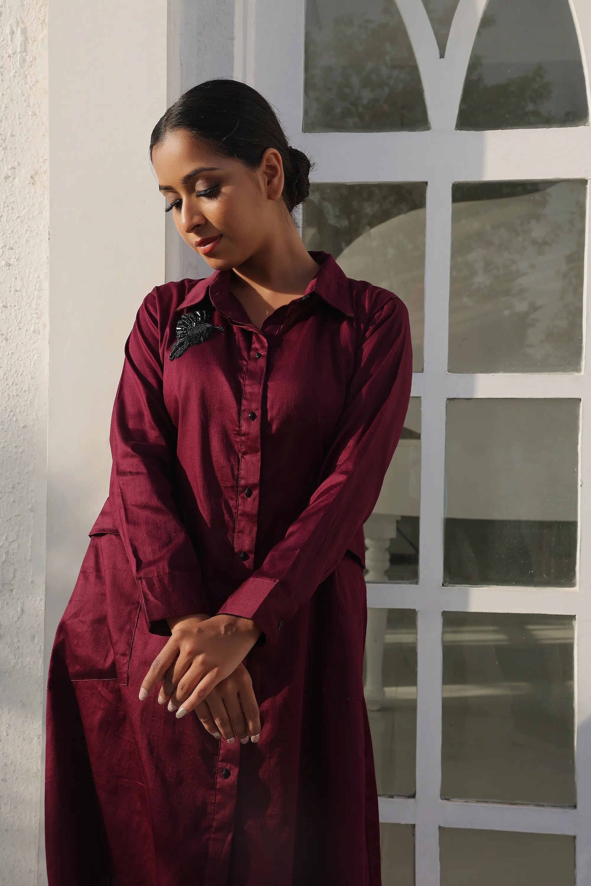 Elevate your wardrobe with this sophisticated purple A-line shirt dress, adorned with an elegant chirping bird brooch embroidery. Crafted from 100% breathable cotton, this versatile piece blends effortless grace with everyday comfort.